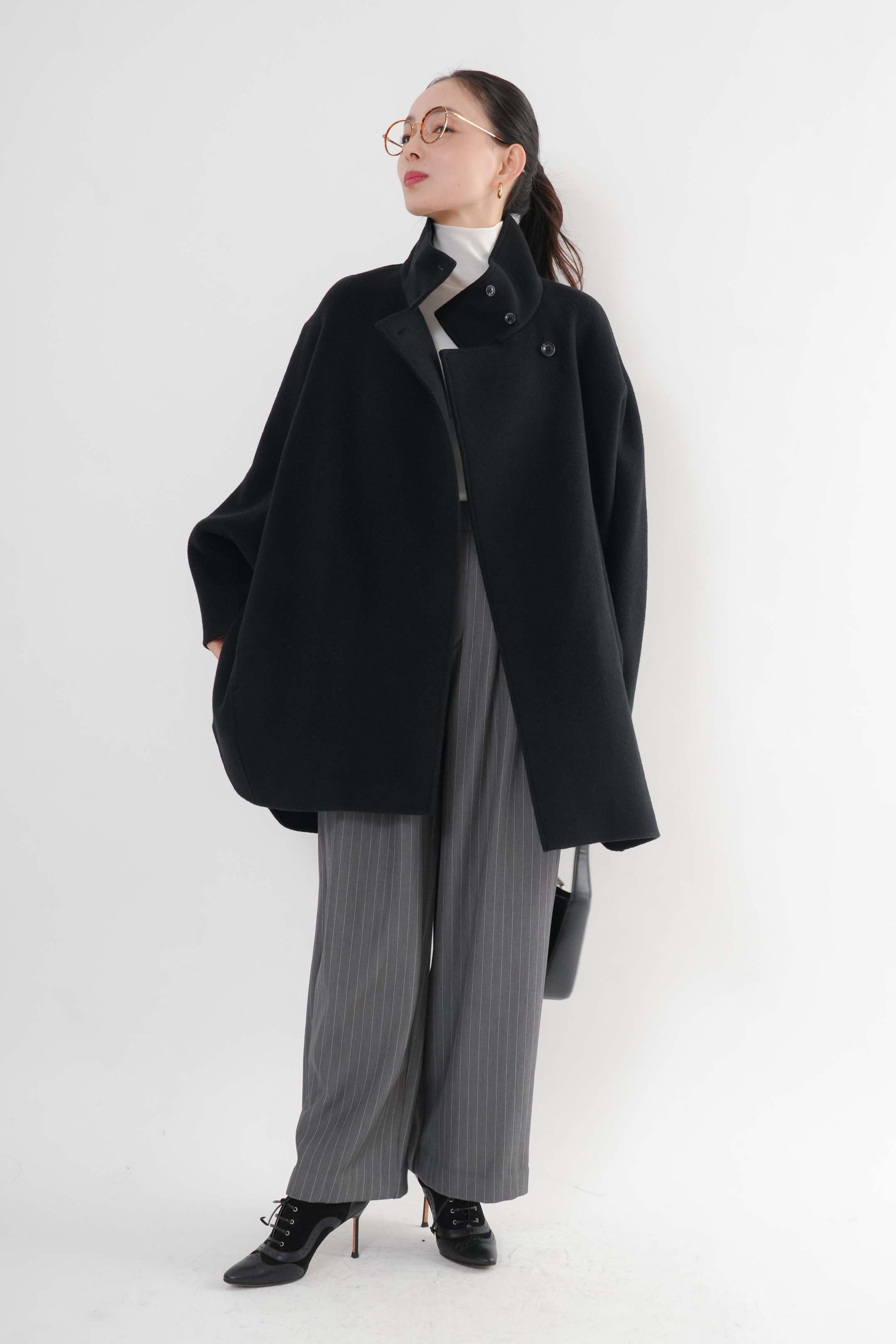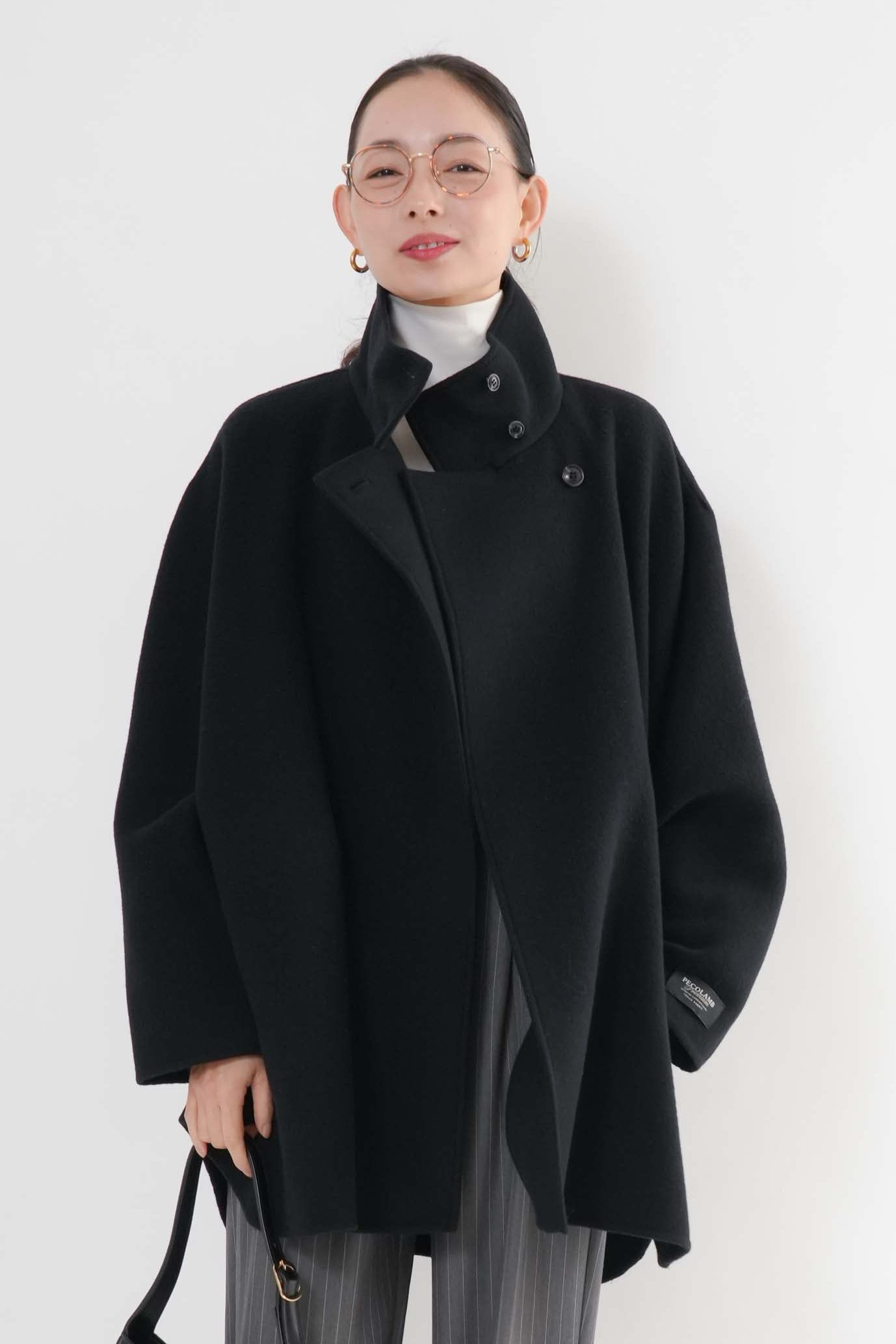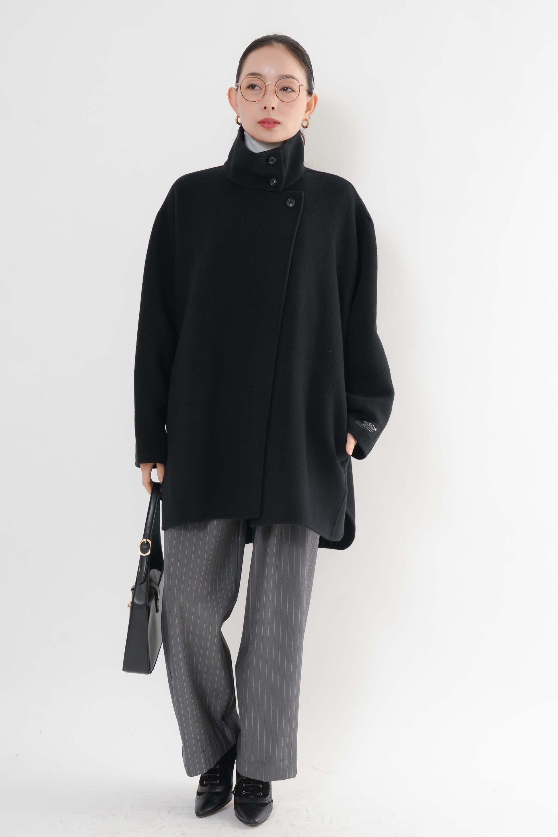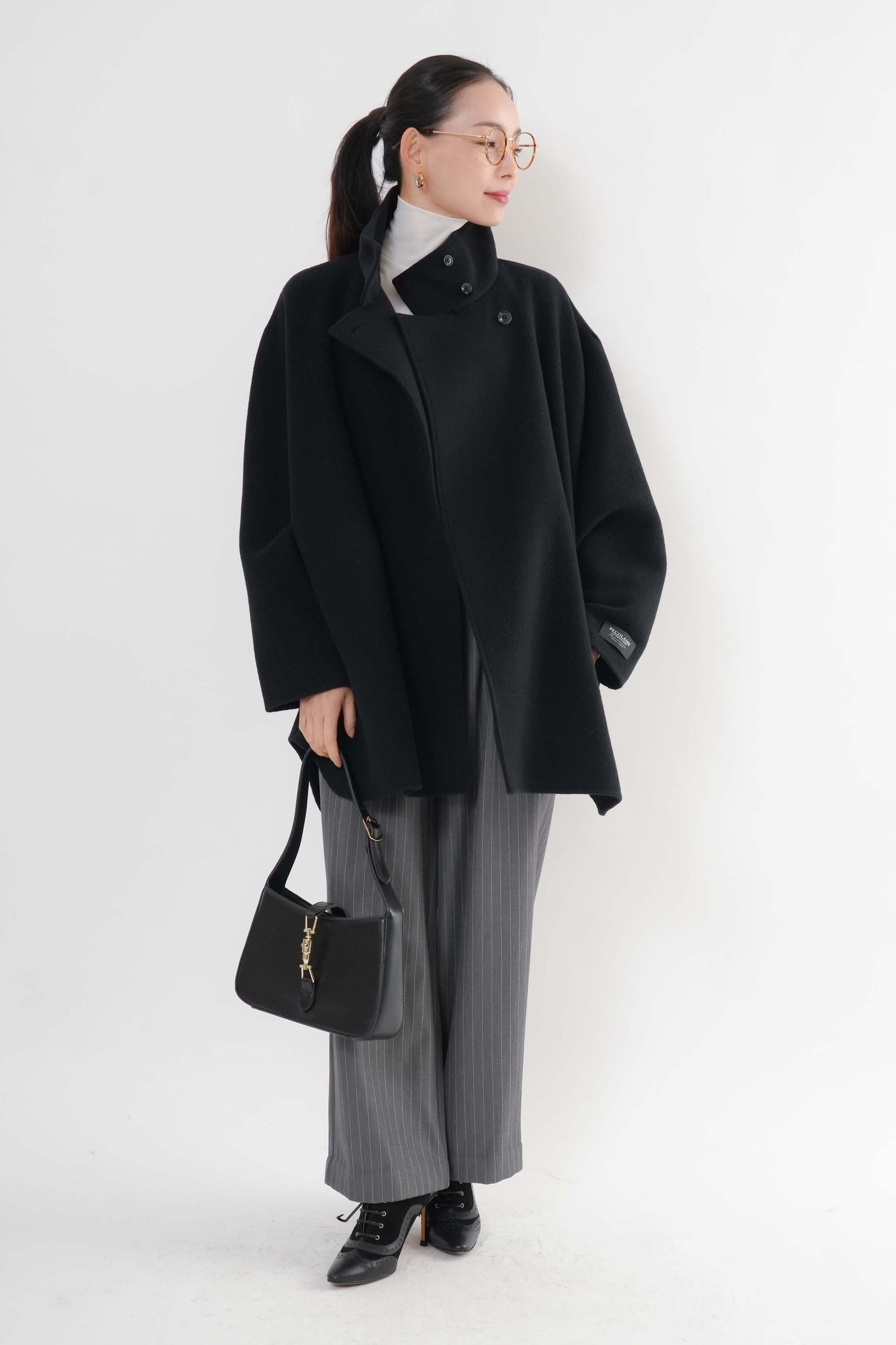 ダブルフェイス仕立てならではの柔らかな落ち感と、絶妙な立ち襟デザインが上品な印象を演出します。