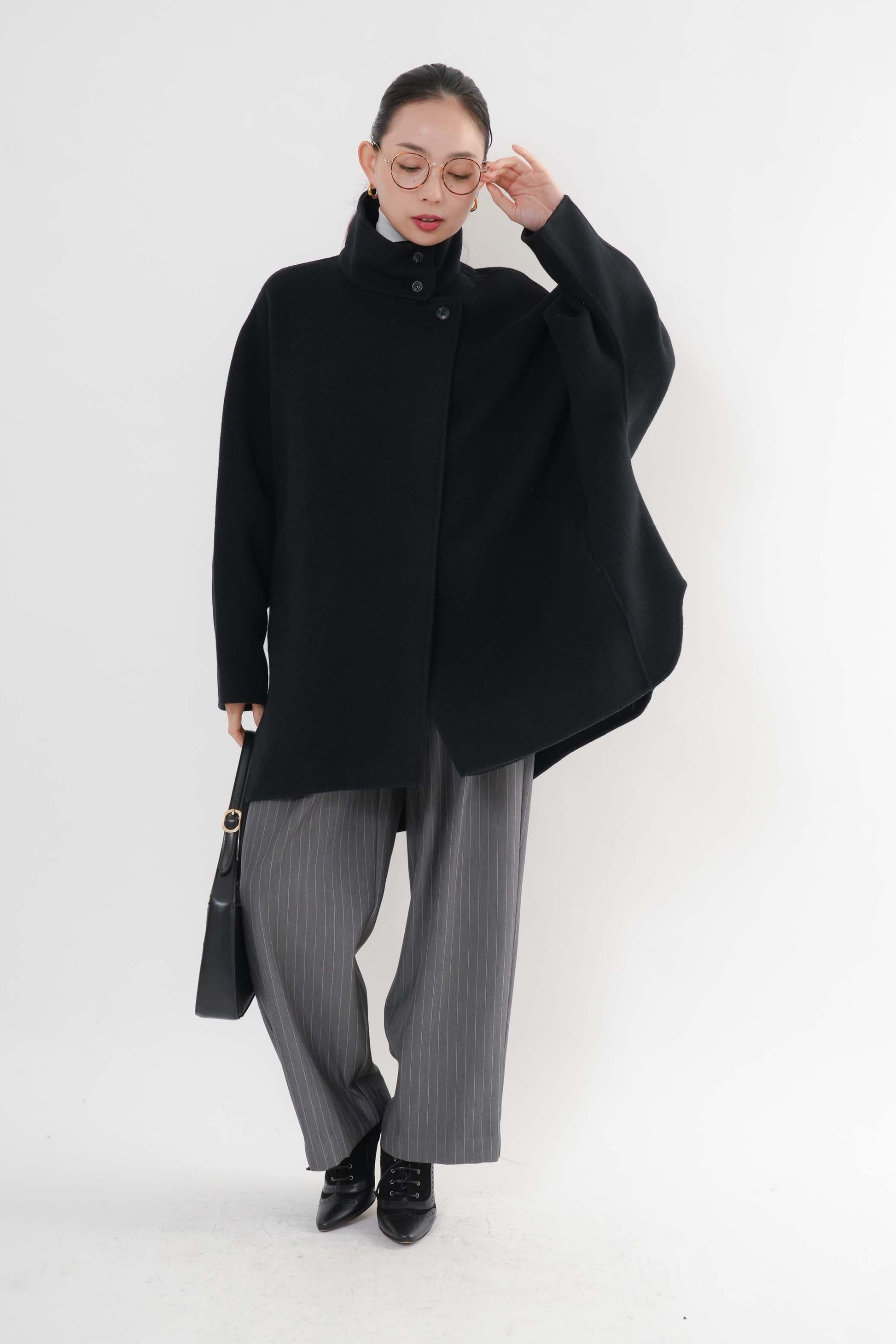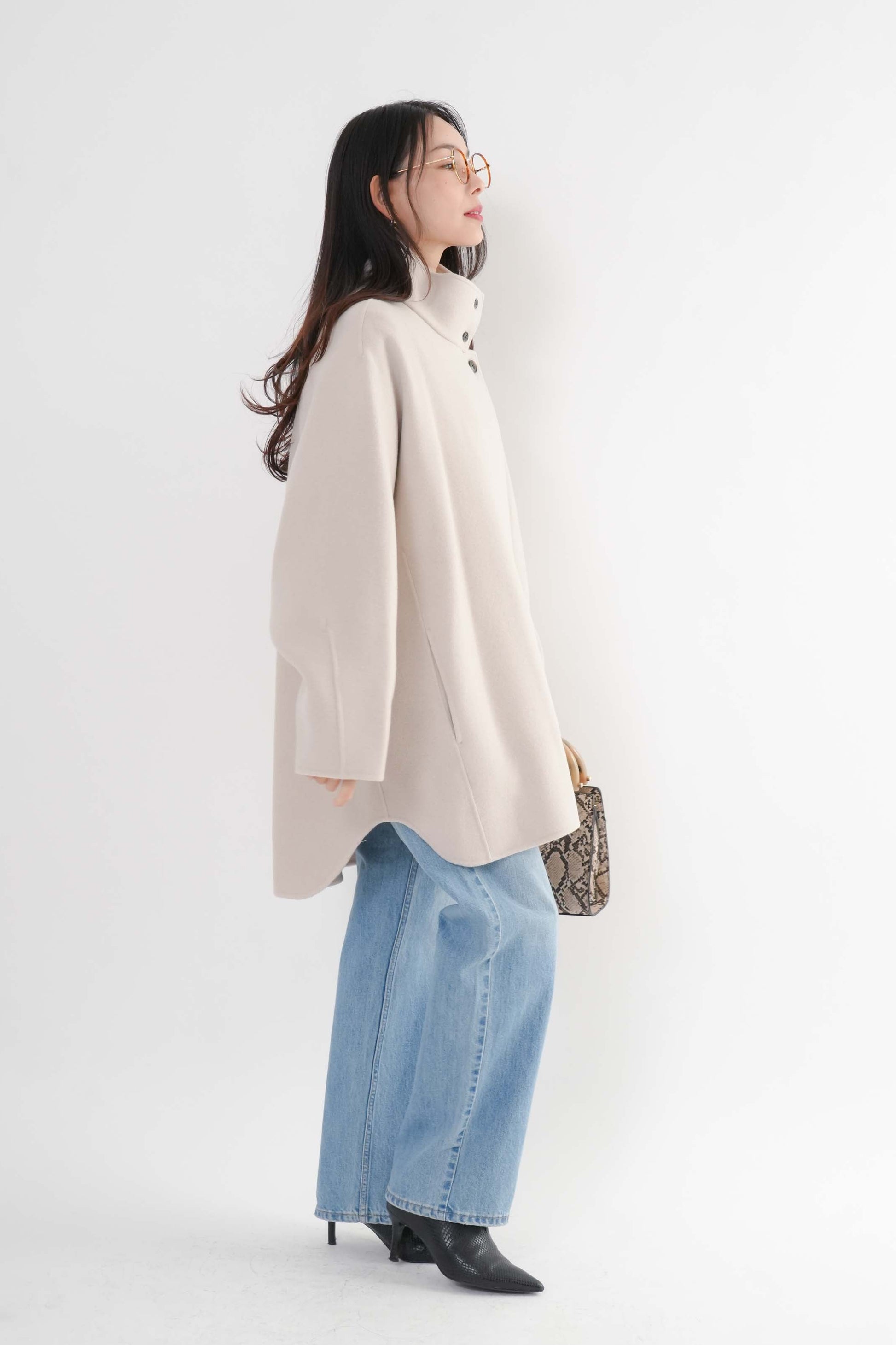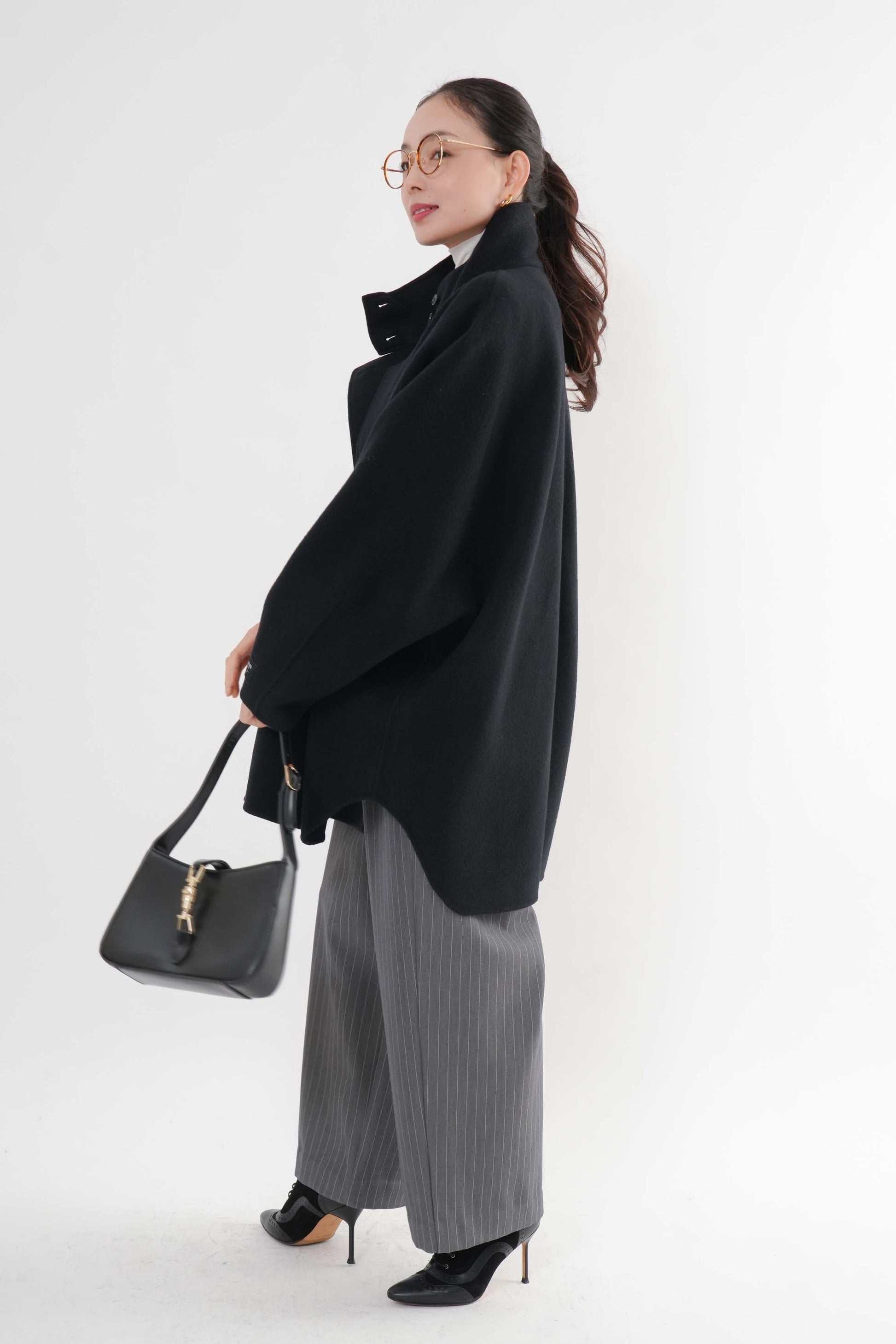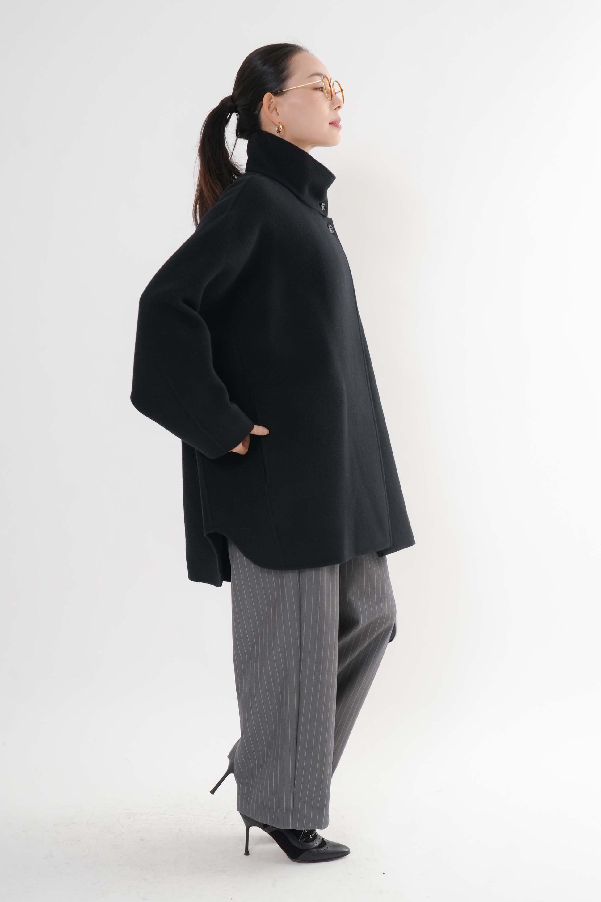 ダブルフェイス仕立てならではの柔らかな落ち感と、絶妙な立ち襟デザインが上品な印象を演出します。