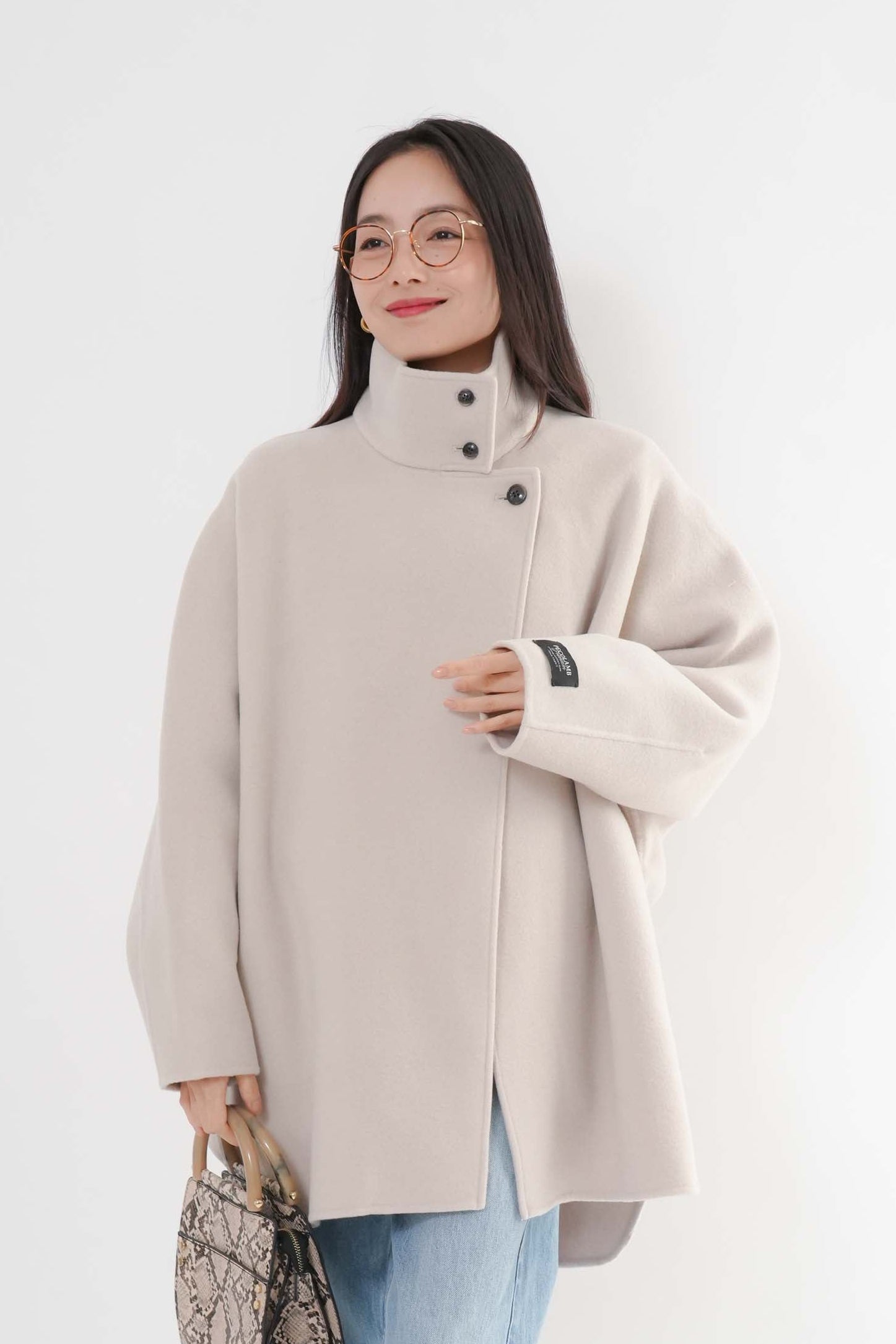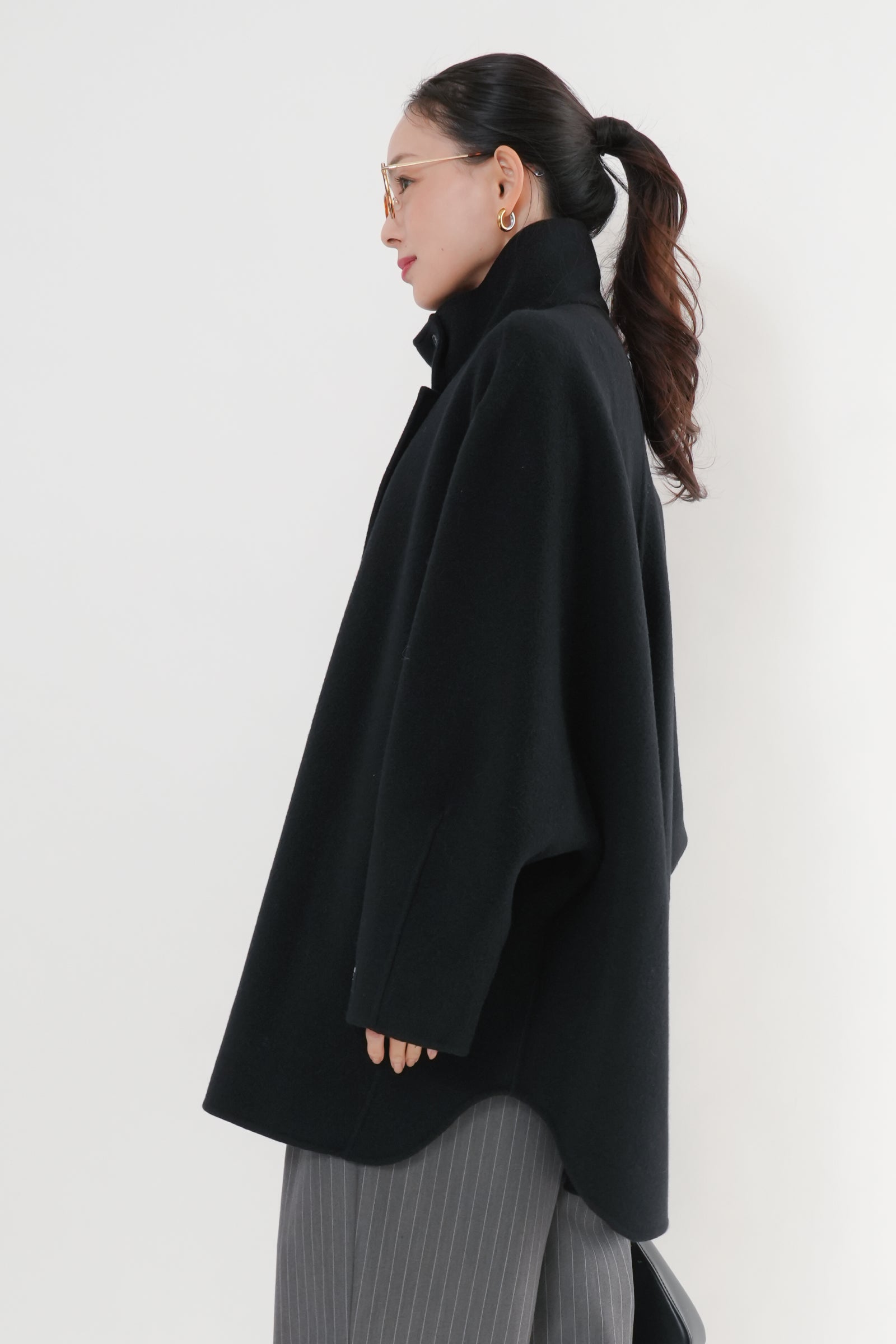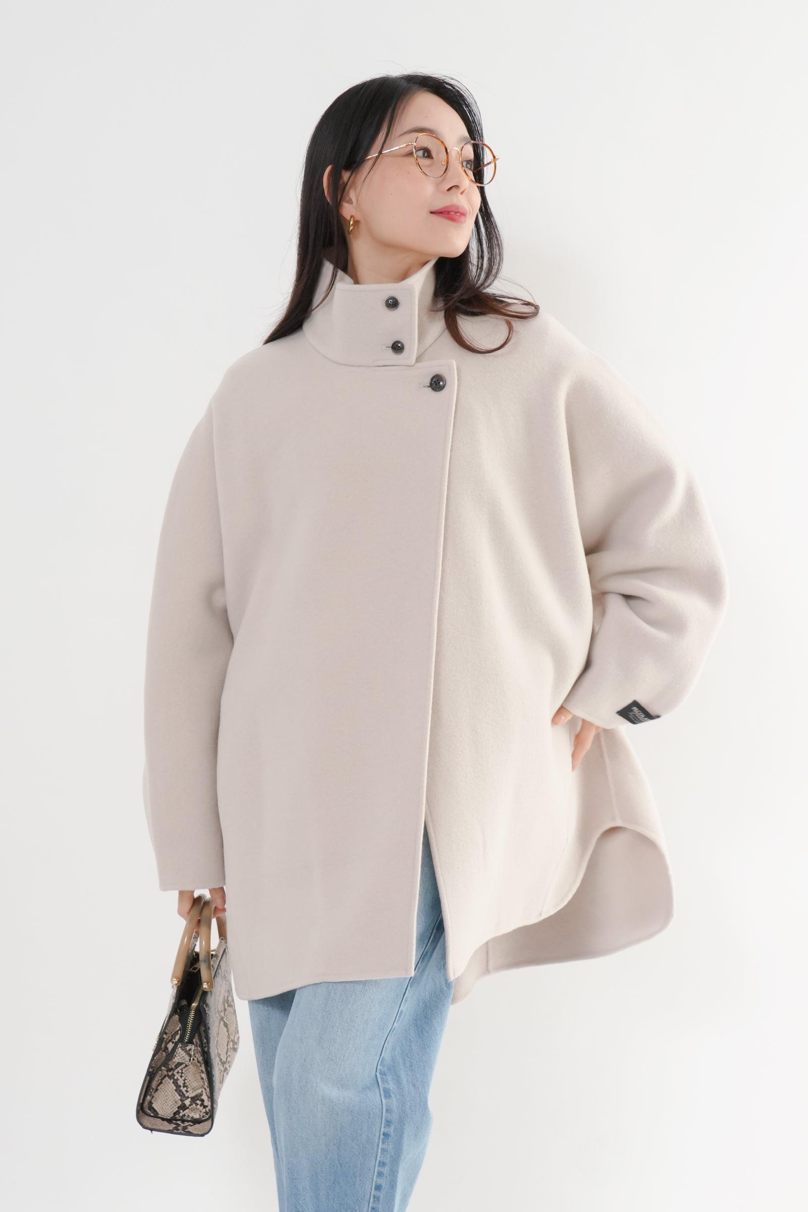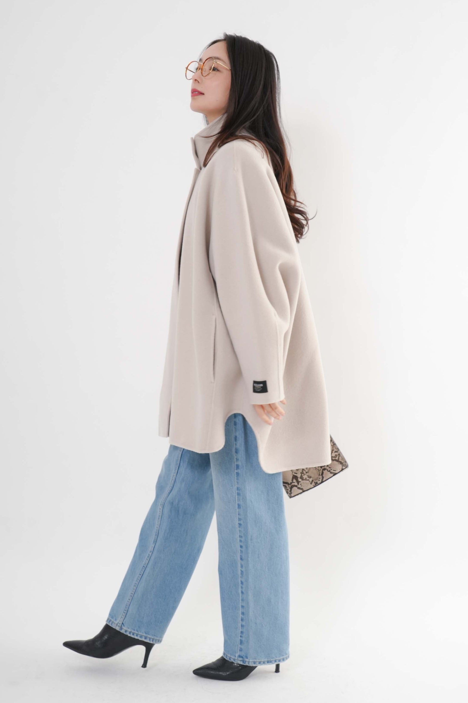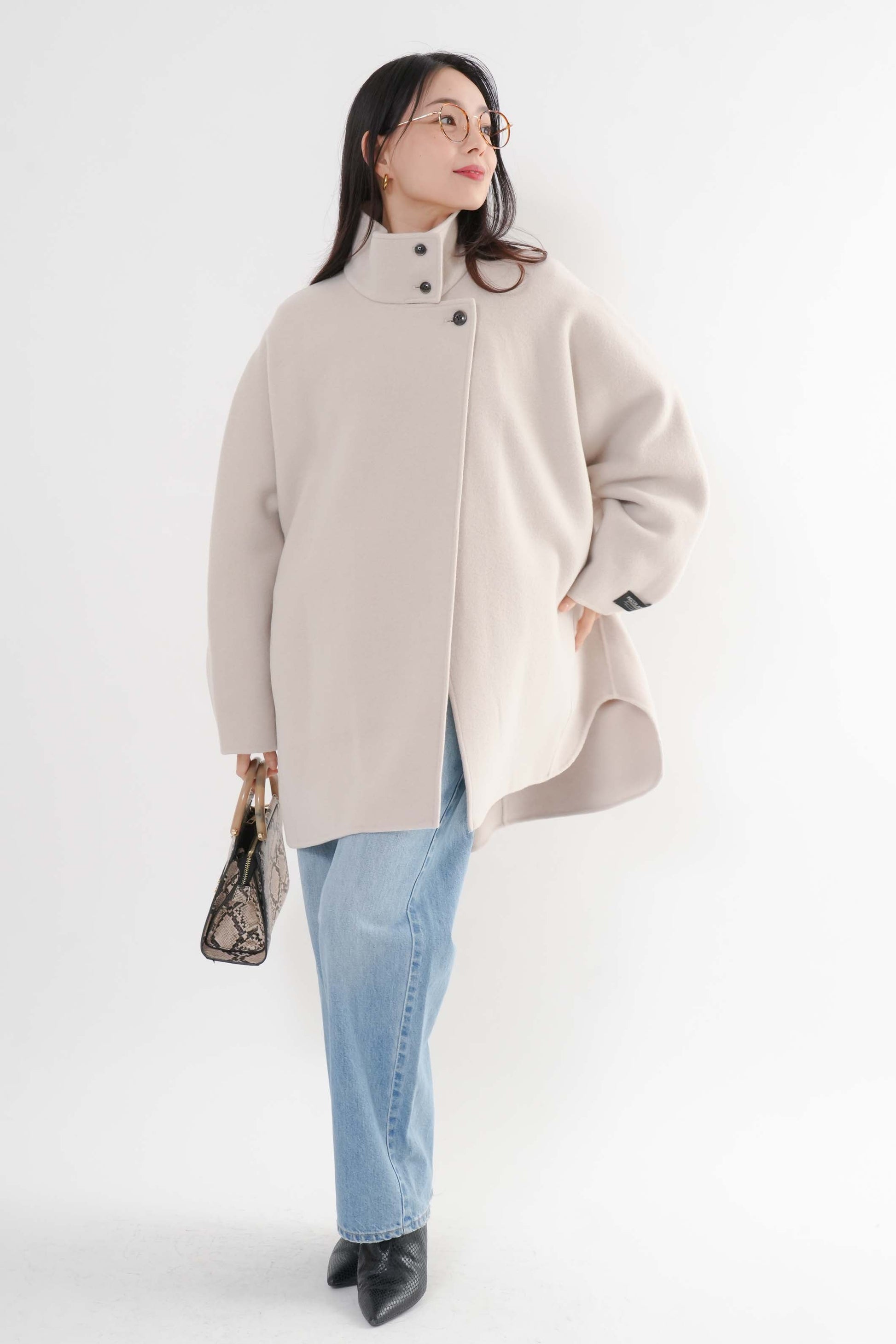 ダブルフェイス仕立てならではの柔らかな落ち感と、絶妙な立ち襟デザインが上品な印象を演出します。