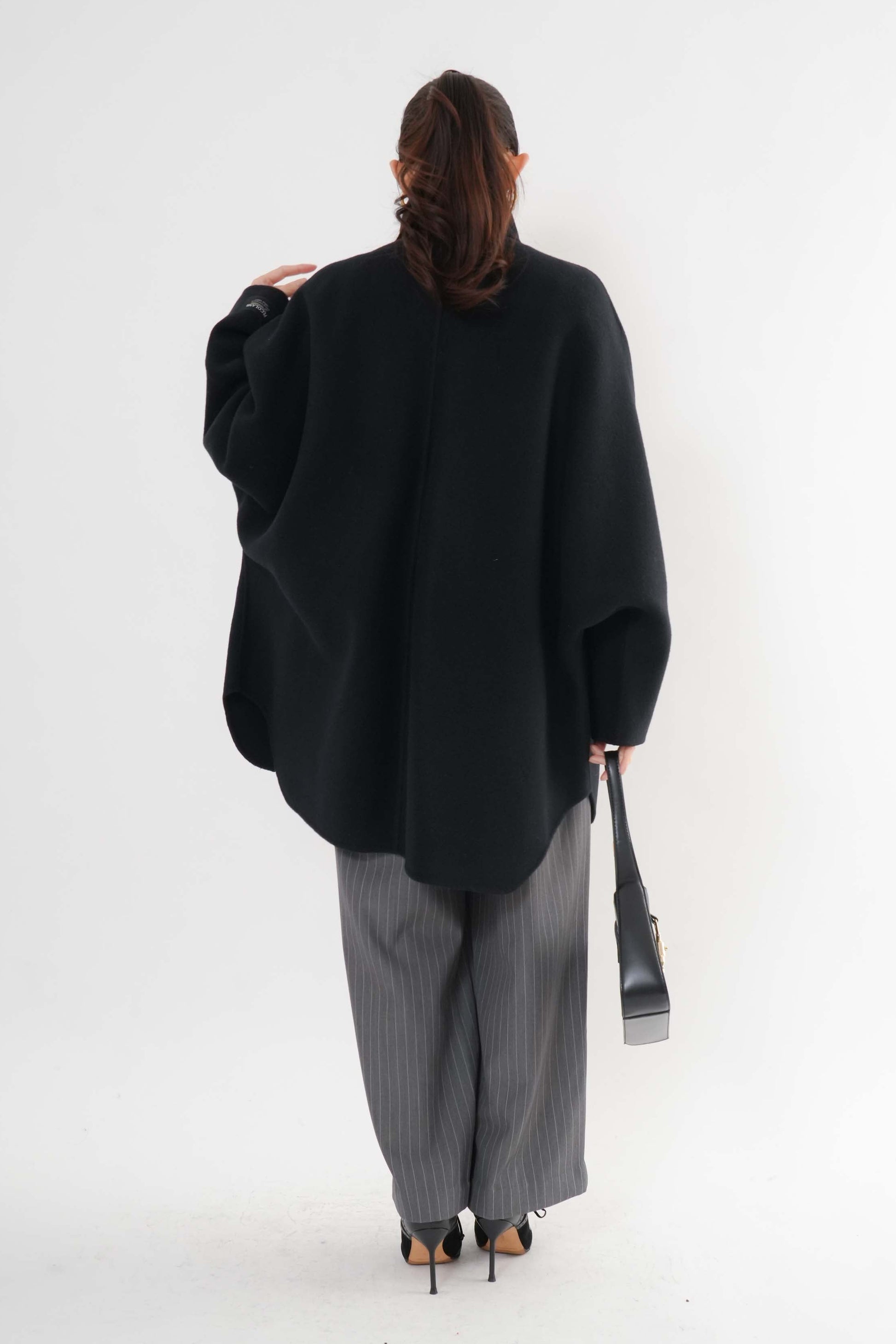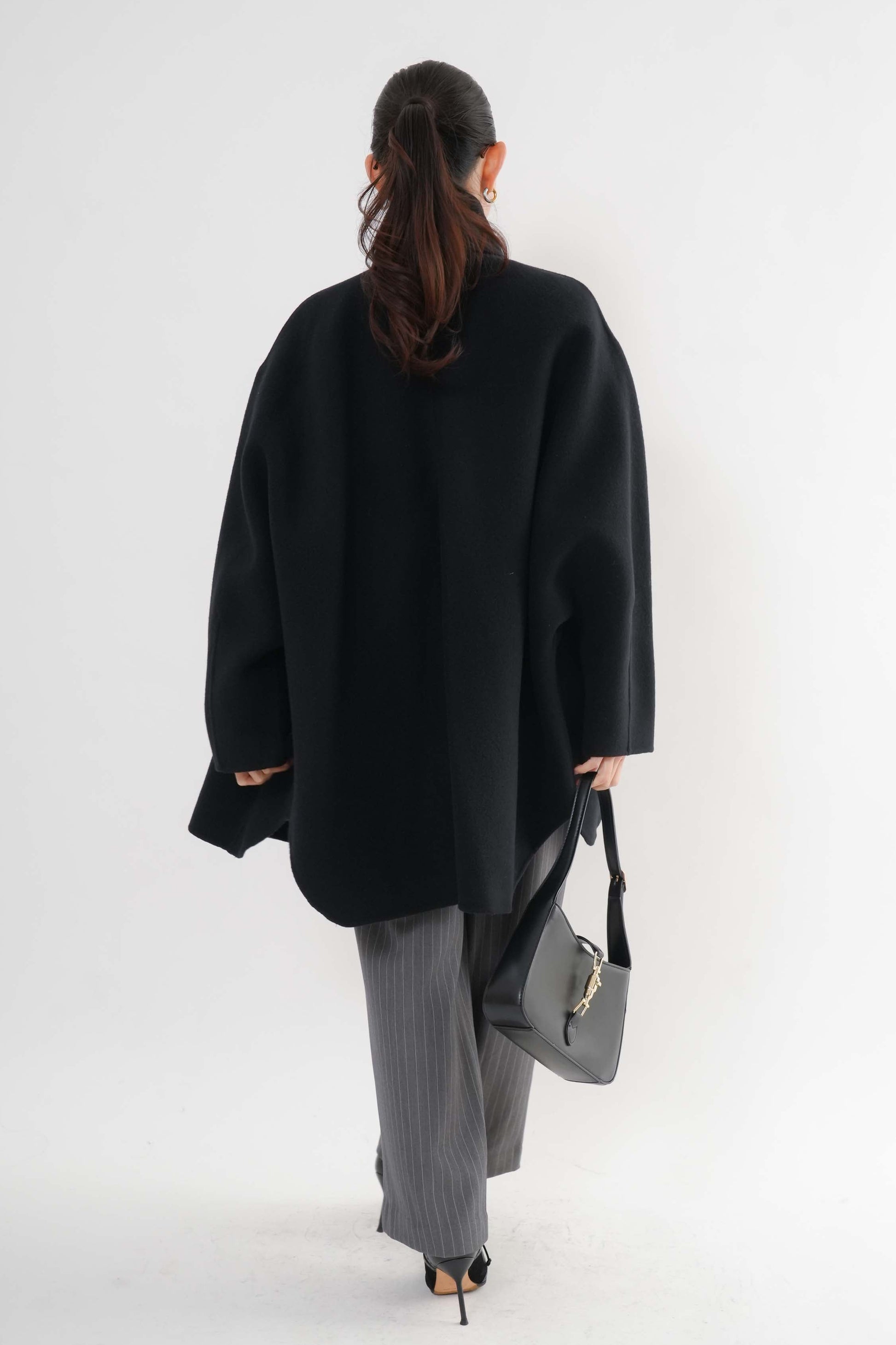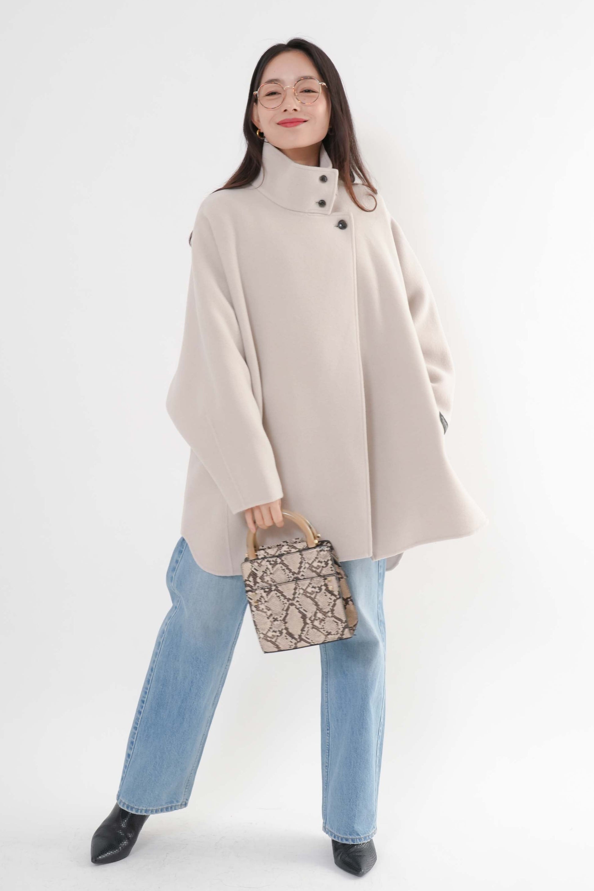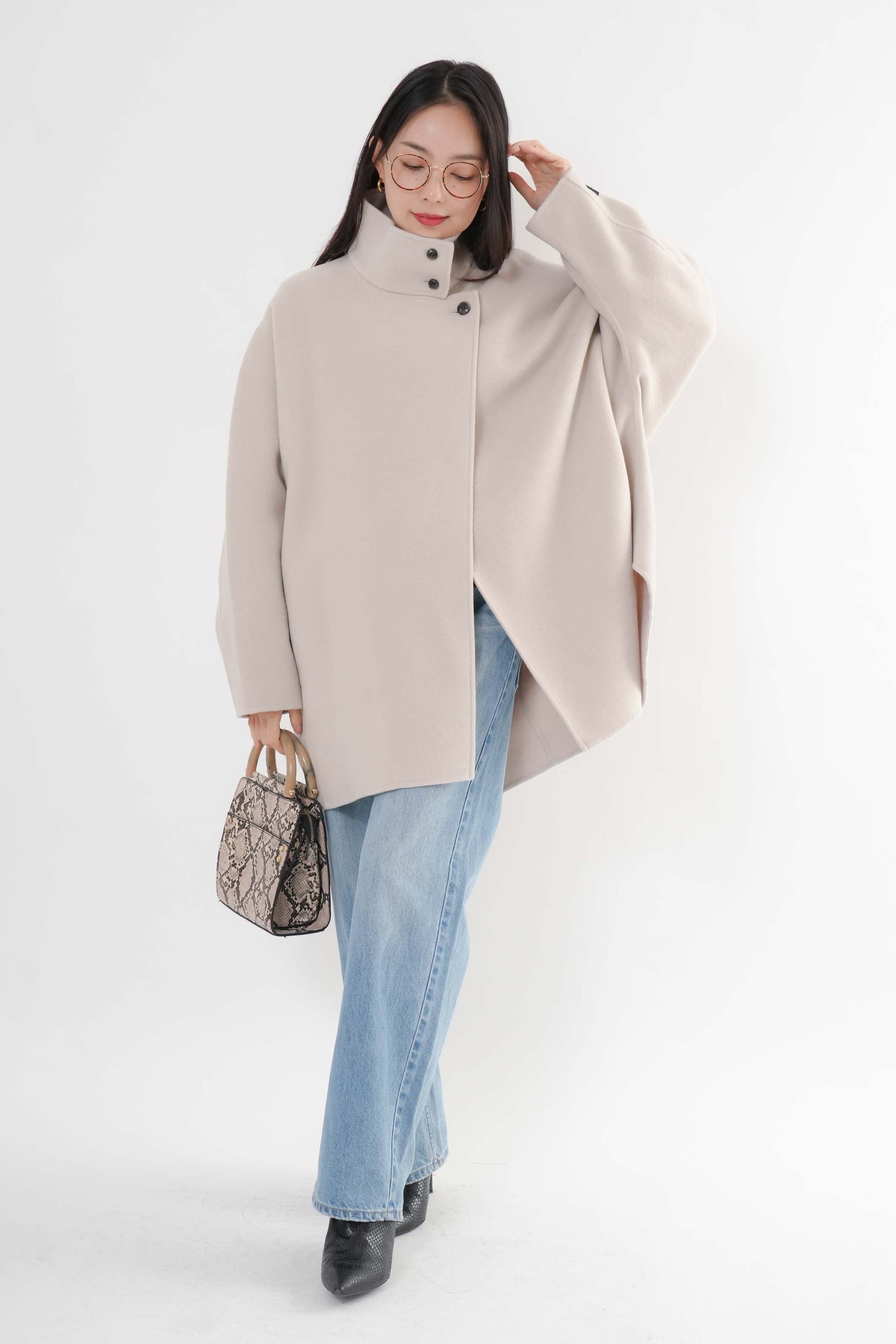 ダブルフェイス仕立てならではの柔らかな落ち感と、絶妙な立ち襟デザインが上品な印象を演出します。