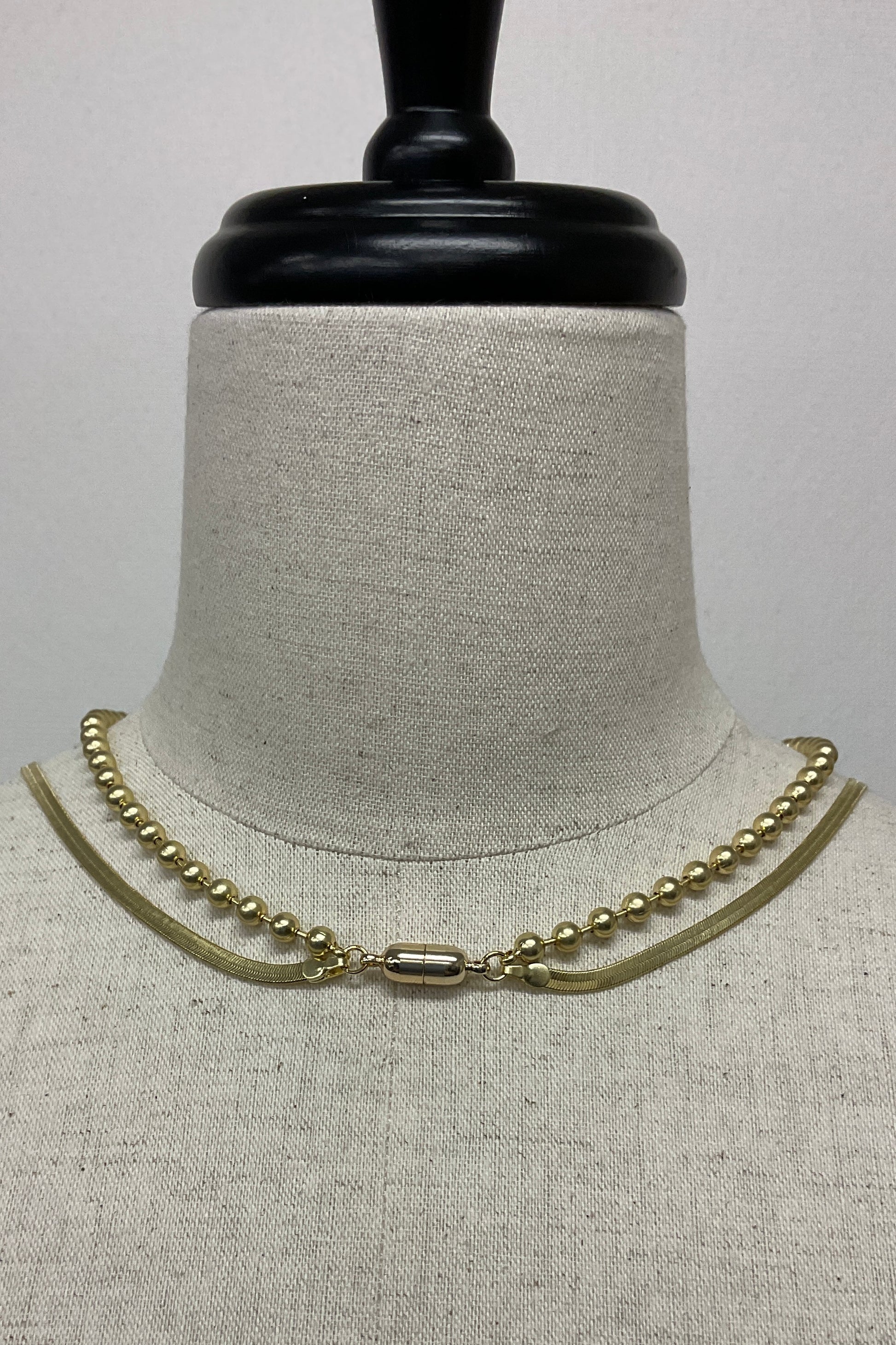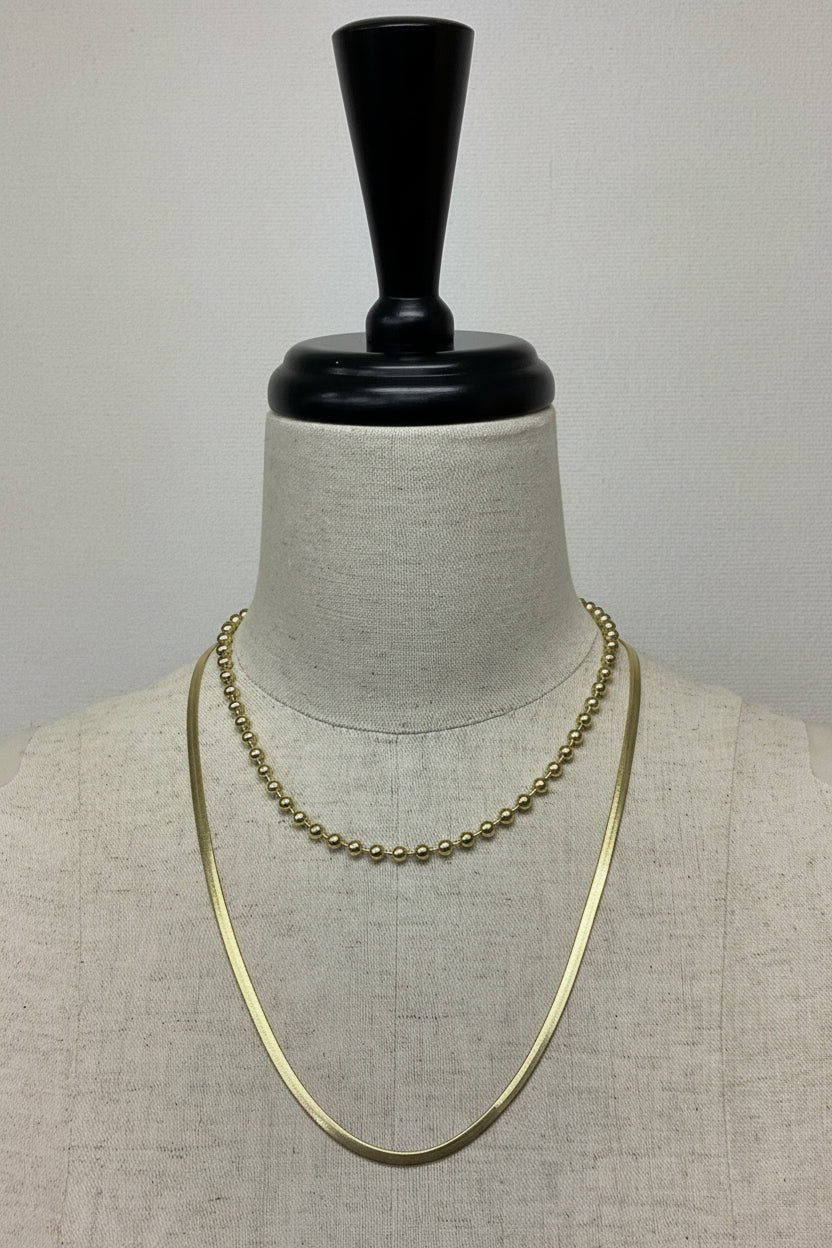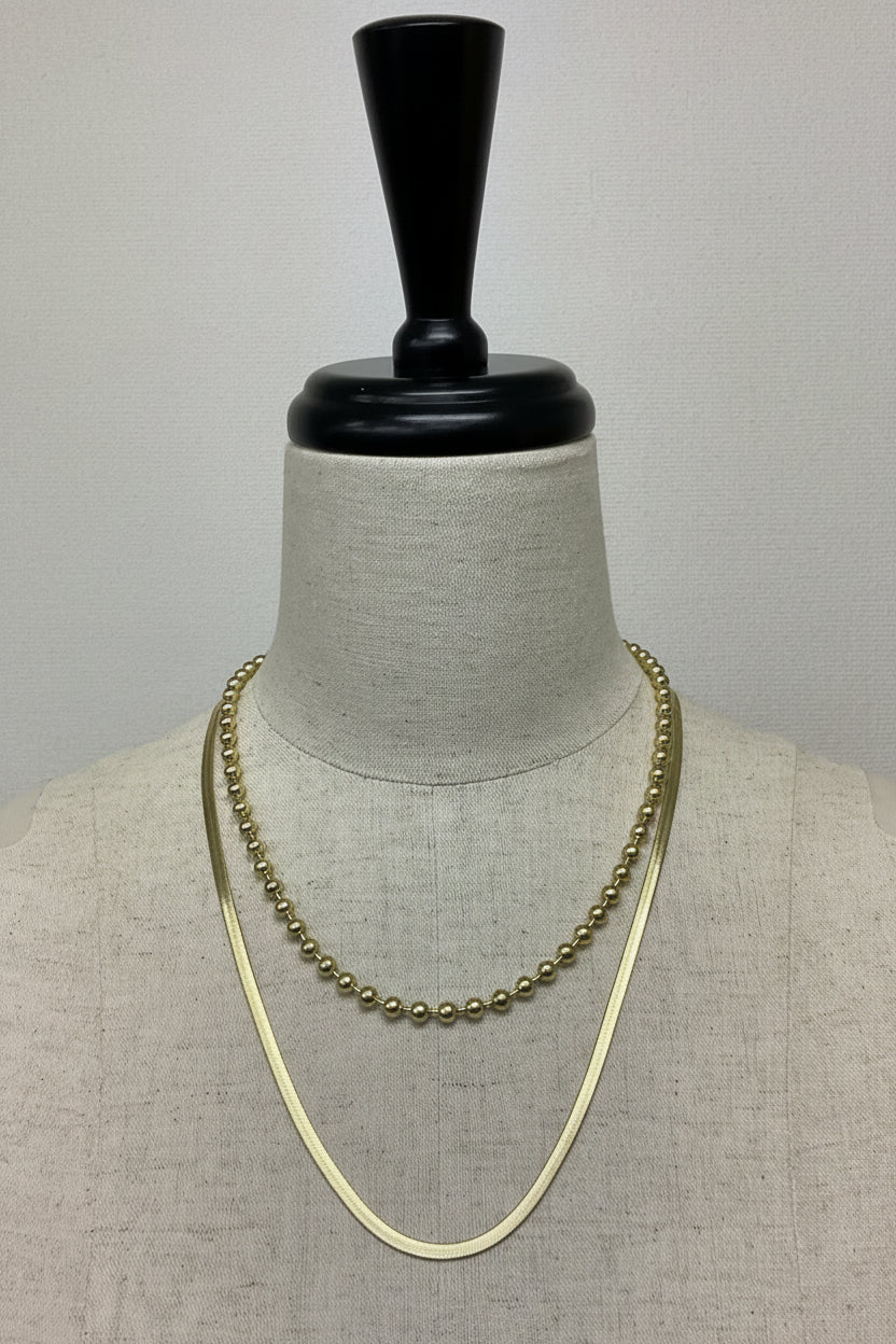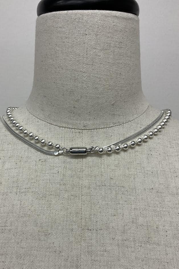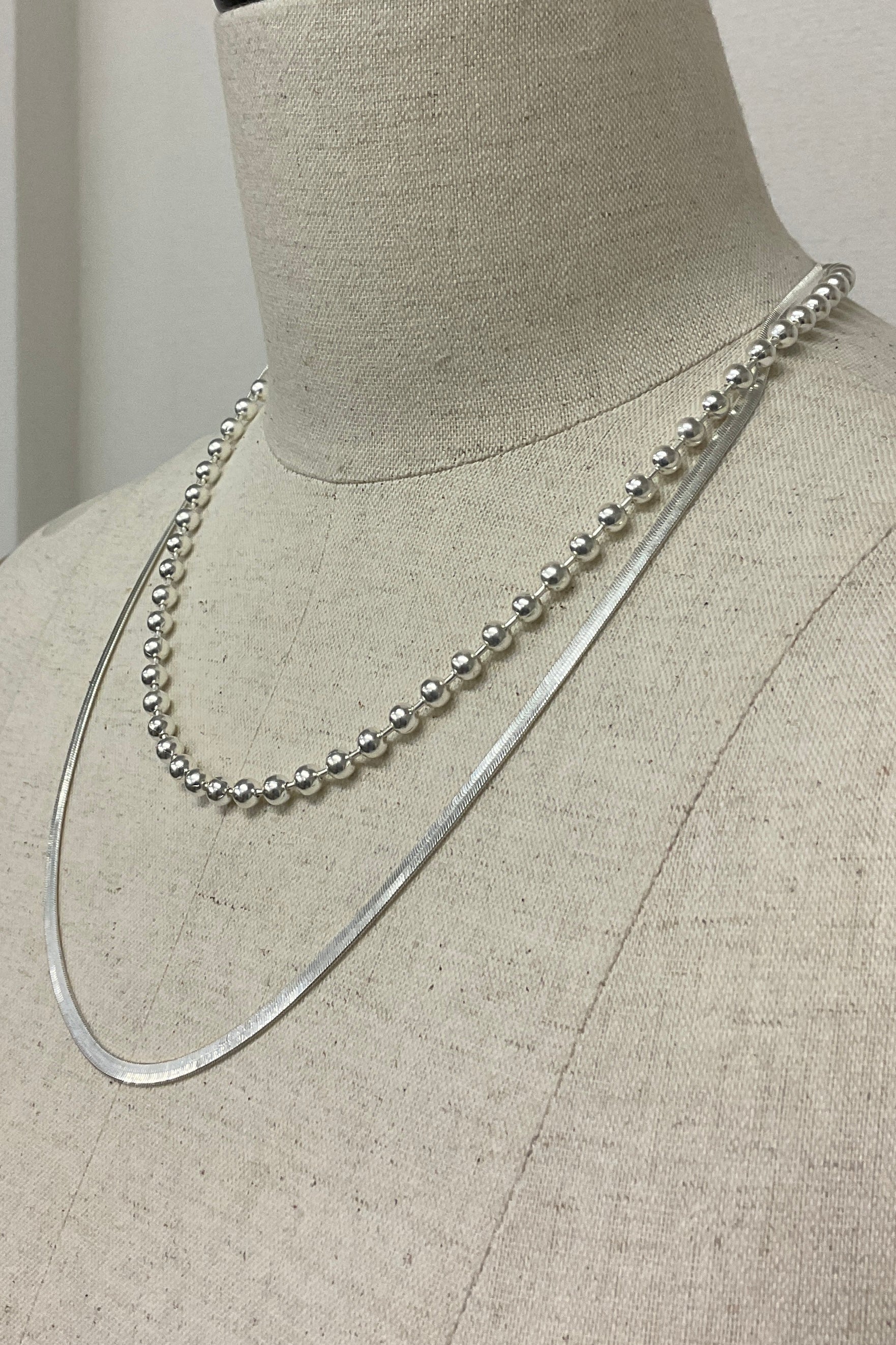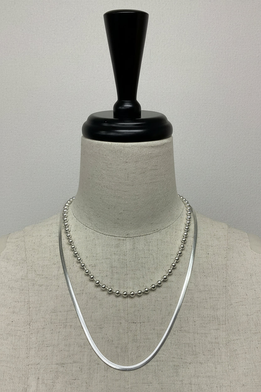 トレンドのシルバーボールとなめらかな光沢のスネークチェーンを組み合わせた2連ネックレス。