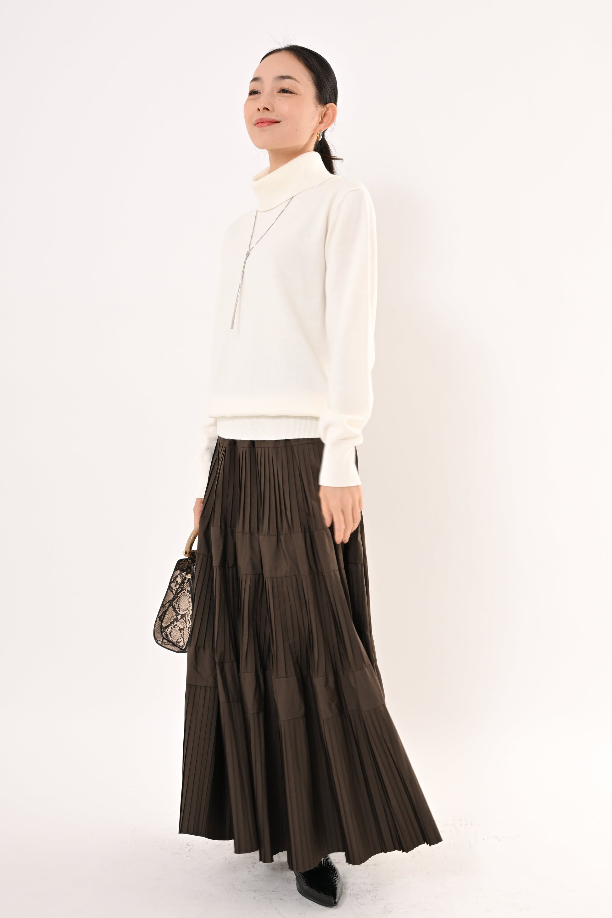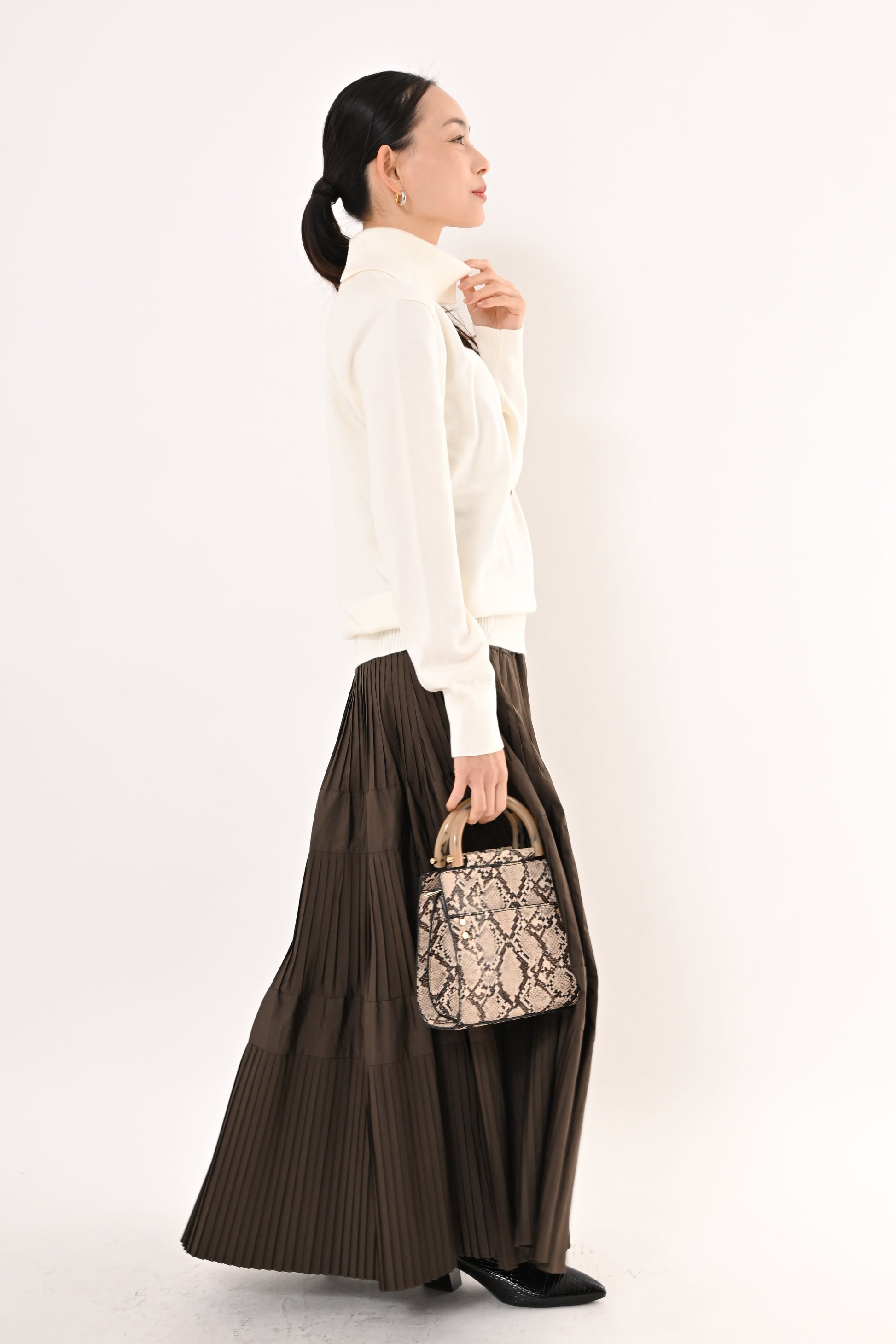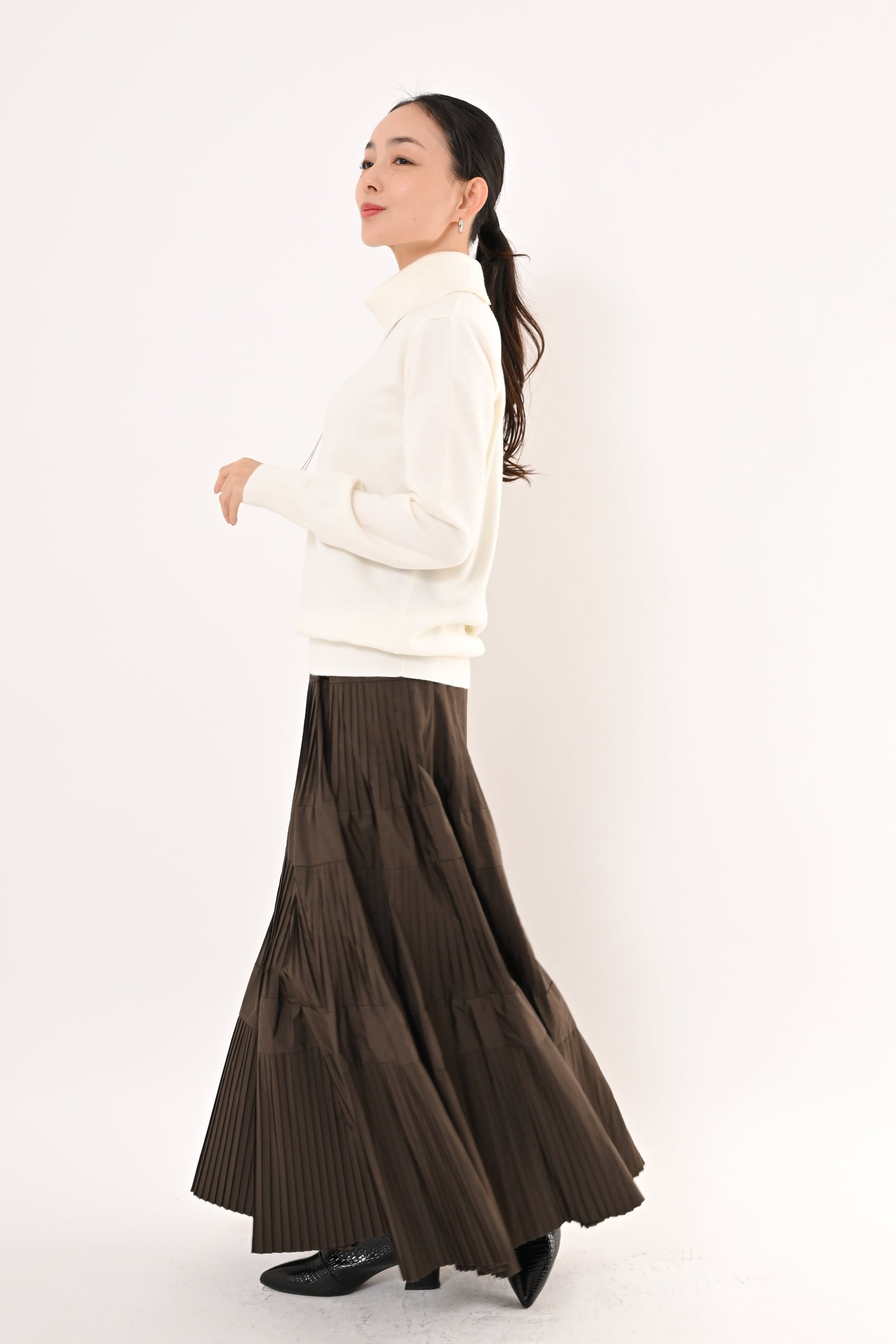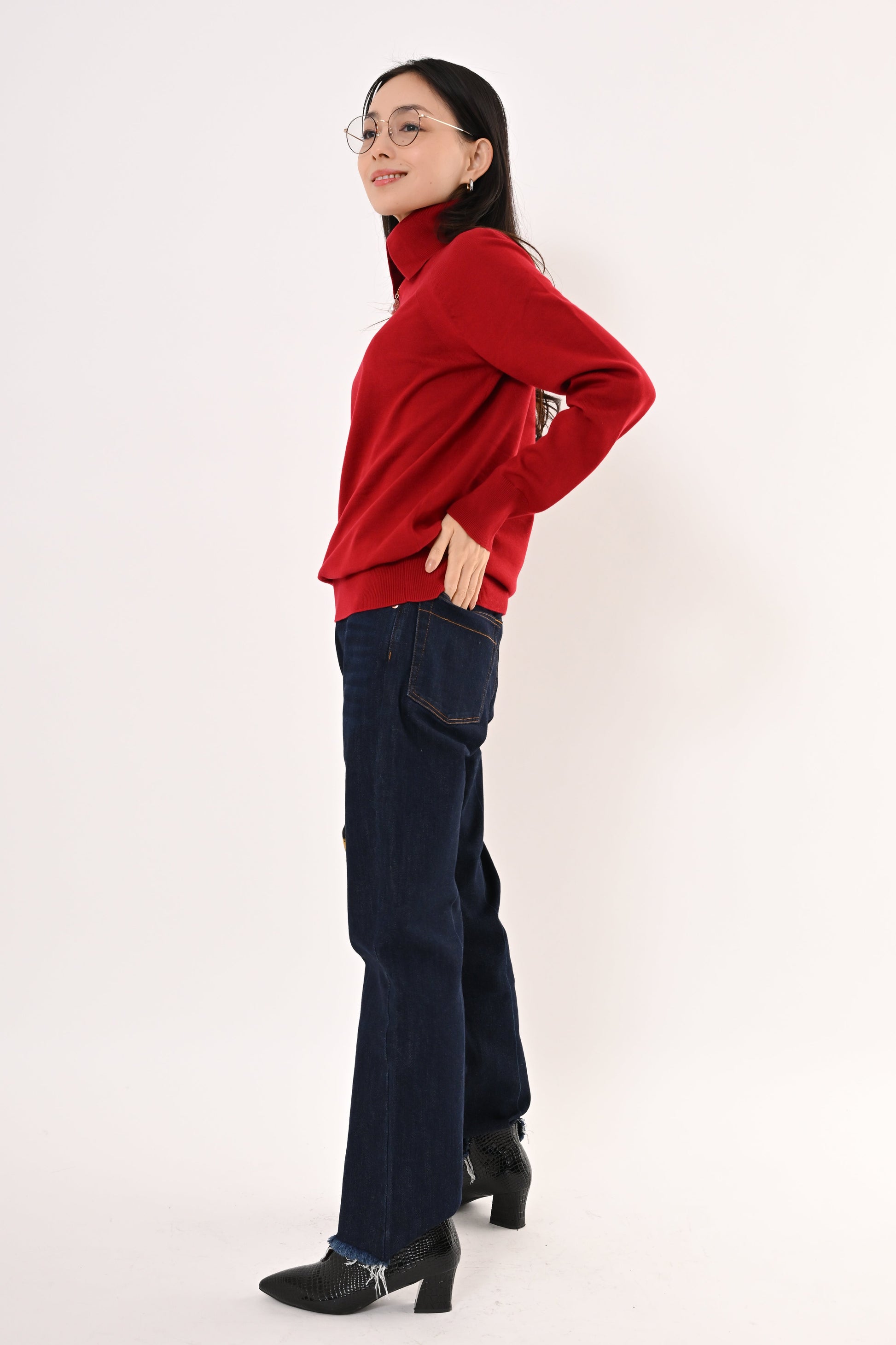 レーヨン混ならではのなめらかでもちっとした肌ざわりが魅力の前後2WAY仕様のハイネックニット。