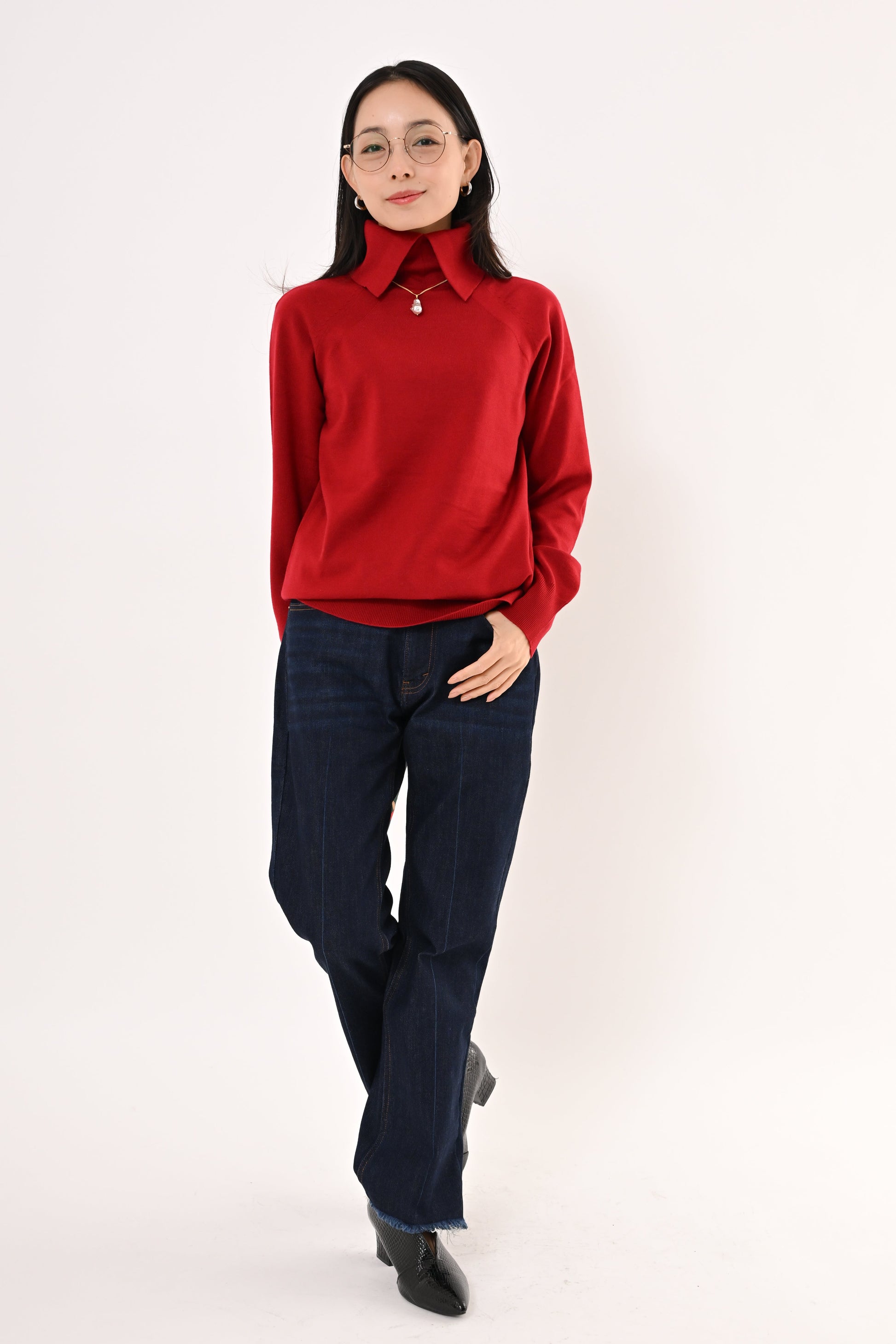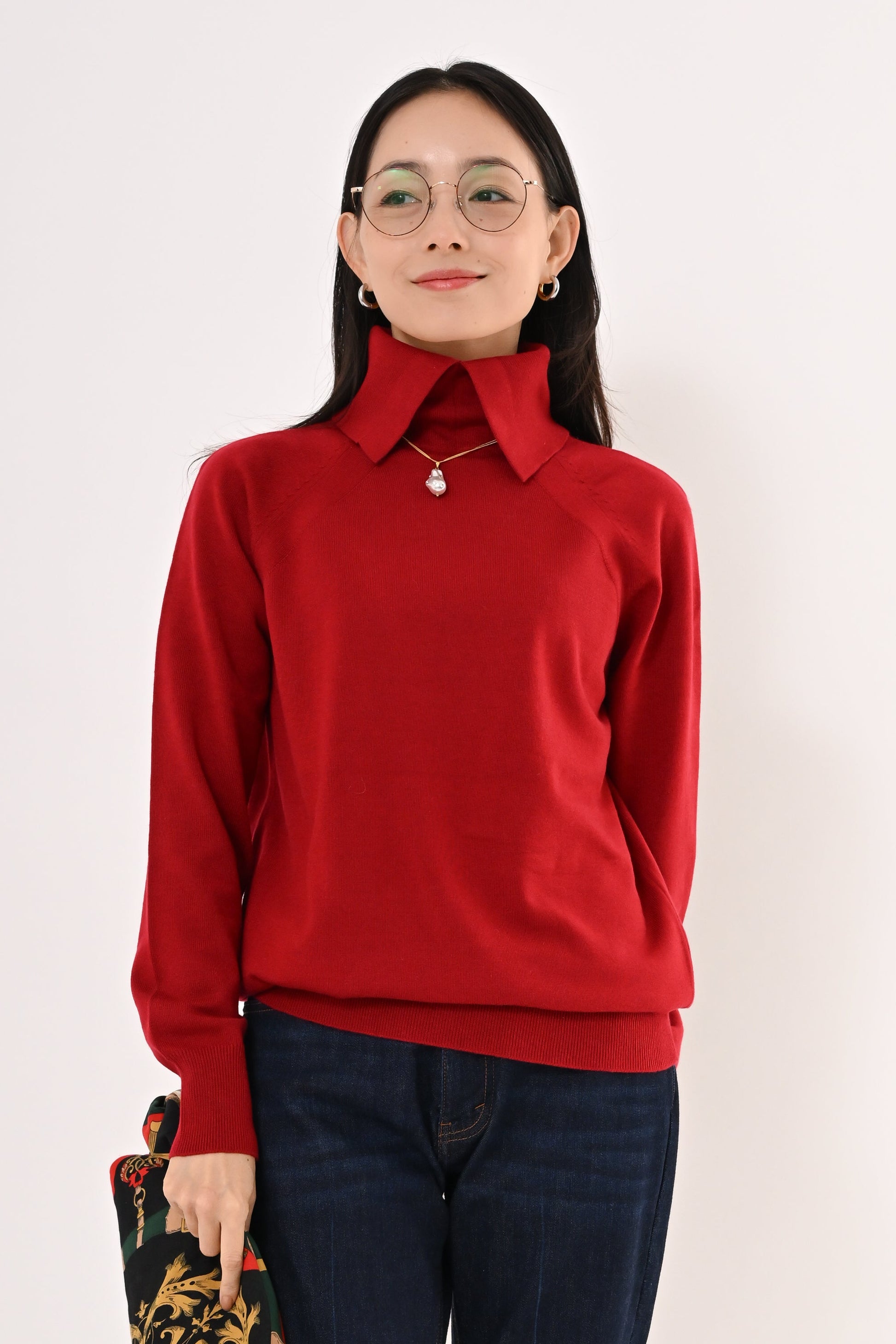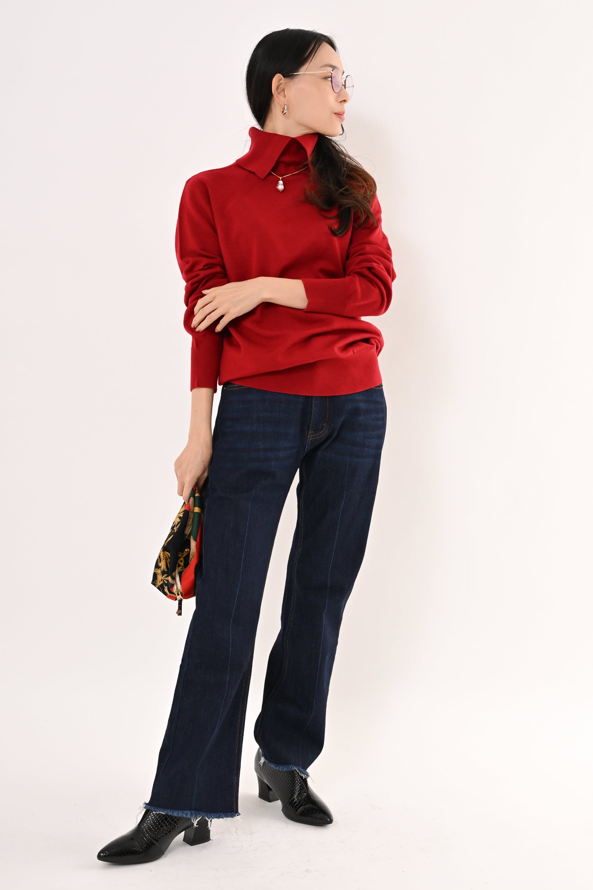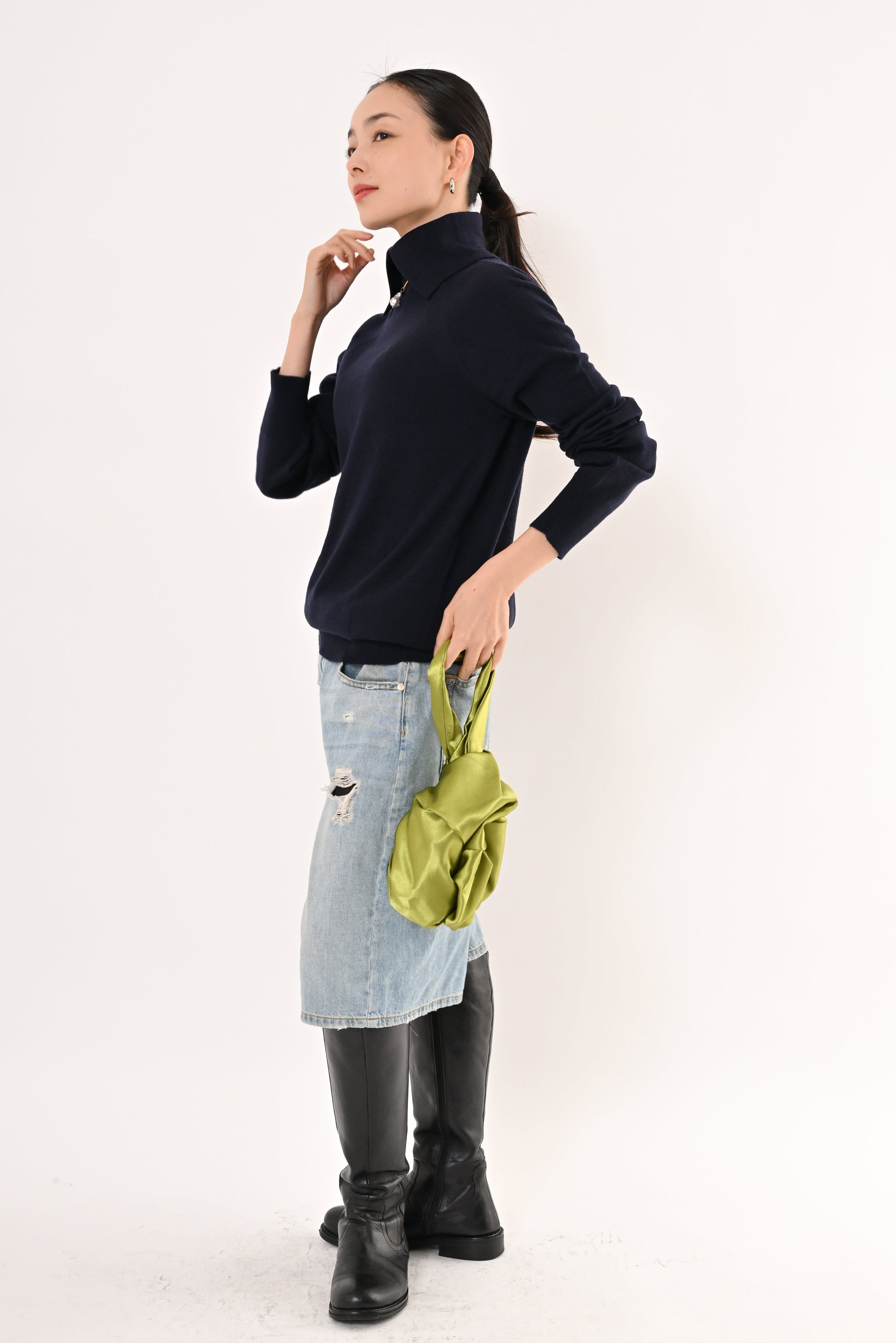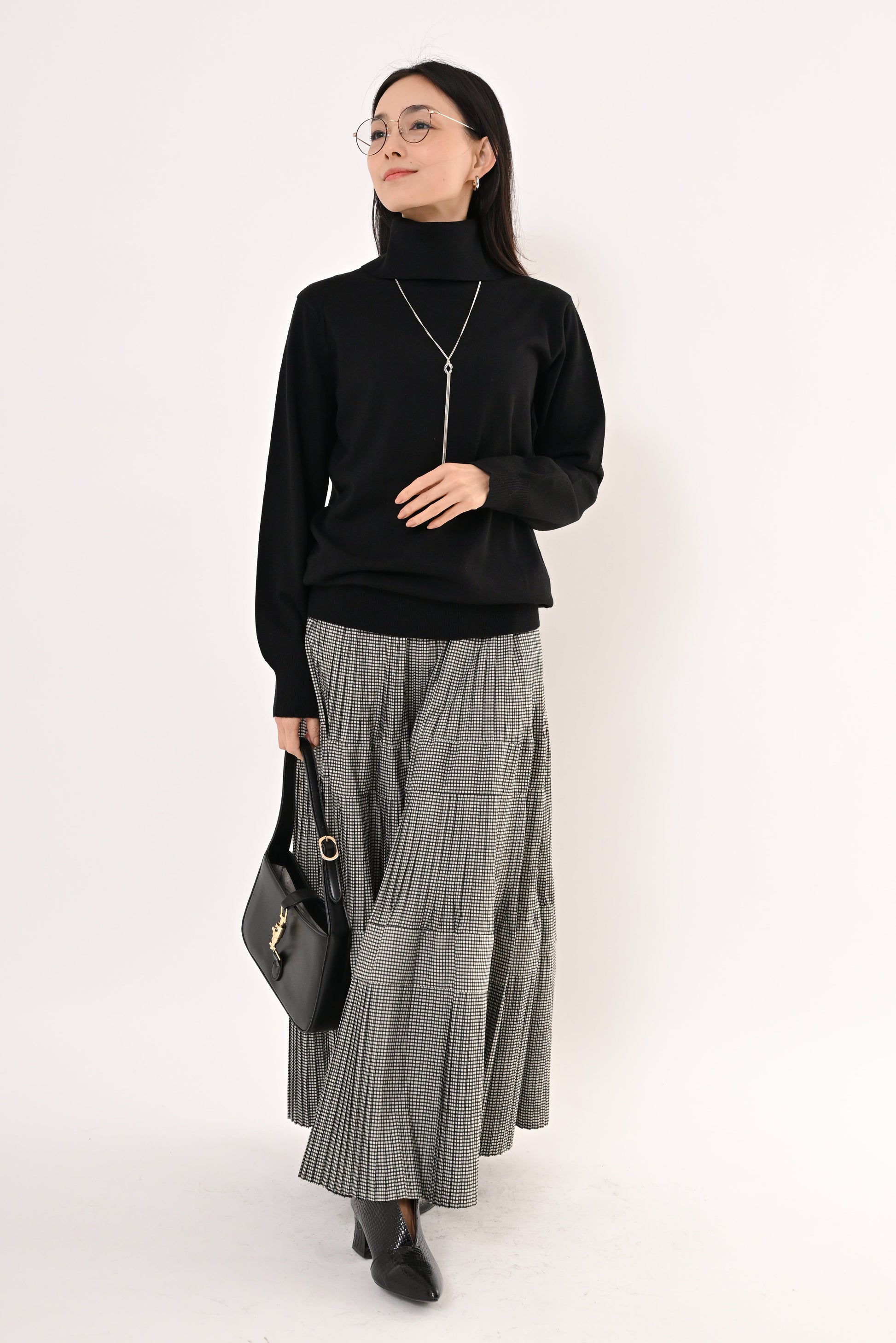 レーヨン混ならではのなめらかでもちっとした肌ざわりが魅力の前後2WAY仕様のハイネックニット。