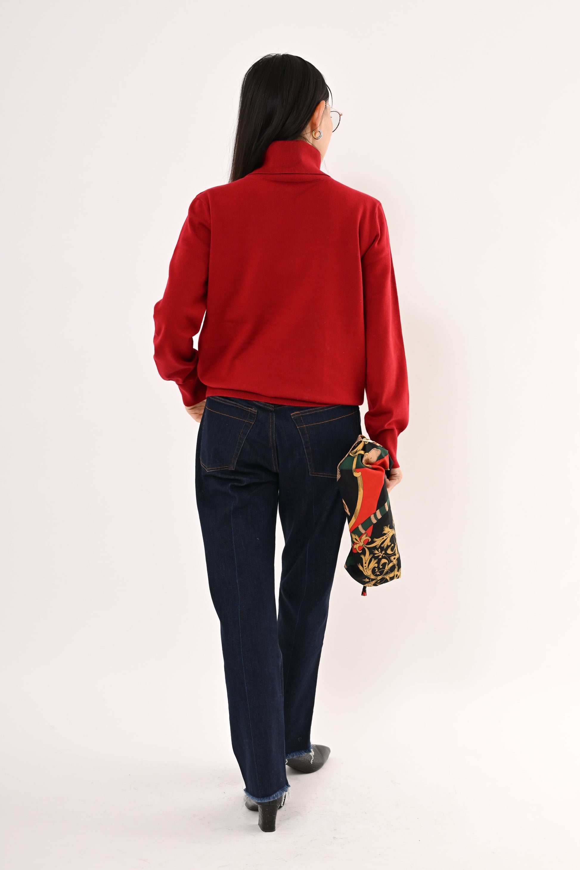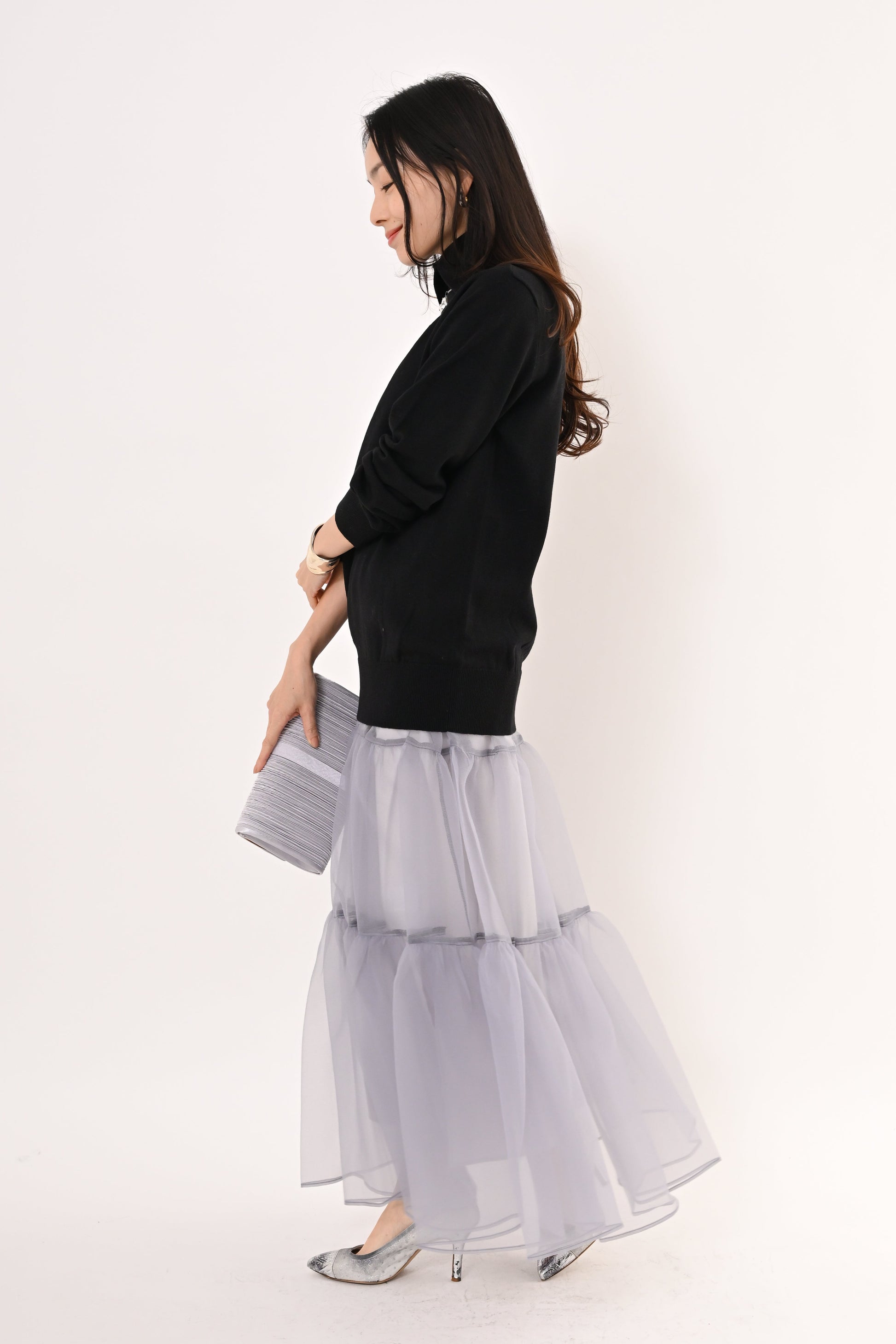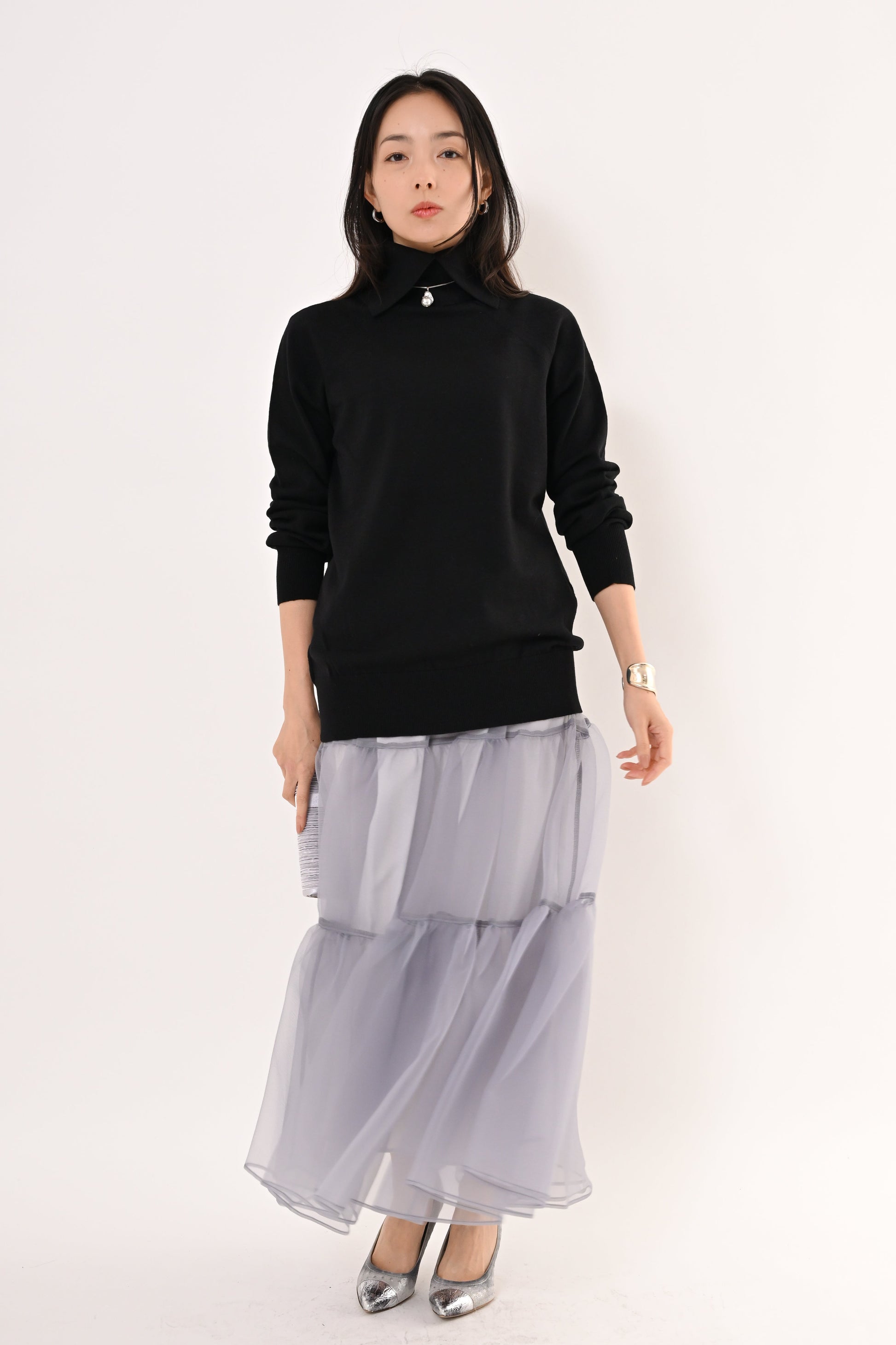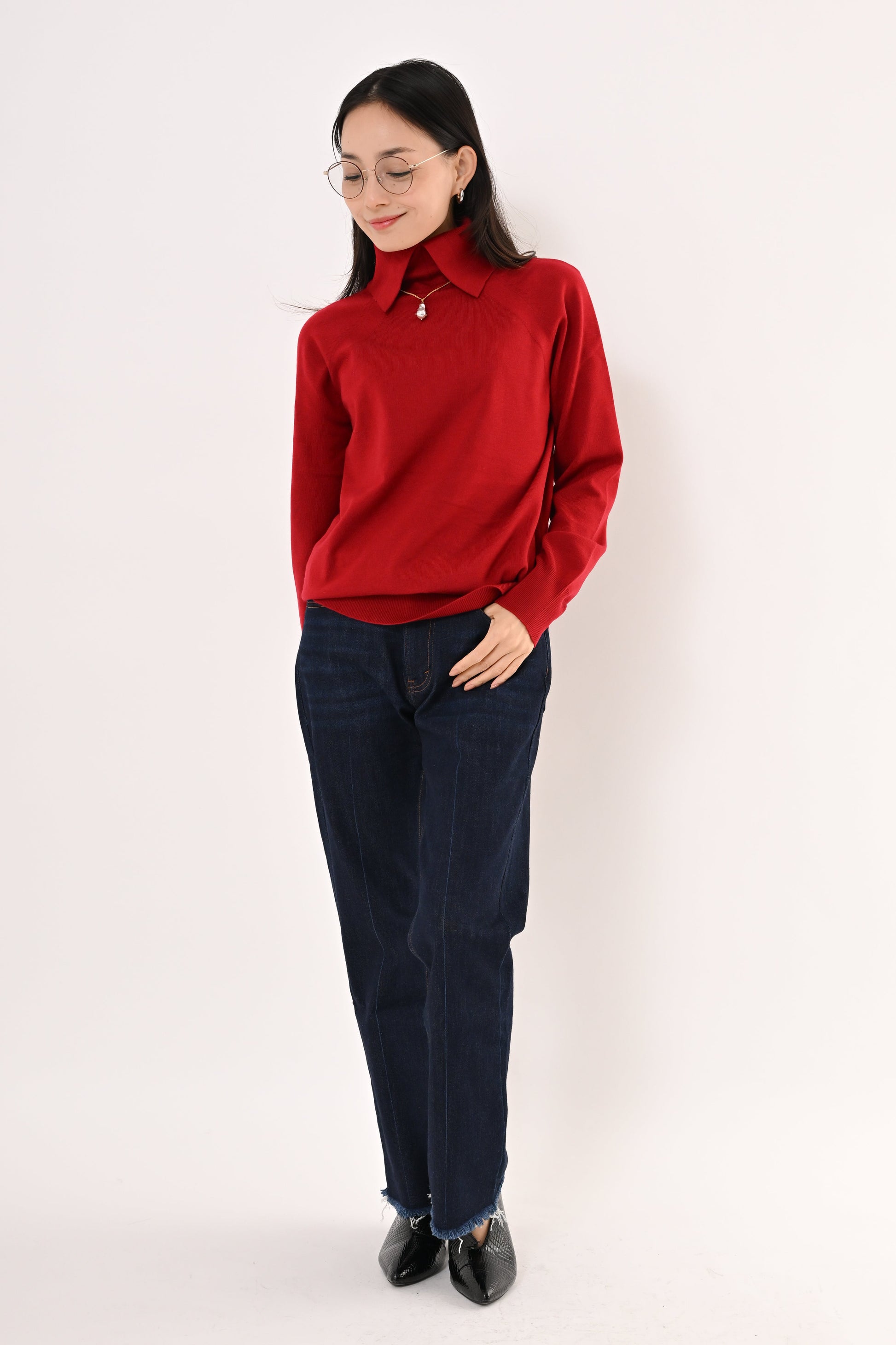レーヨン混ならではのなめらかでもちっとした肌ざわりが魅力の前後2WAY仕様のハイネックニット。