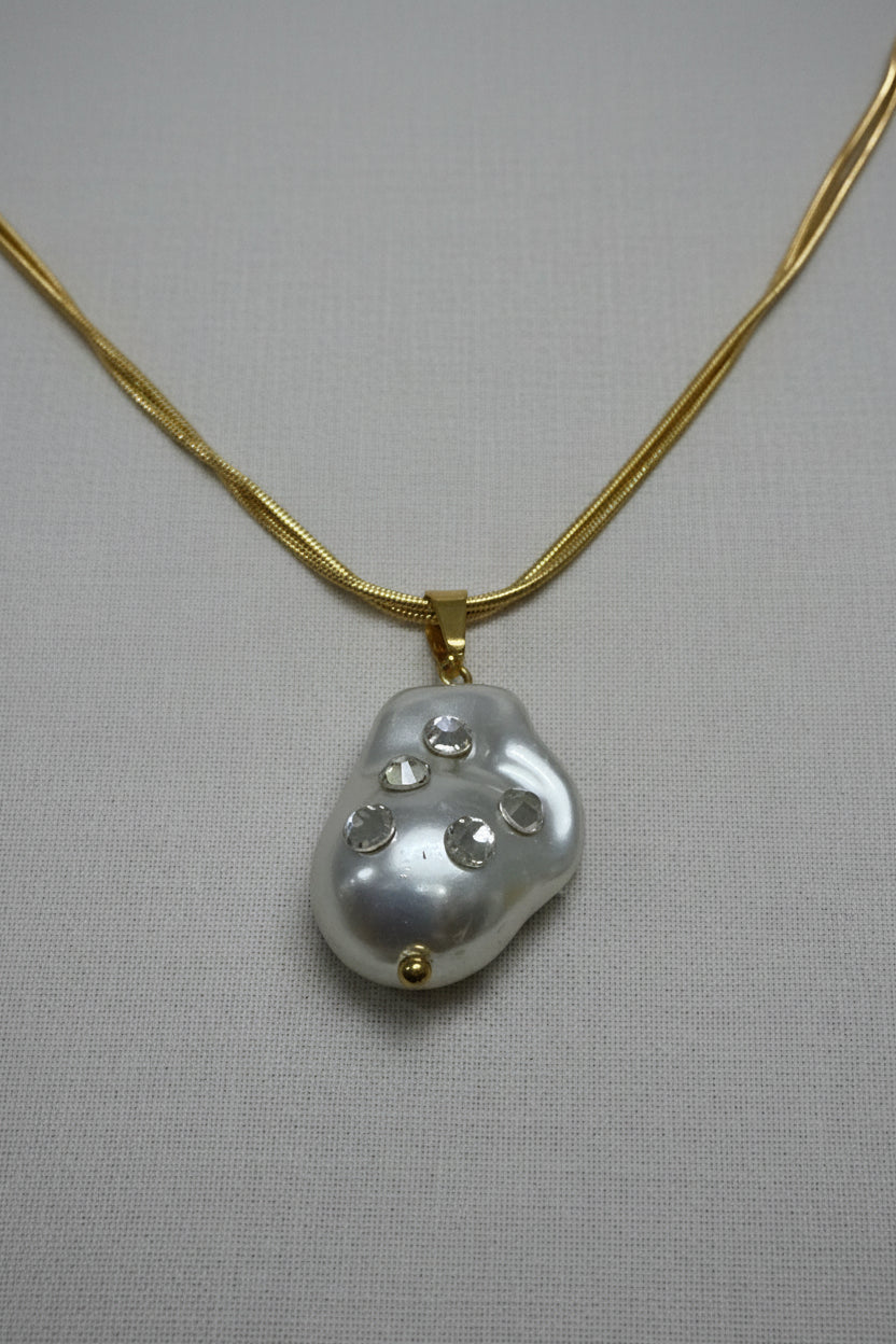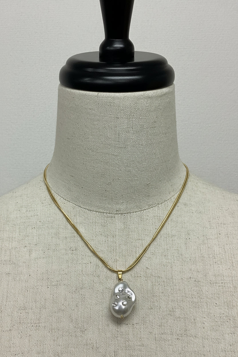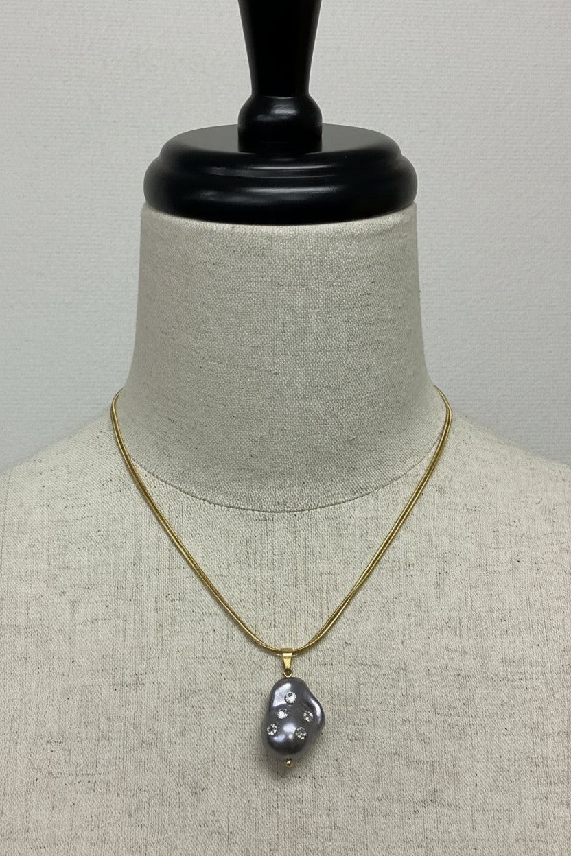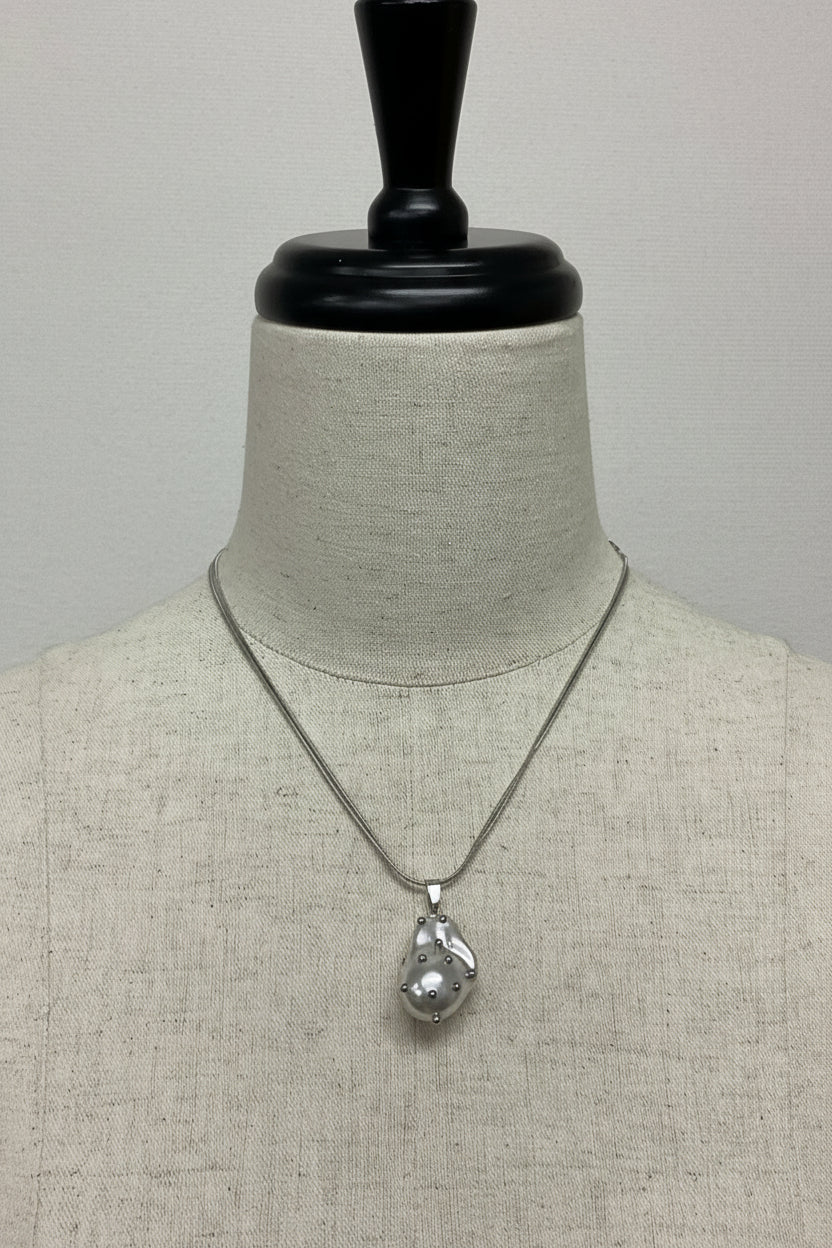 存在感のあるバロックパールに、ランダムにスタッズやジルコンをあしらった2WAYネックレス。
