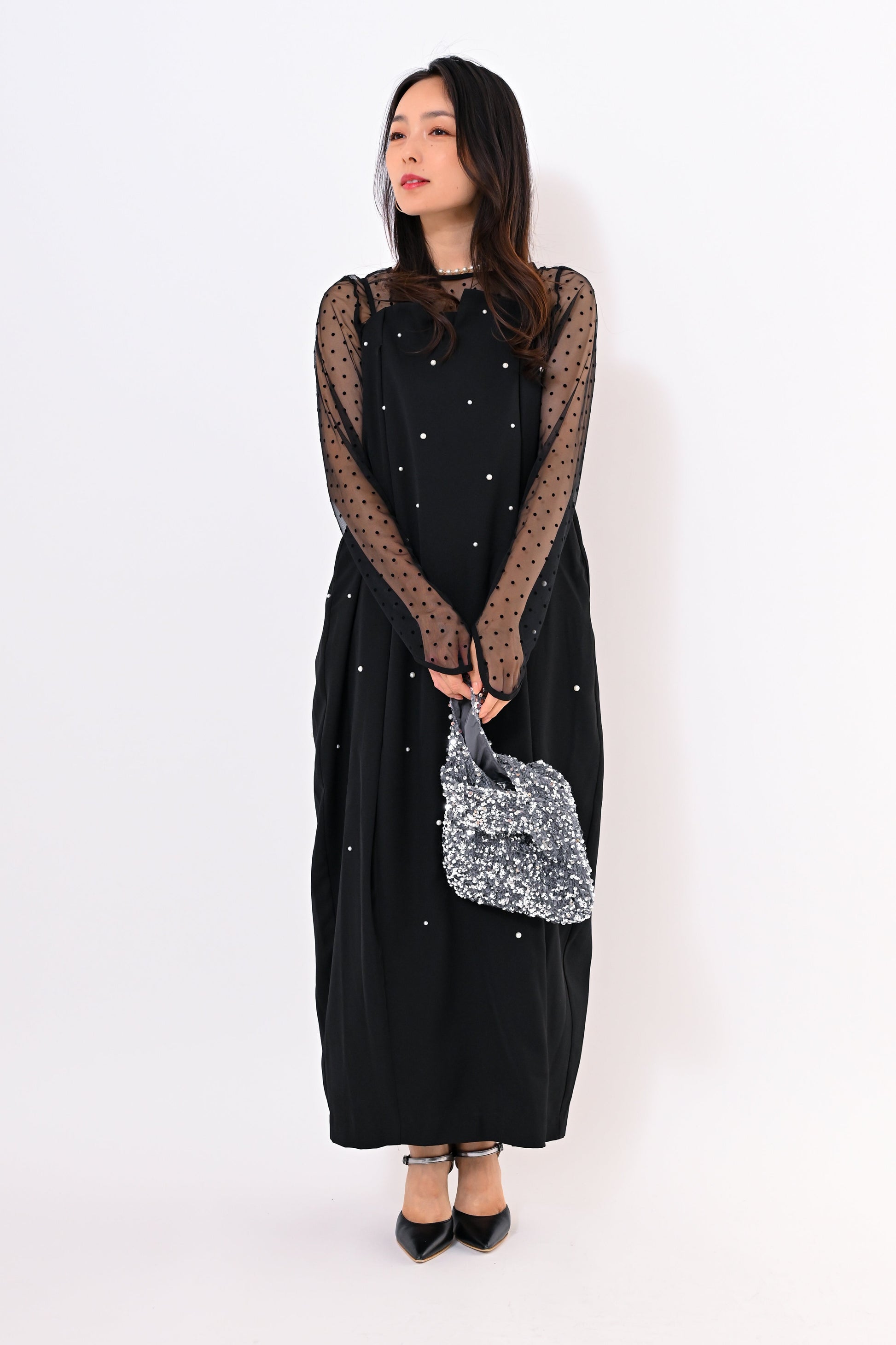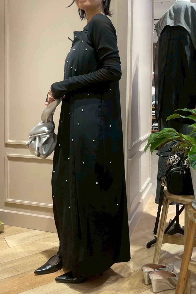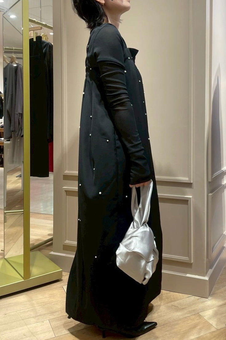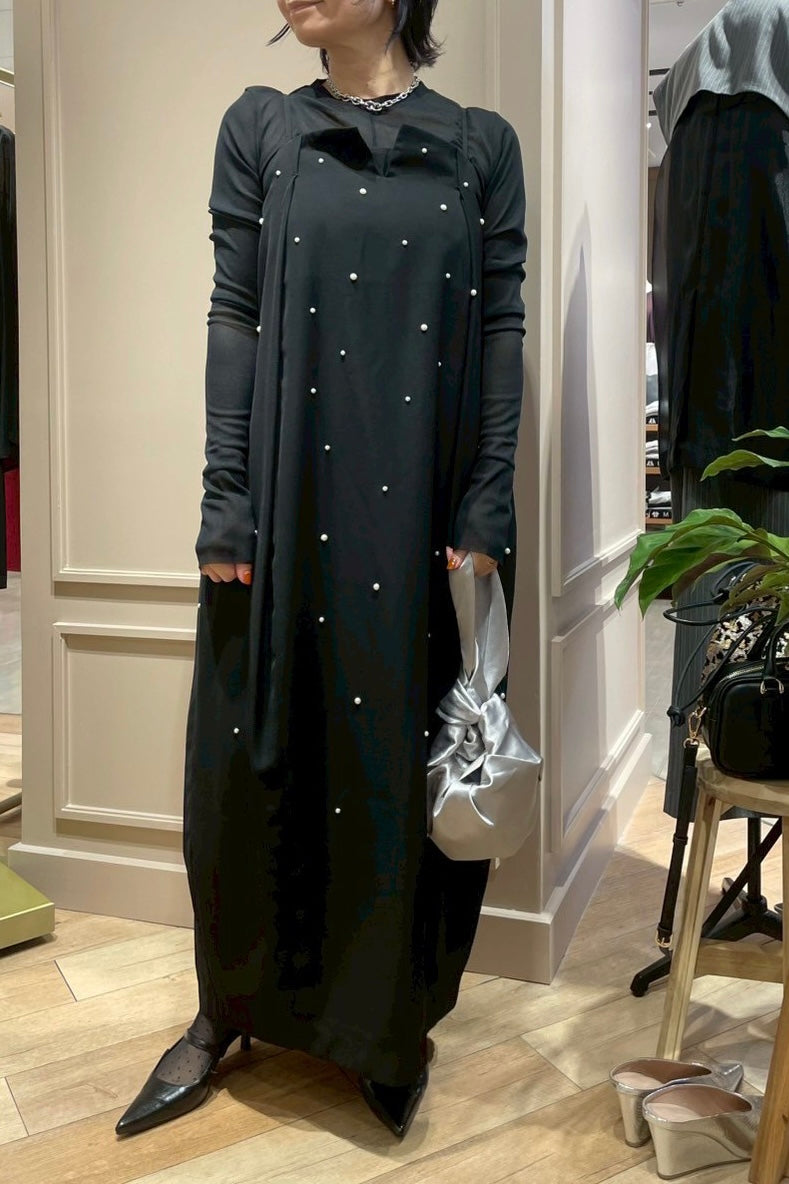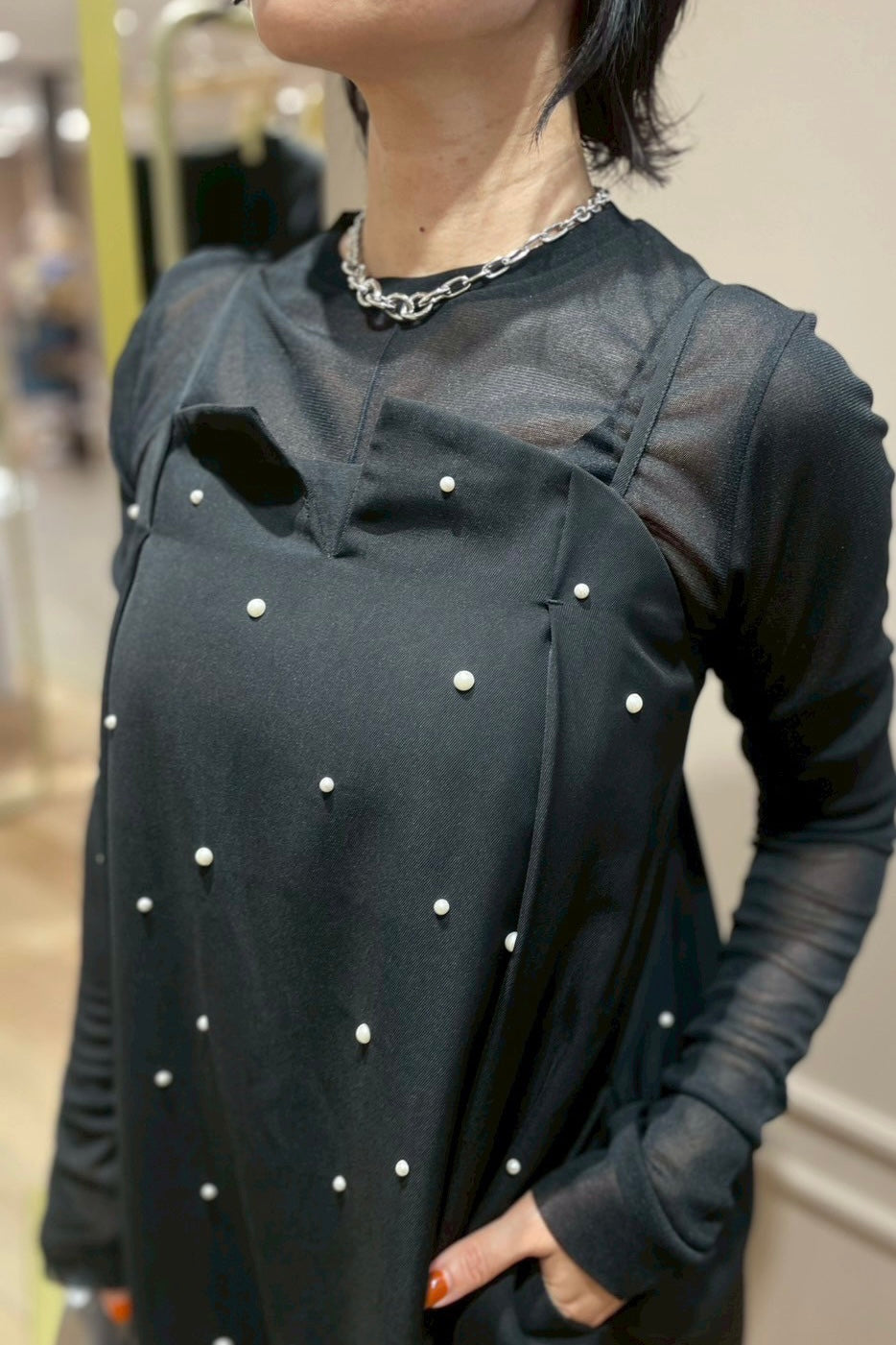 ネックラインには程よくモード感を添えるキーネックを採用し、ランダムにあしらったパールがアクセントに。