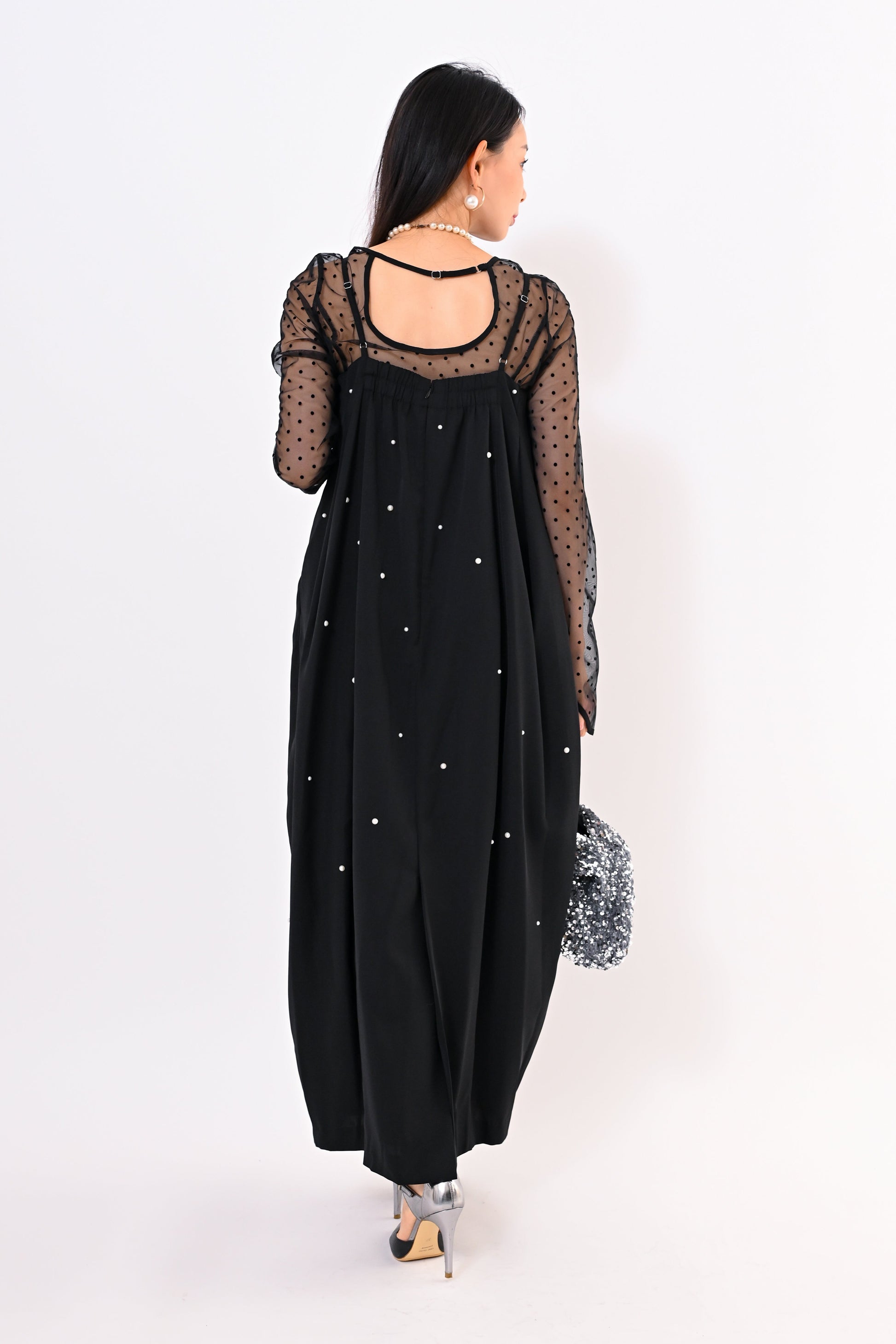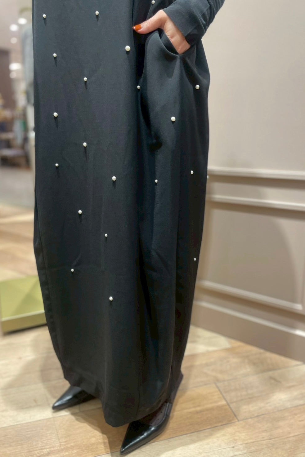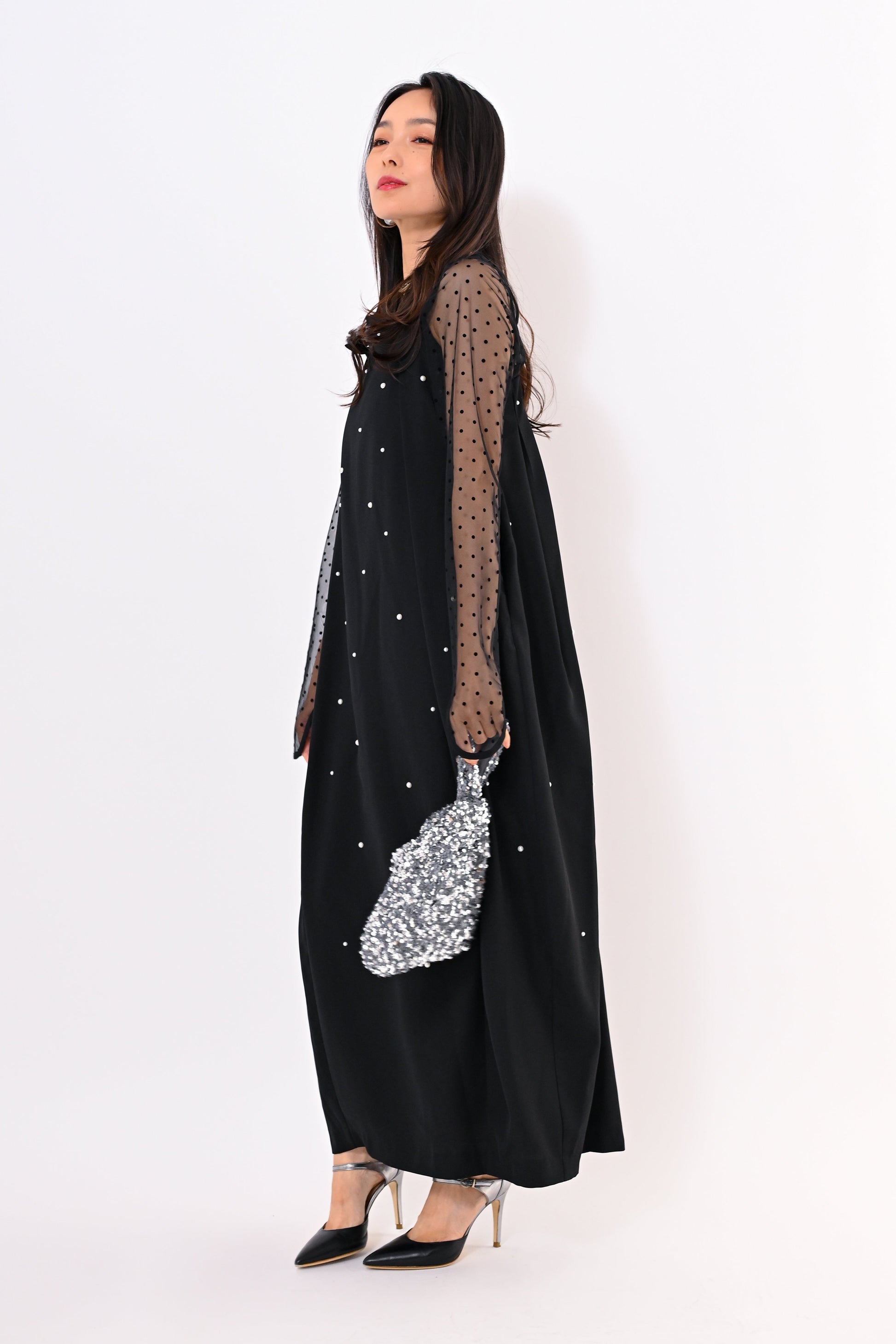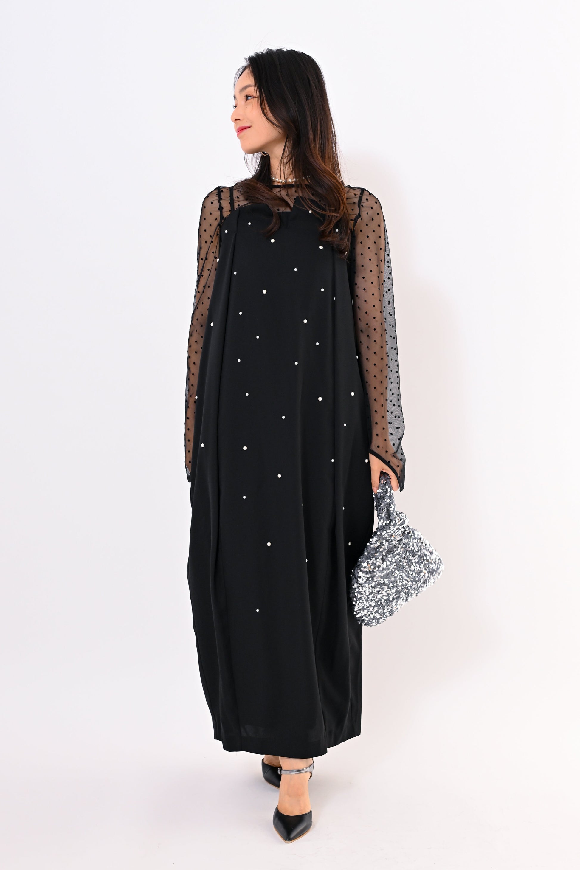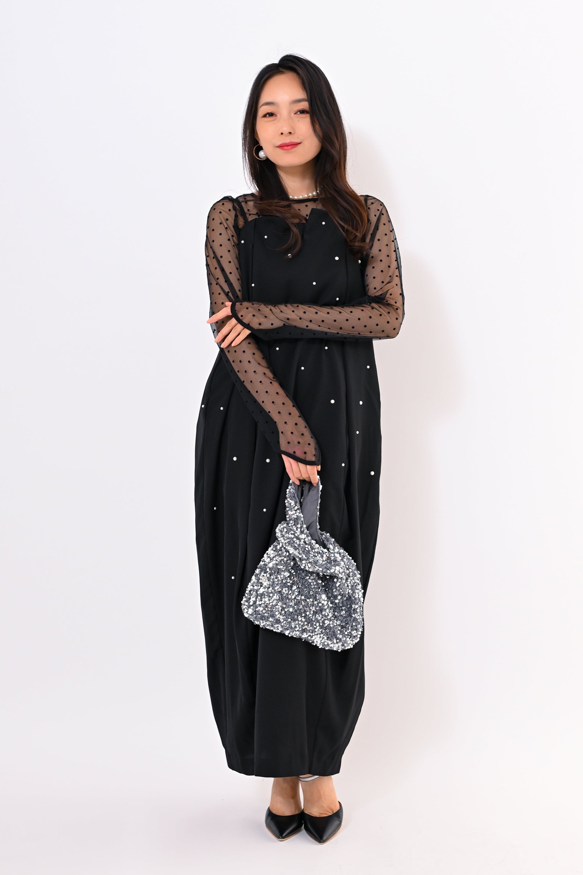 ネックラインには程よくモード感を添えるキーネックを採用し、ランダムにあしらったパールがアクセントに。
