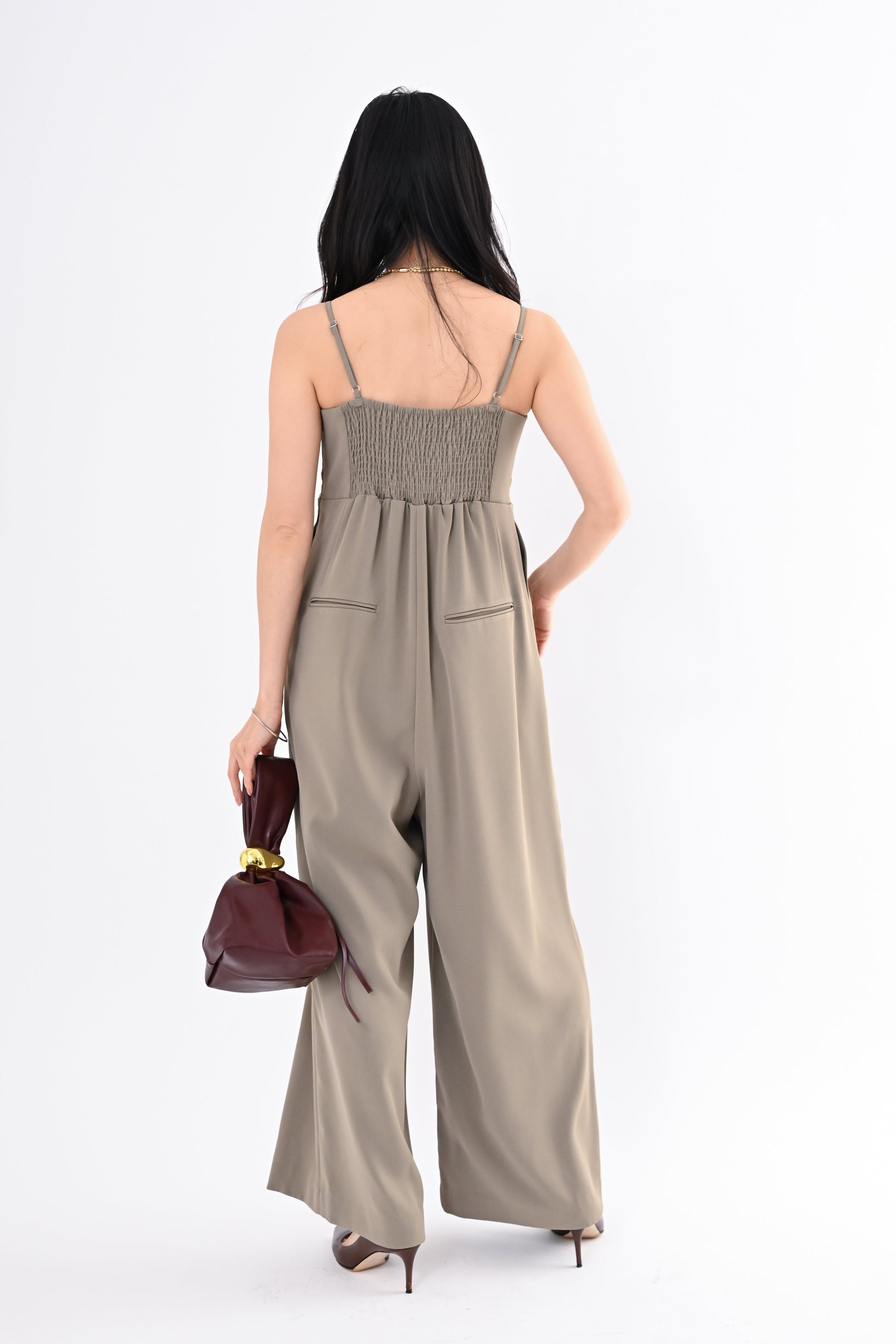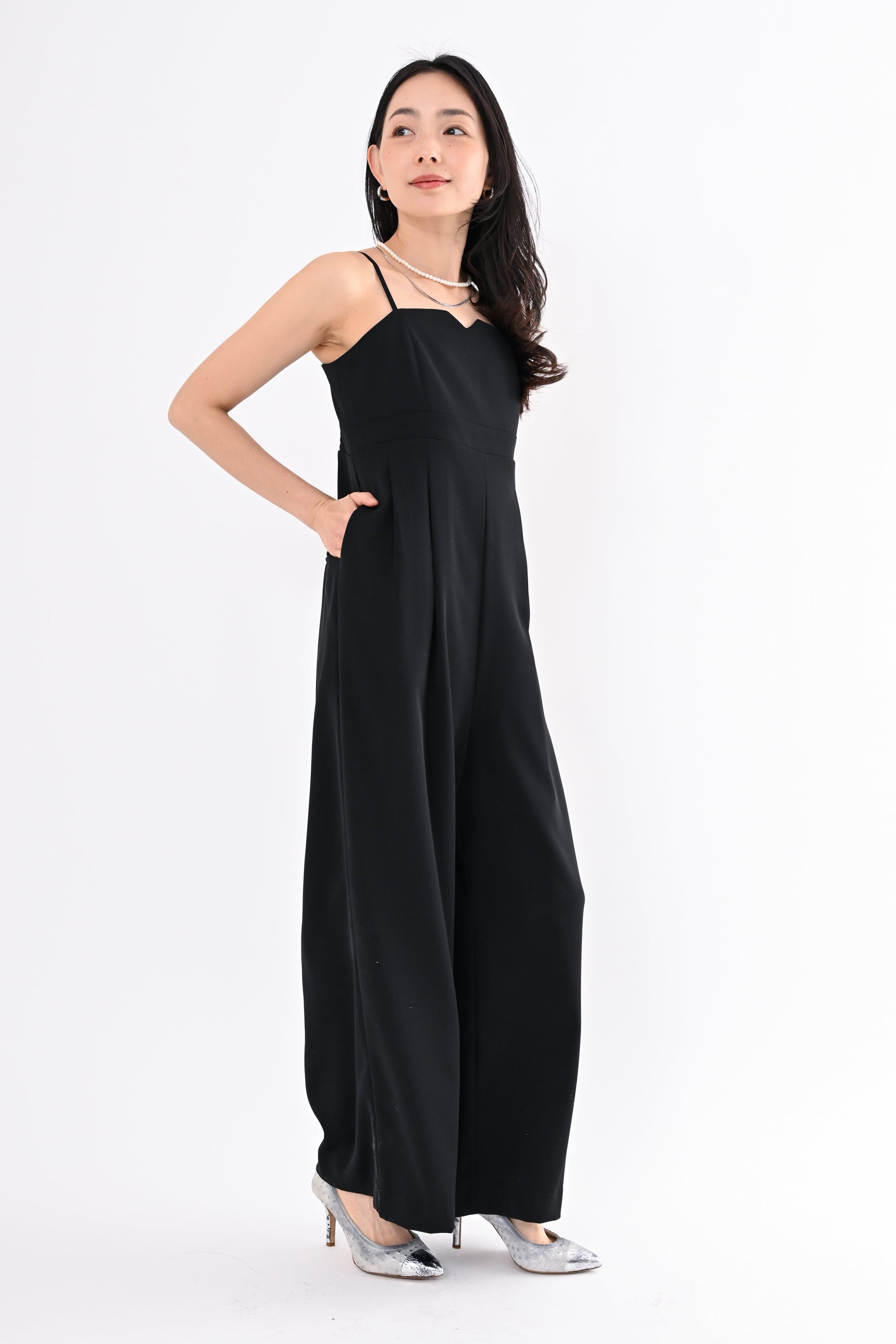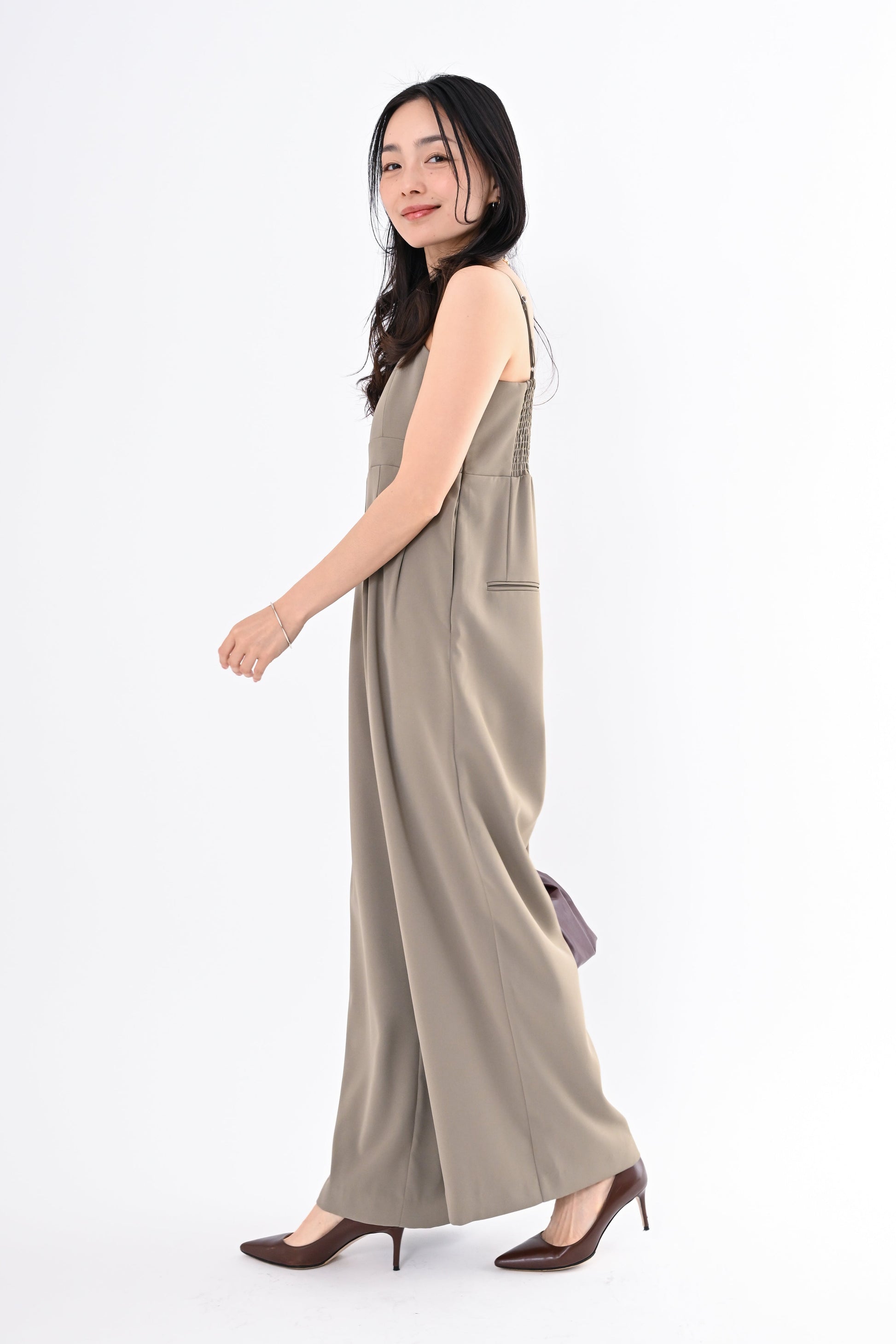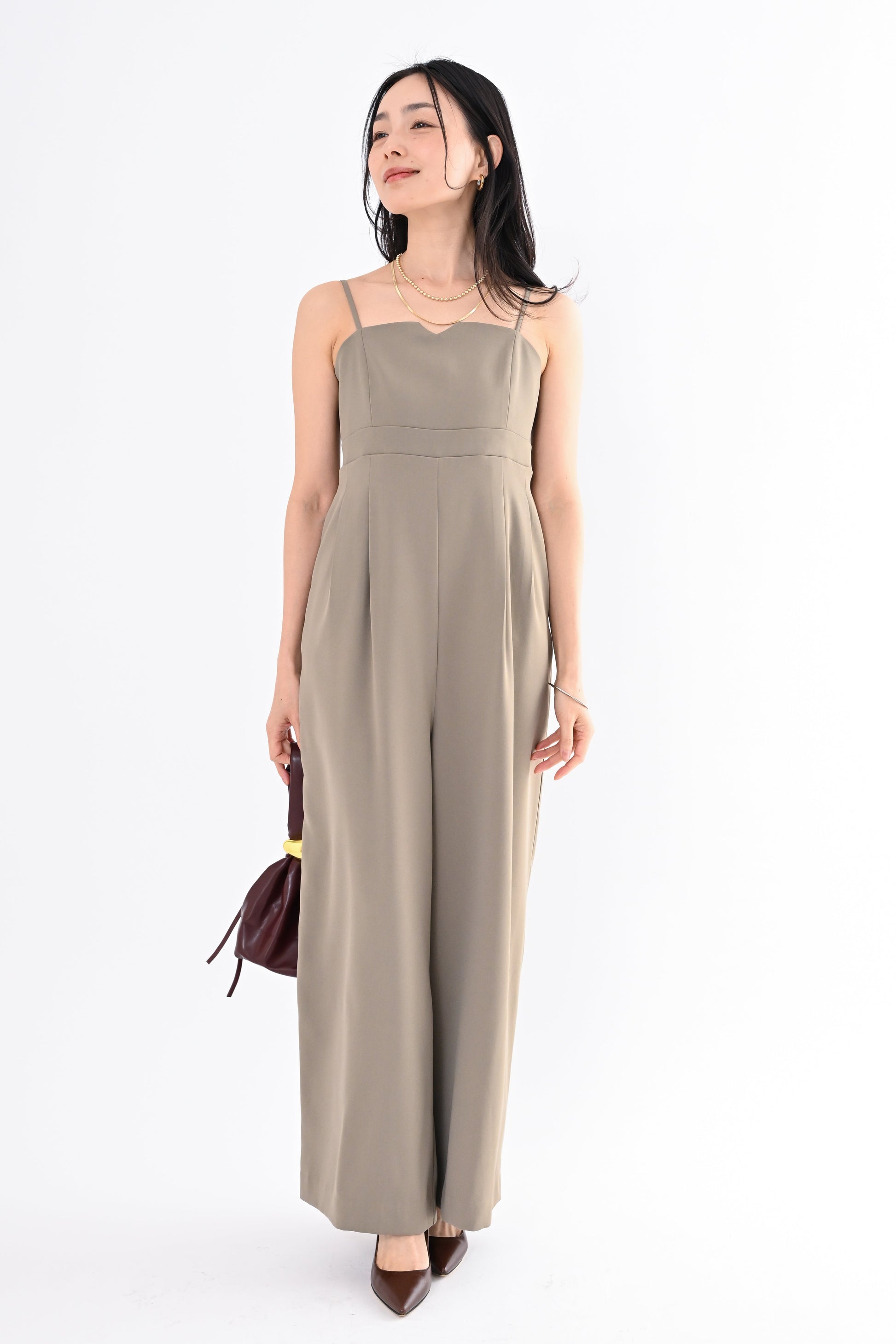 オールインワンは縦ラインを意識したデザインで、自然にスタイルアップ。後ろ身頃はゴムの仕様。着用しやすい一枚です。