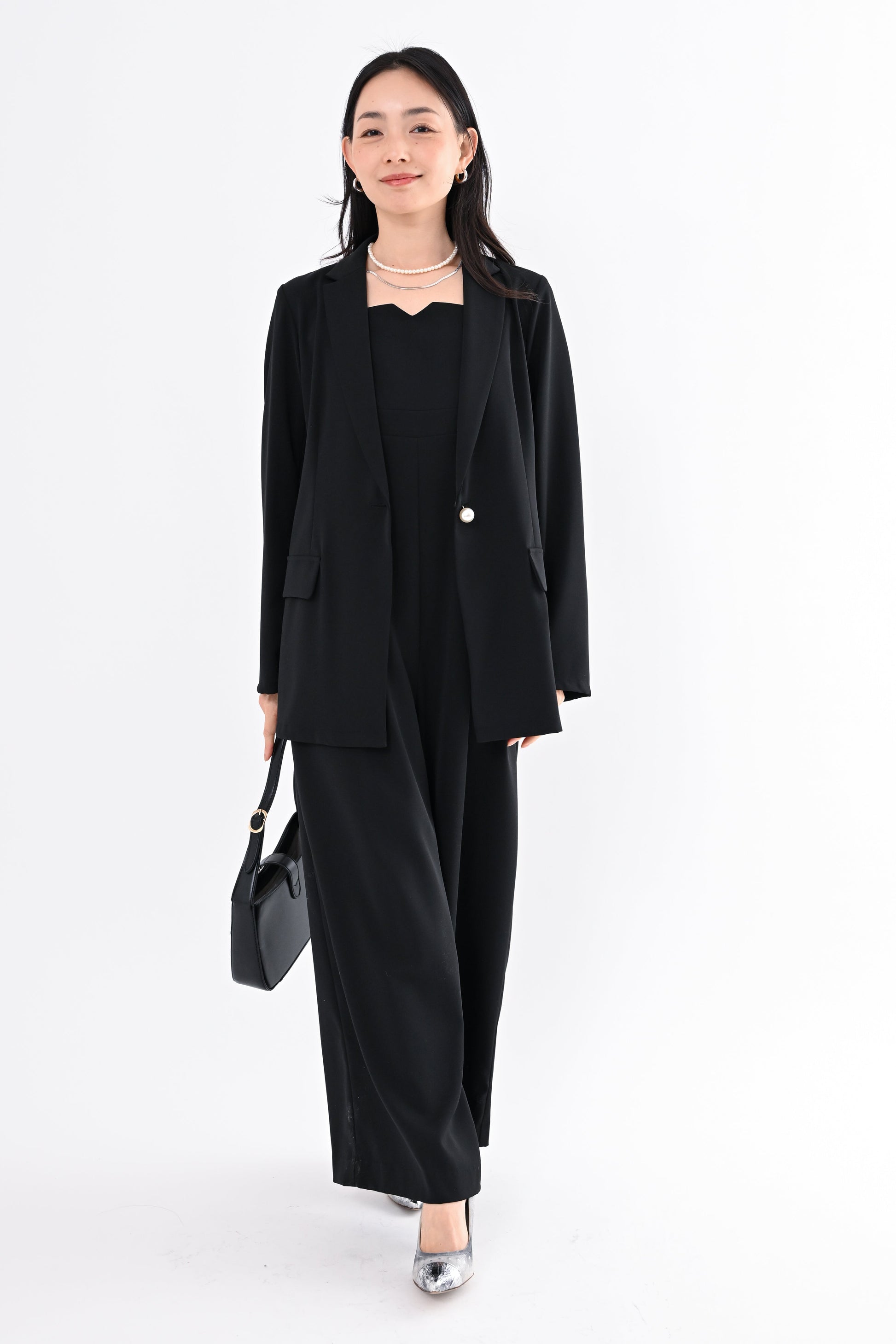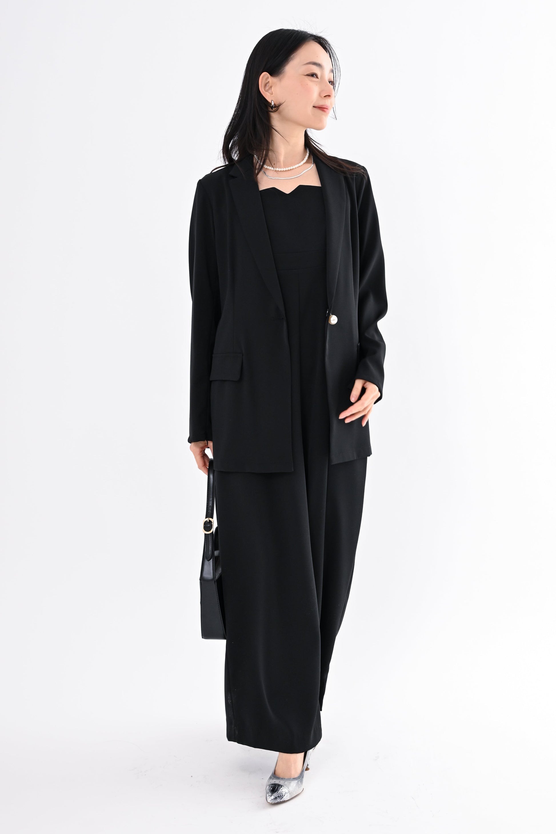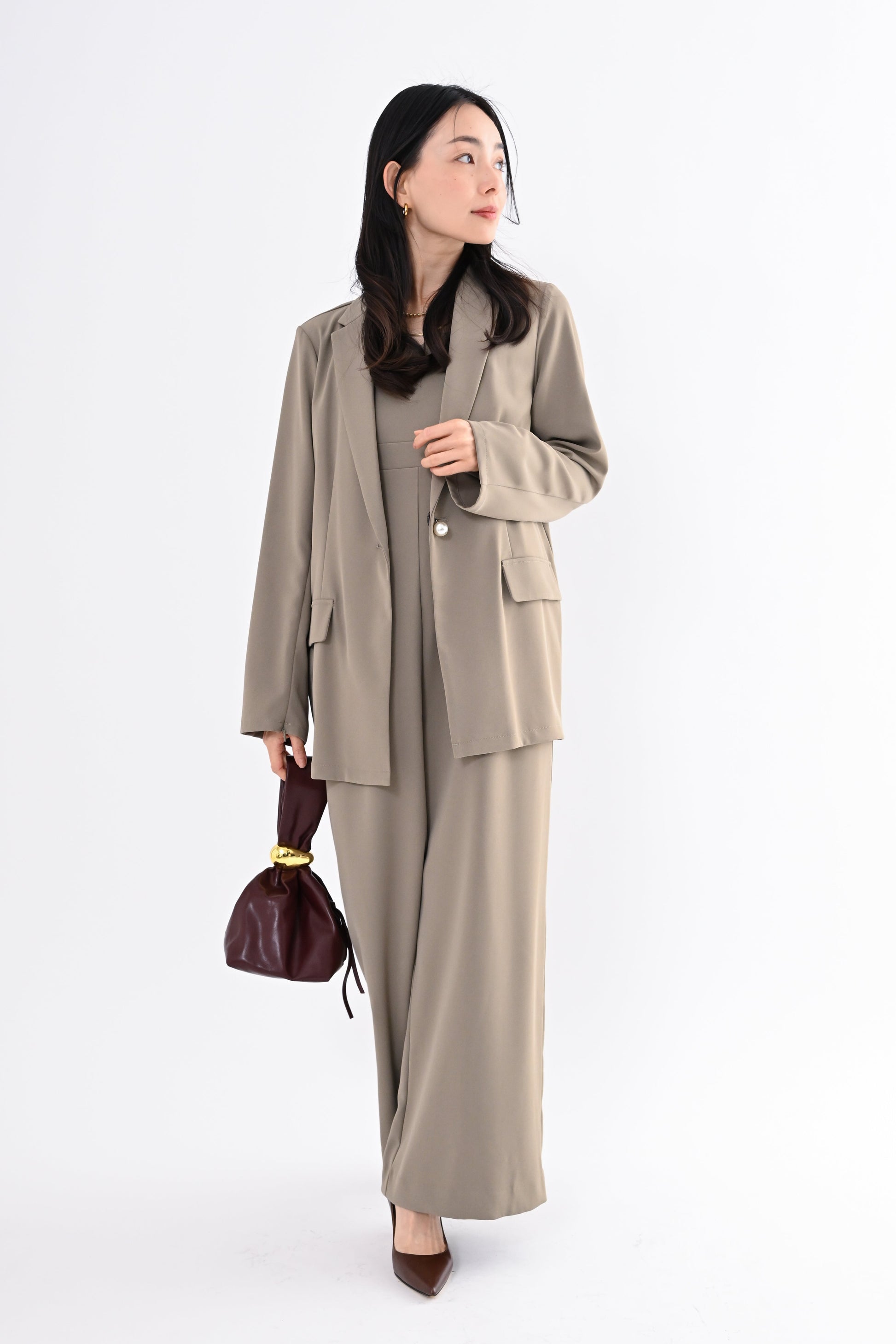 ANDRESD(アンドレスド)のジャケットとオールインワンを組み合わせたセットアップ。きちんと感のある佇まいの中に、さりげなくトレンドを取り入れた一着です。