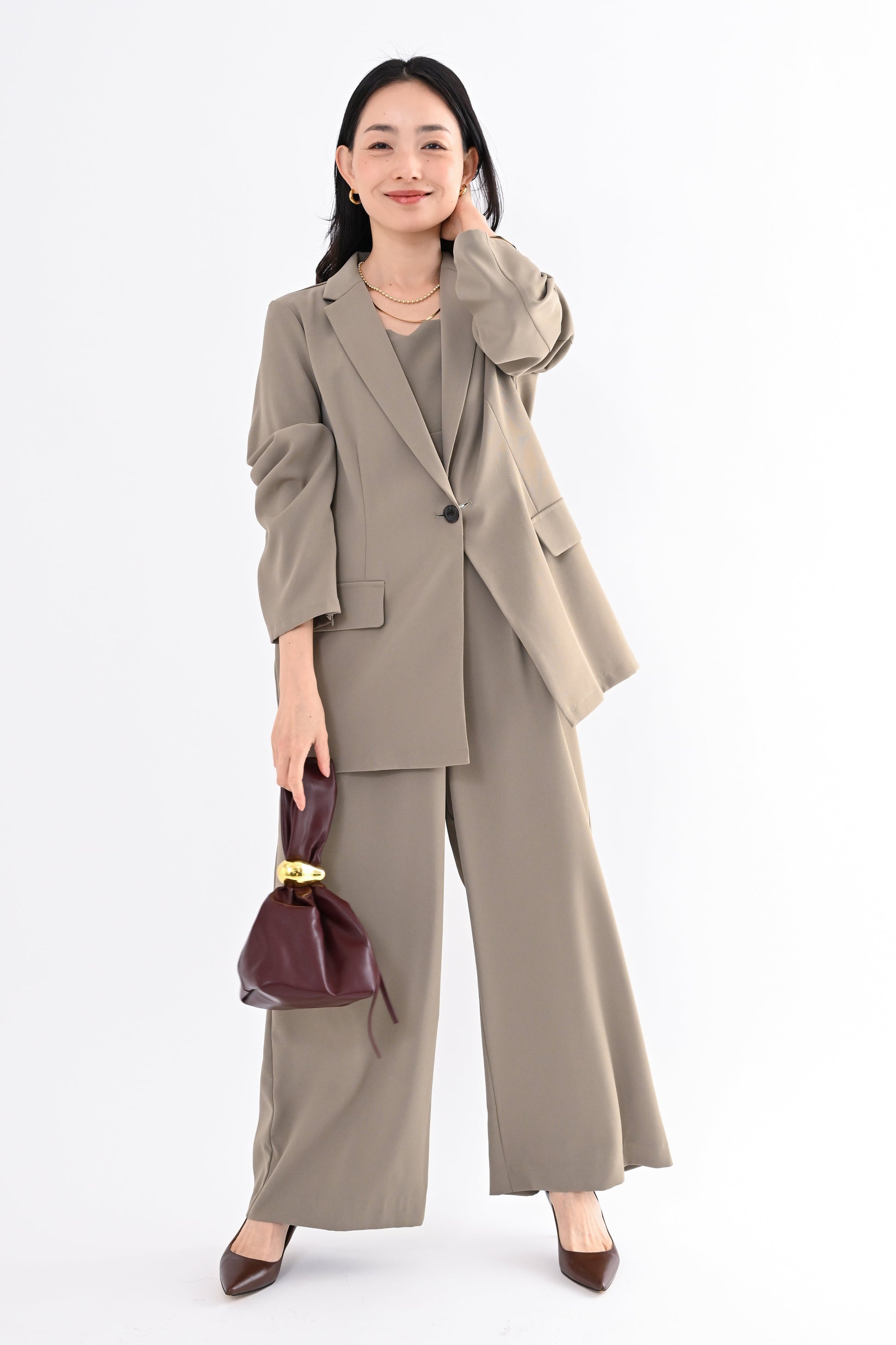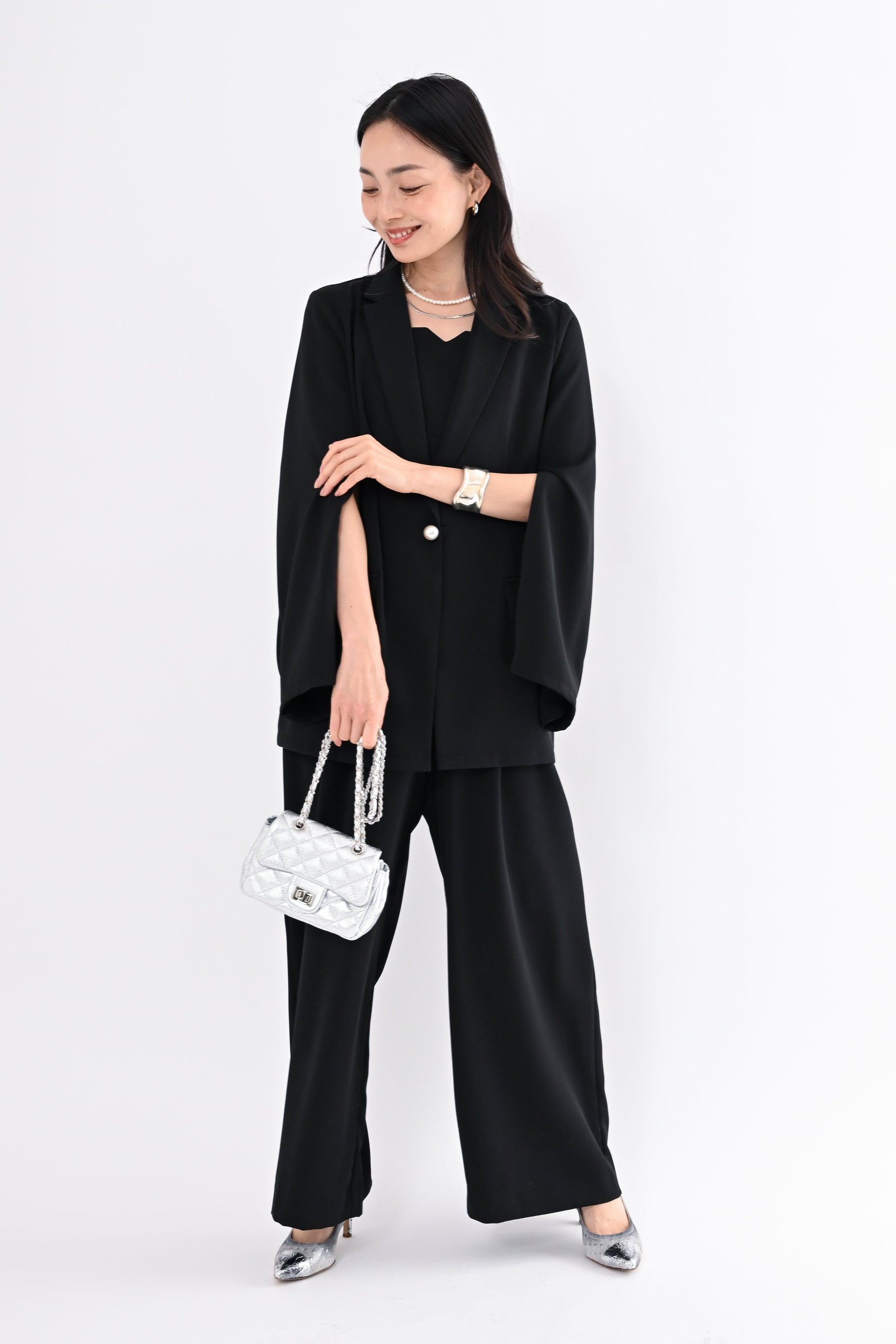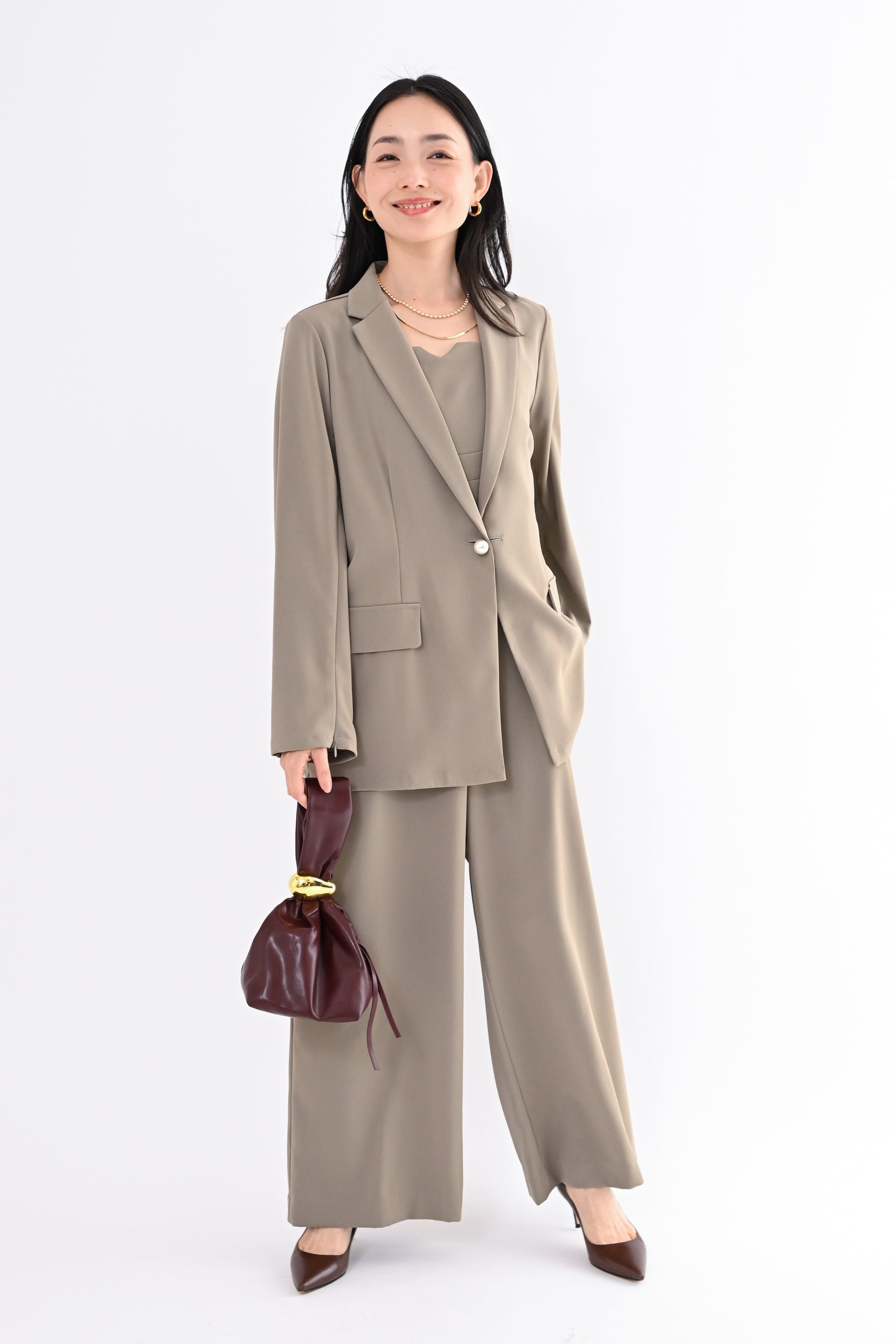 ANDRESD(アンドレスド)のジャケットとオールインワンを組み合わせたセットアップ。きちんと感のある佇まいの中に、さりげなくトレンドを取り入れた一着です。