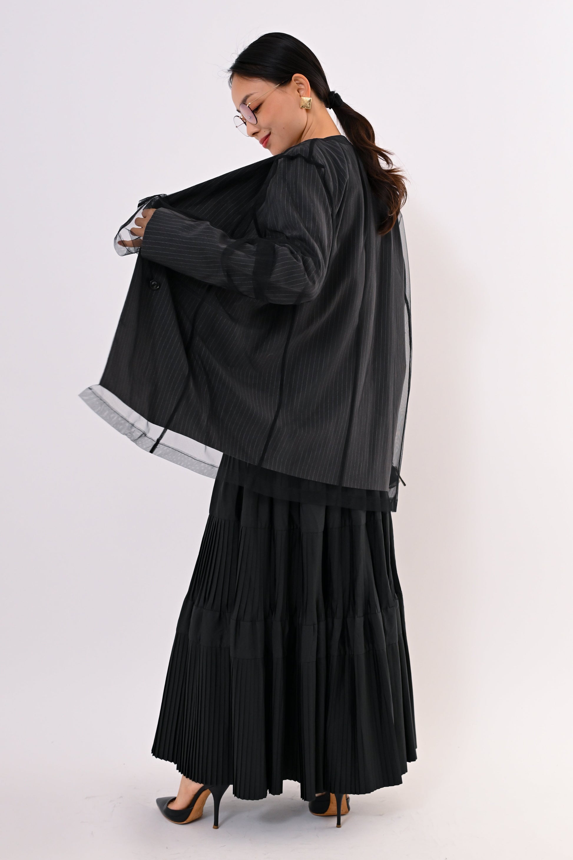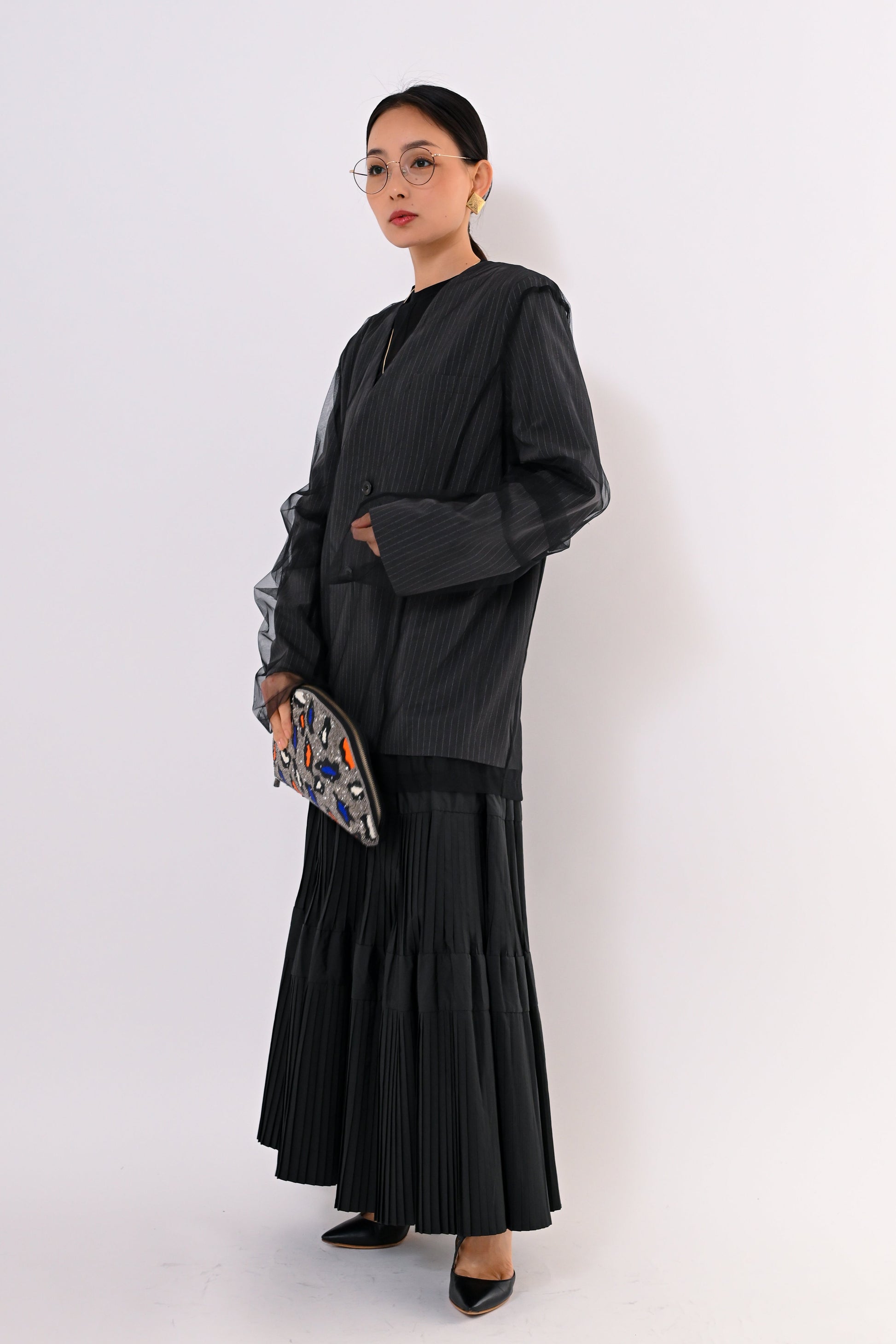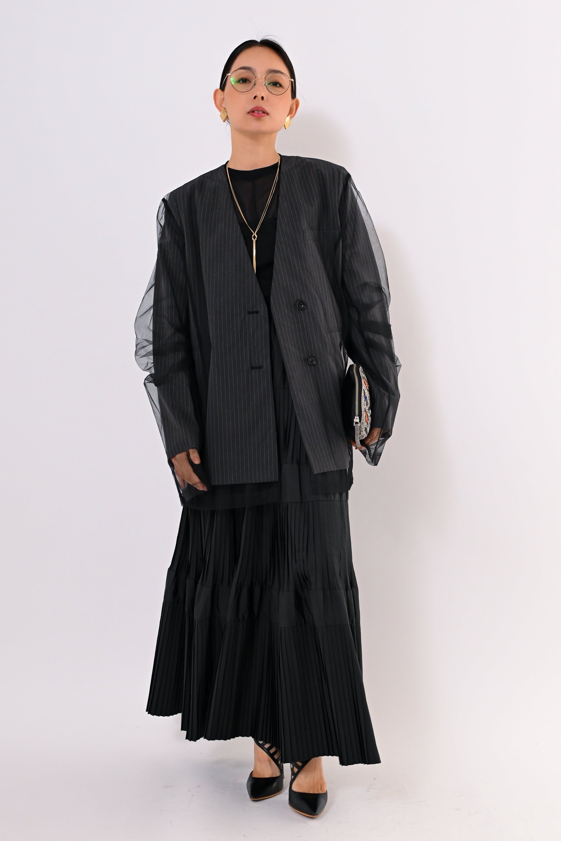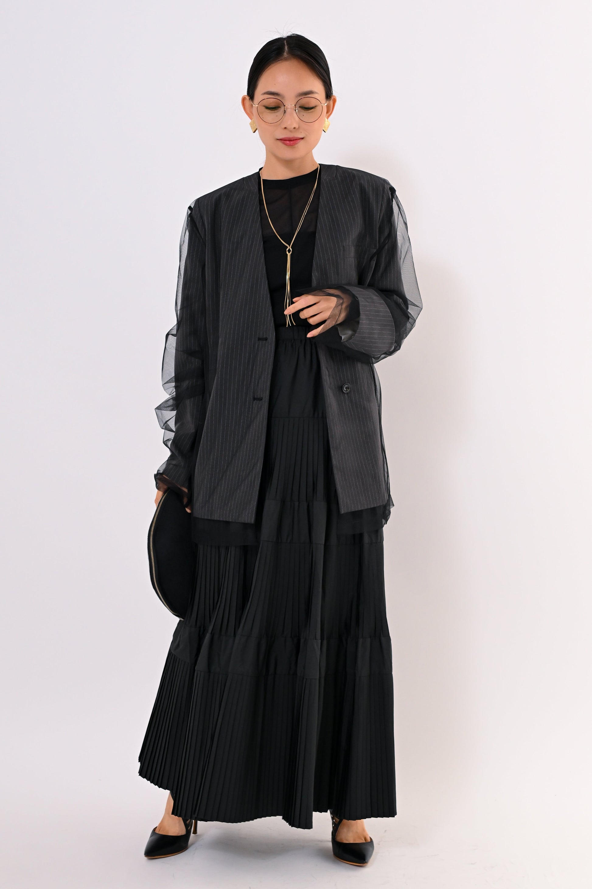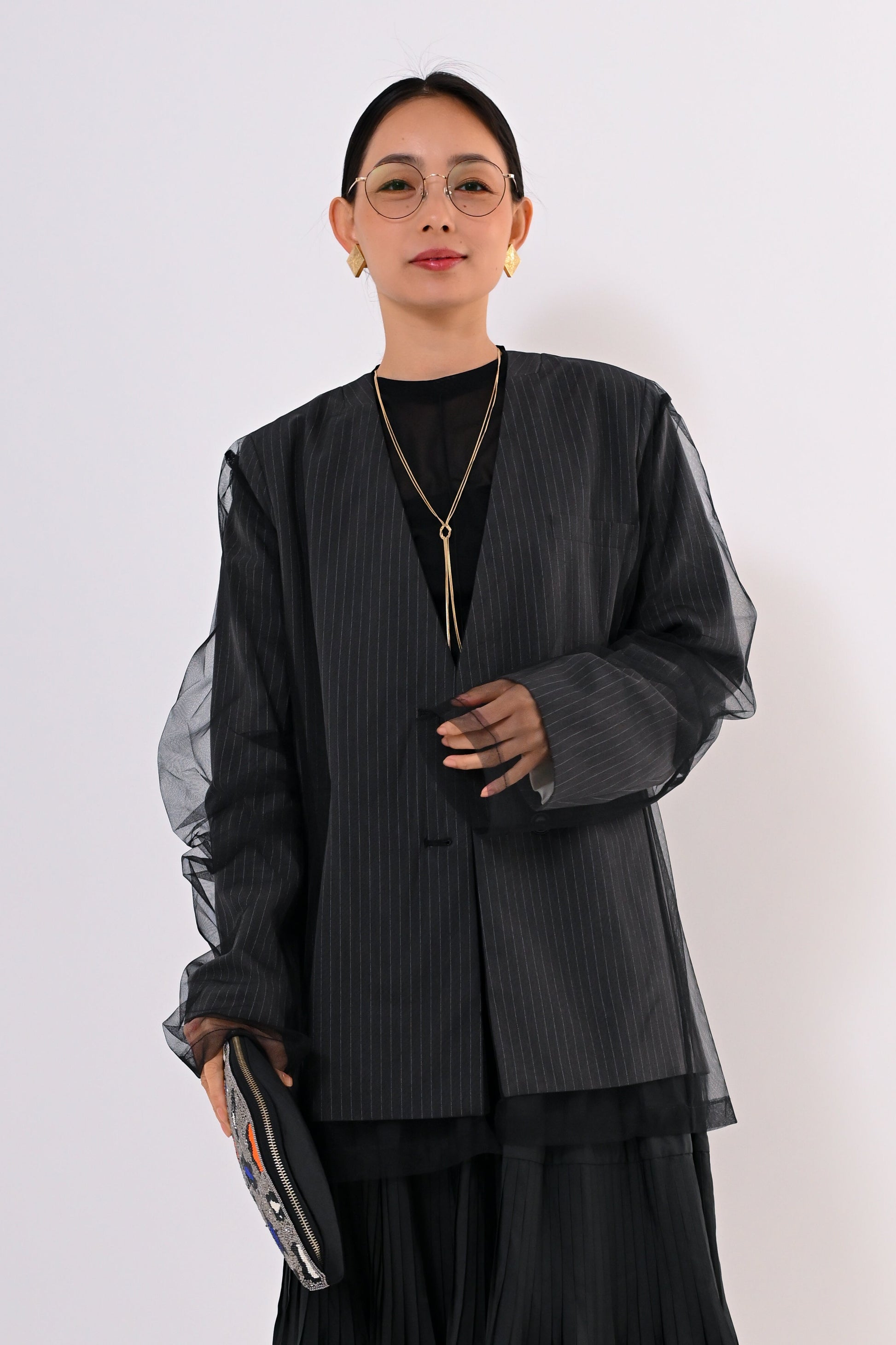 ポリエステル×レーヨンのピンストライプ素材とハリ感のあるチュール素材をレイヤードした、ボクシーなカラーレスジャケットです。