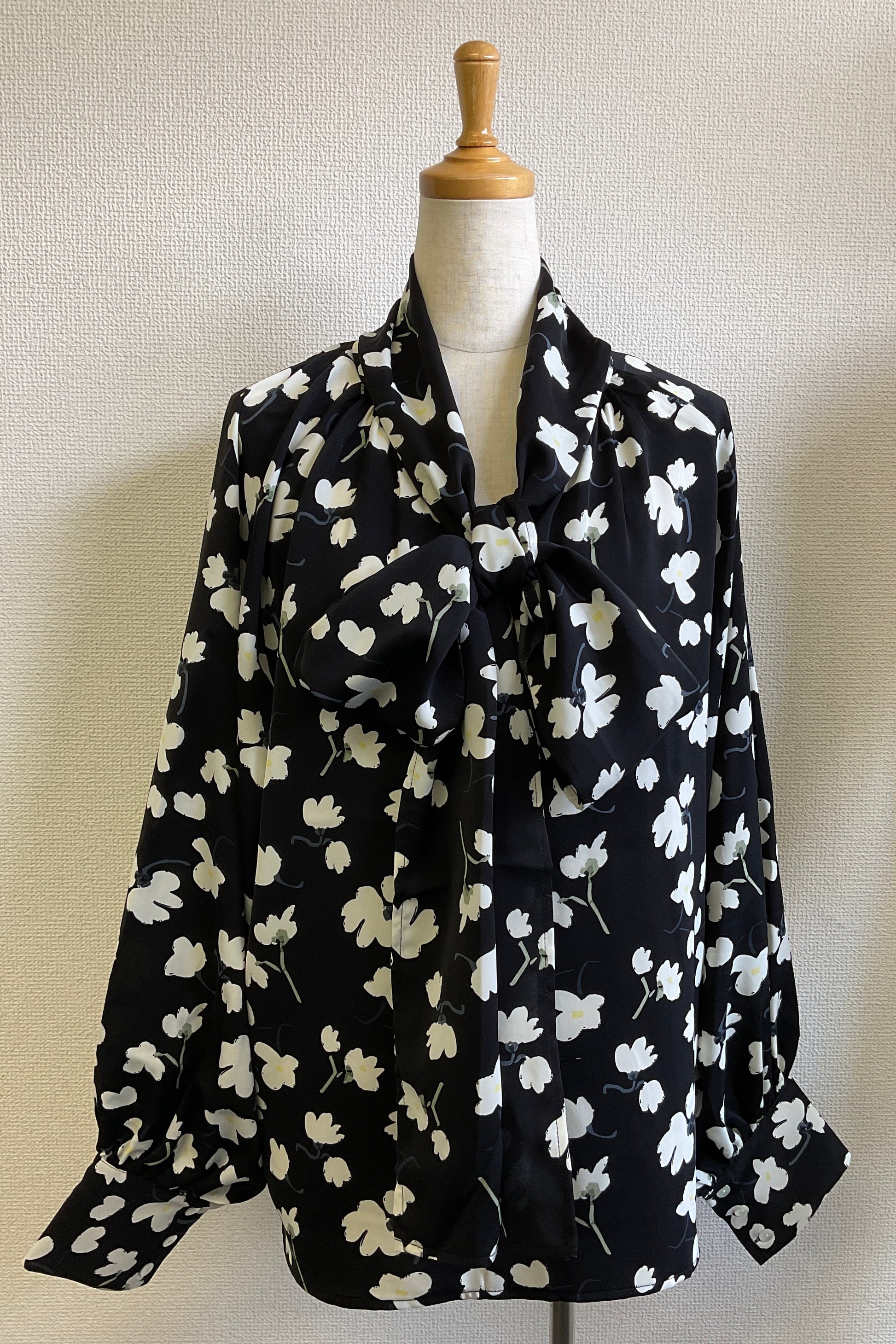 レトロ感漂うフラワープリントが印象的なボウタイブラウス。