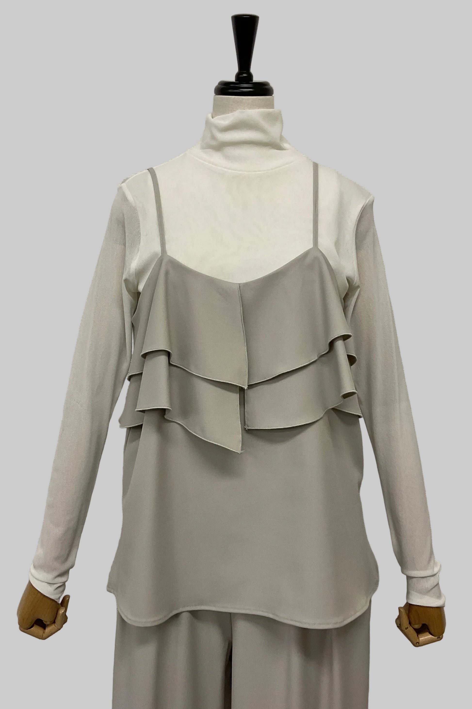 フリルの分量にもこだわり、程よいボリューム感で存在感がありながらも着こなしやすいバランスに。同素材のパンツと合わせれば、オールインワンのような洗練されたスタイルが完成します。