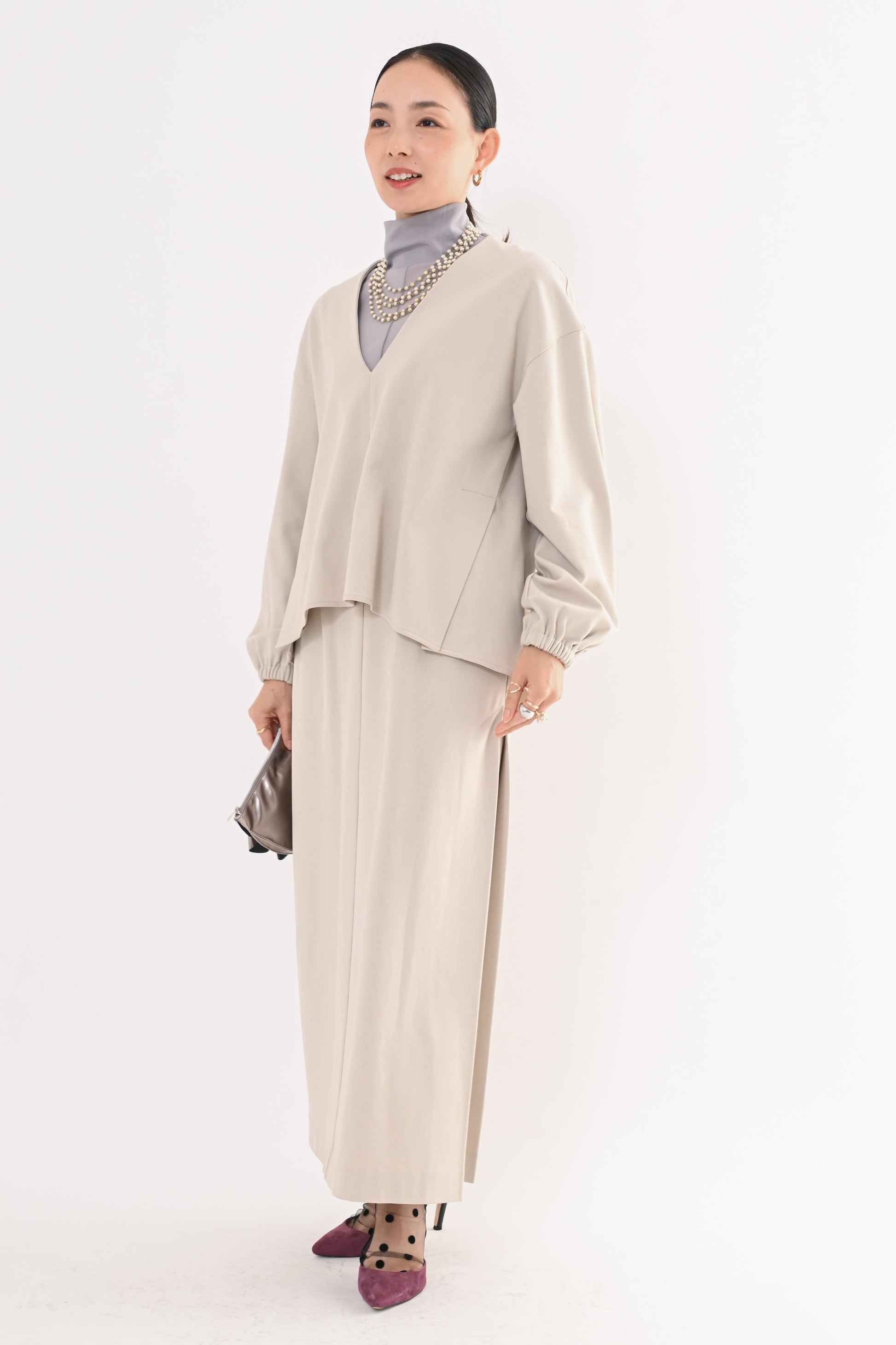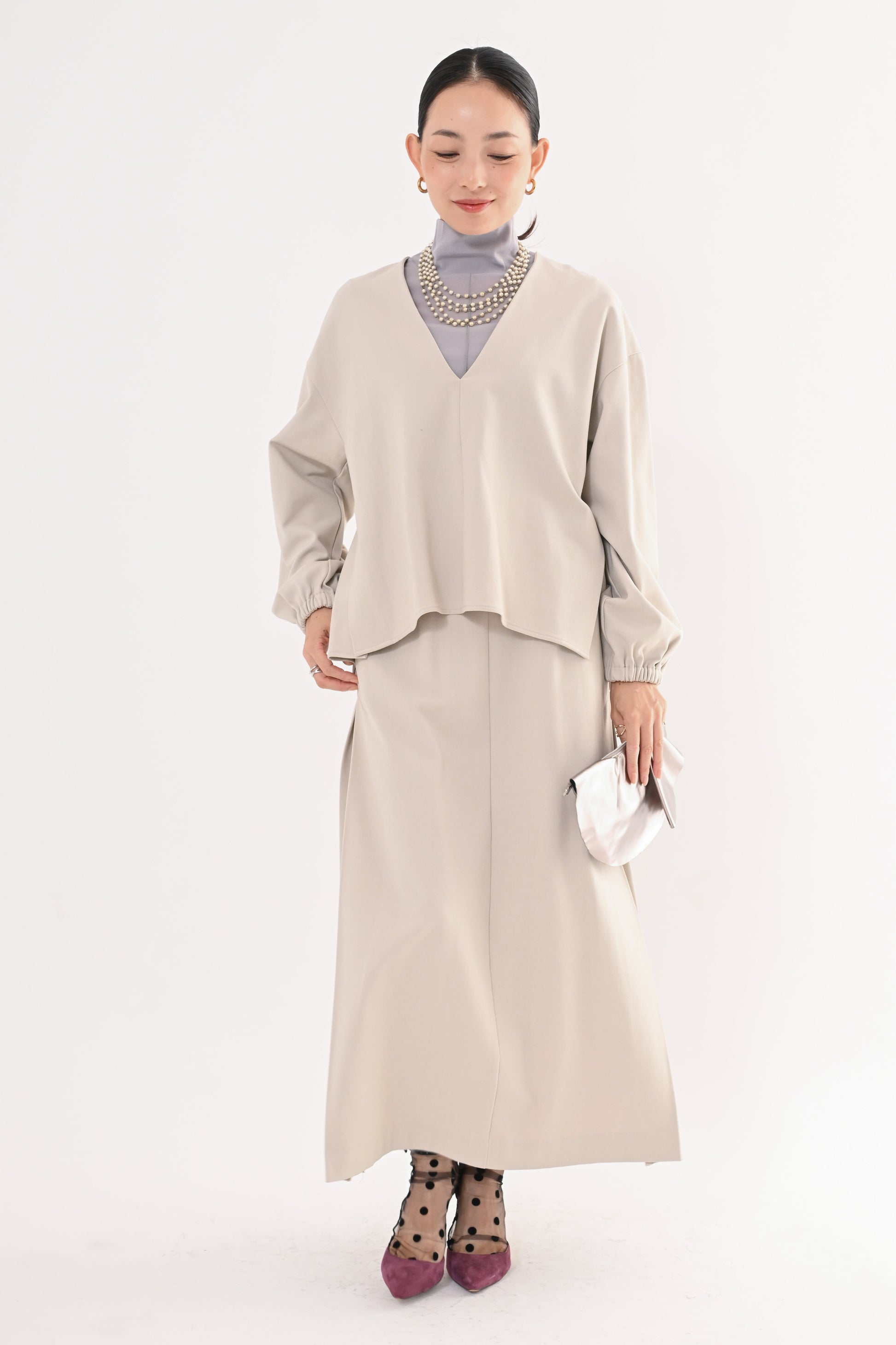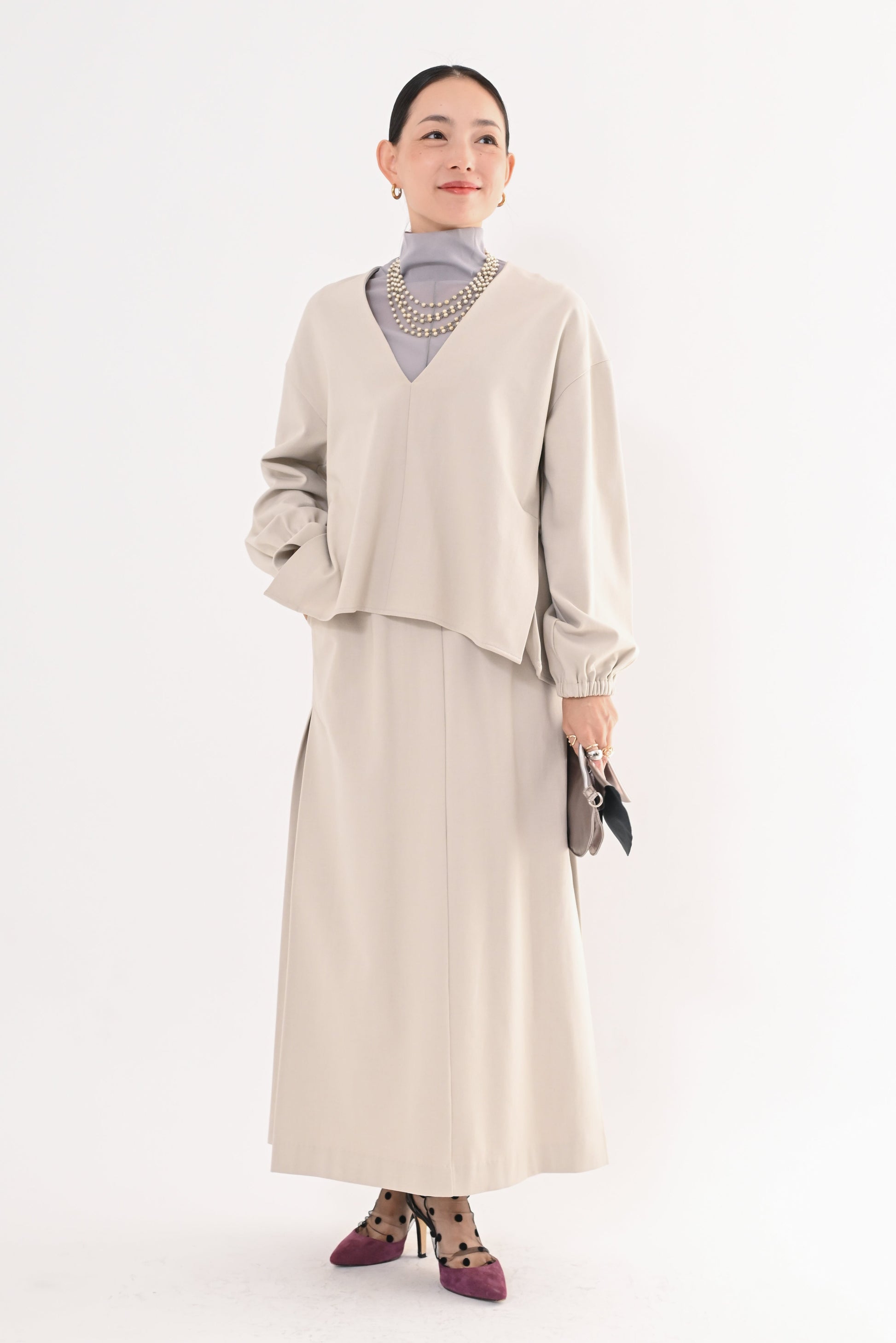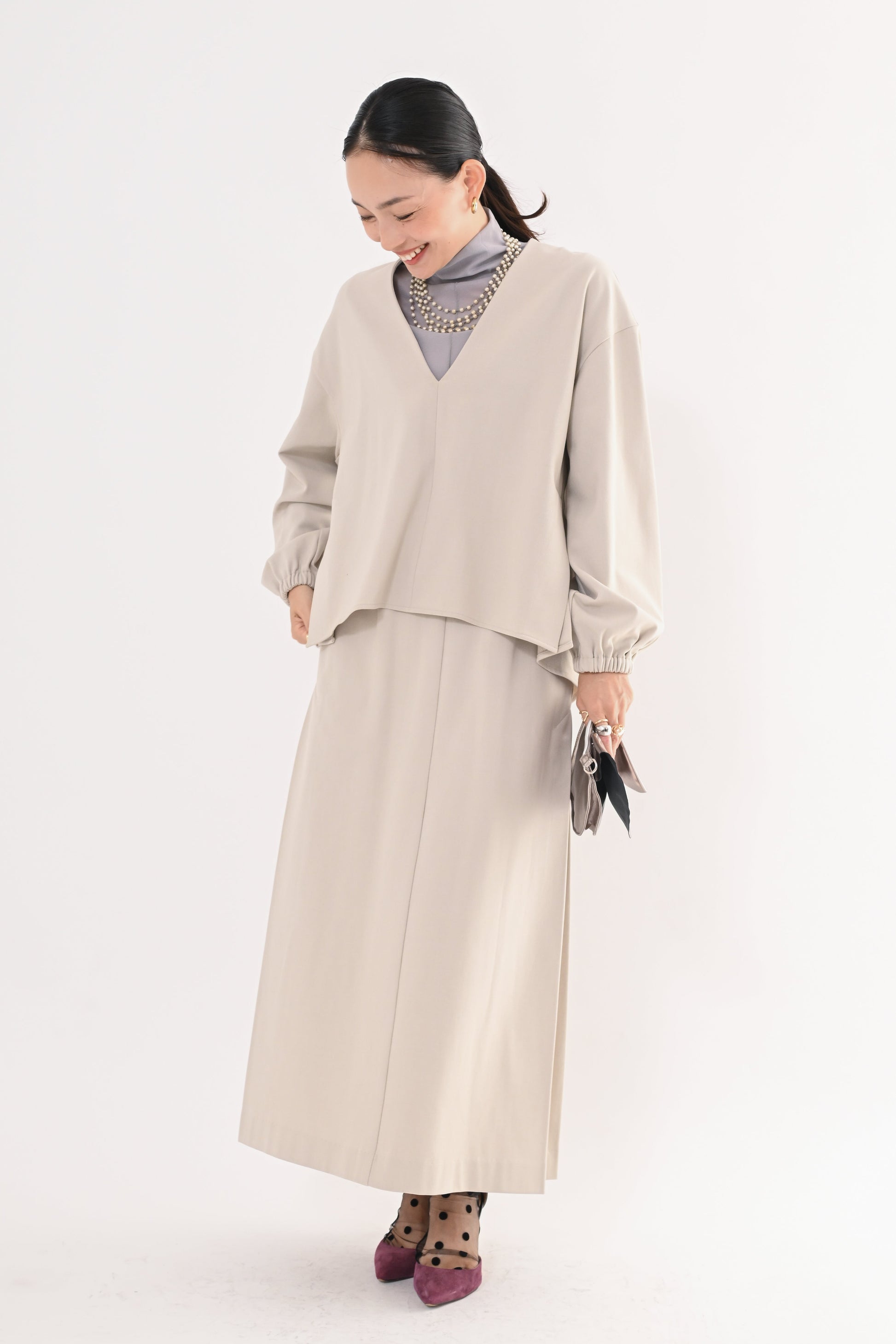 深めのVネックが顔まわりをすっきり見せ、ゆるやかなフォルムが洗練された抜け感を演出します。