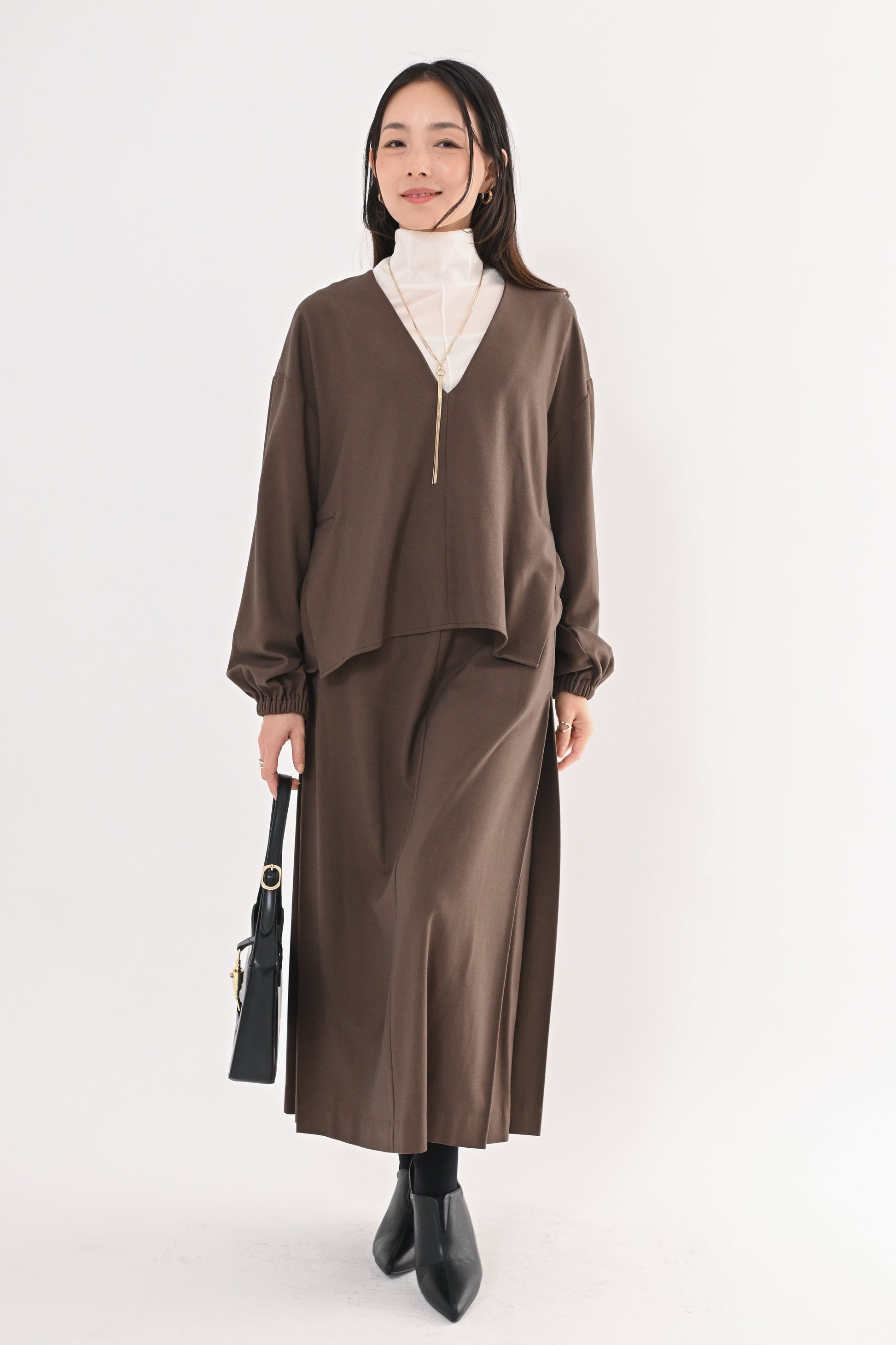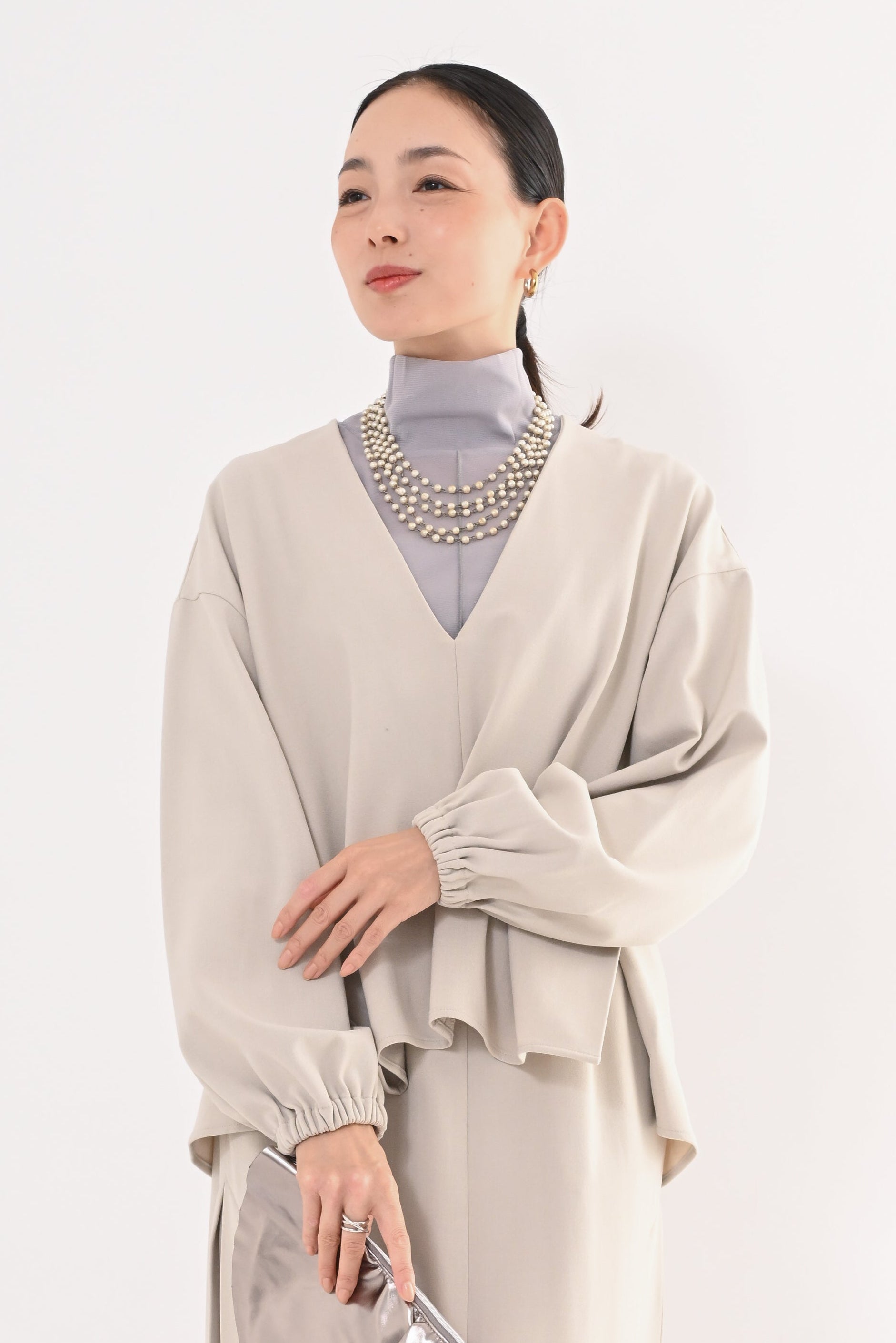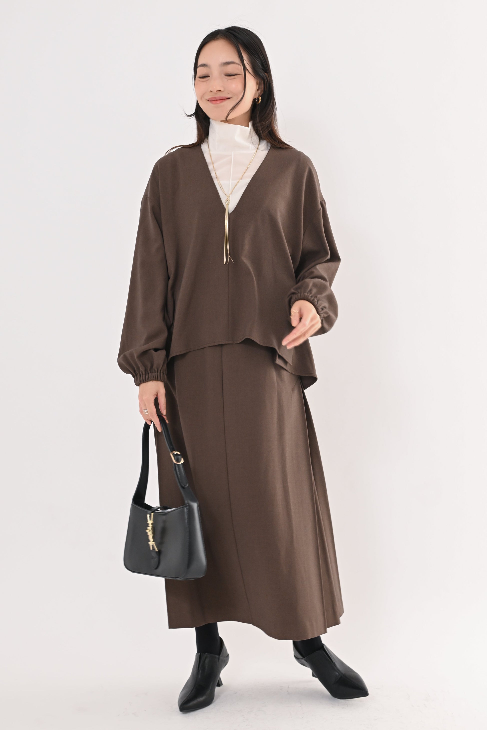 深めのVネックが顔まわりをすっきり見せ、ゆるやかなフォルムが洗練された抜け感を演出します。