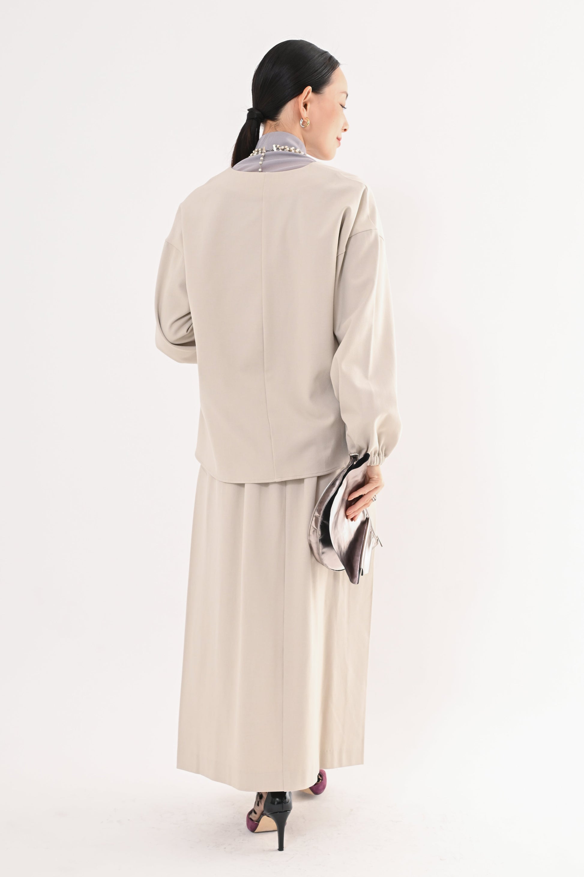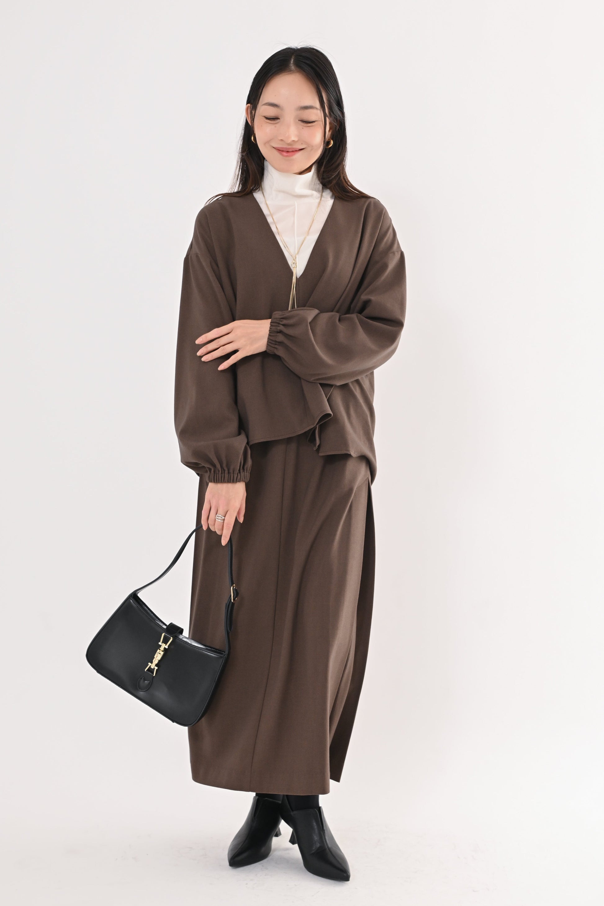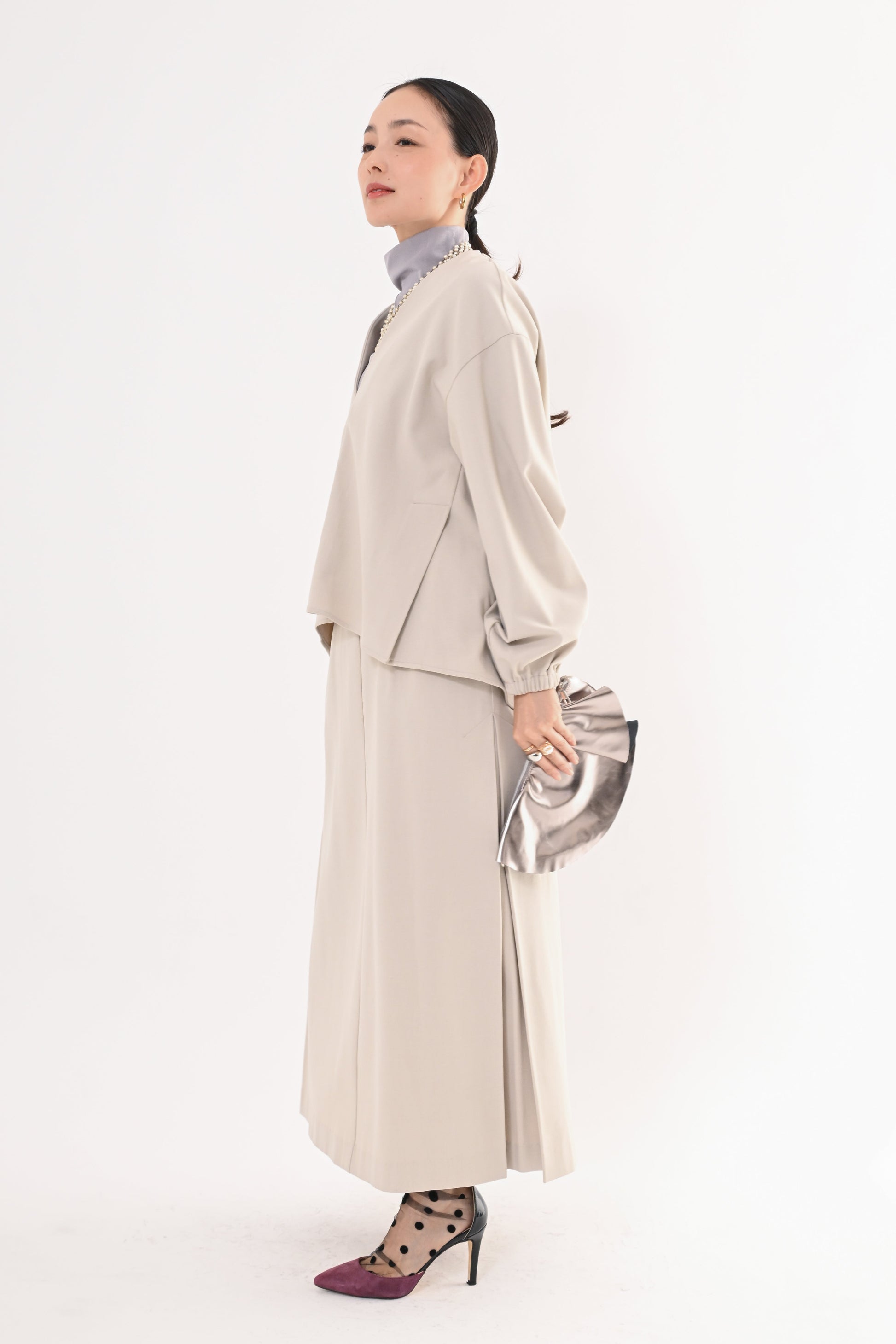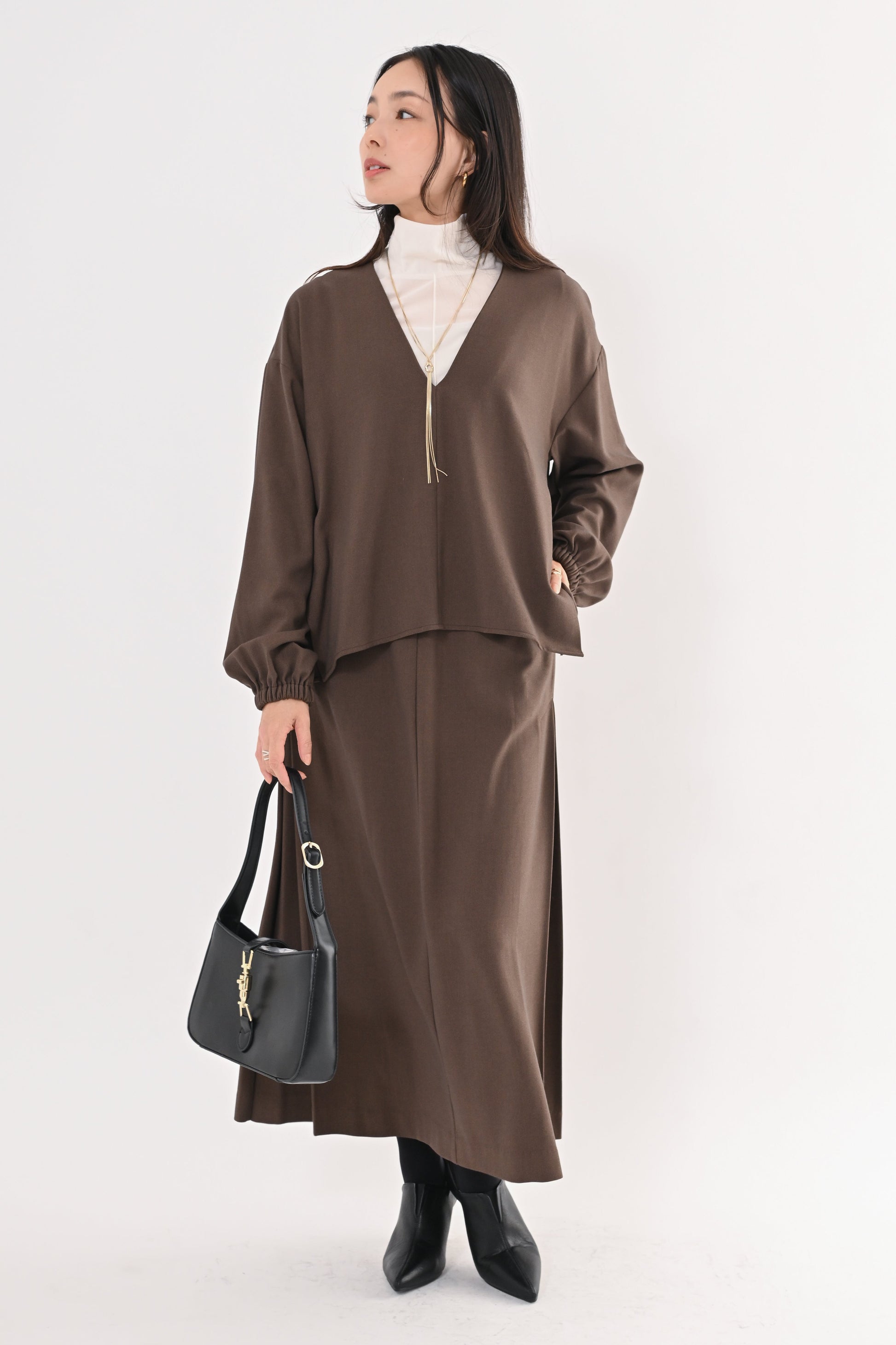 深めのVネックが顔まわりをすっきり見せ、ゆるやかなフォルムが洗練された抜け感を演出します。
