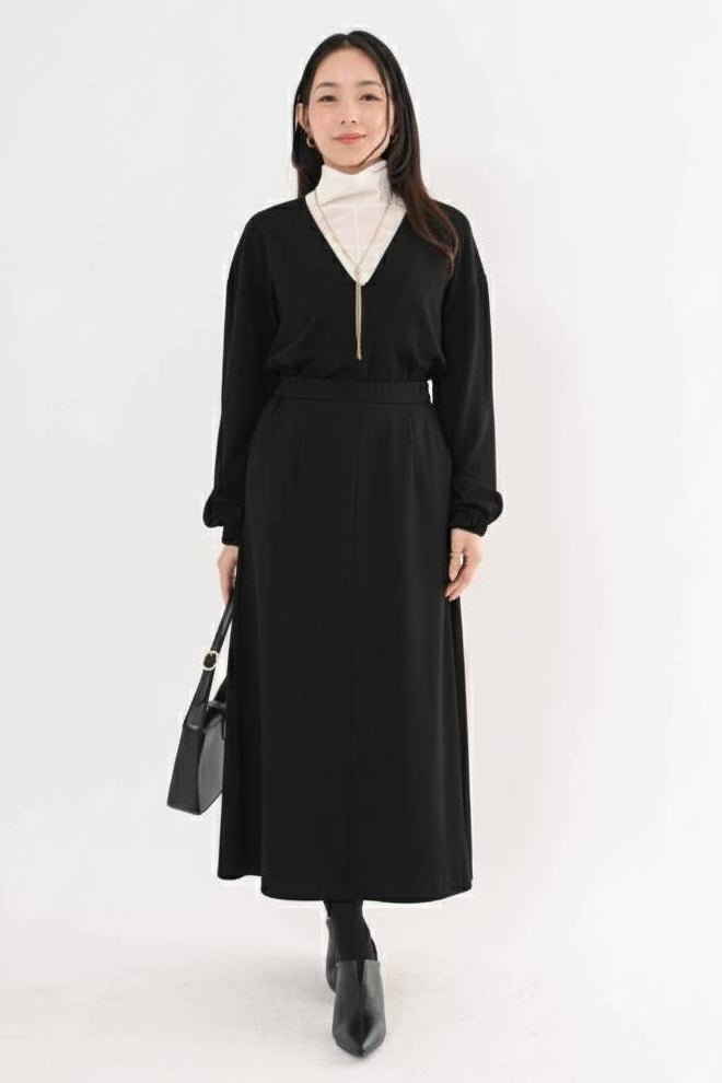 同素材のブラウスとのセットアップスタイルもおすすめです。
