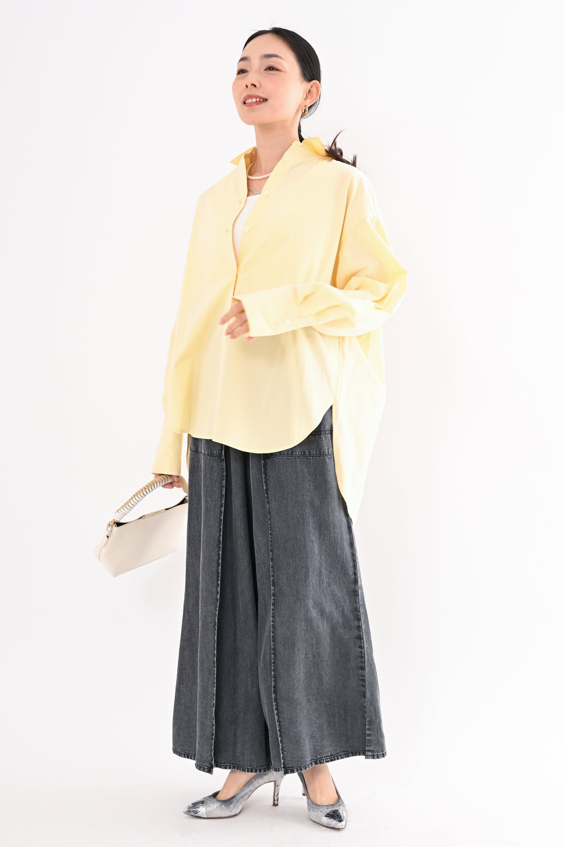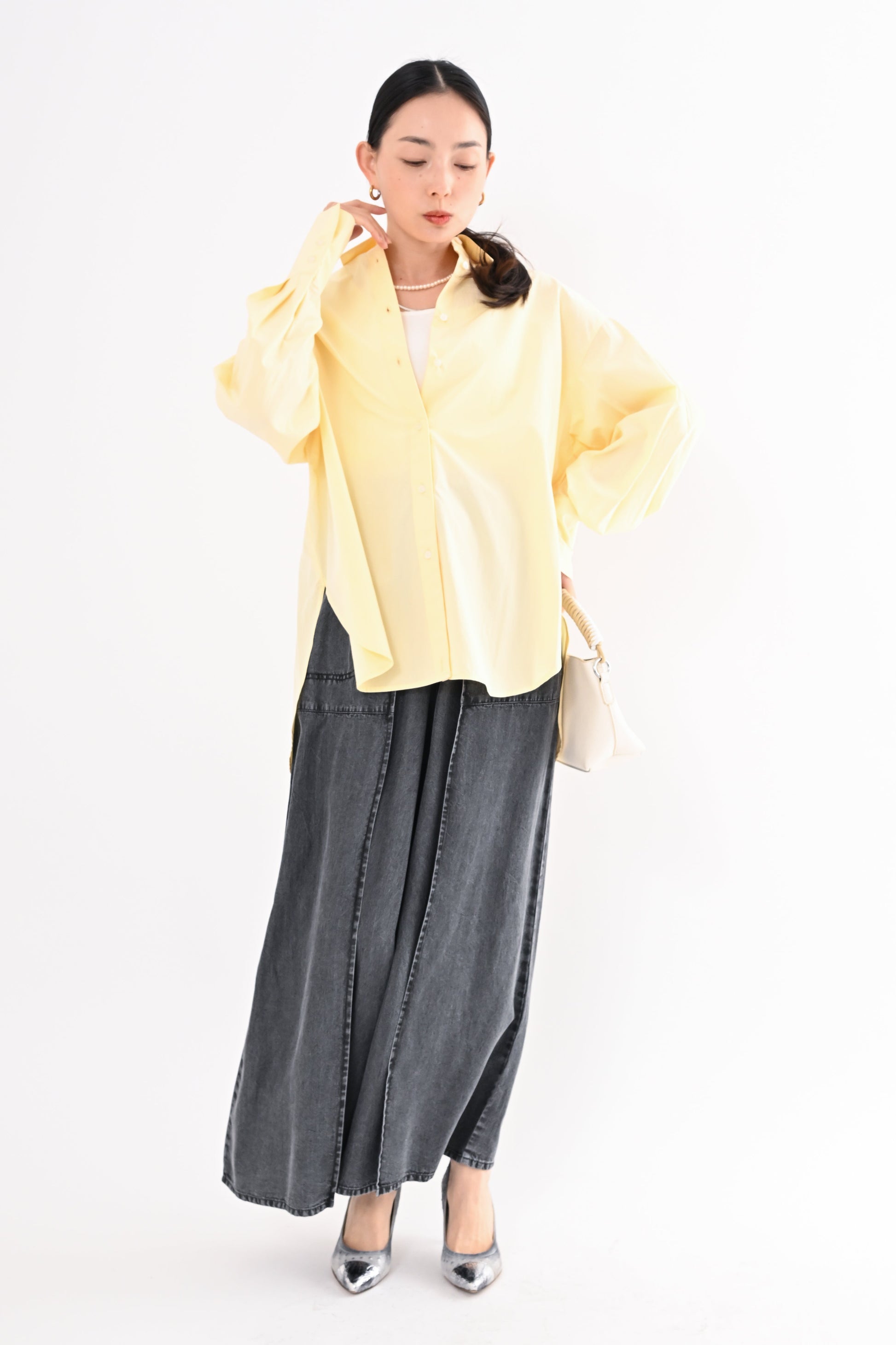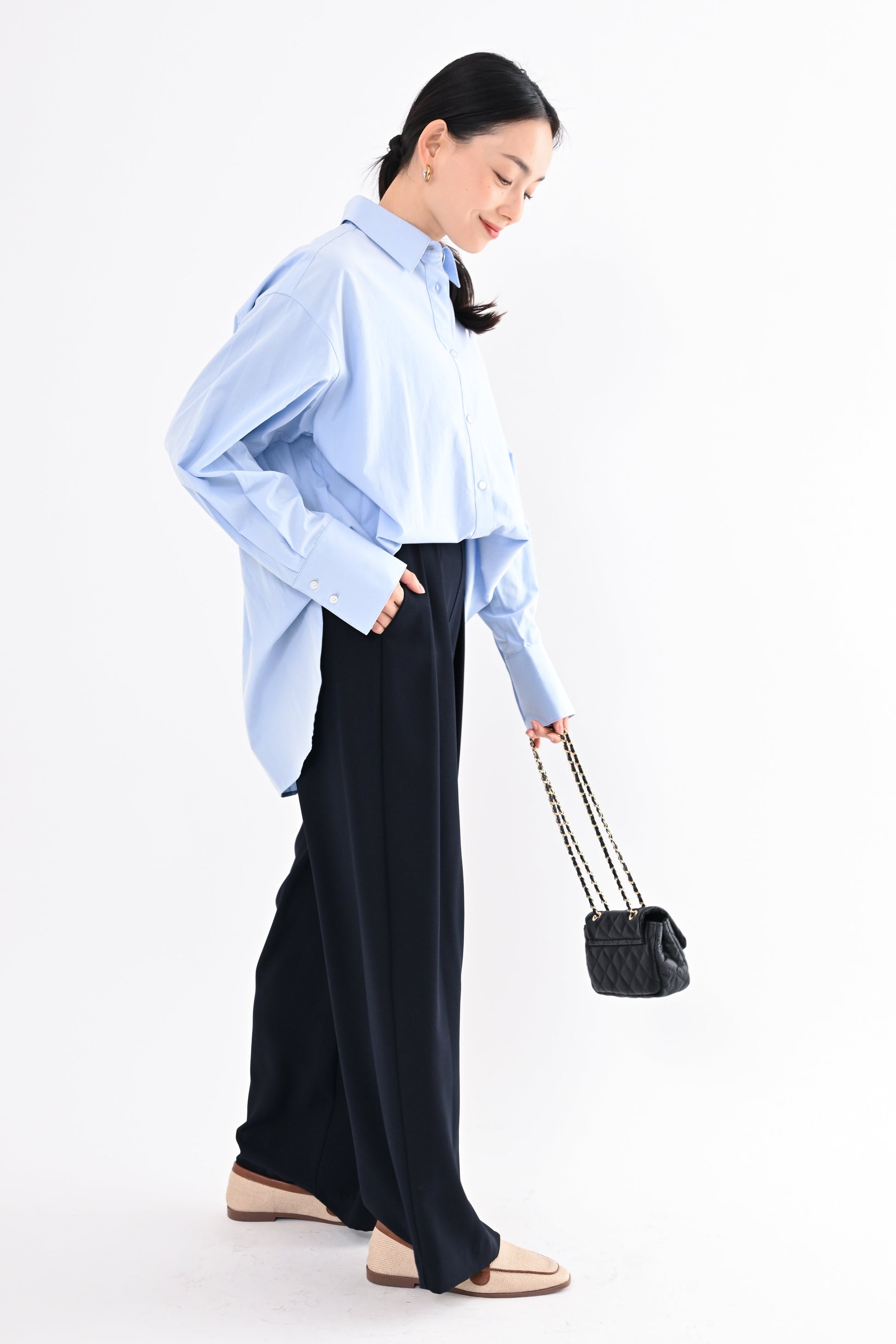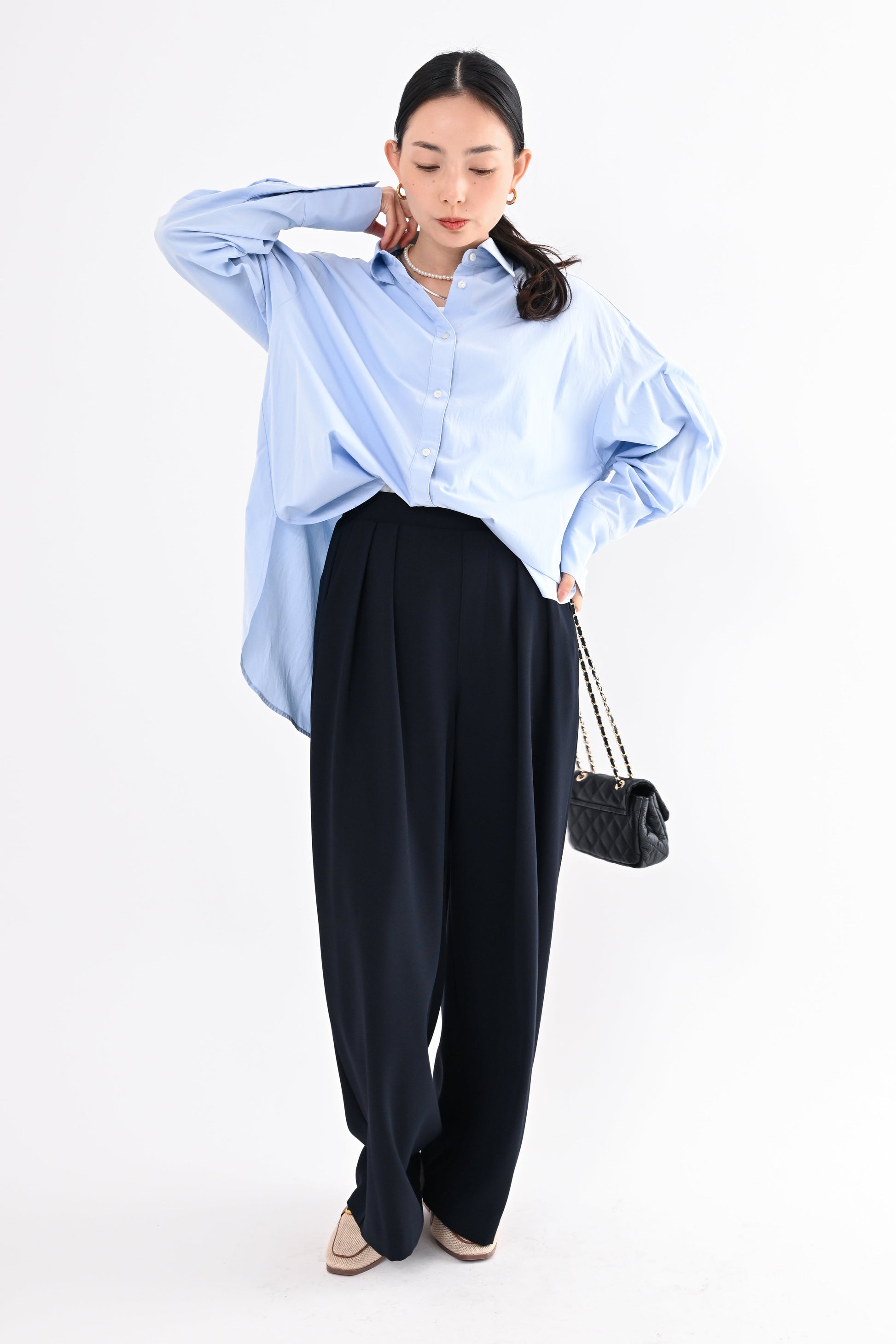 程よく落ち感のある素材が、身体のラインを拾いすぎず、