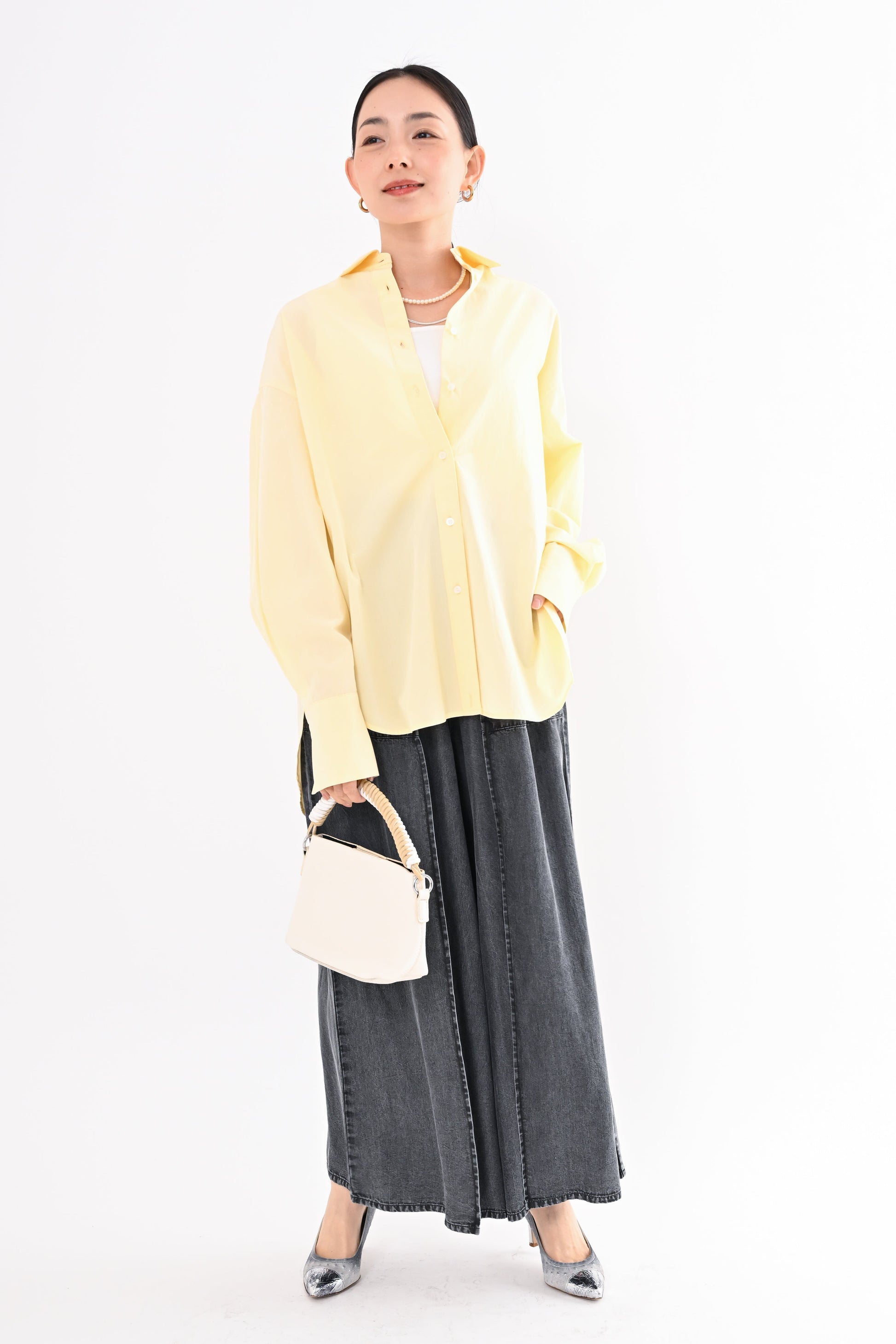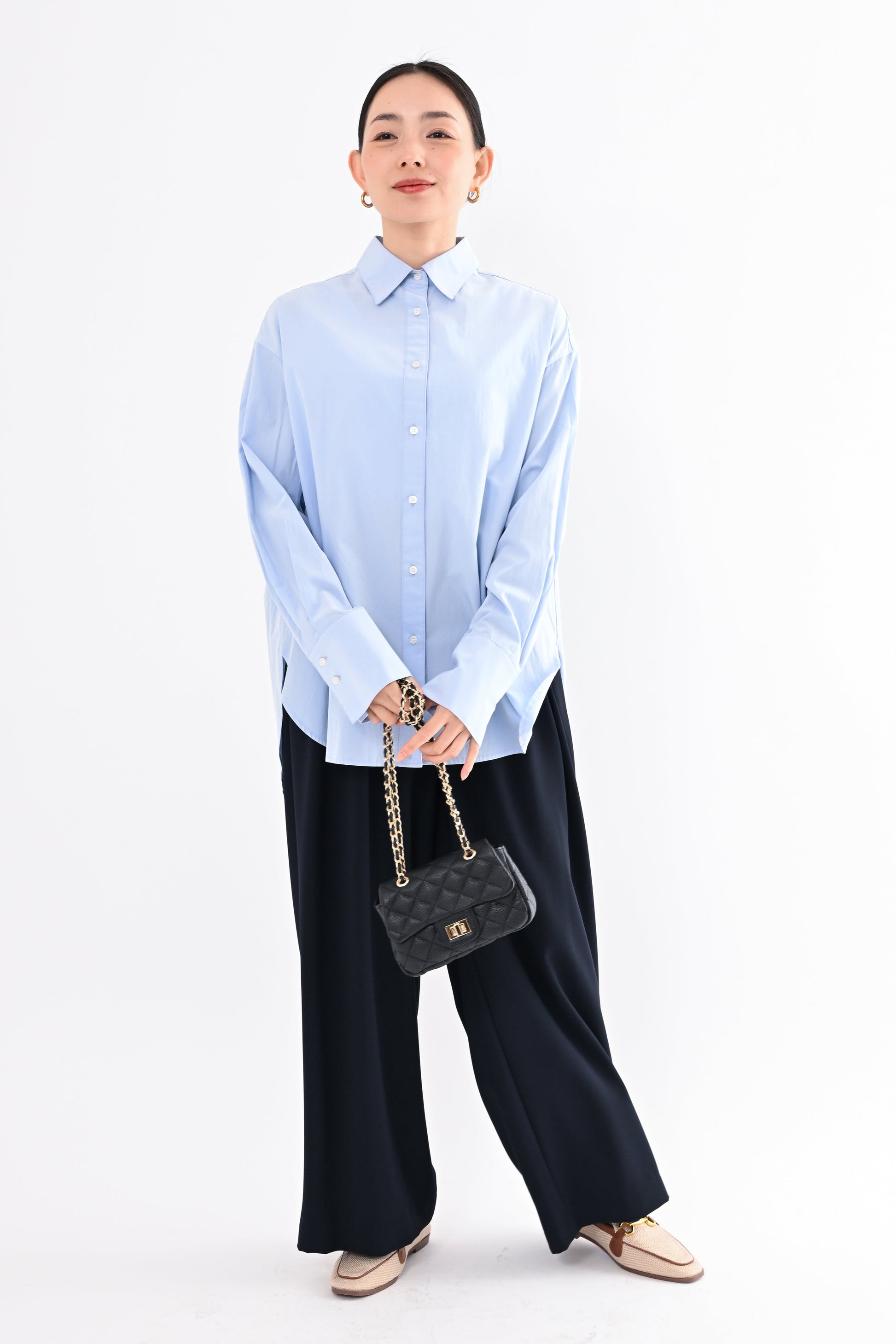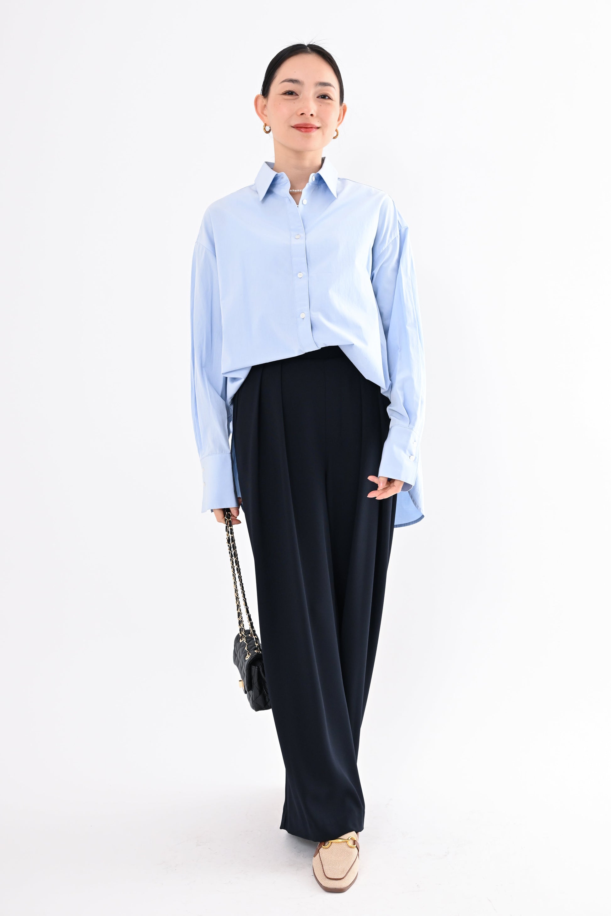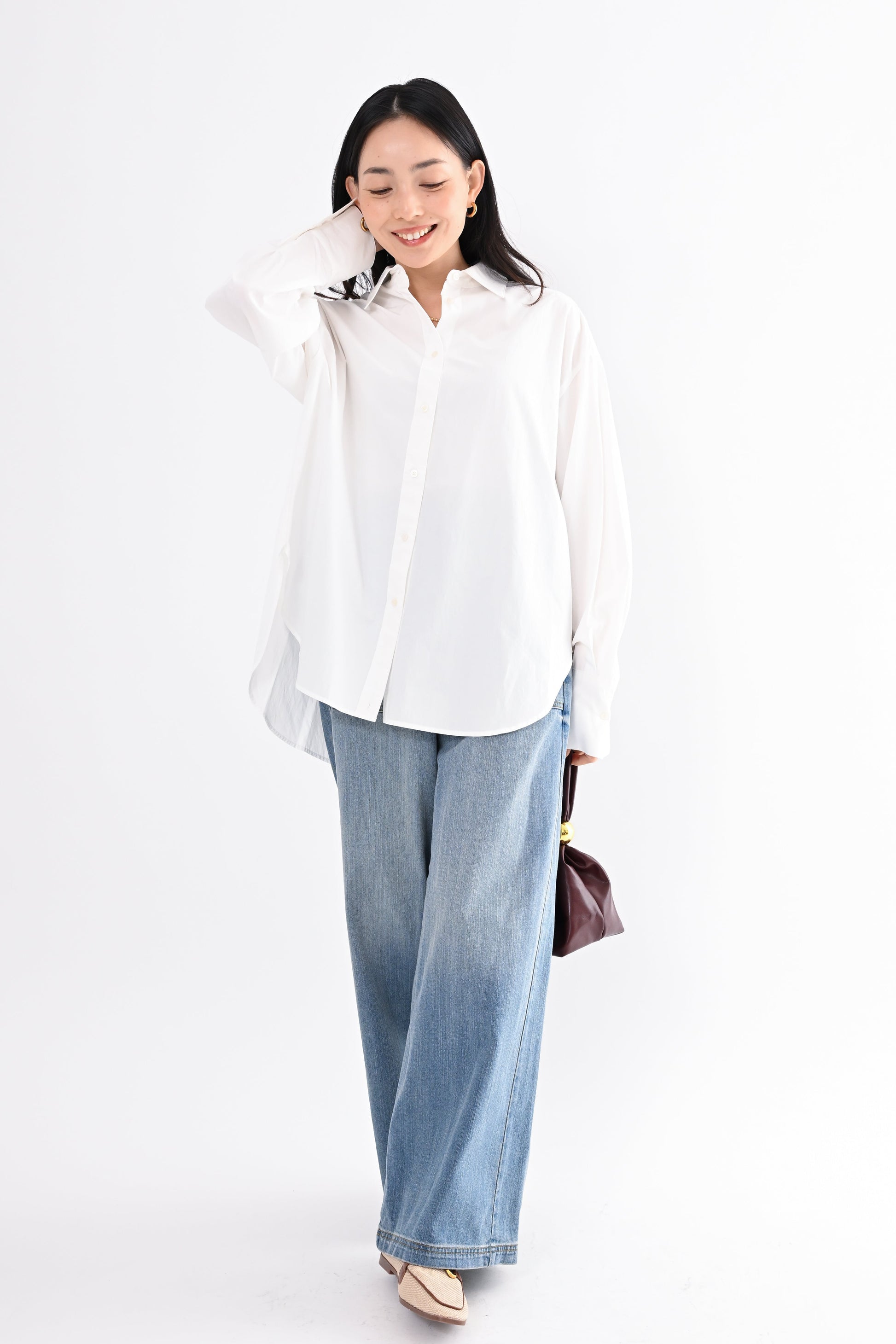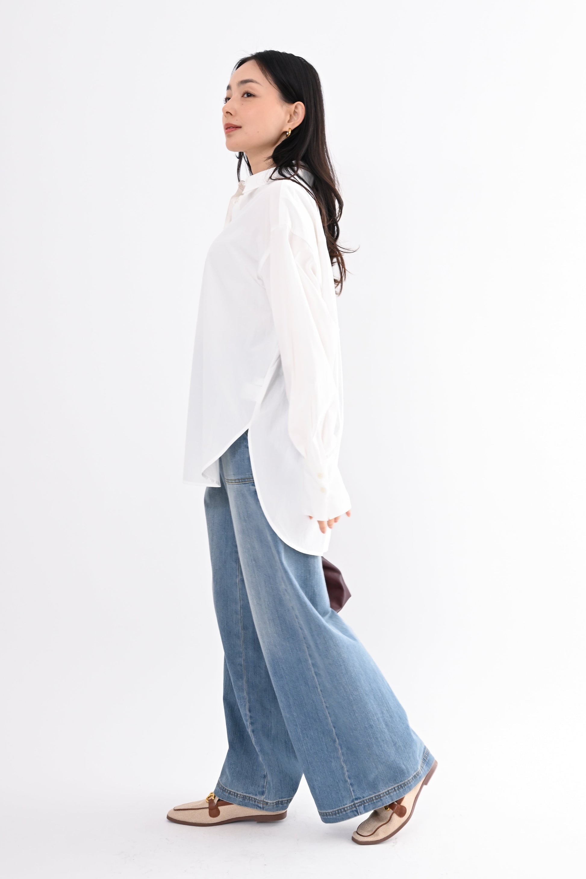 程よく落ち感のある素材が、身体のラインを拾いすぎず、