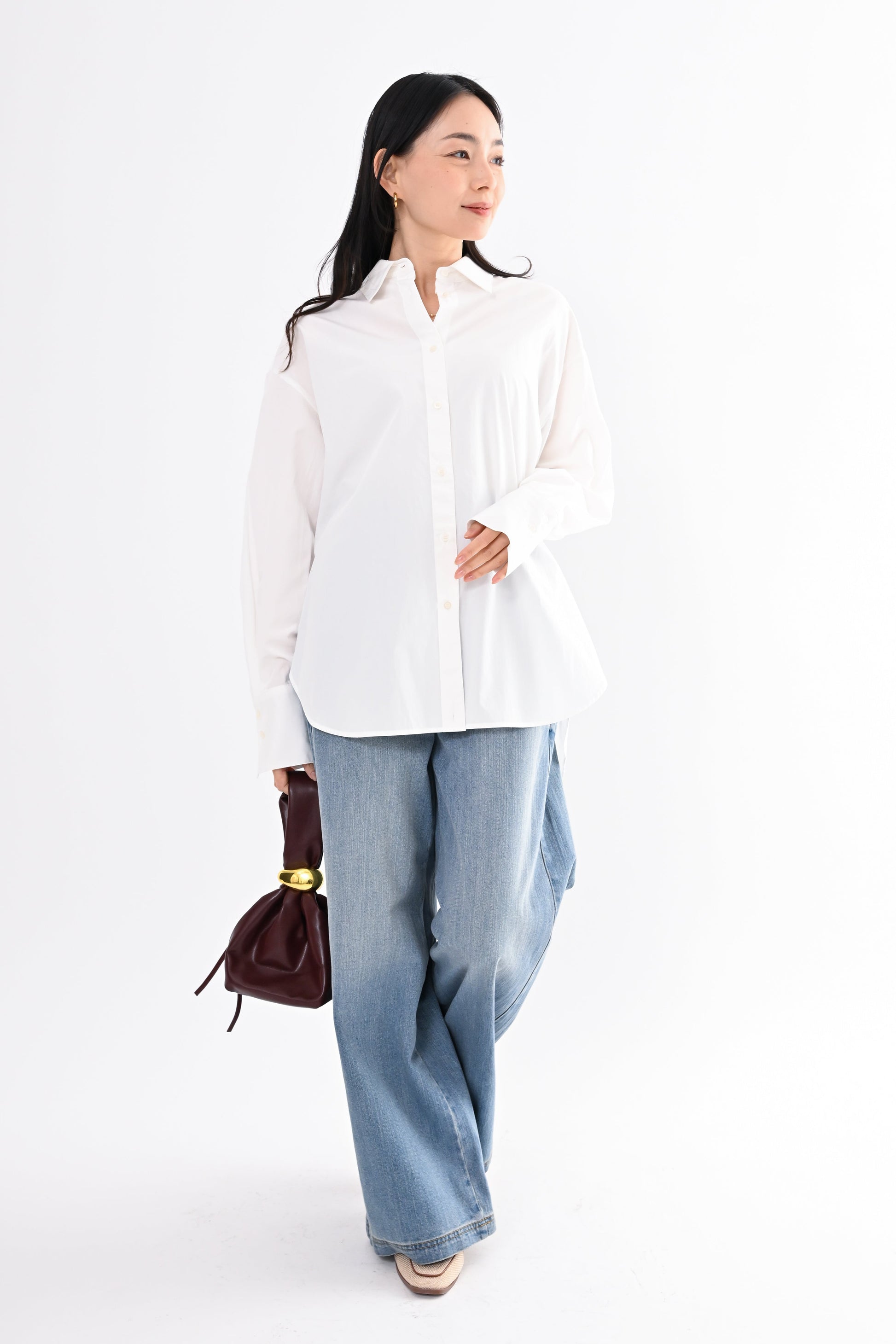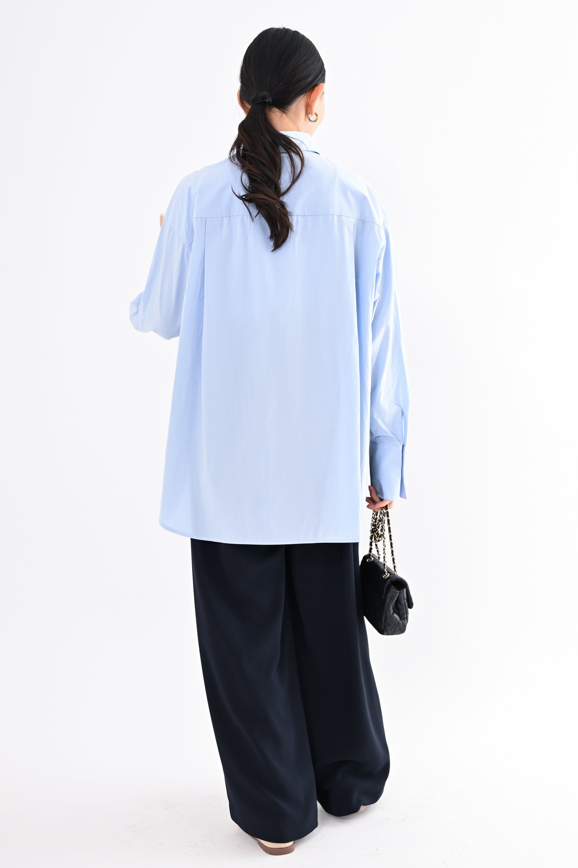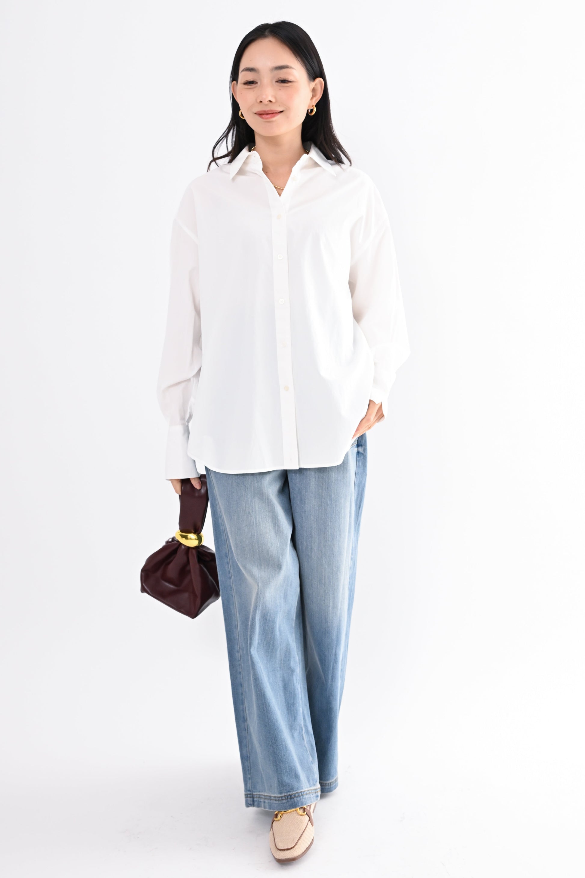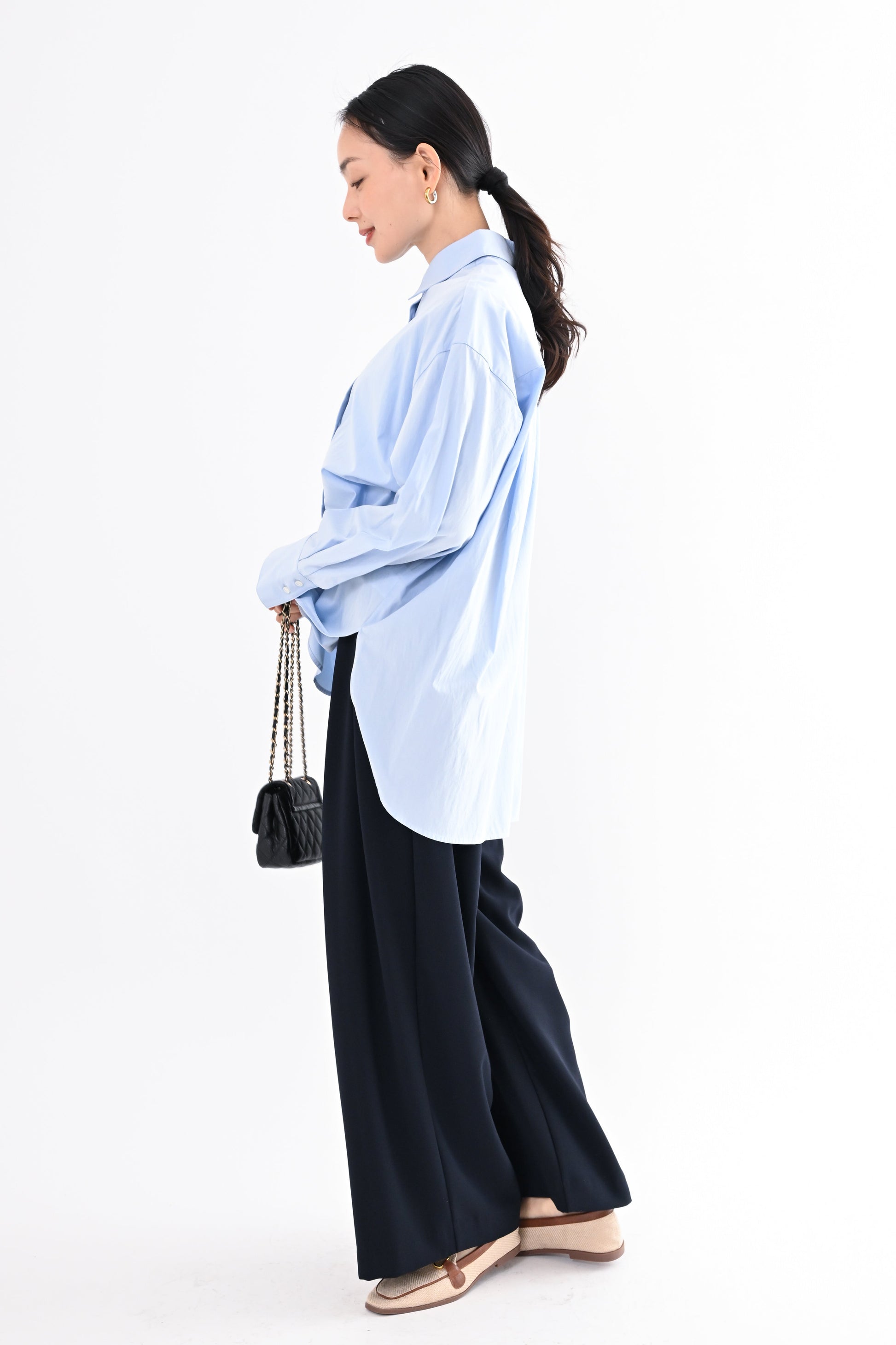 程よく落ち感のある素材が、身体のラインを拾いすぎず、