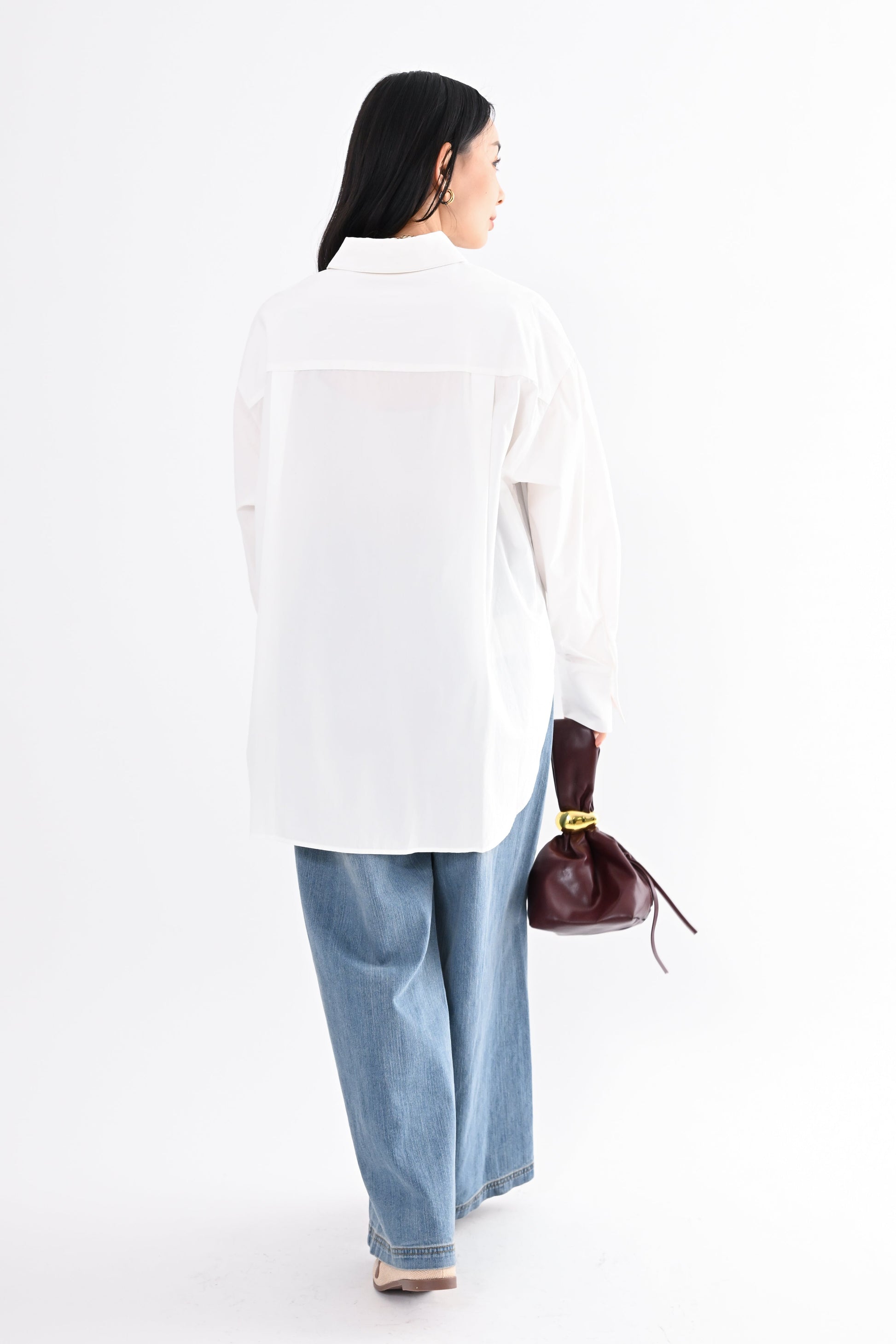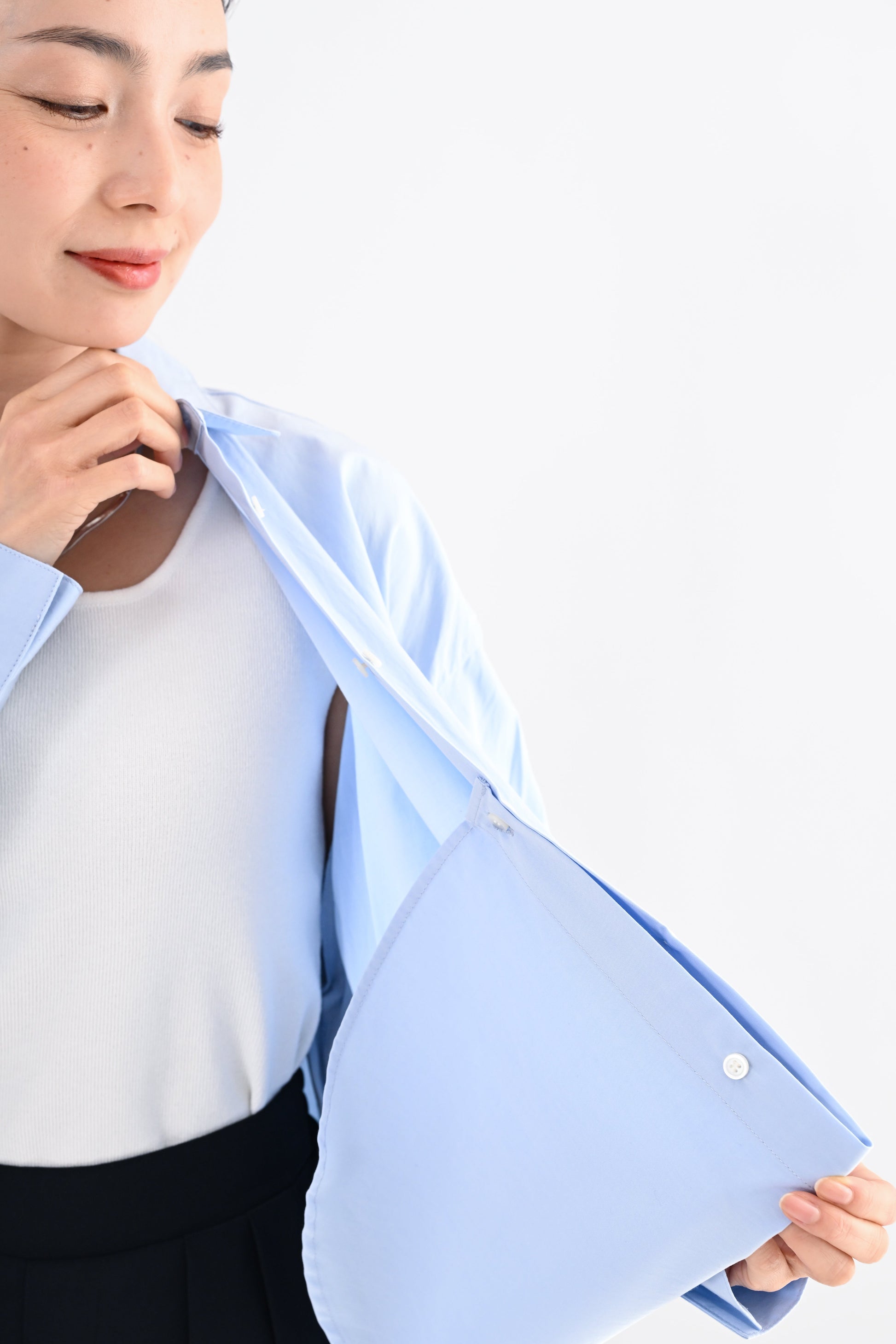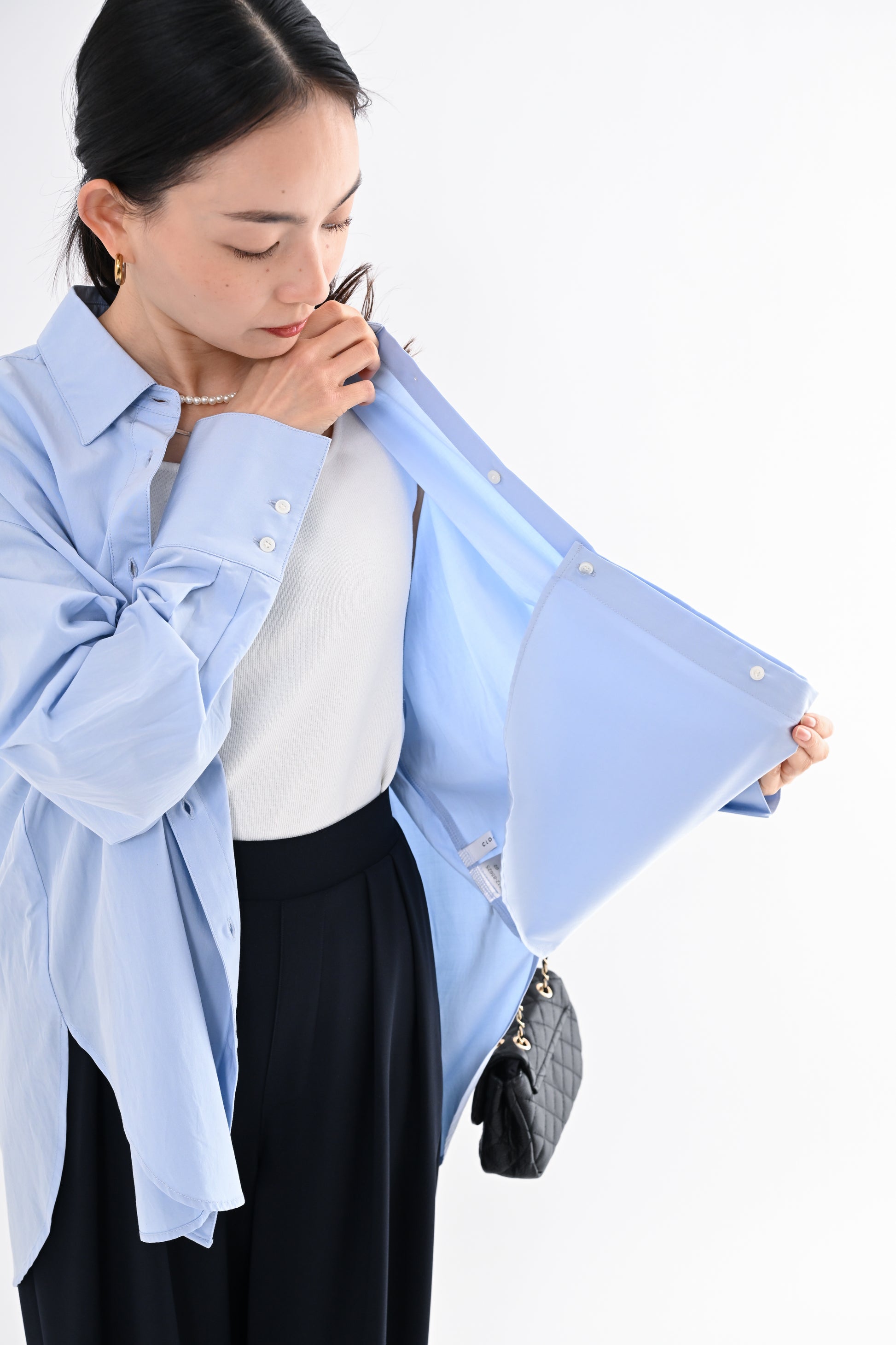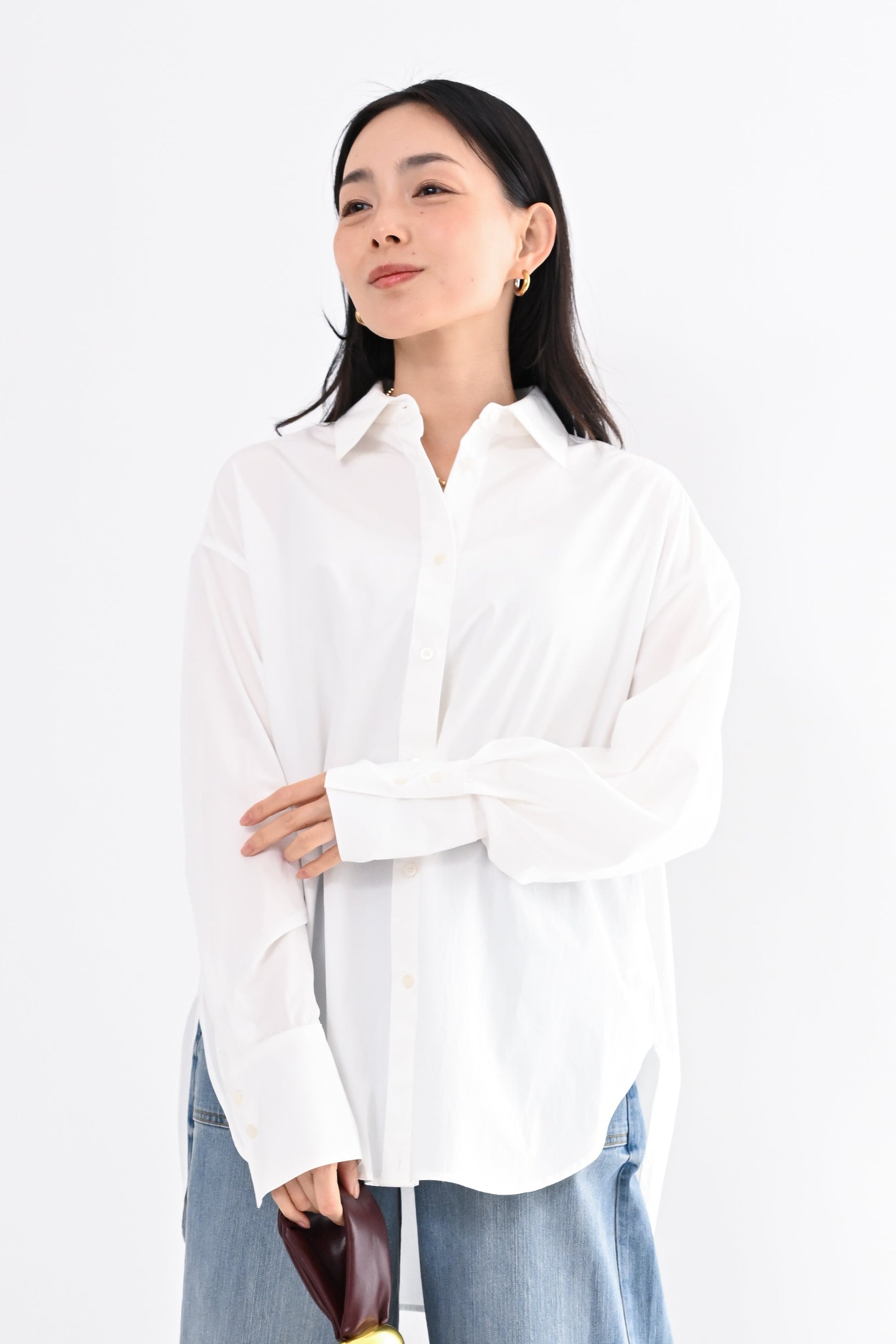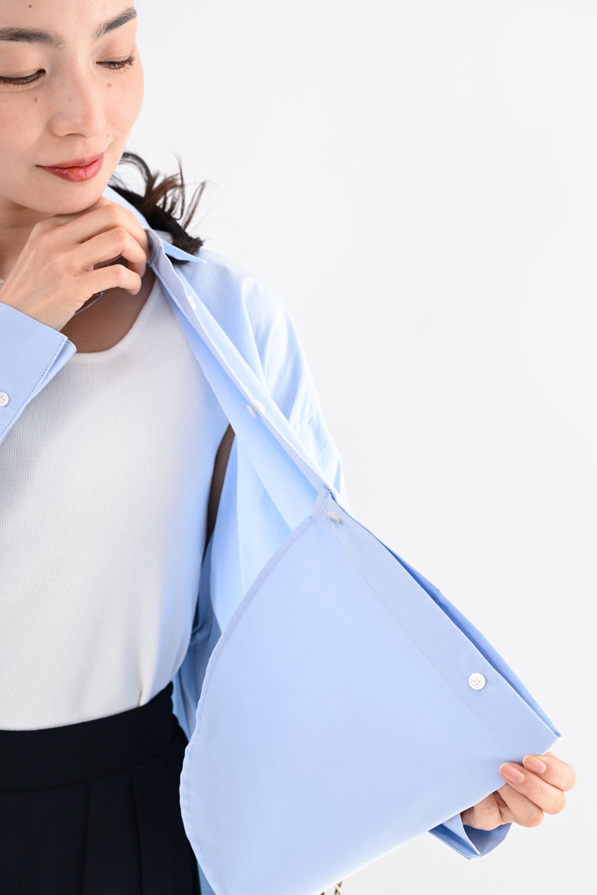 ・裾裏の釦を留めることでタックイン風のアレンジが可能(・ヒップまで自然にカバーする前後差のある丈感