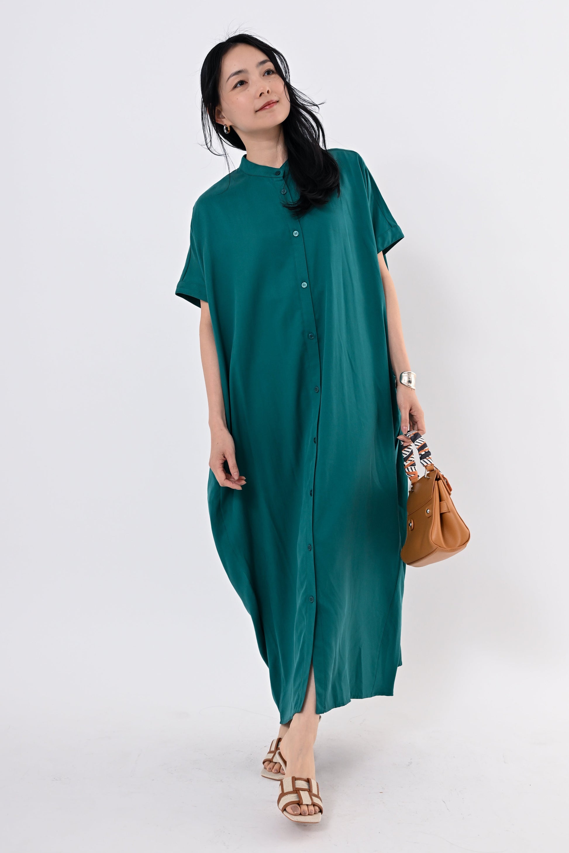 バンドカラーと前開きデザインが全体をすっきりと引き締め、一枚で着ても間延びしない印象に仕上げています。