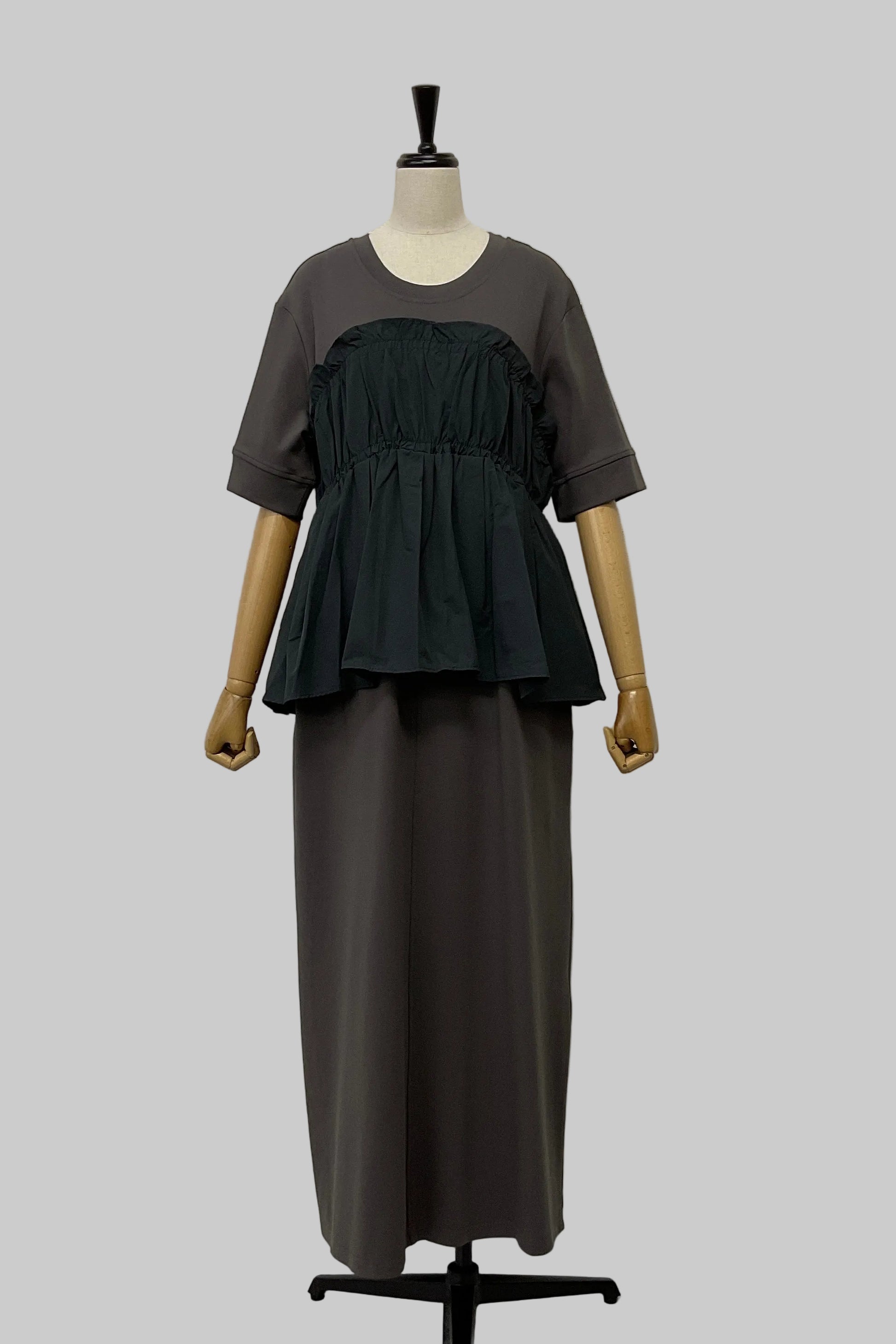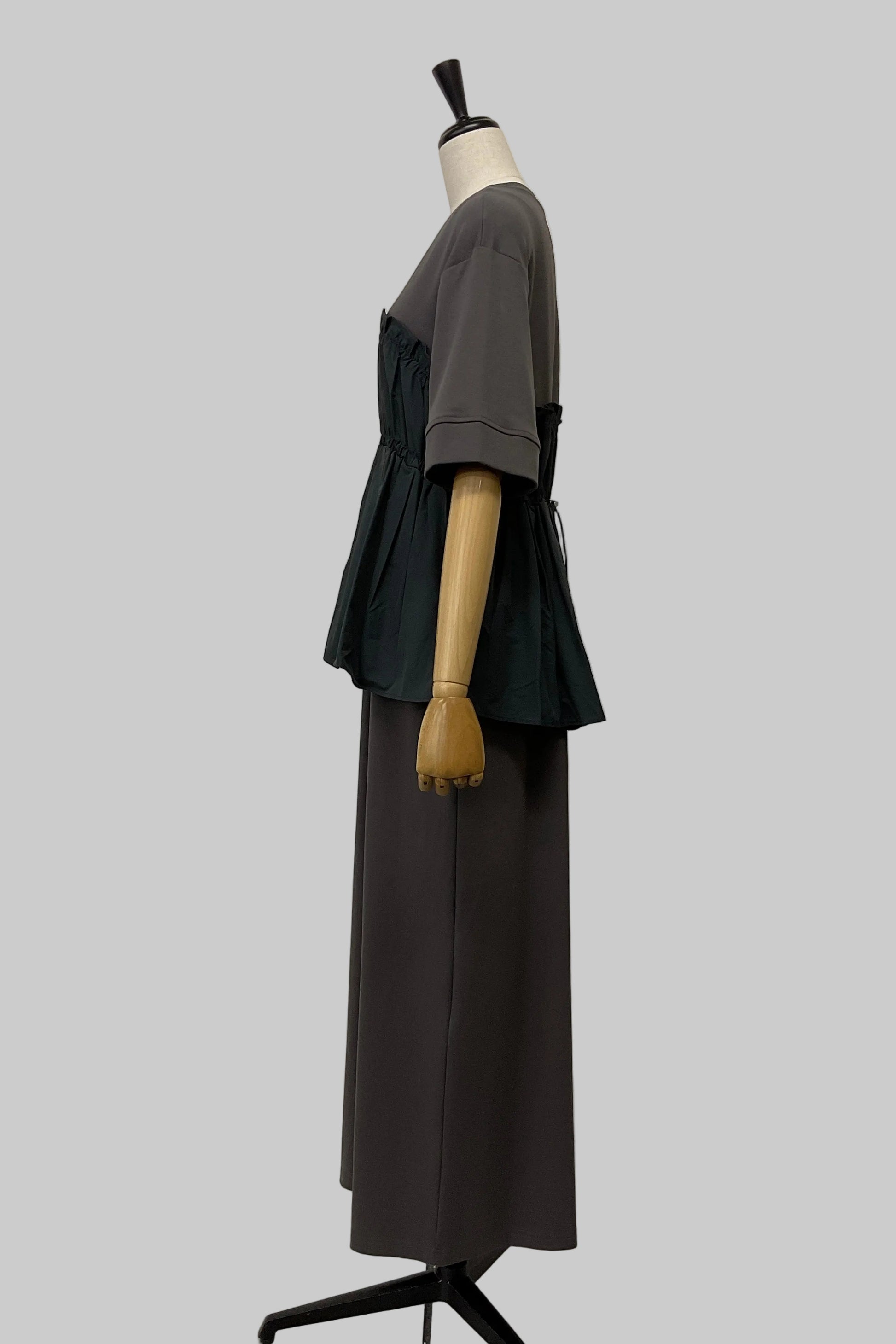 カットソー素材のワンピースに、ハリ感のあるビスチェを重ねたようなデザインで、シンプルながらも着映えする一着です。