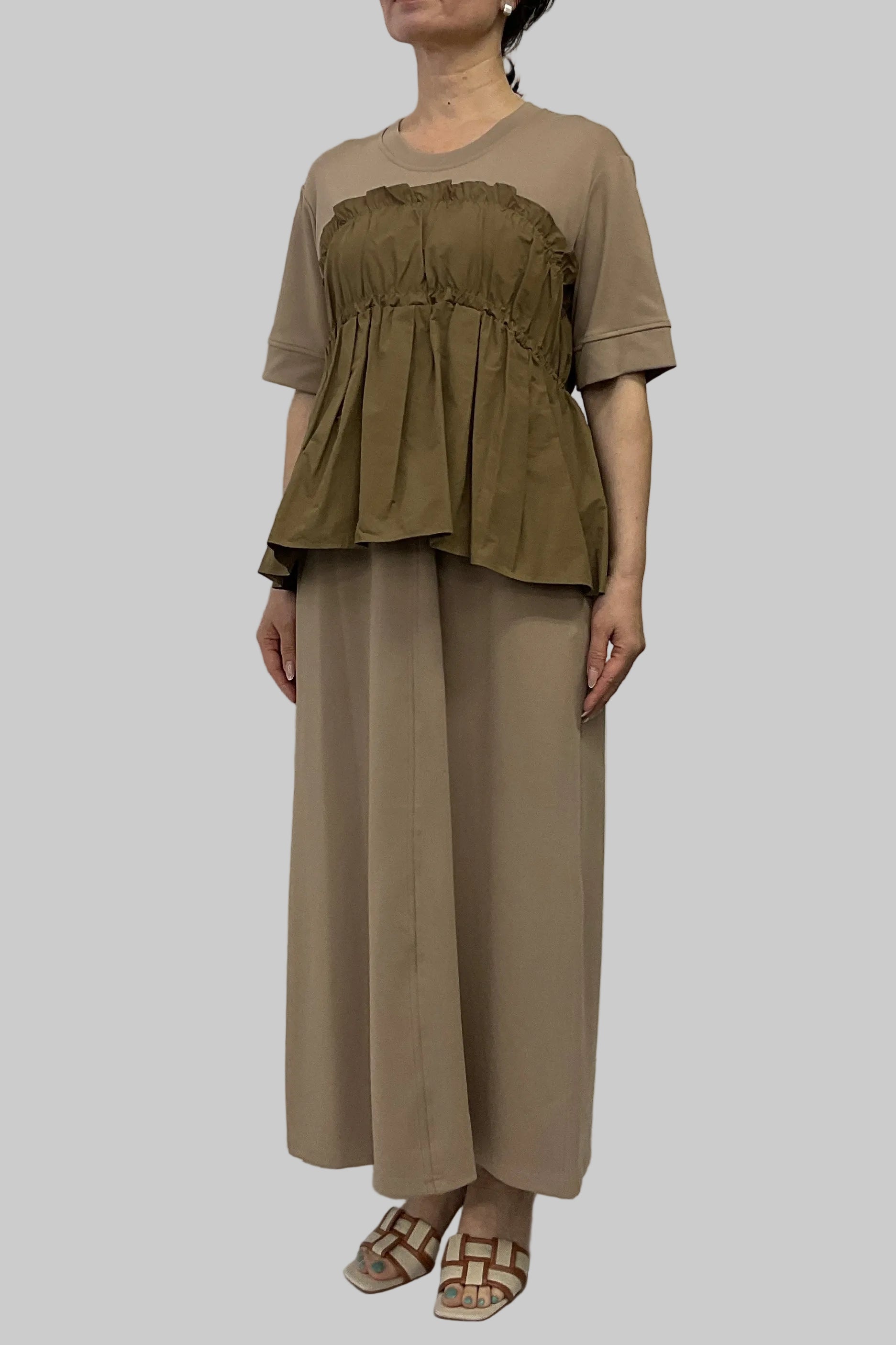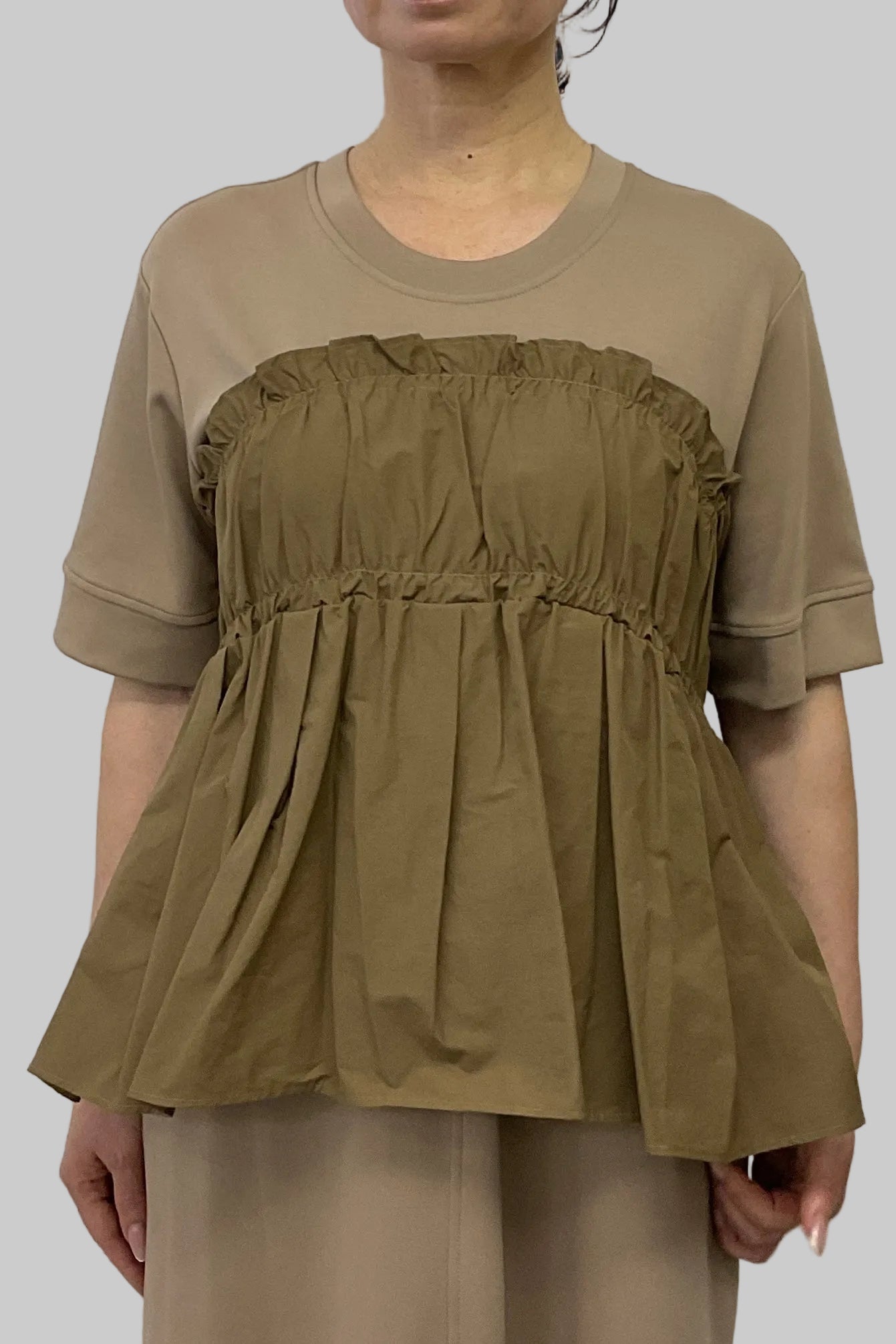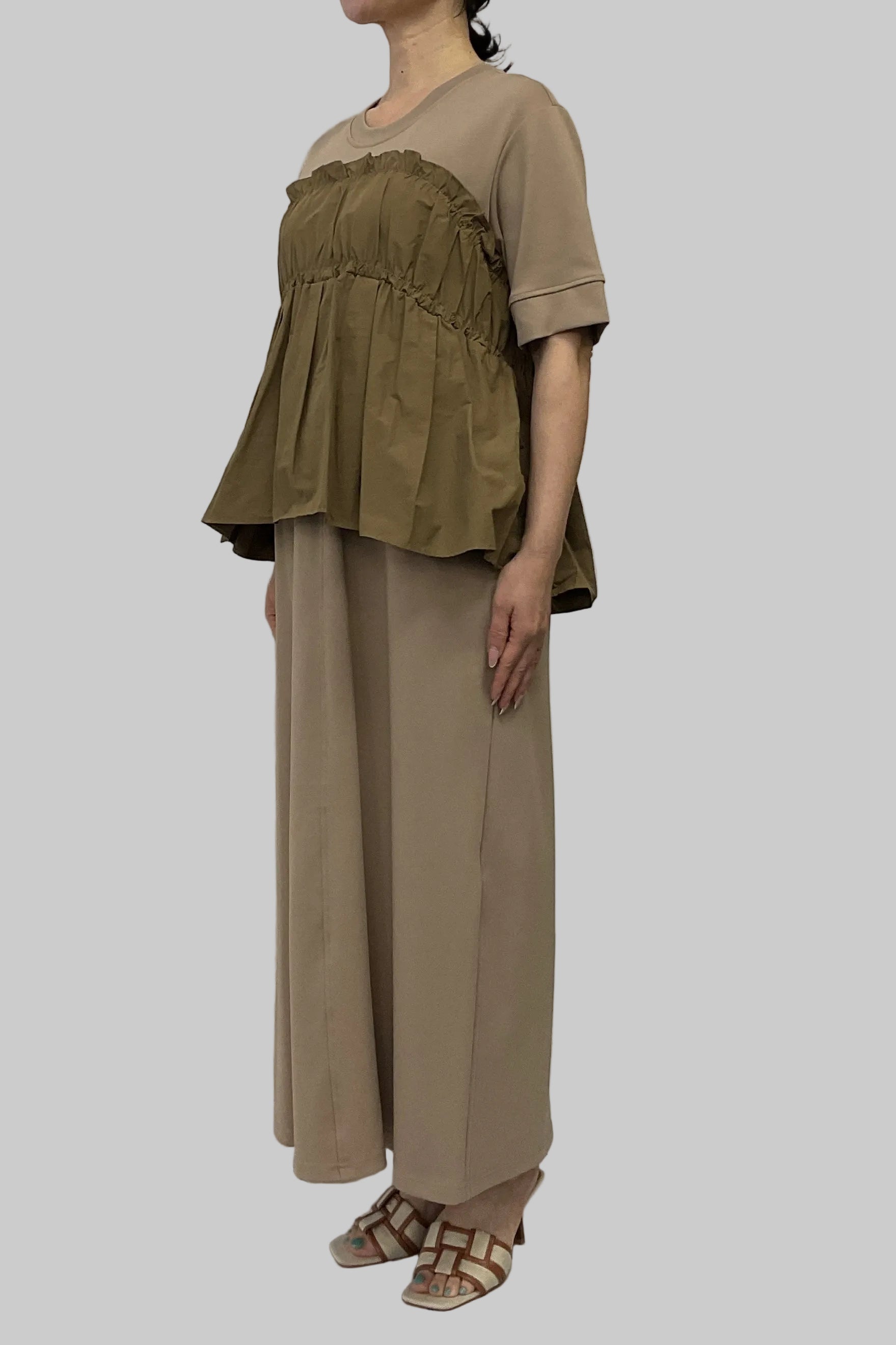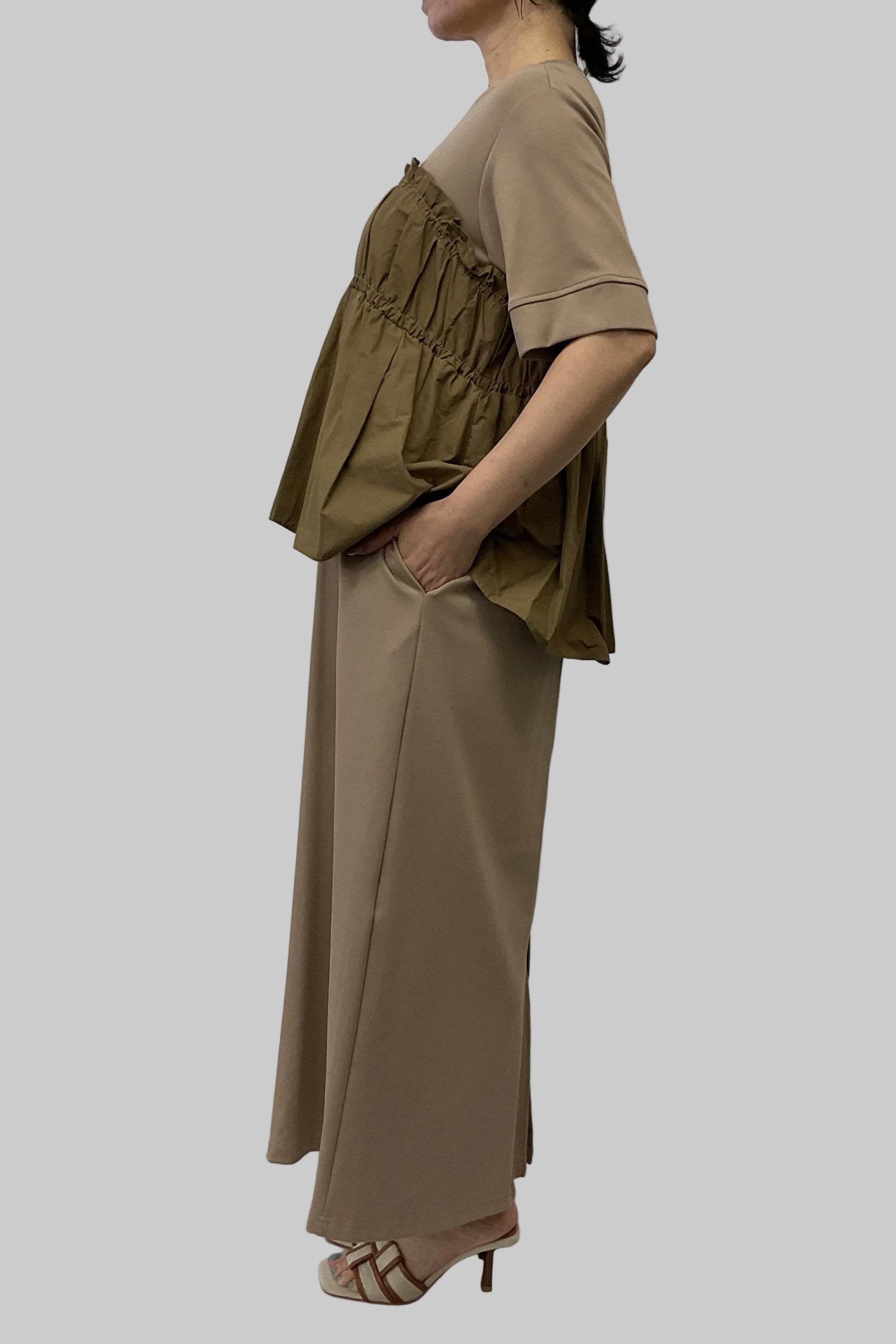 ・カットソー×ナイロン素材のドッキングデザイン