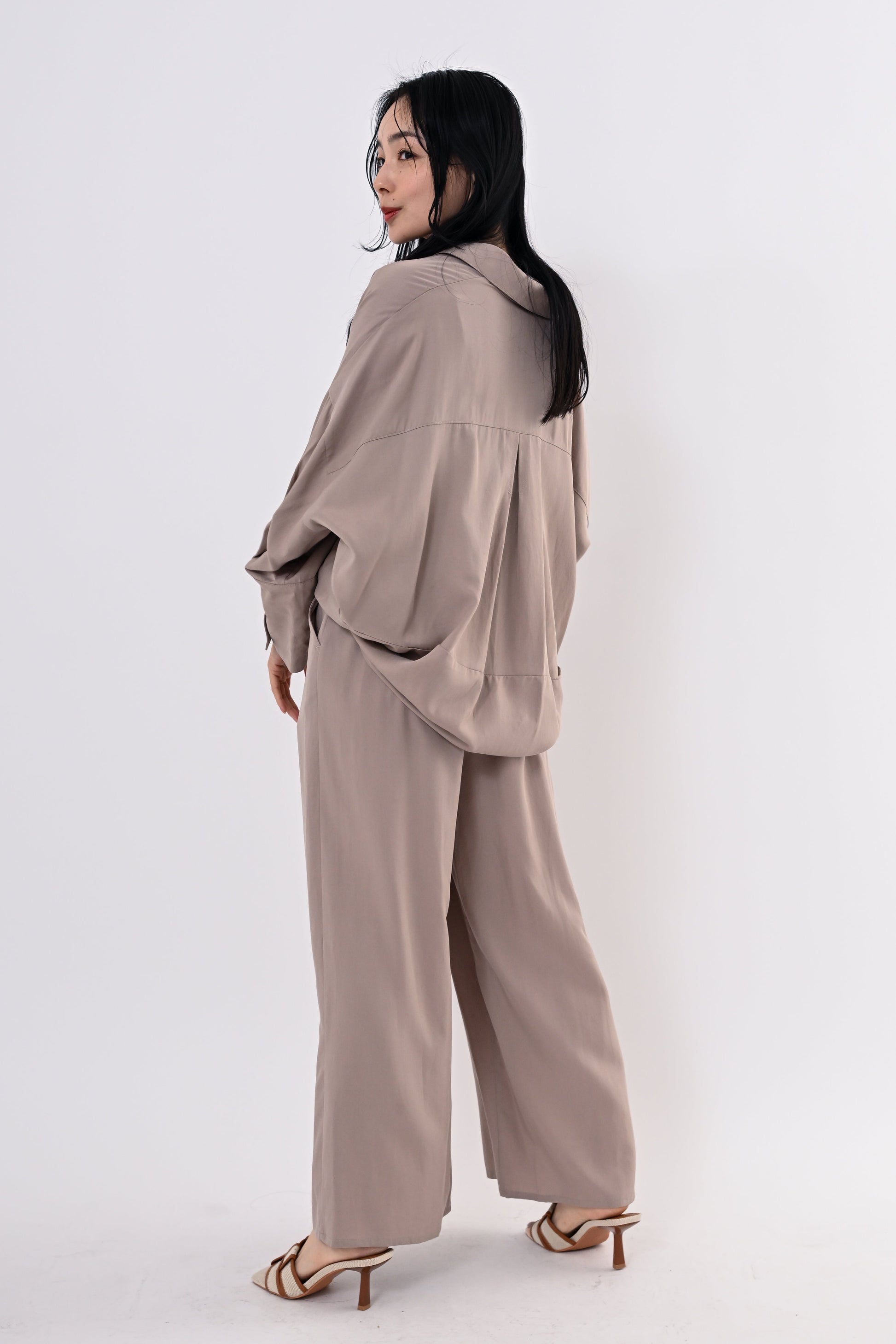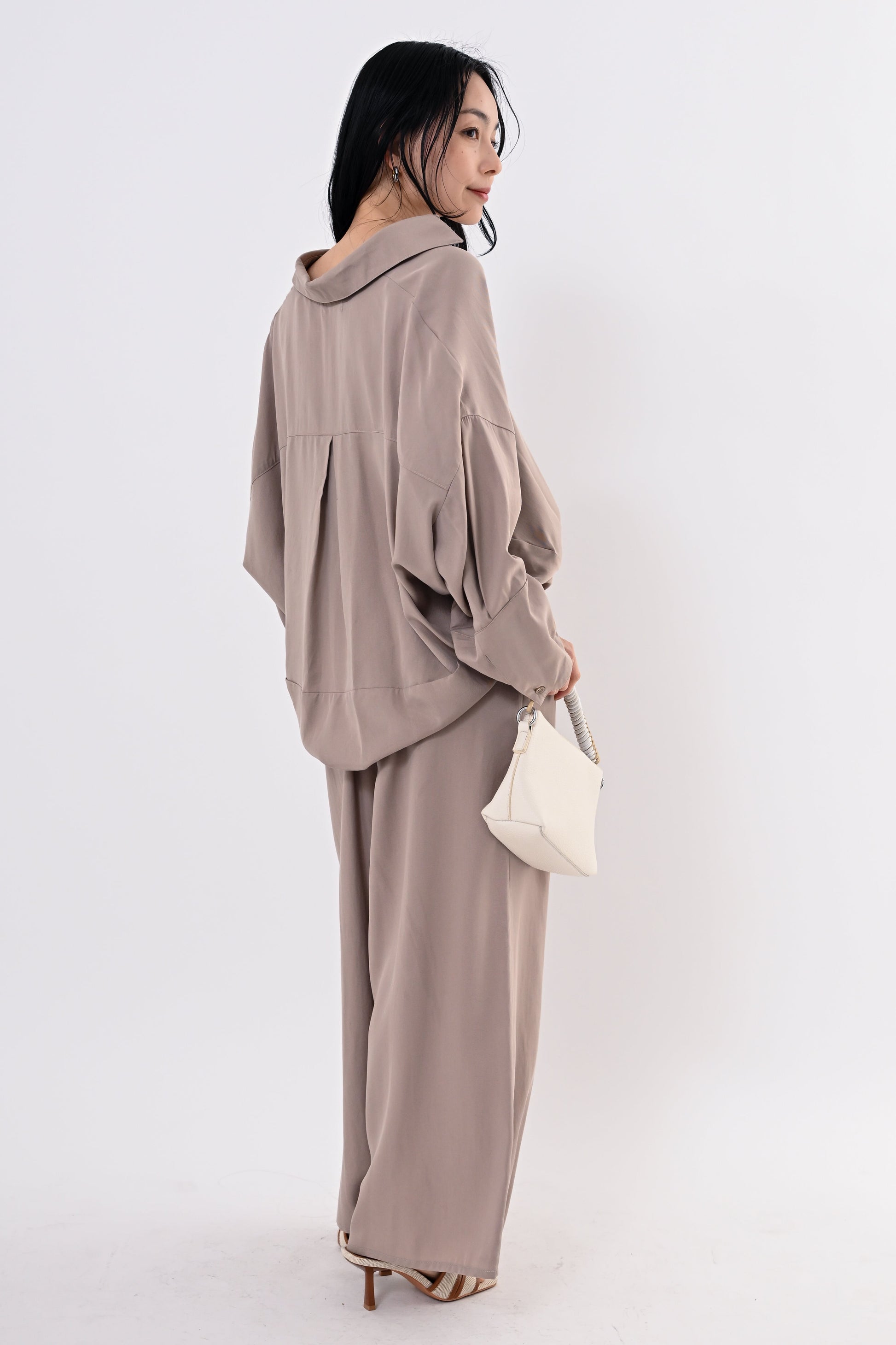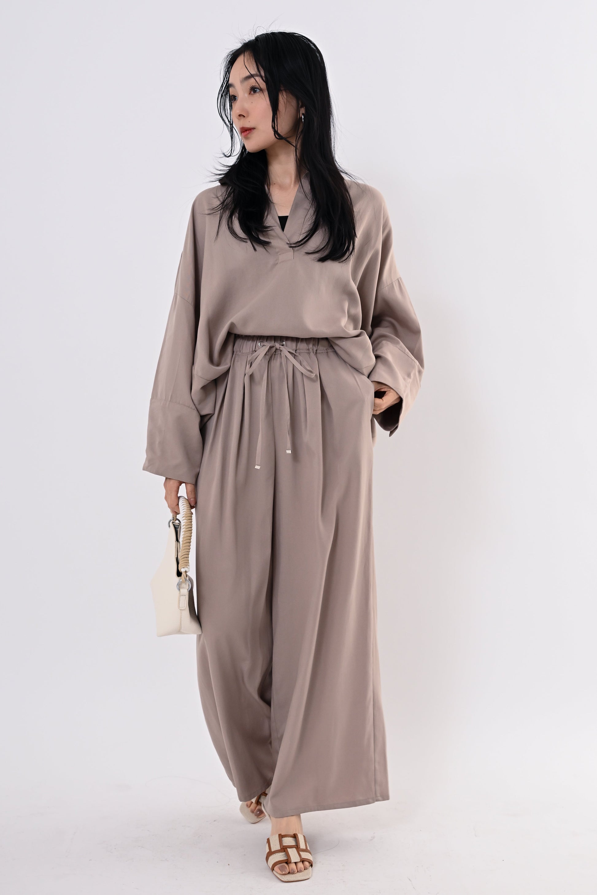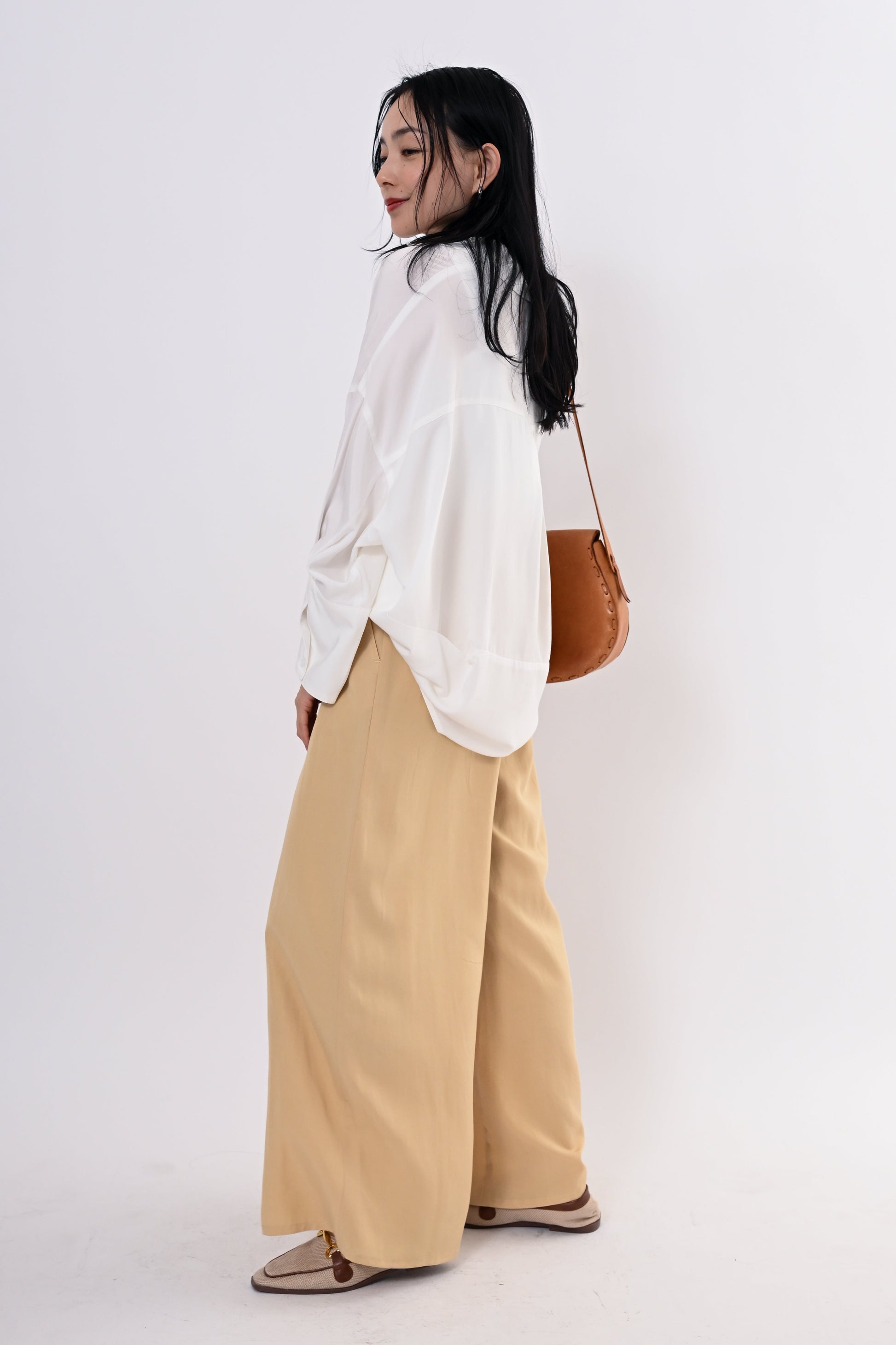 同素材のテンセルツイルワイドパンツもご用意しており、セットアップにすればモダンで洗練されたスタイルに。