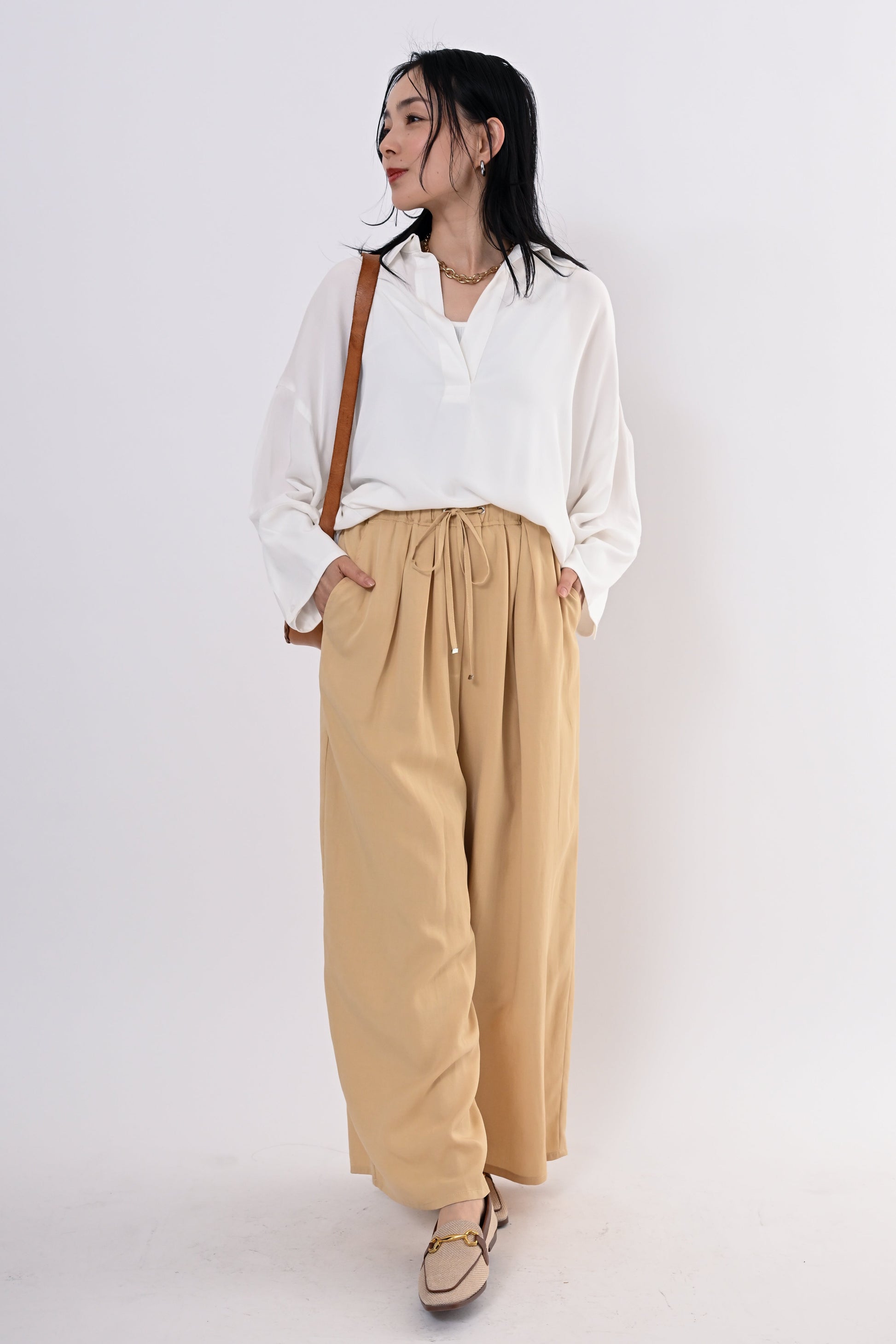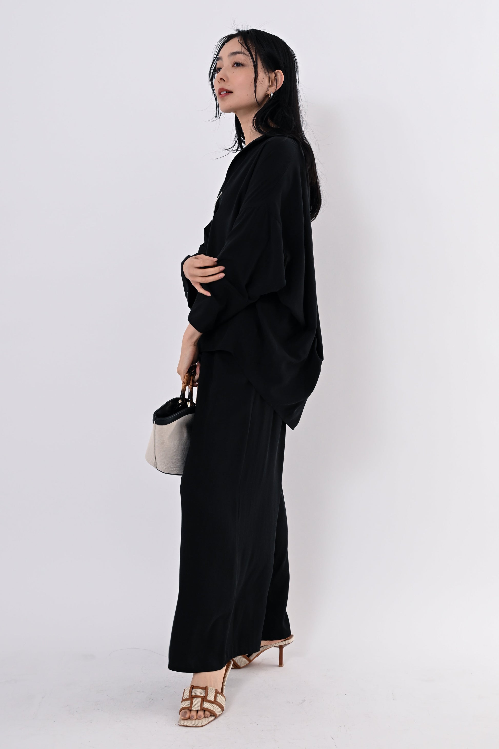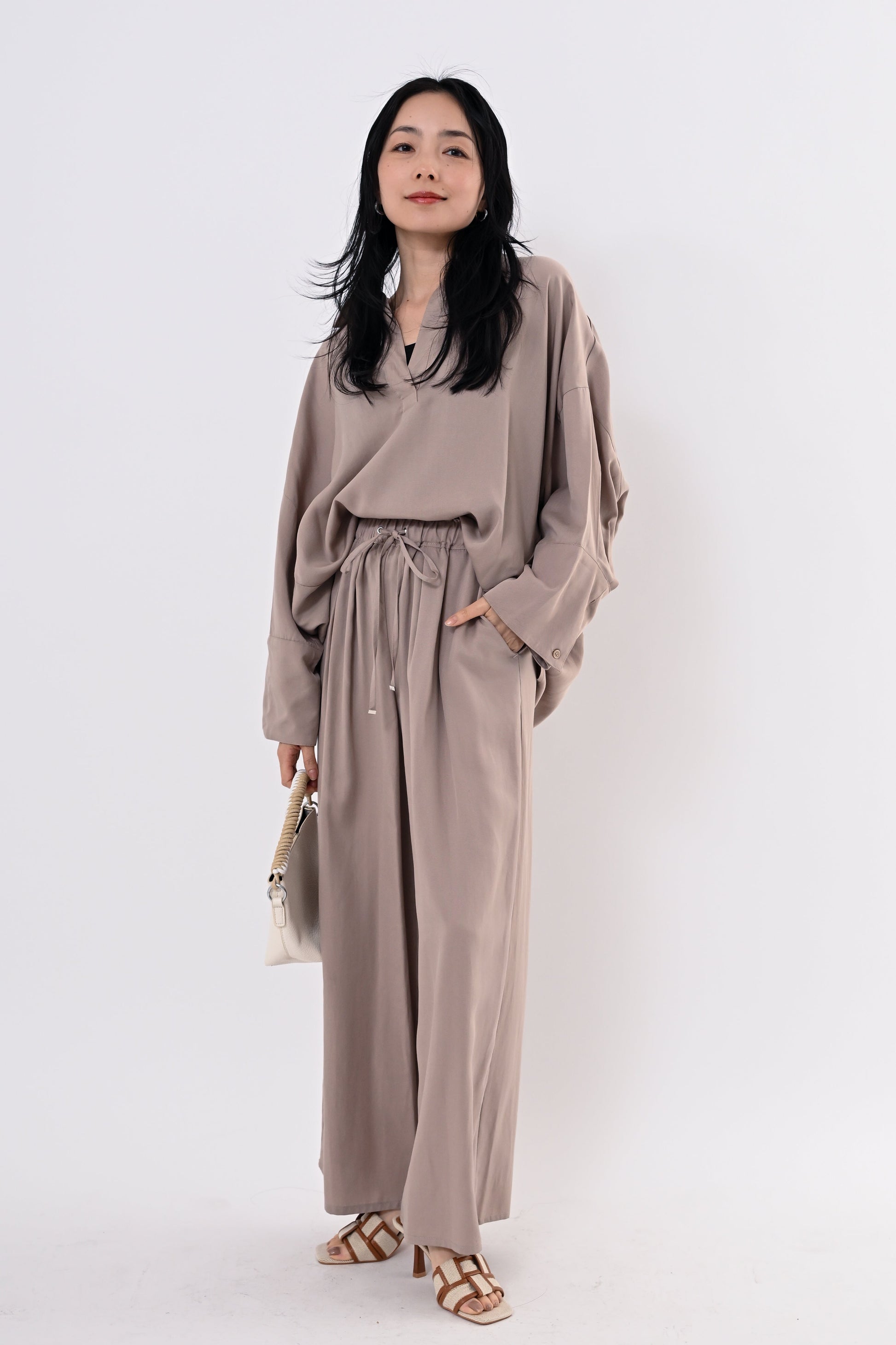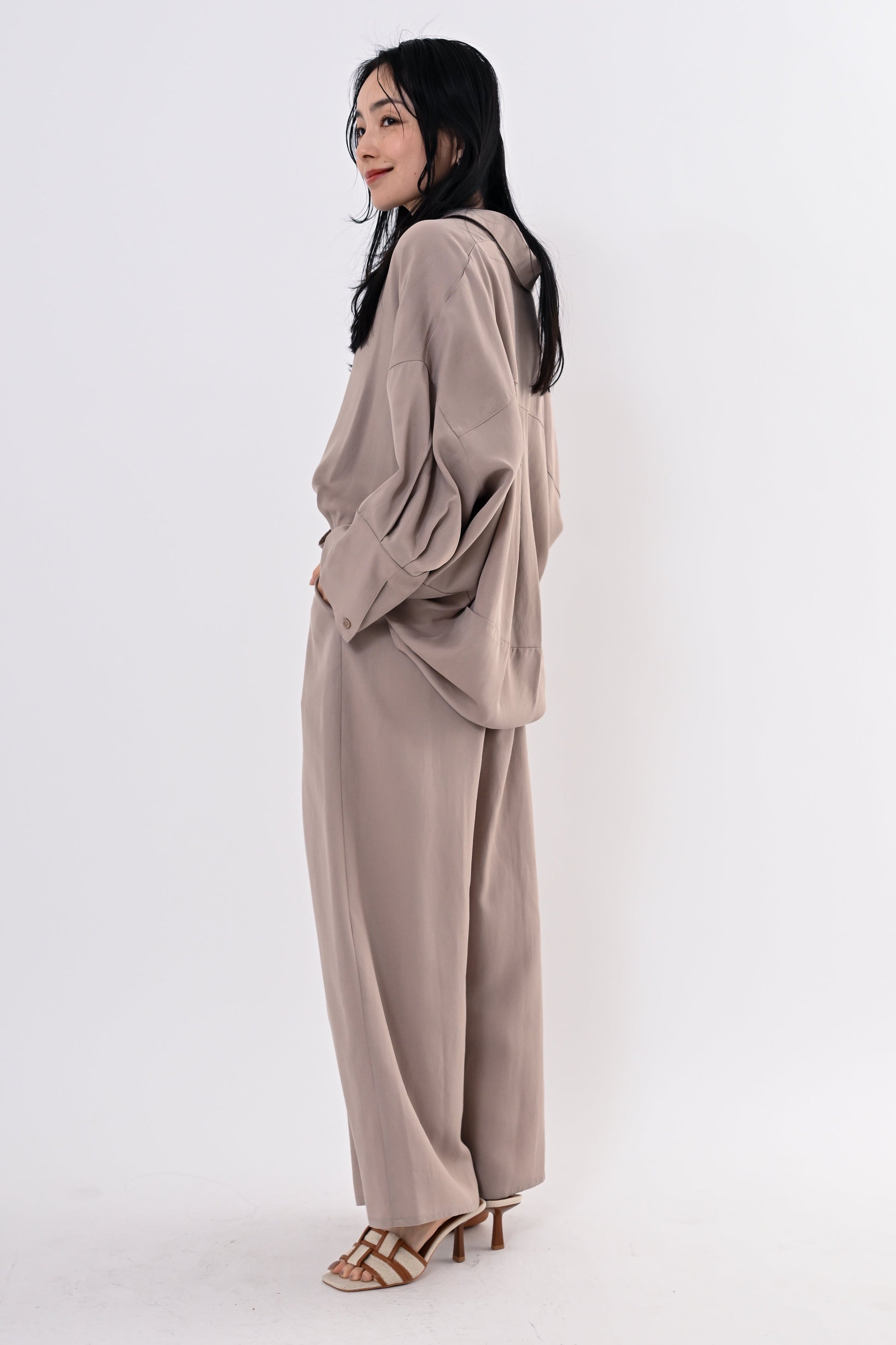 同素材のテンセルツイルワイドパンツもご用意しており、セットアップにすればモダンで洗練されたスタイルに。