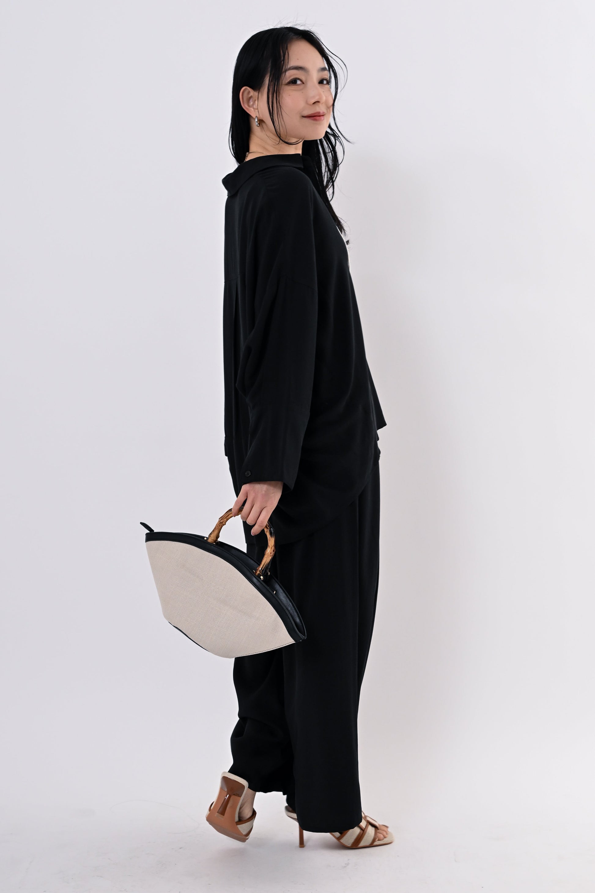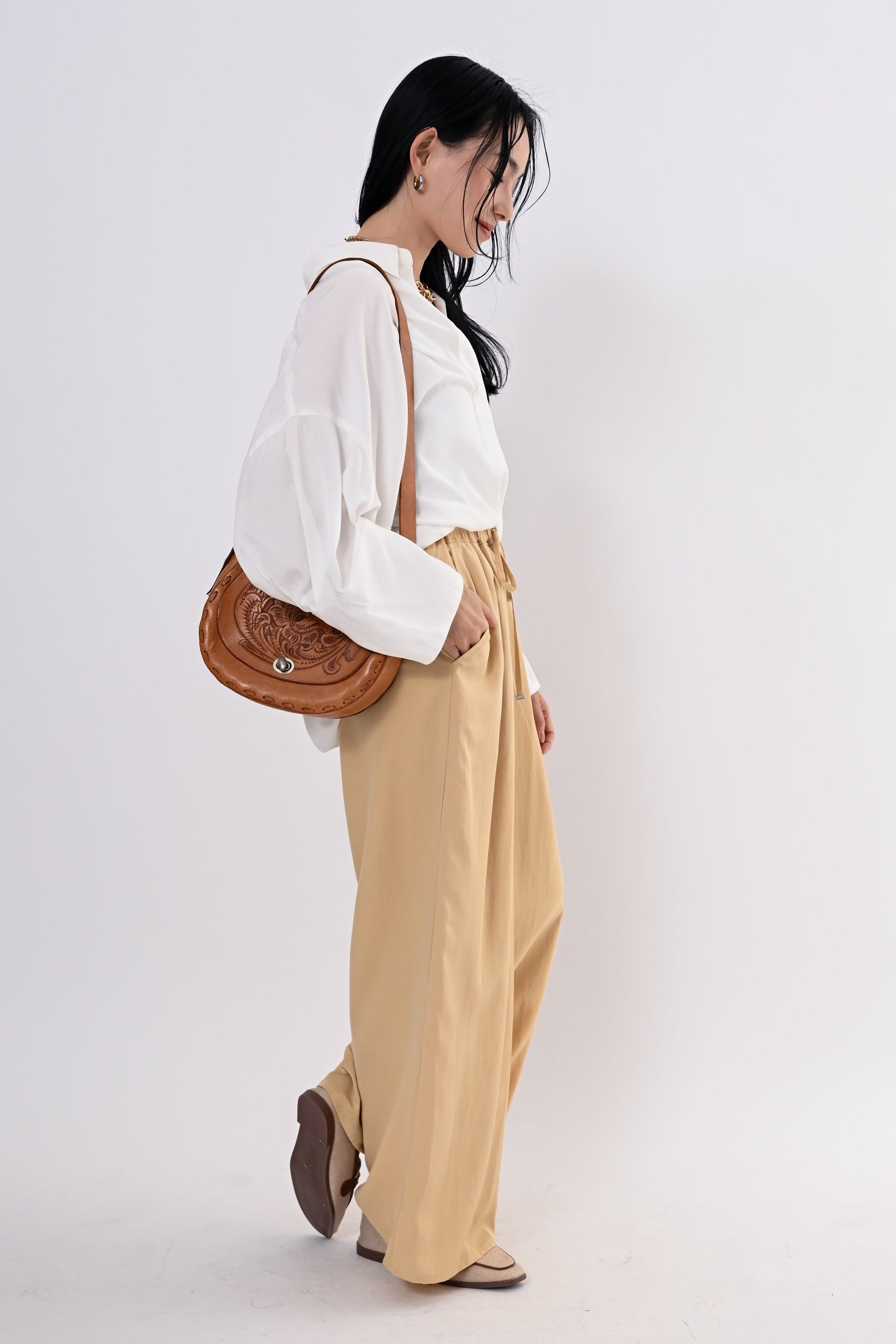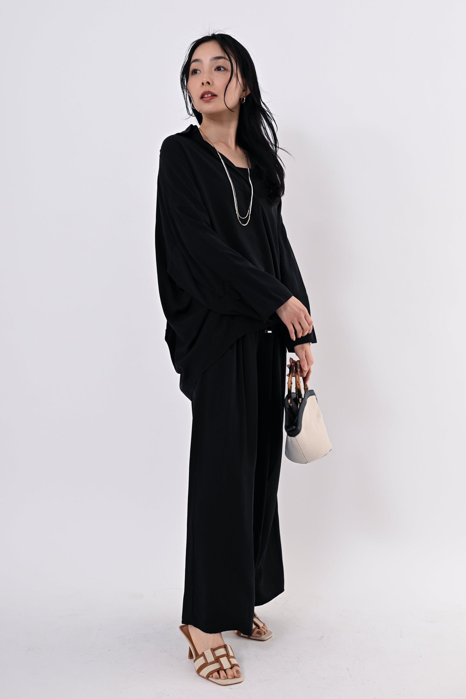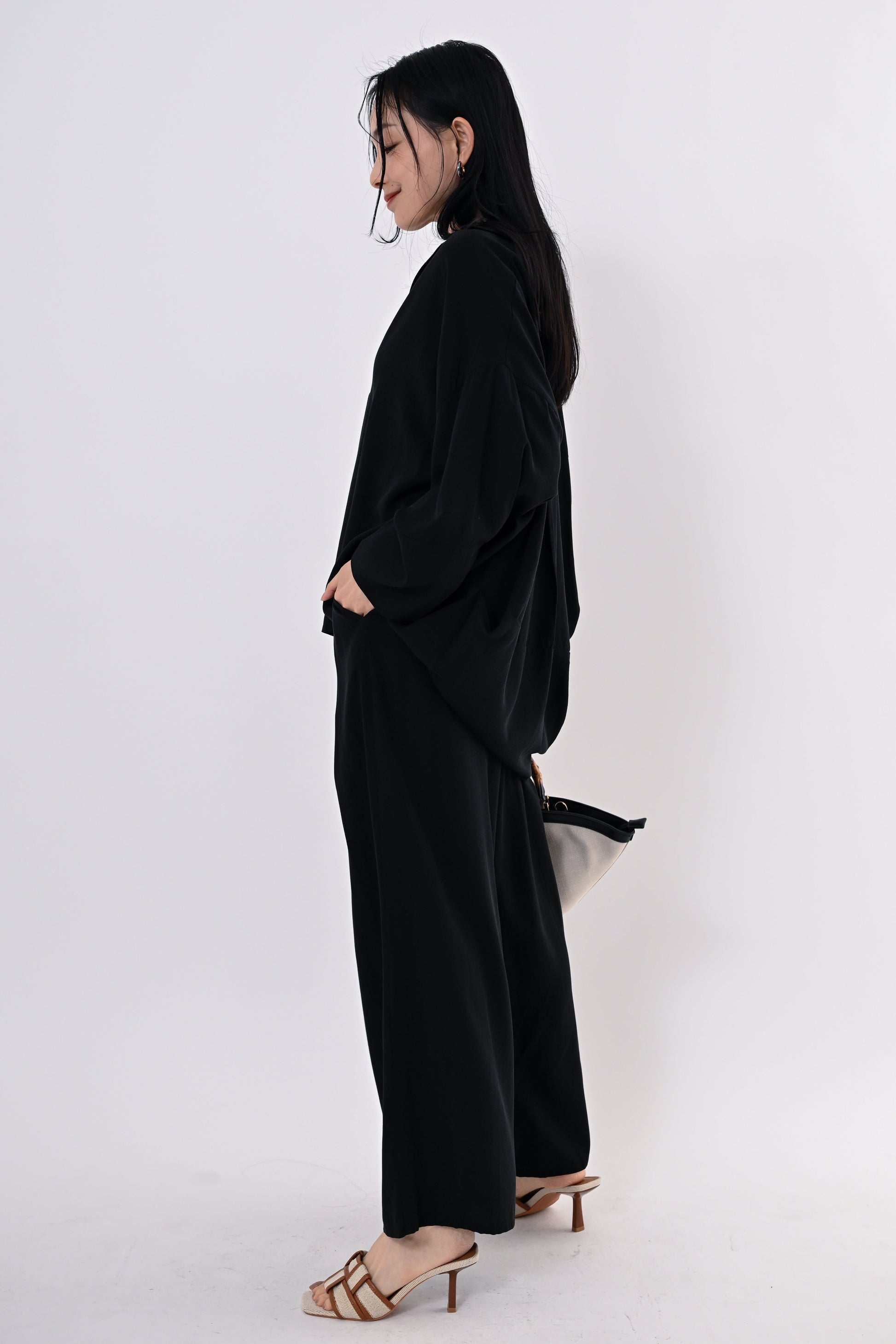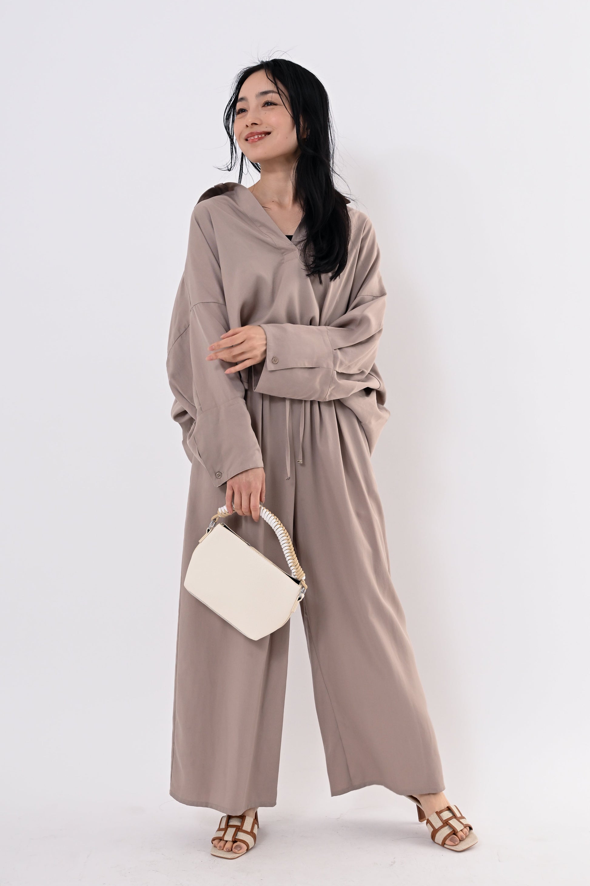 同素材のテンセルツイルワイドパンツもご用意しており、セットアップにすればモダンで洗練されたスタイルに。