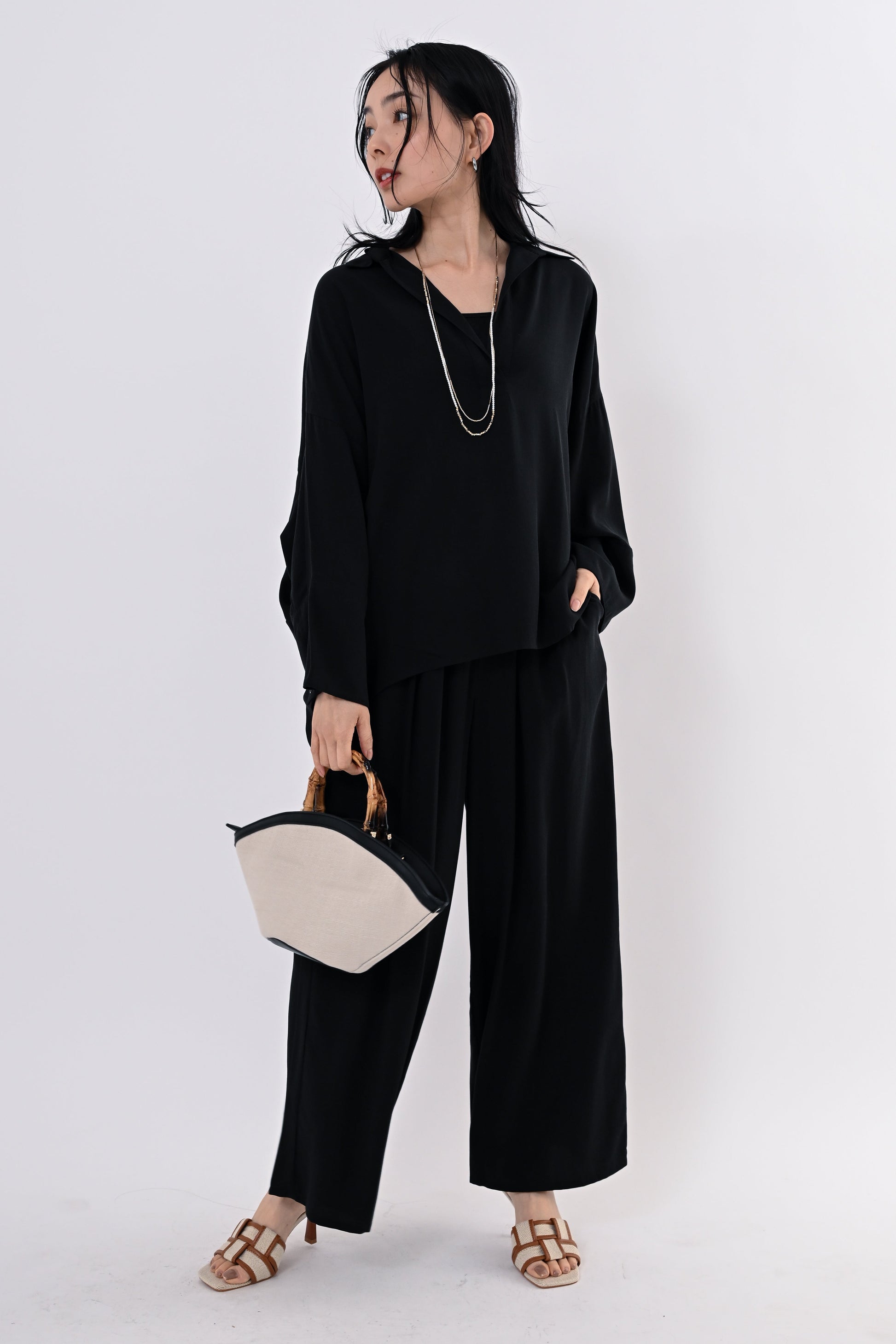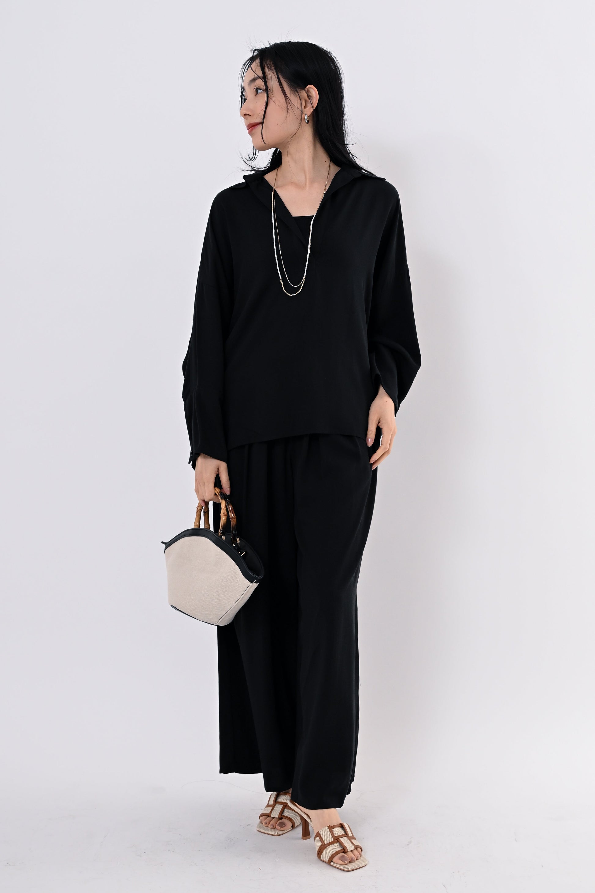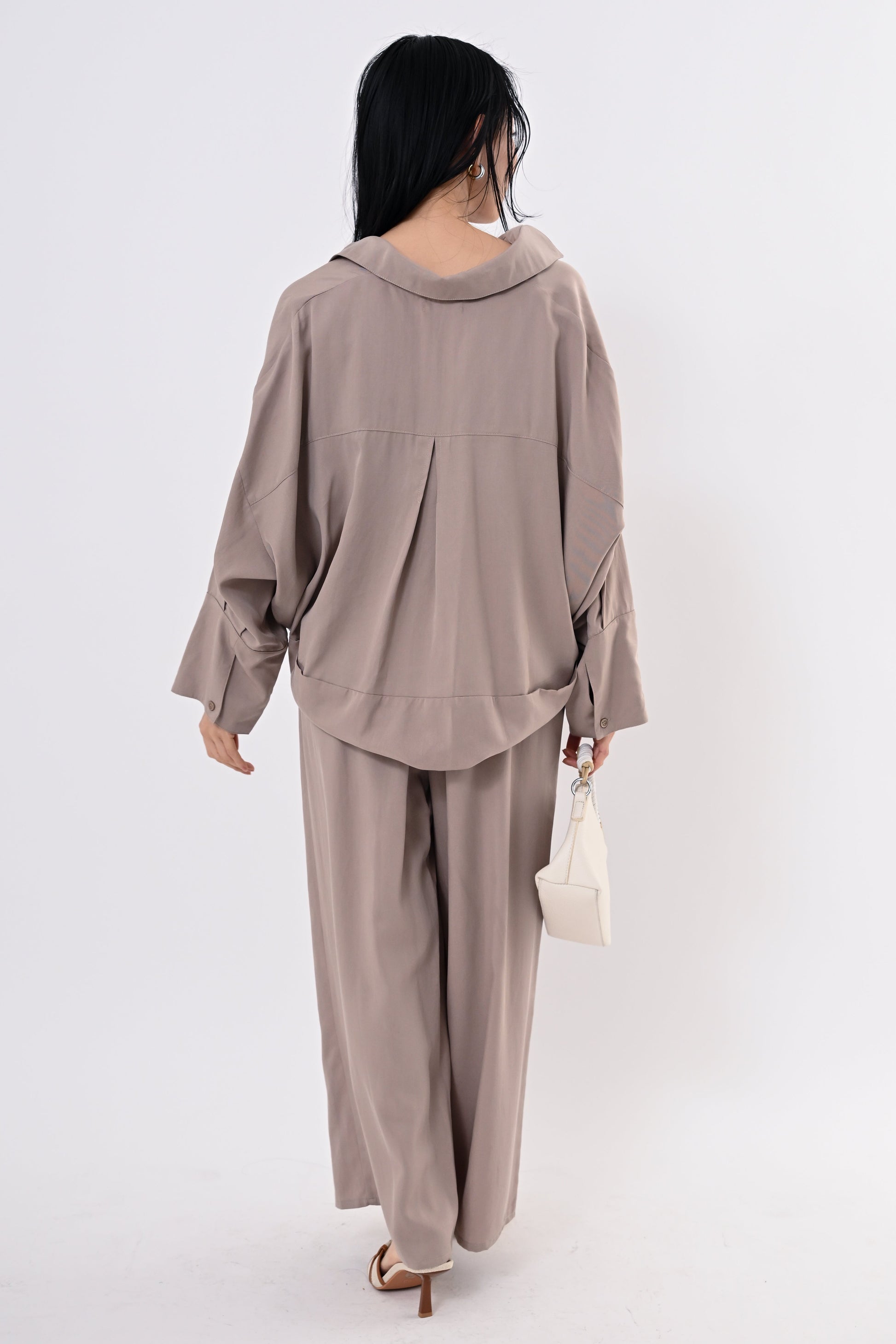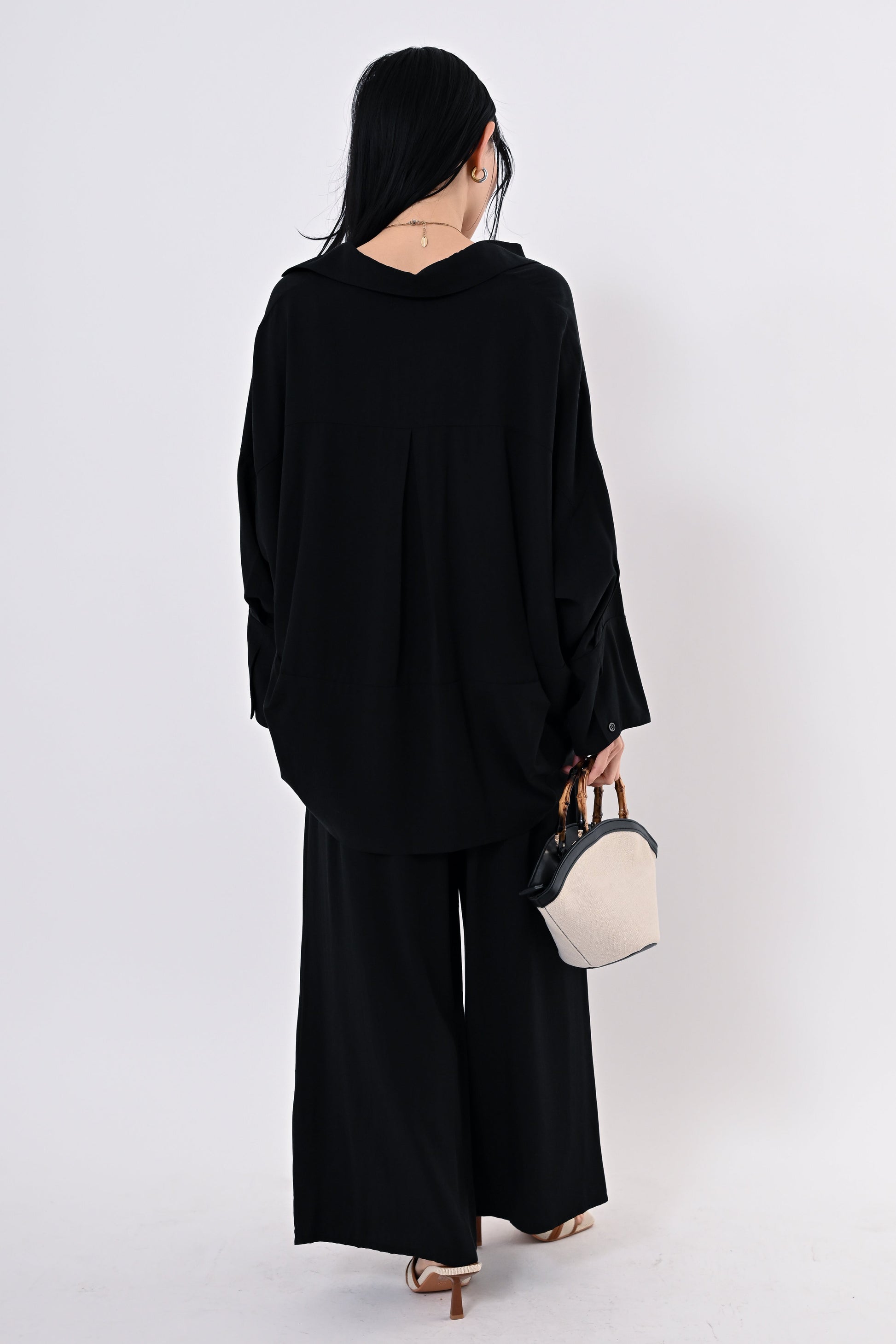 同素材のテンセルツイルワイドパンツもご用意しており、セットアップにすればモダンで洗練されたスタイルに。