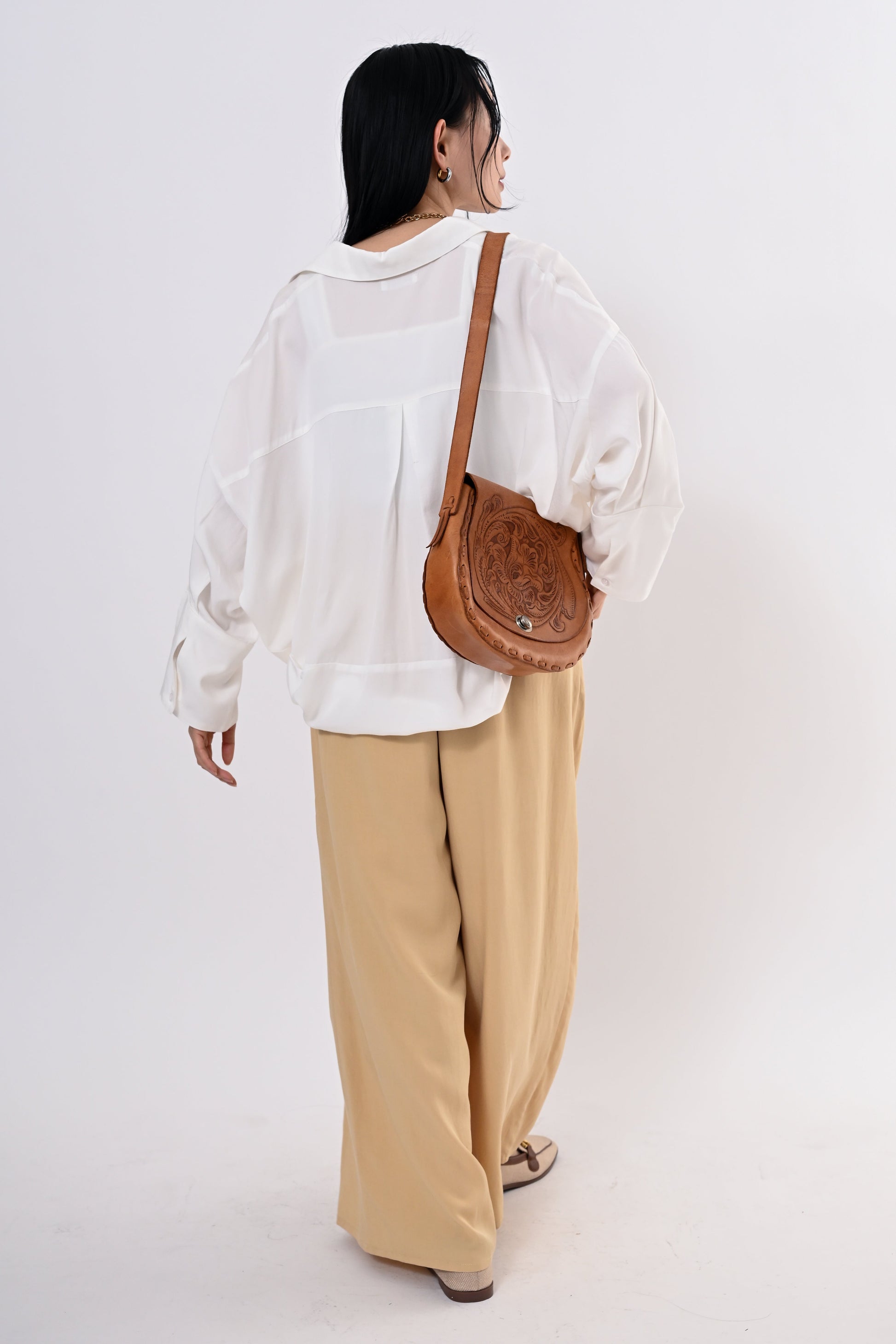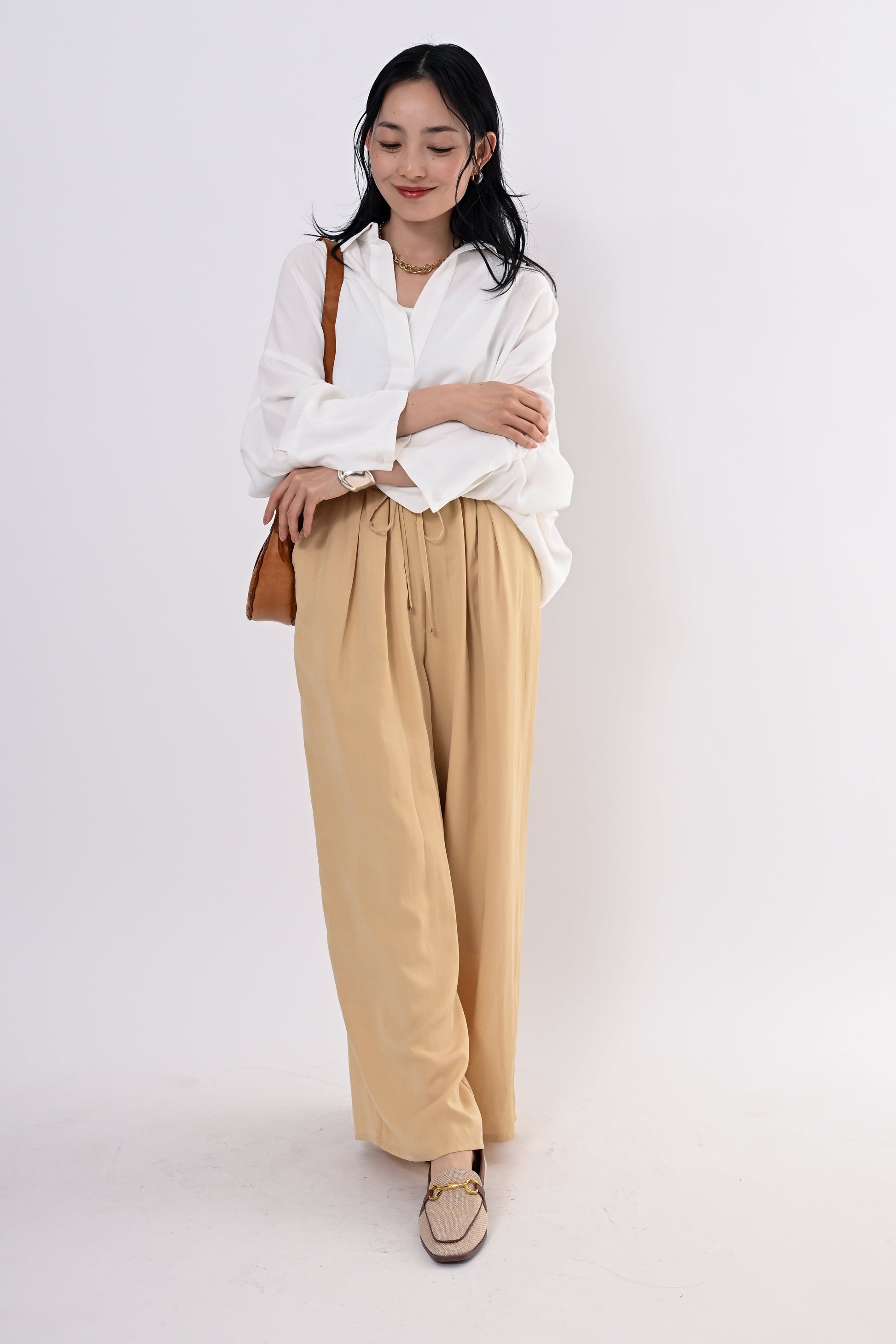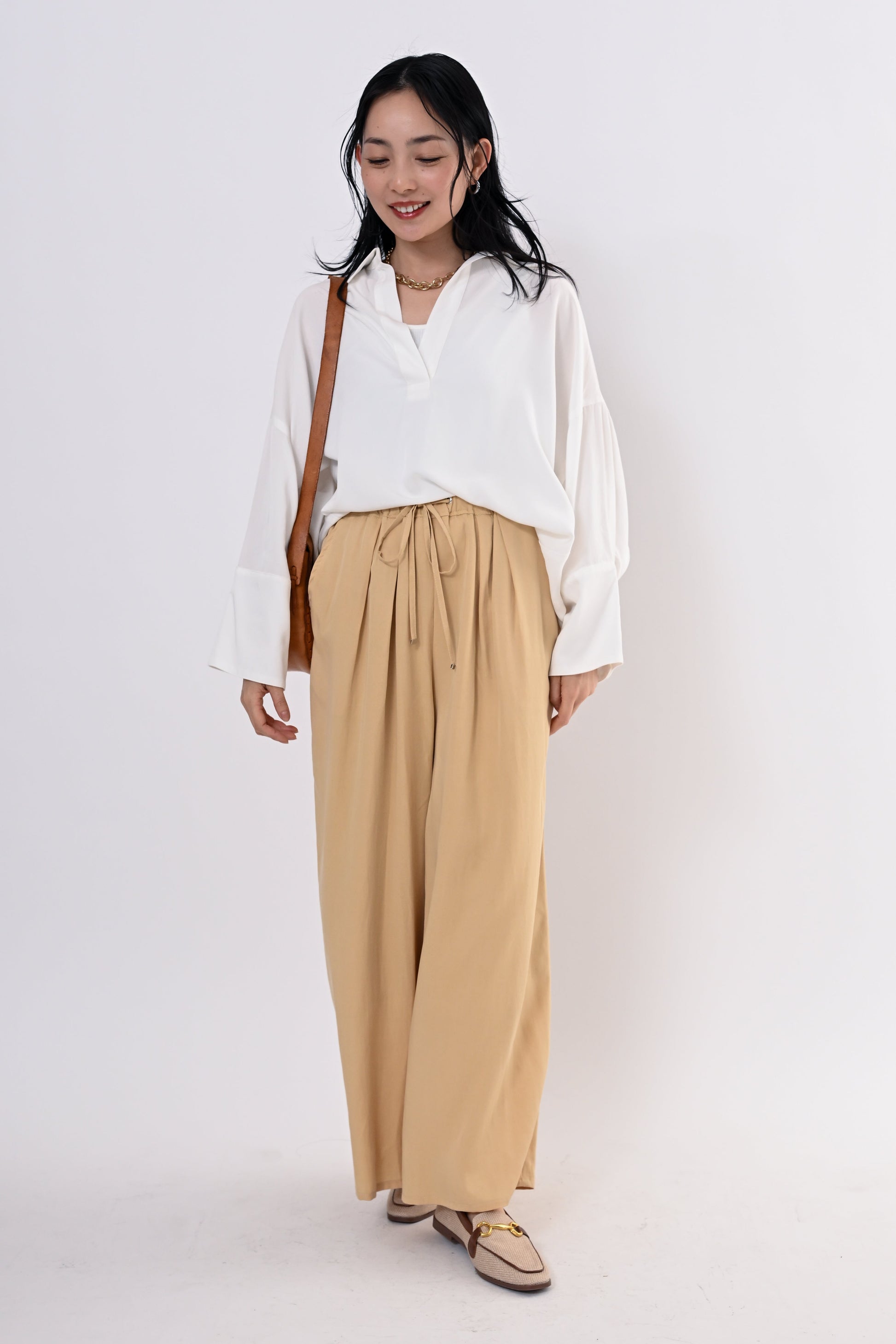 とろみ素材で魅せる、大人の抜け感スキッパー