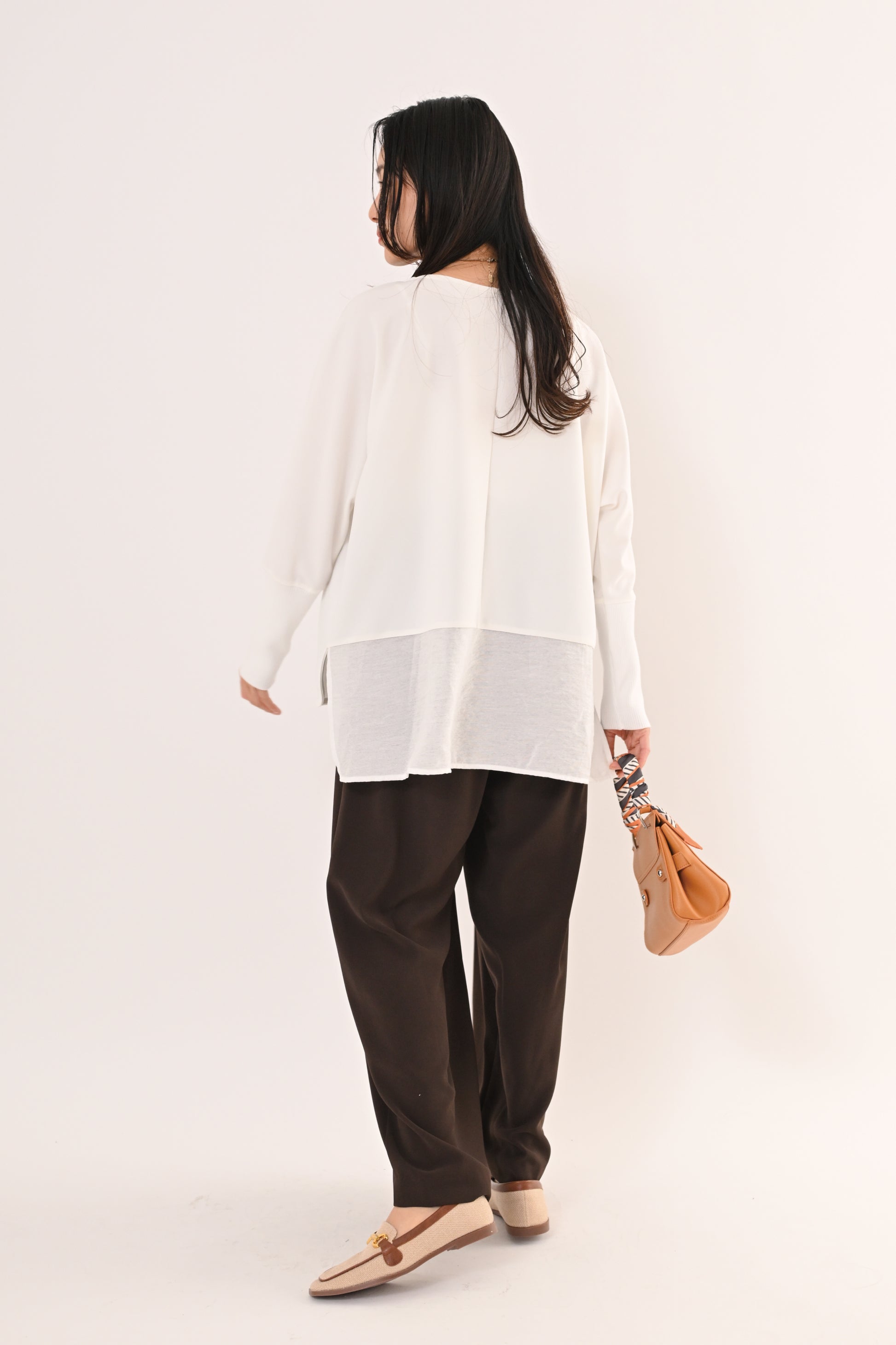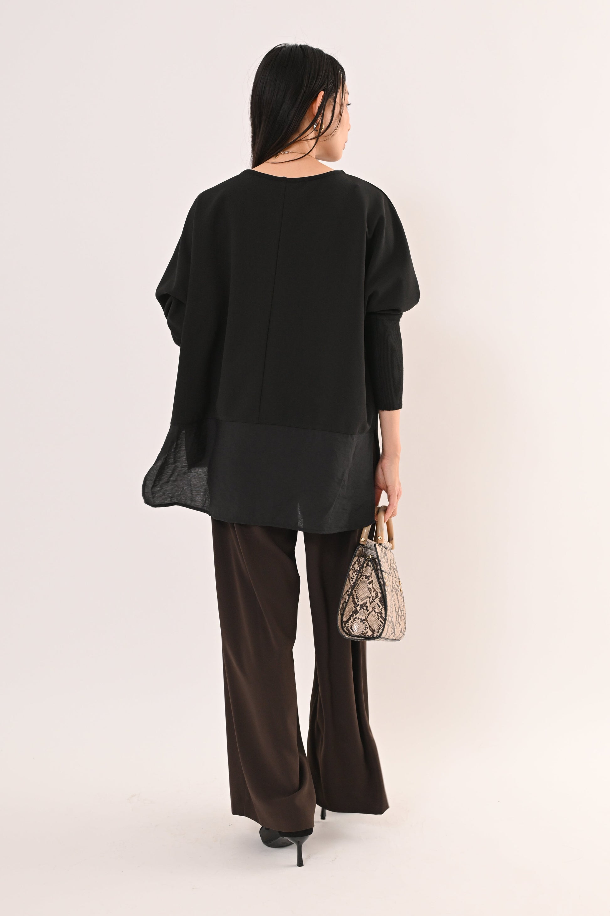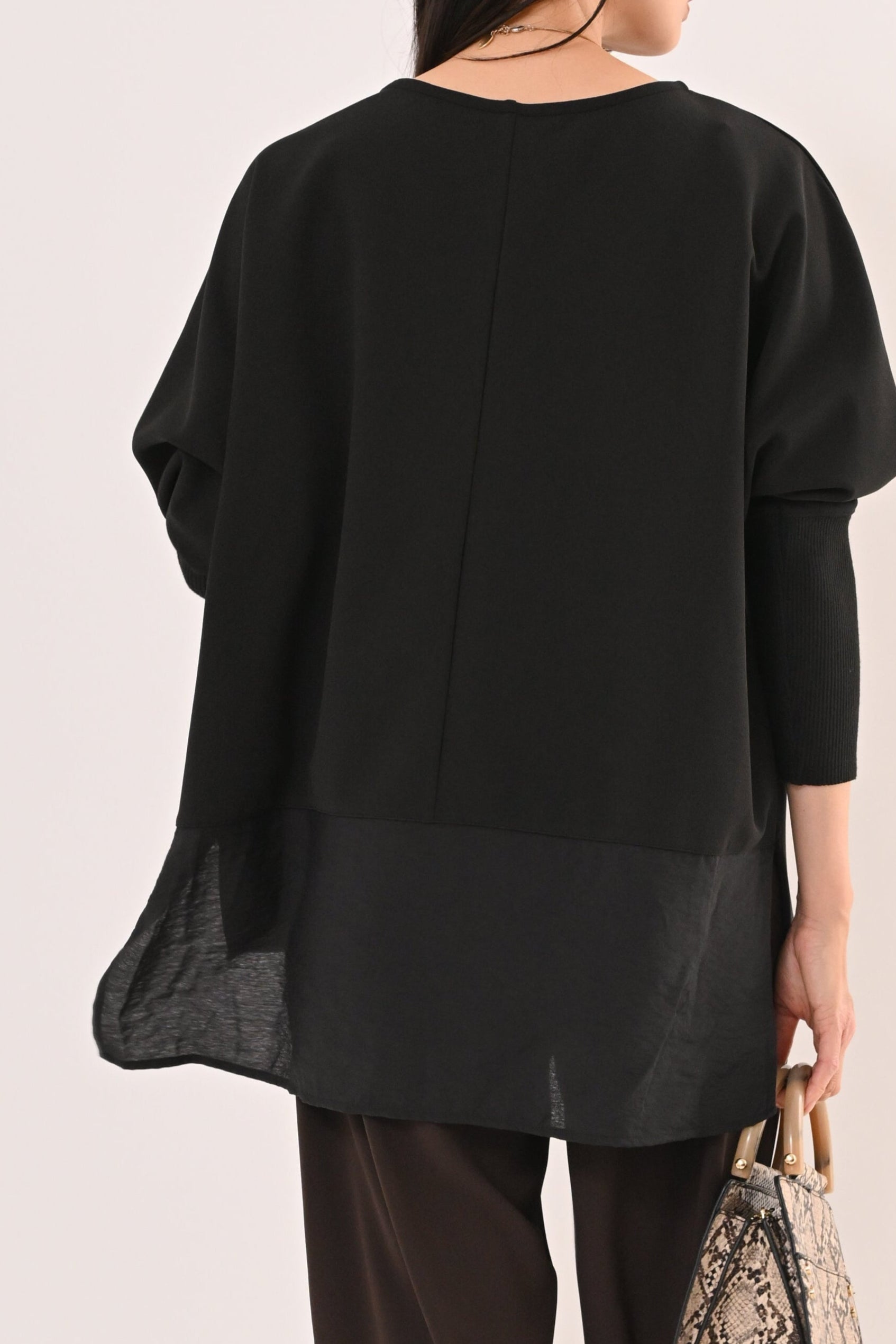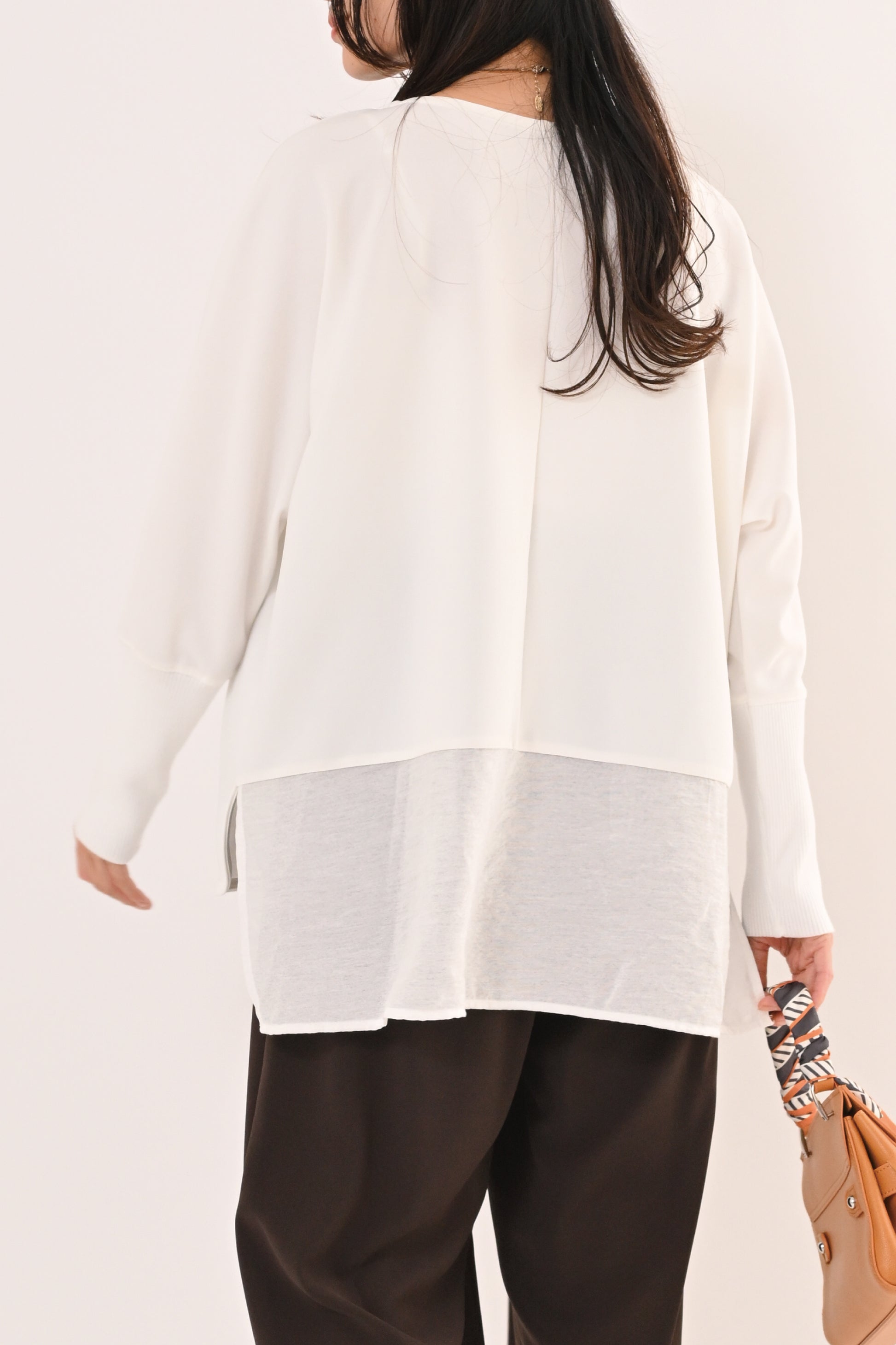 背面は異素材で切り替えデザイン、前後さのある裾ラインが、動くたびに軽やかに揺れて、着るだけで上品な印象に。 ゆったりとしたサイジングで体のラインを選ばず、どんなボトムとも相性が良い。 オフィスからデイリーまで、シーンを選ばず活躍する万能ブラウスです。