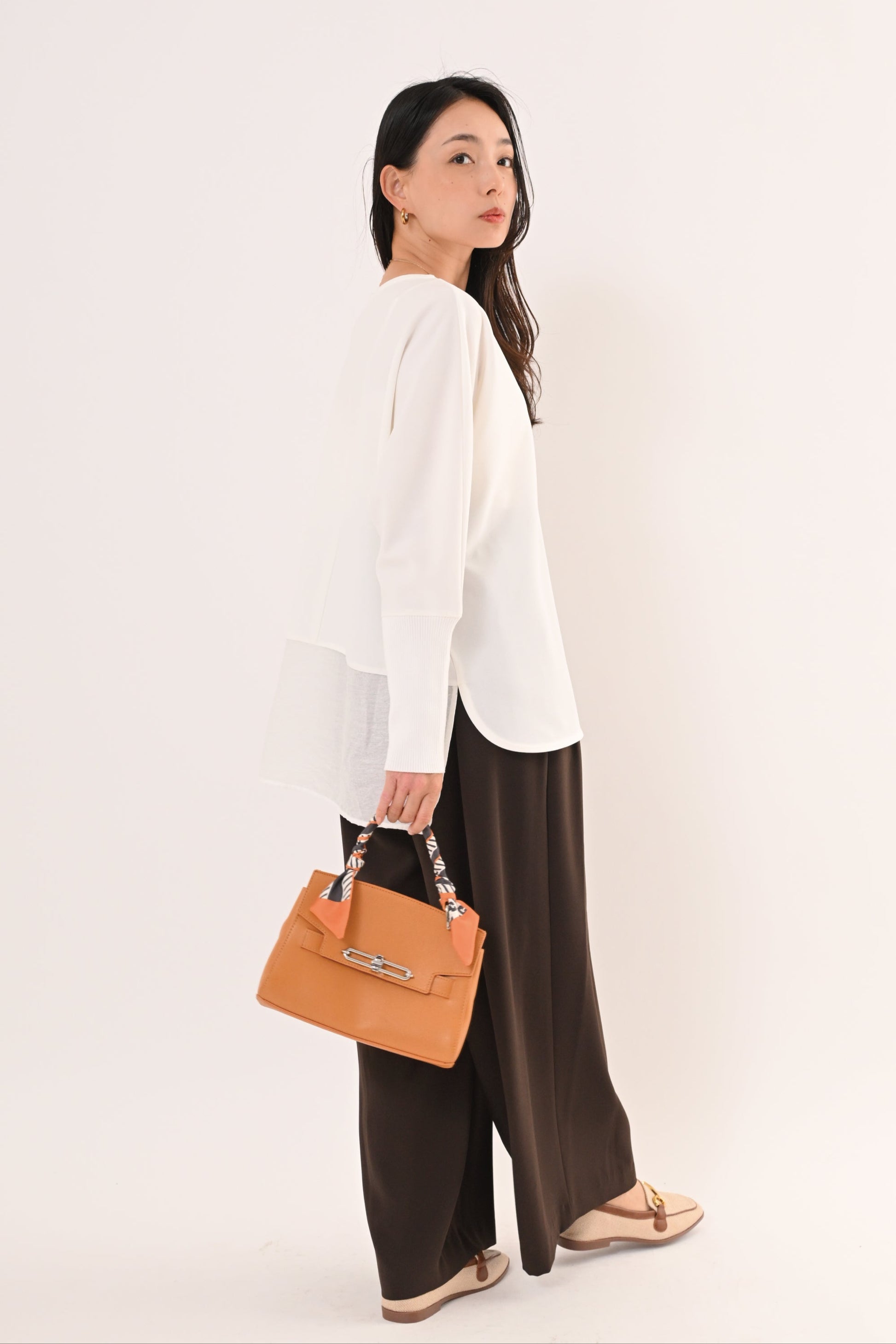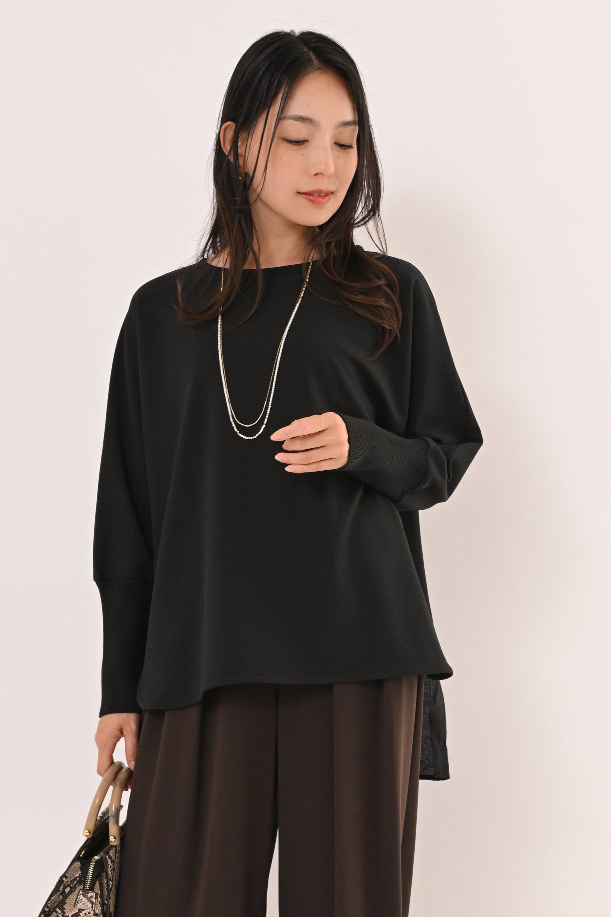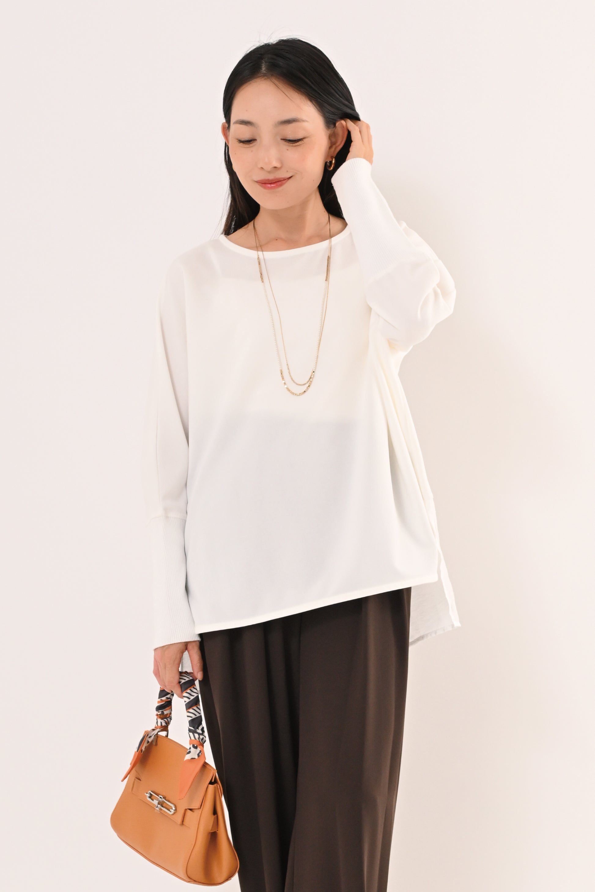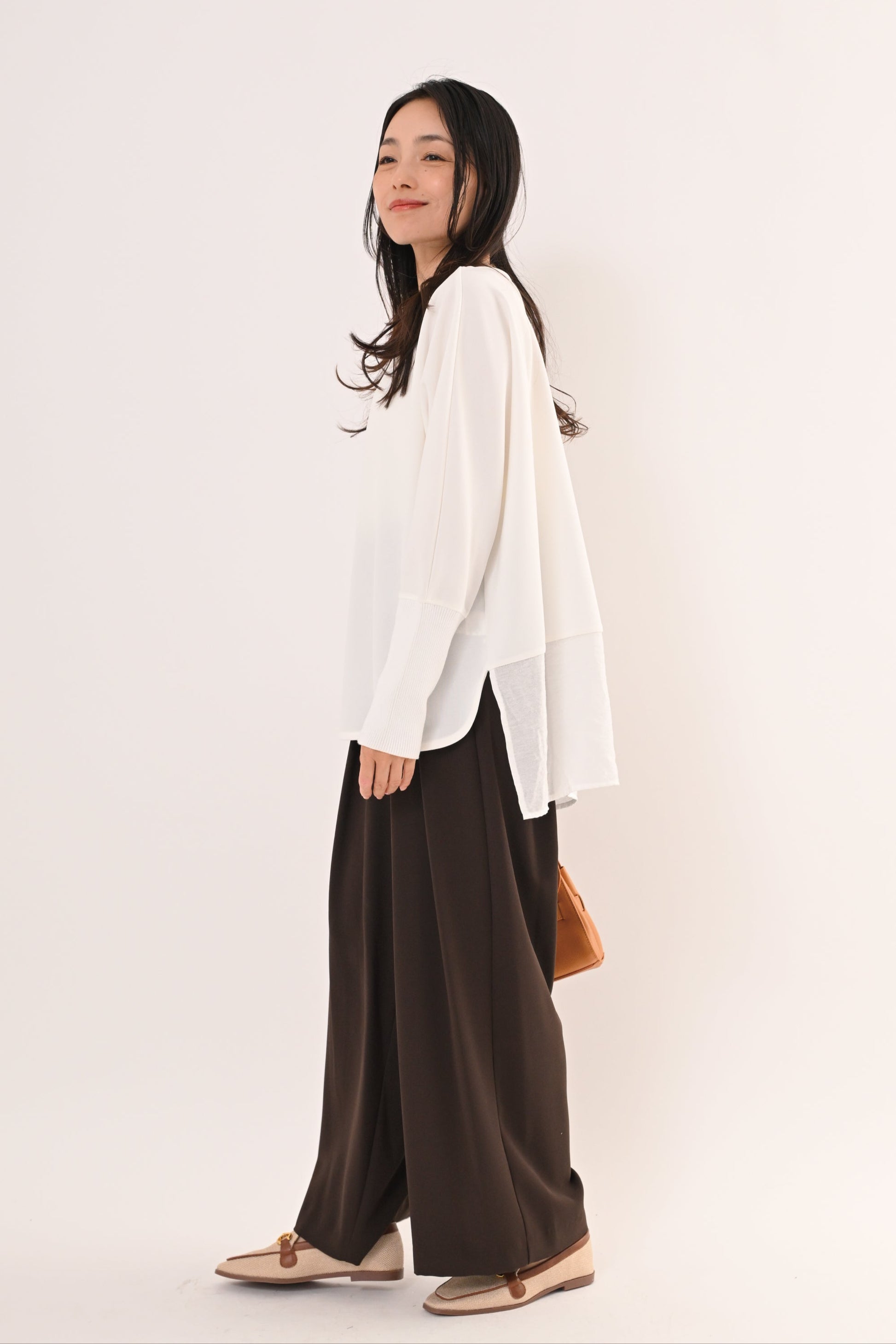 背面は異素材で切り替えデザイン、前後さのある裾ラインが、動くたびに軽やかに揺れて、着るだけで上品な印象に。 ゆったりとしたサイジングで体のラインを選ばず、どんなボトムとも相性が良い。 オフィスからデイリーまで、シーンを選ばず活躍する万能ブラウスです。