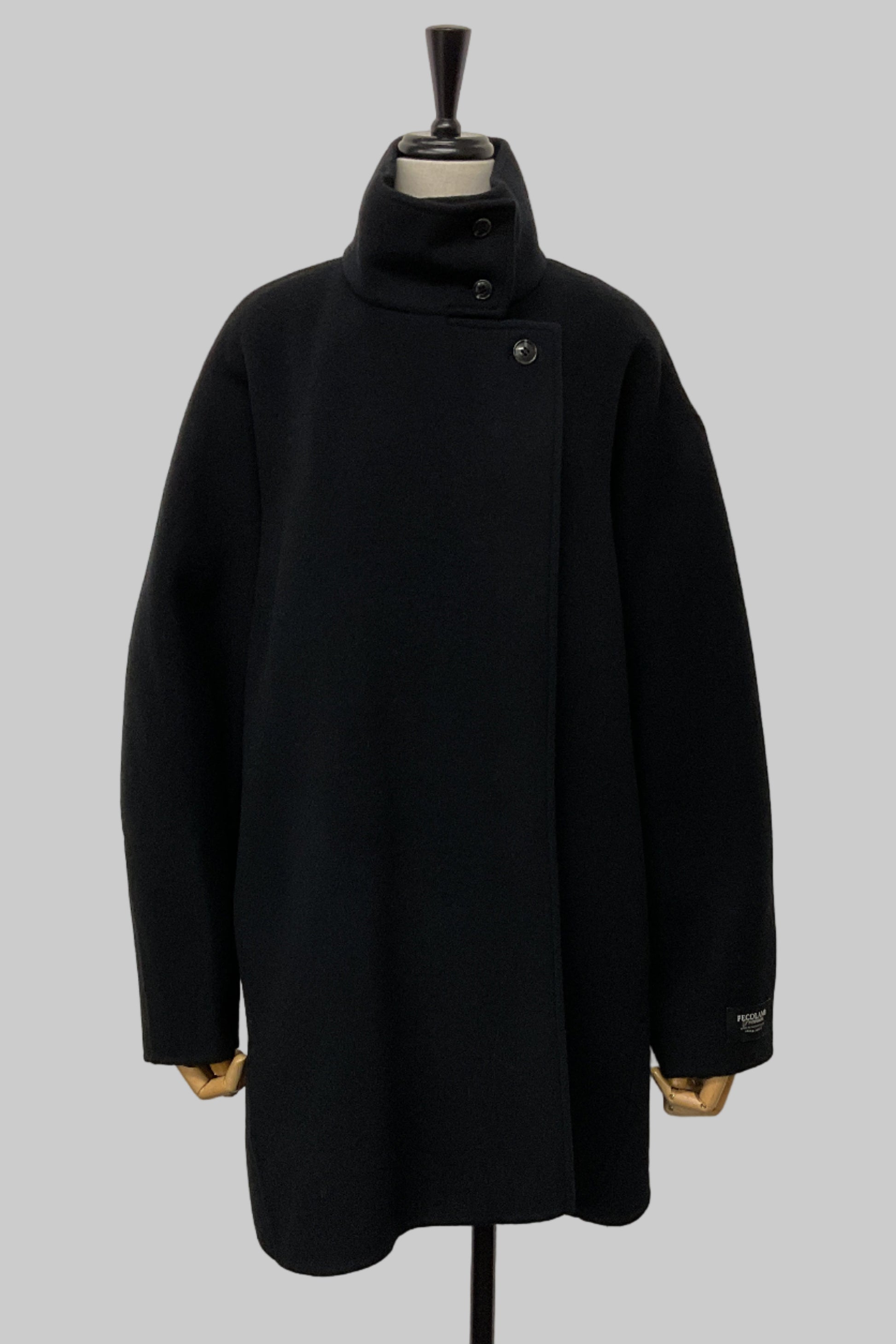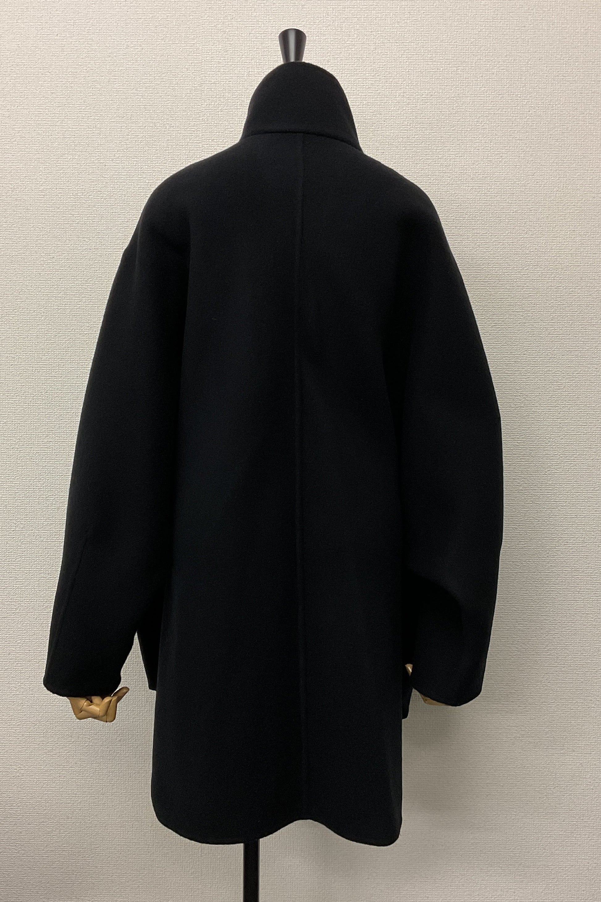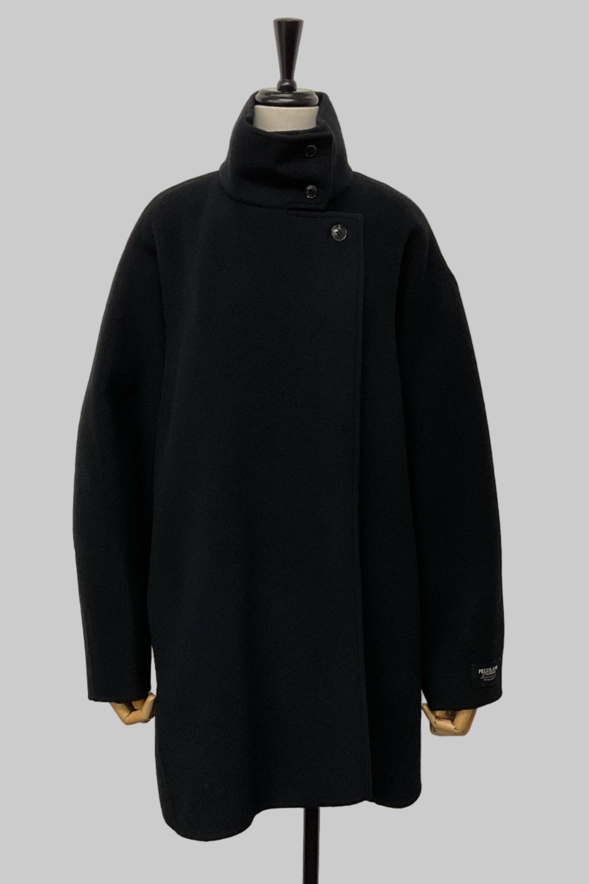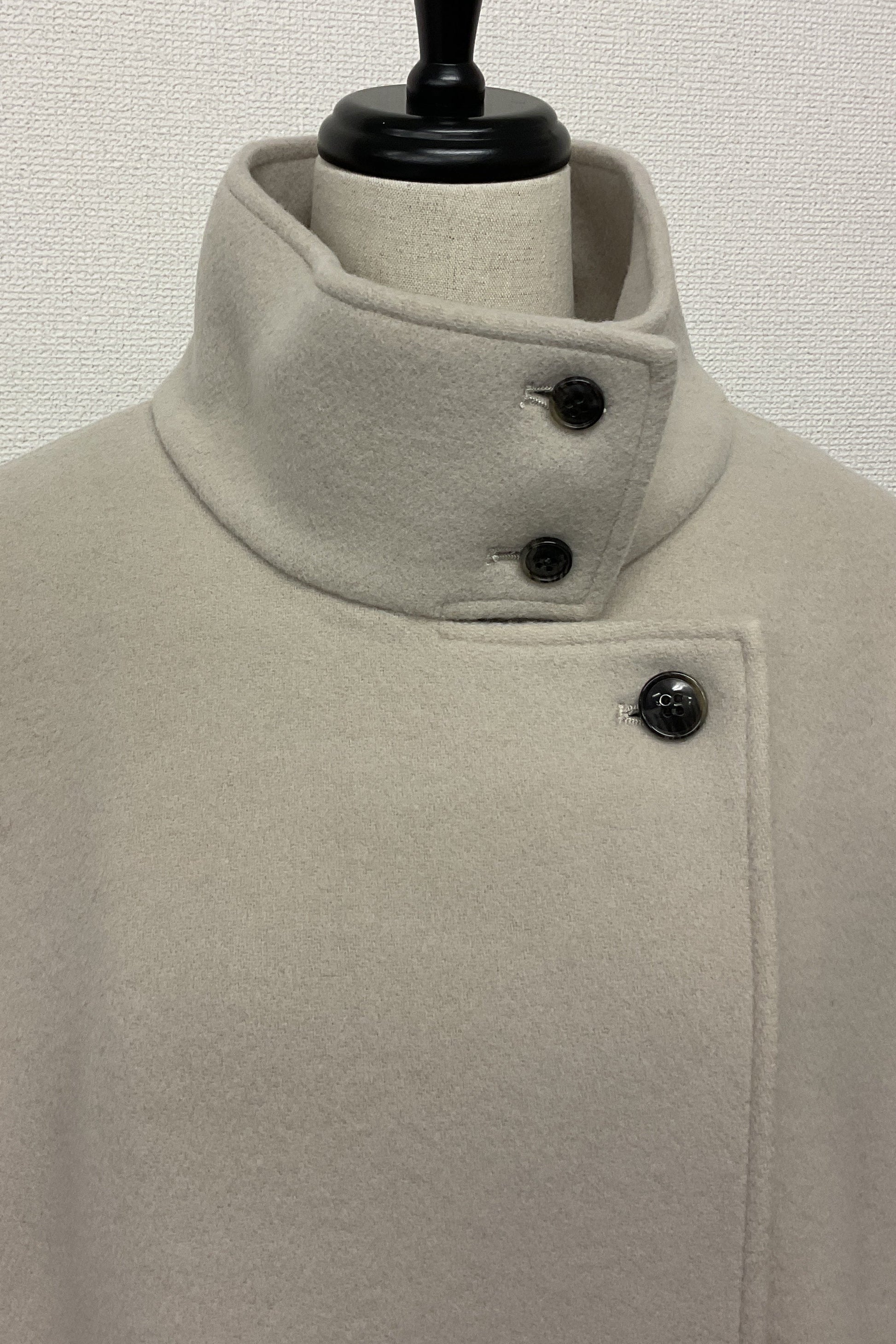 ダブルフェイス仕立てならではの柔らかな落ち感と、絶妙な立ち襟デザインが上品な印象を演出します。