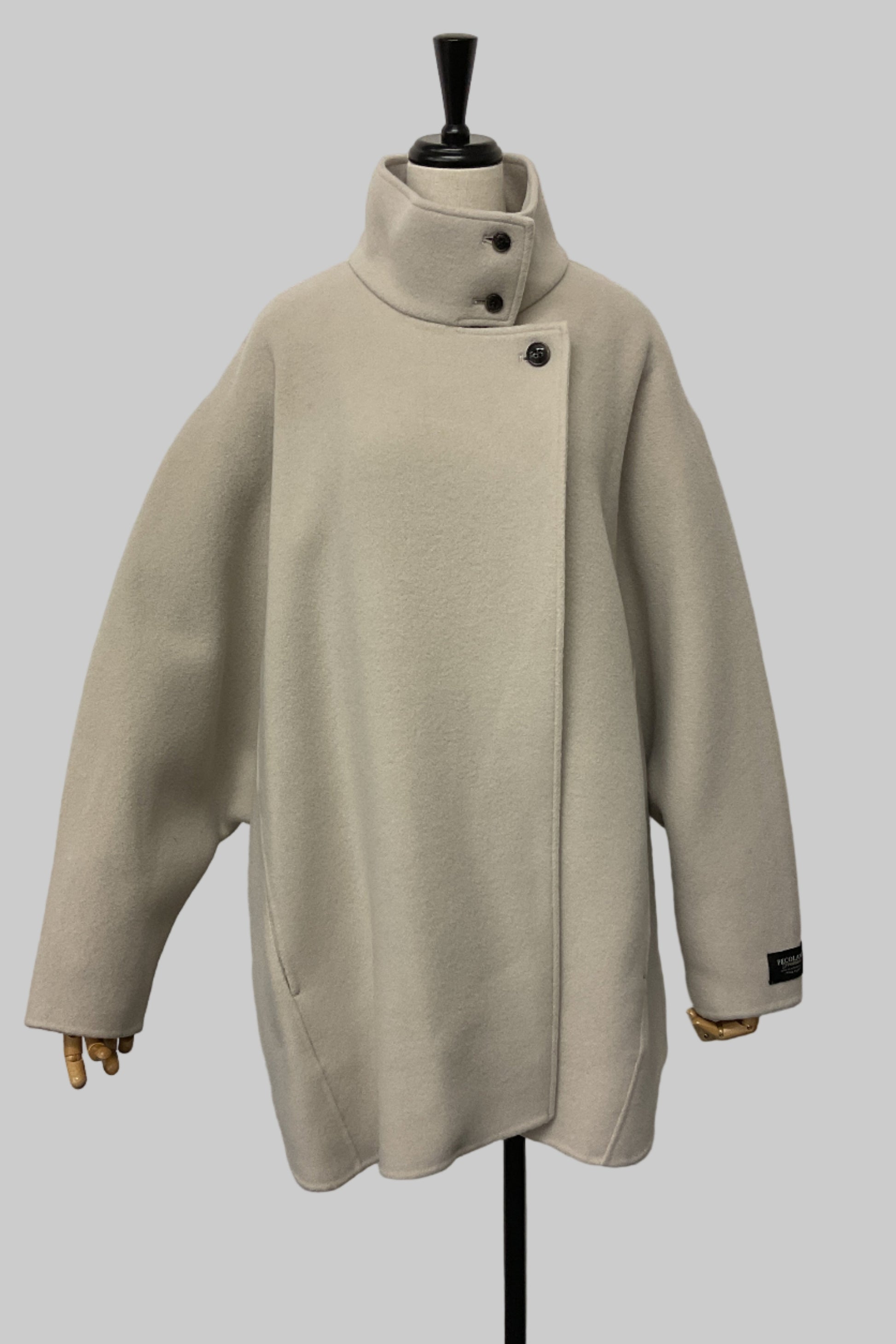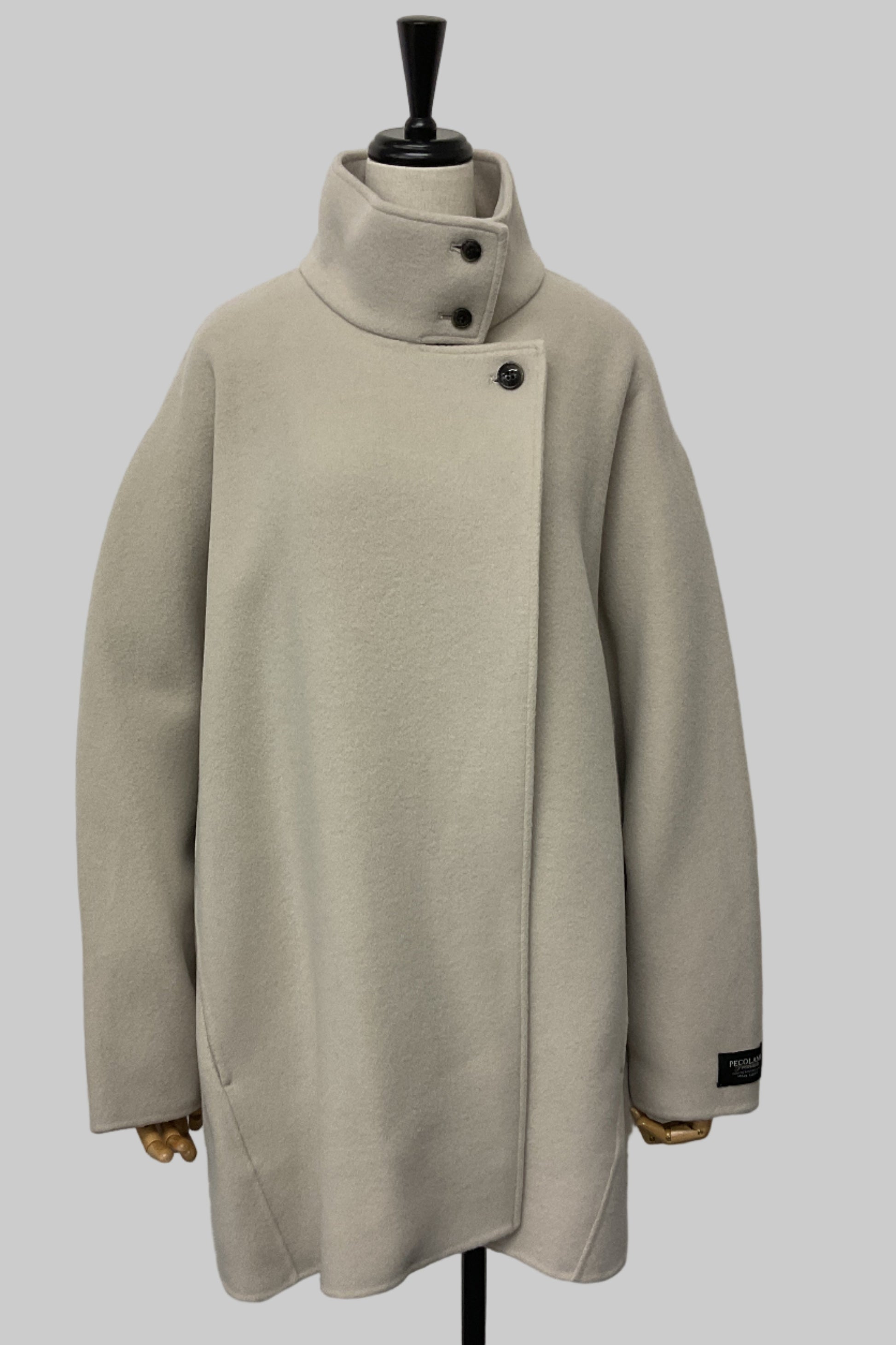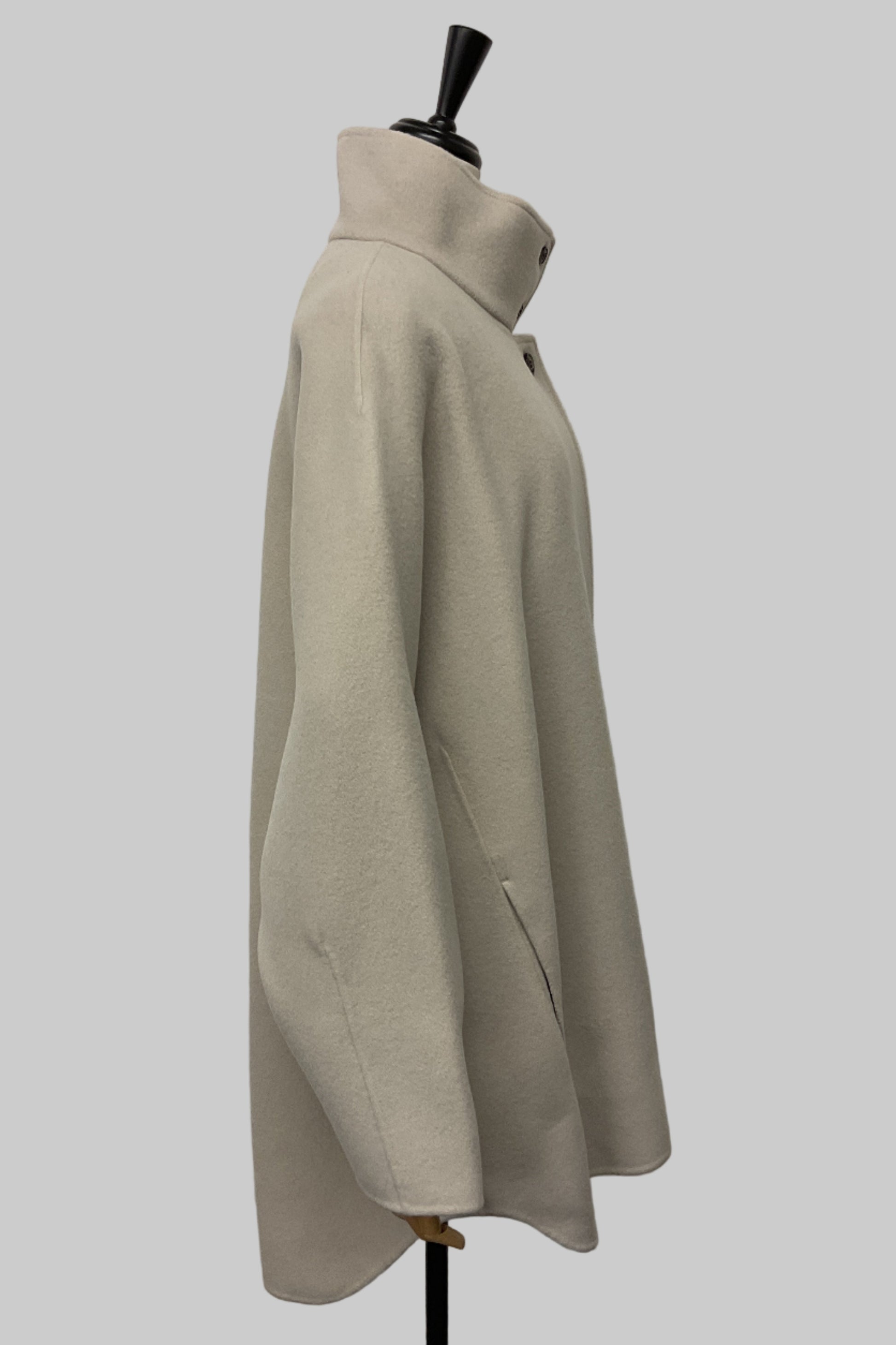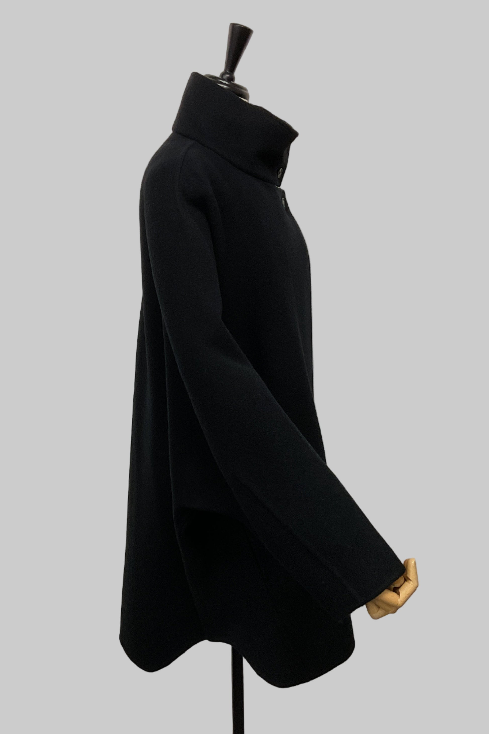 ダブルフェイス仕立てならではの柔らかな落ち感と、絶妙な立ち襟デザインが上品な印象を演出します。