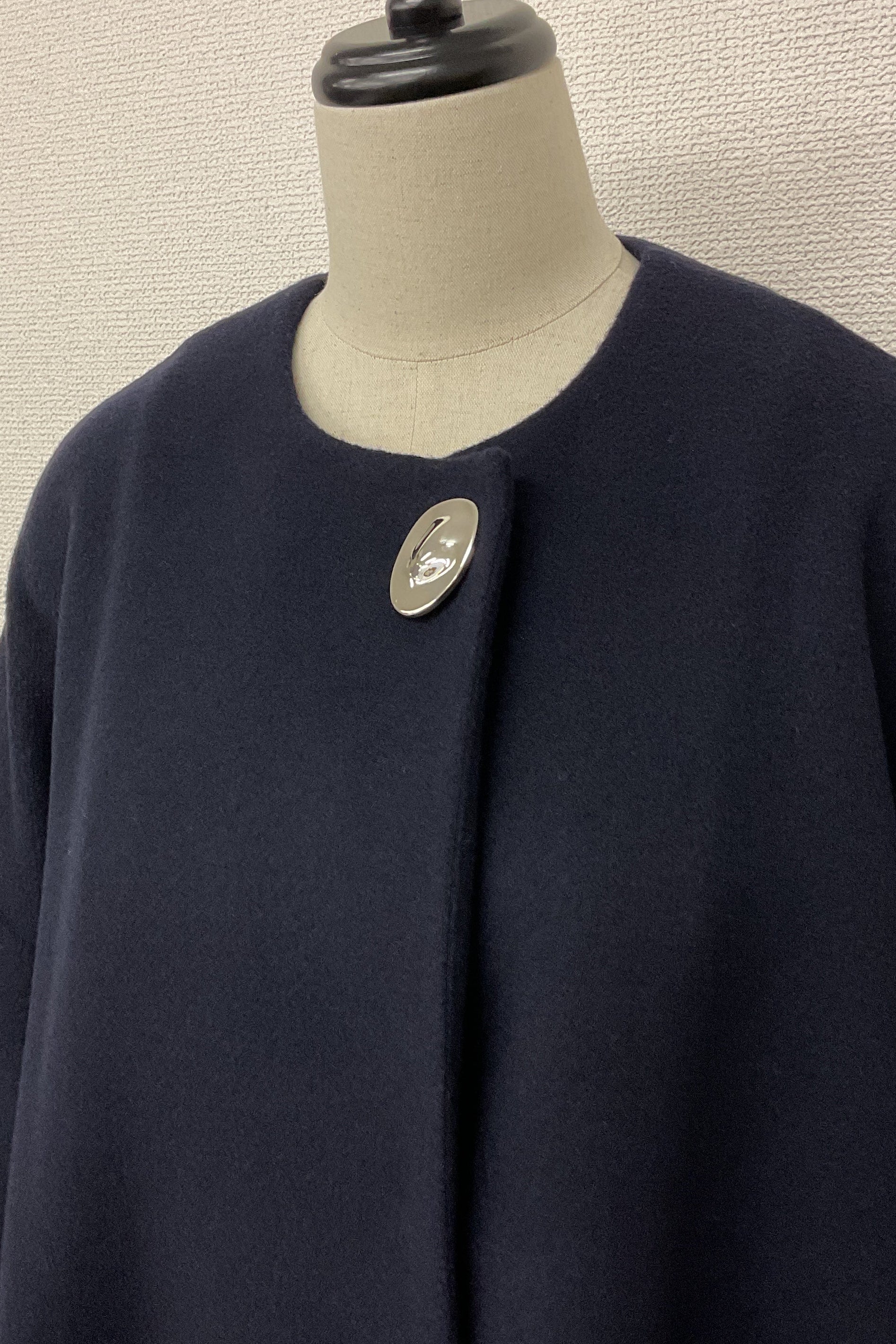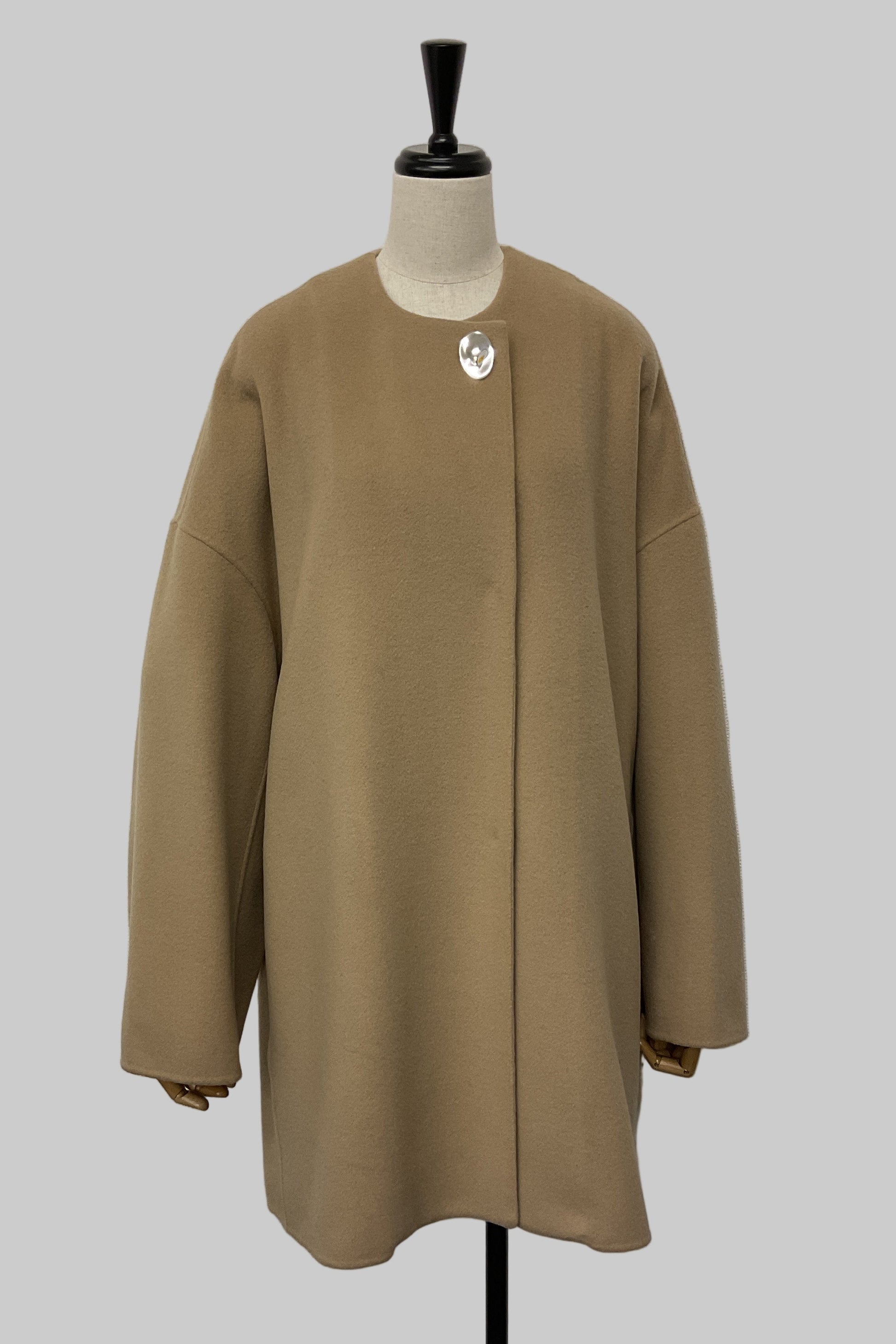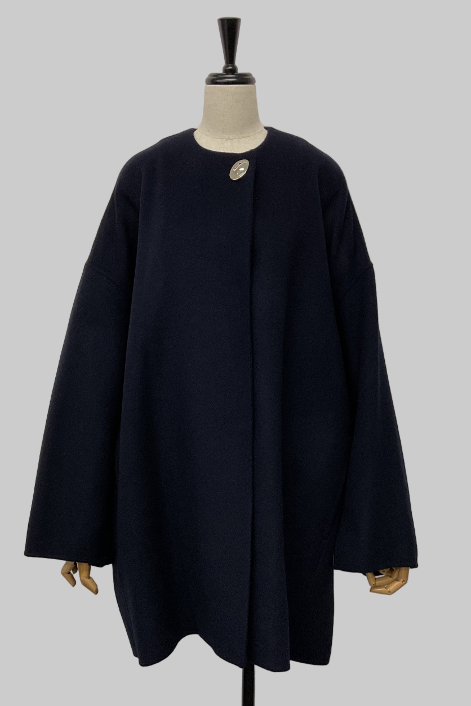 品格と女性らしさを大切にする大人のためのブランド「Dignite Collier」から、存在感のあるノーカラービッグシルエットコートが登場。