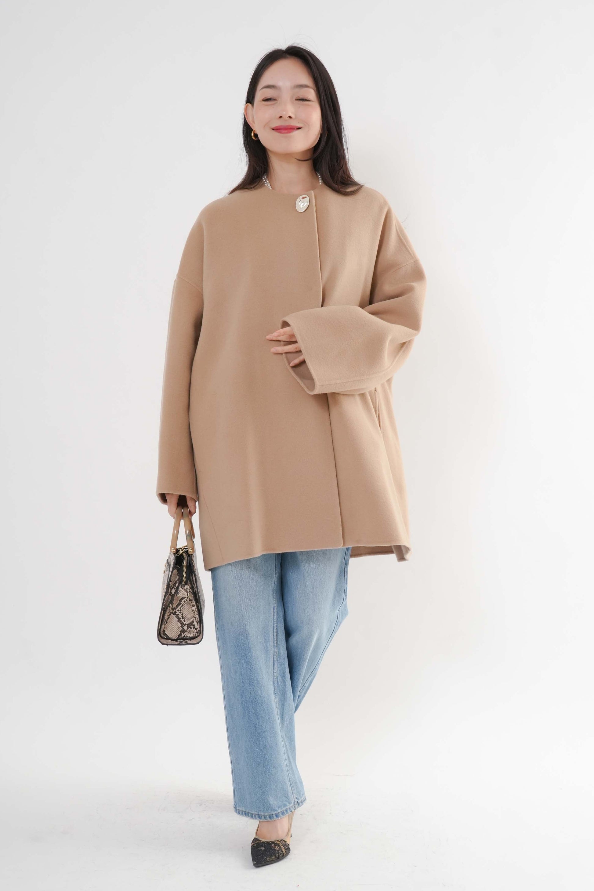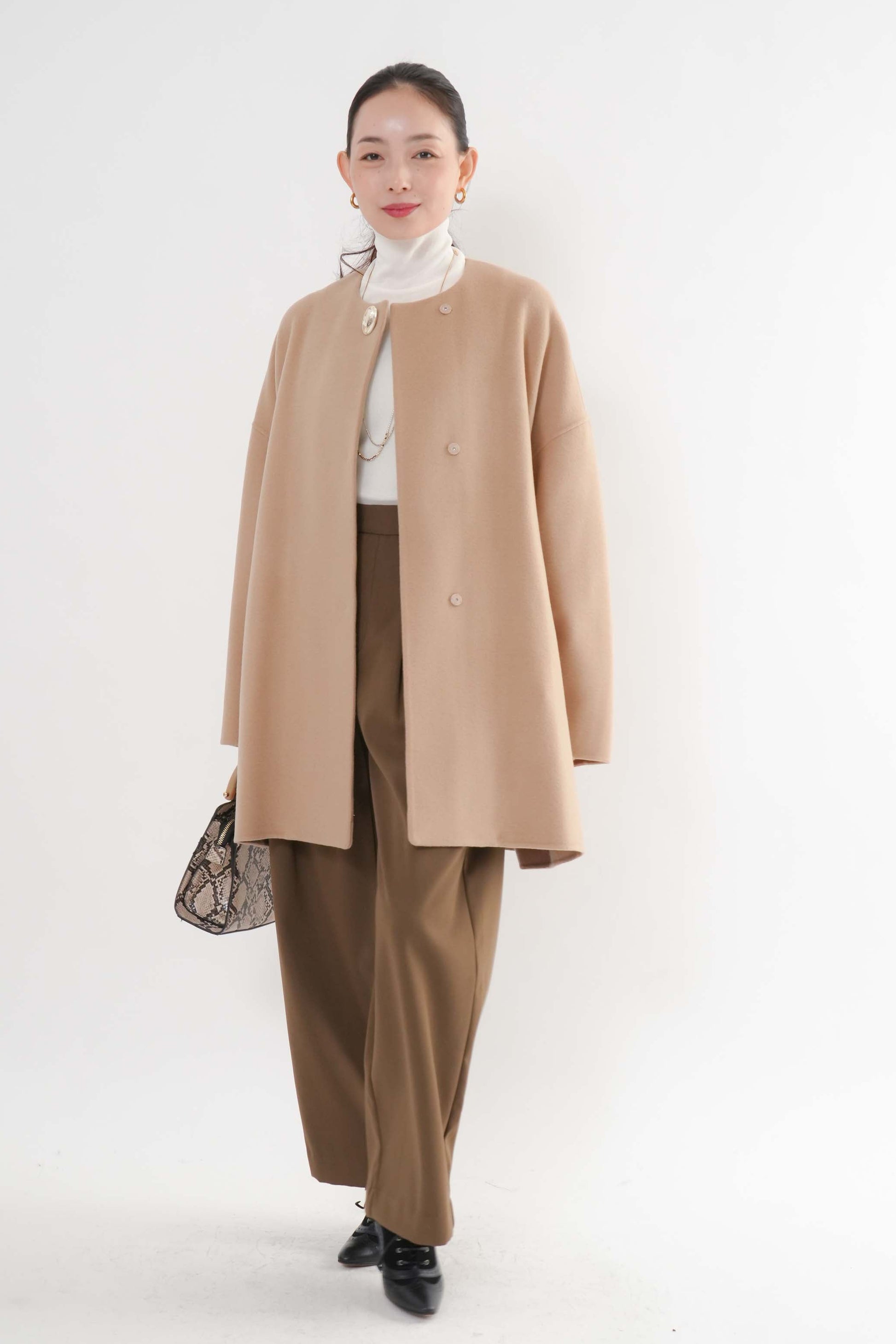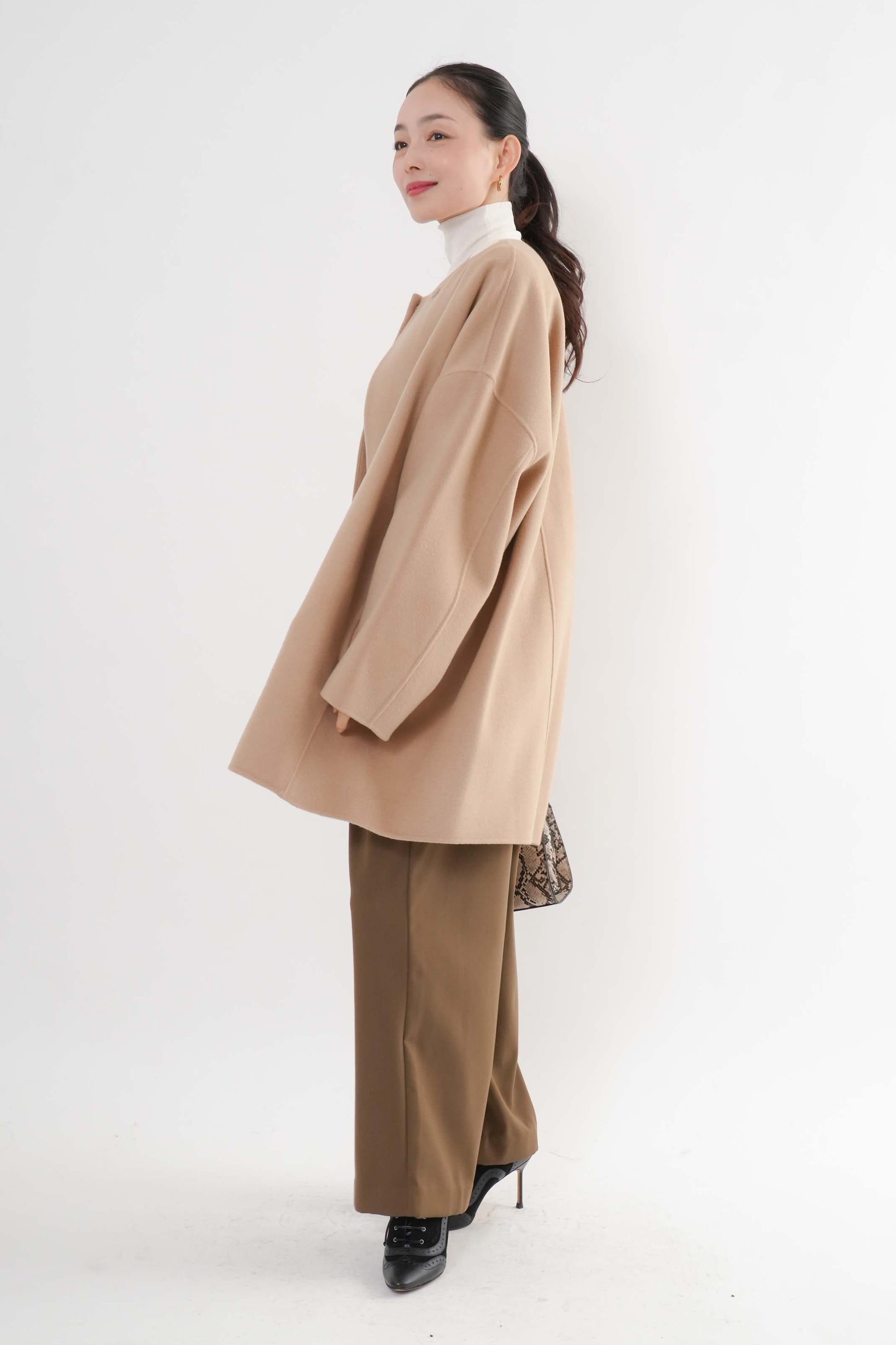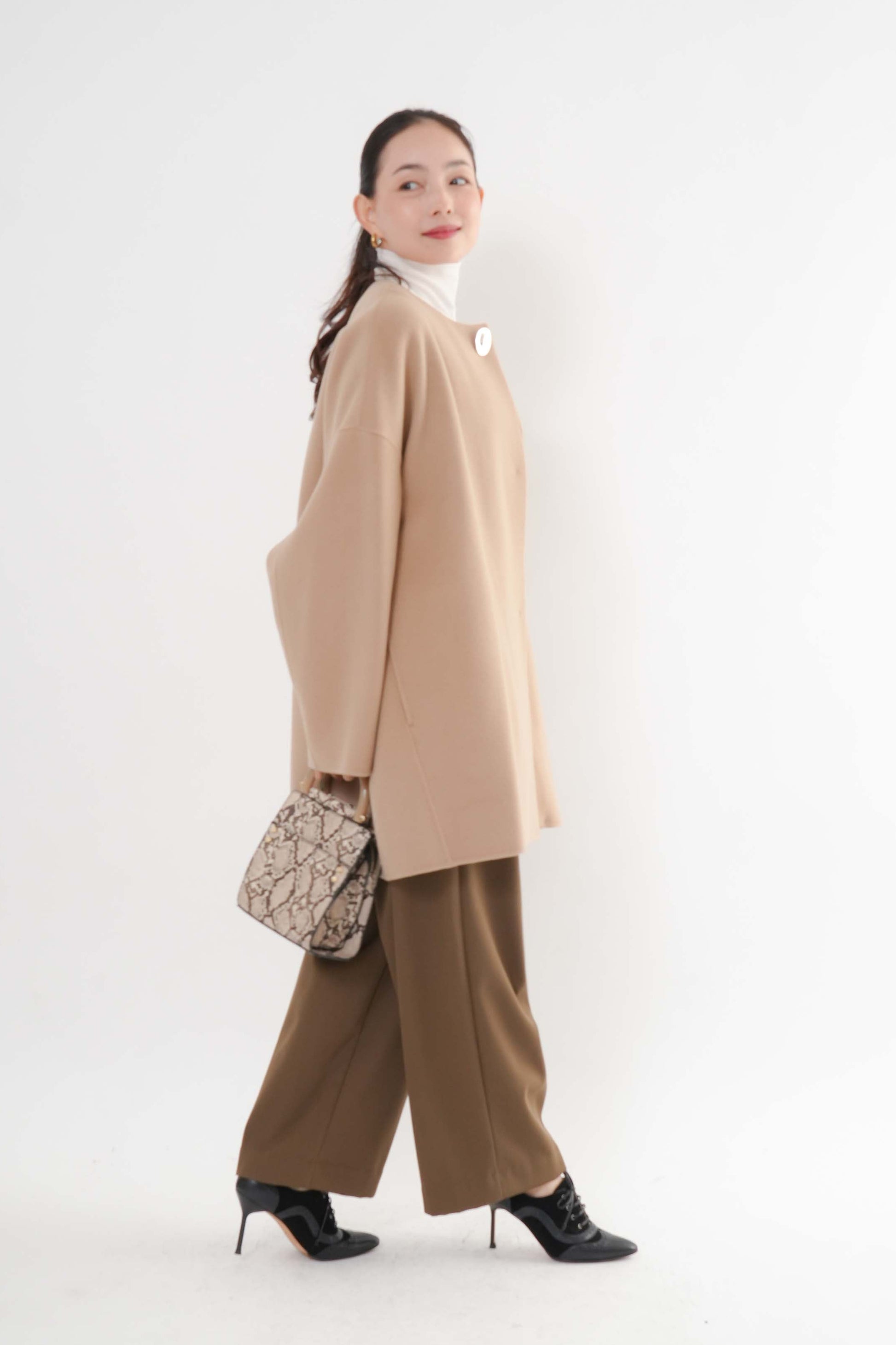 「羽織るだけで品格を纏う、大人のためのノーカラービッグシルエットコート」