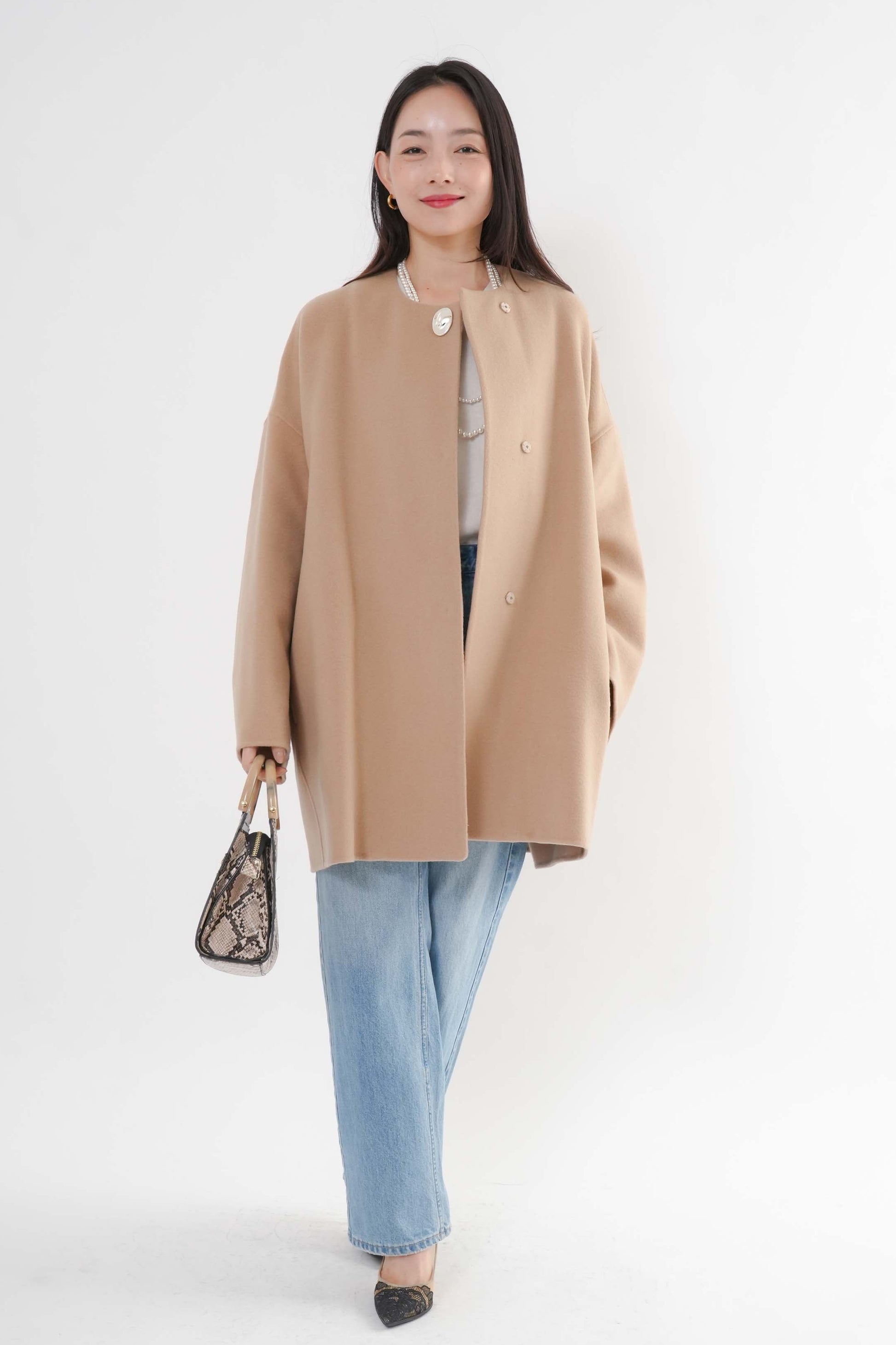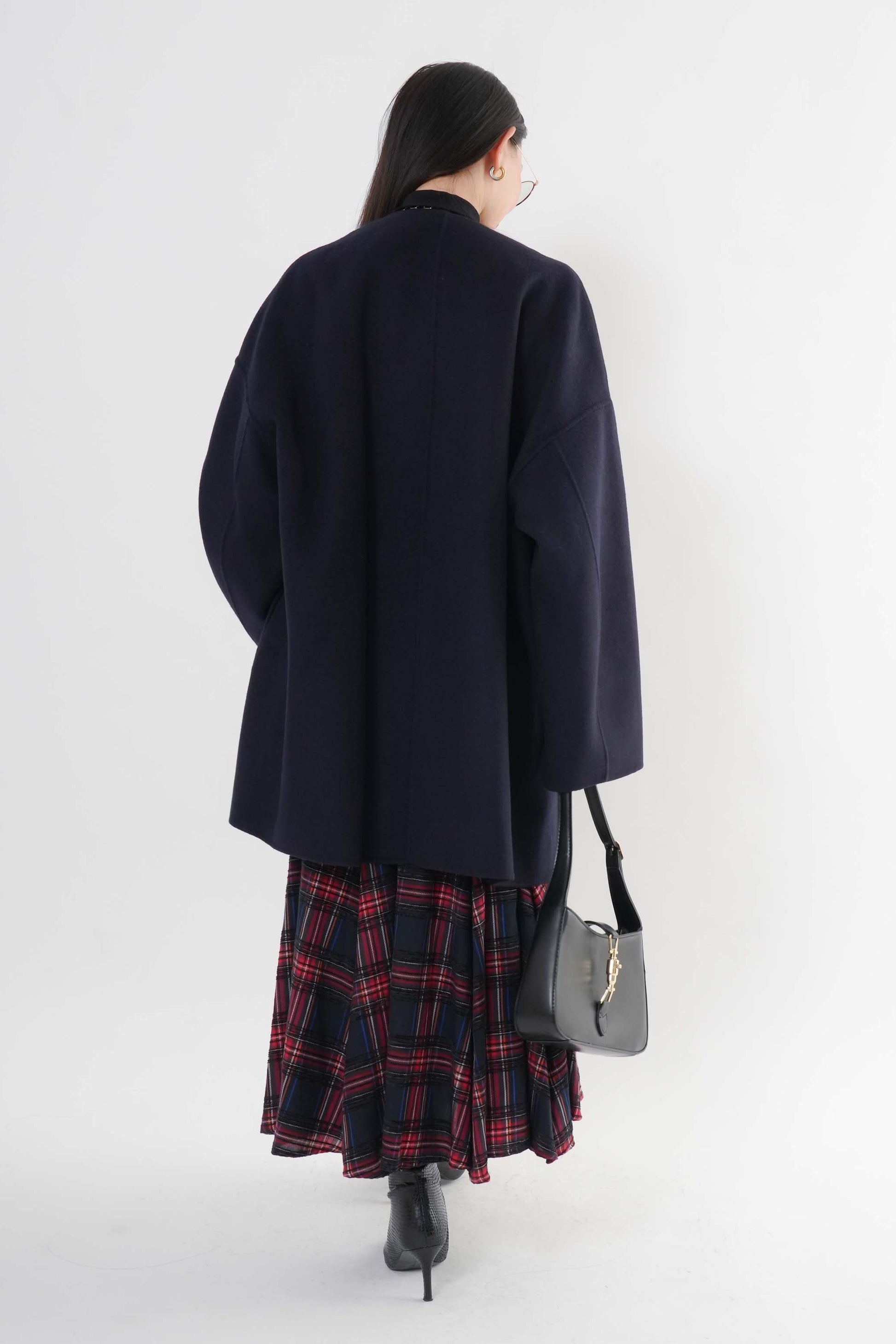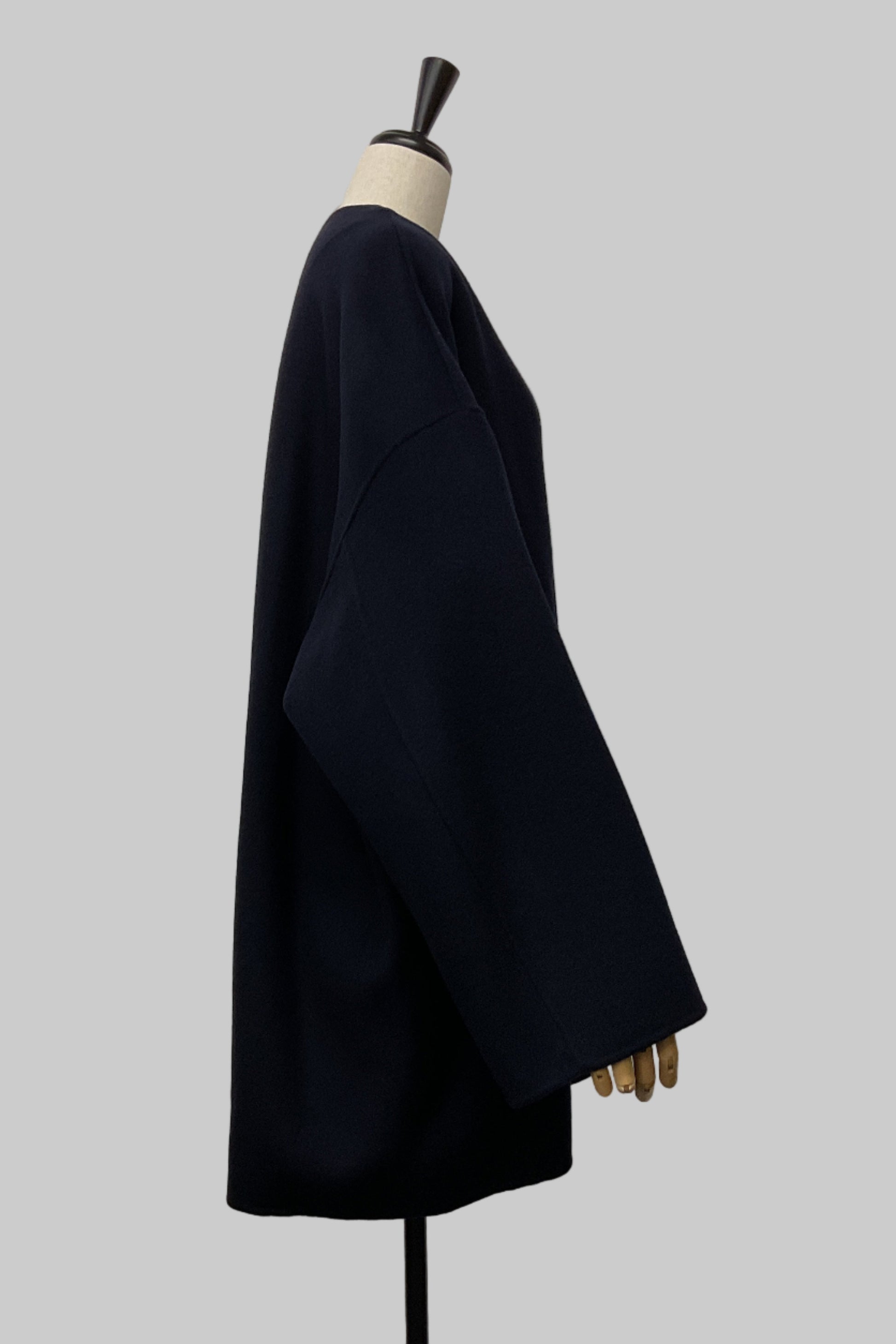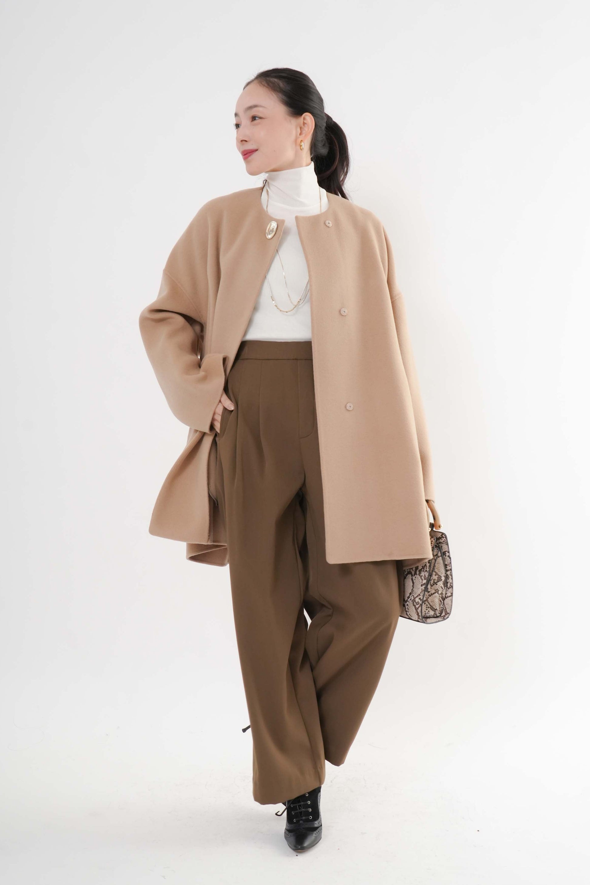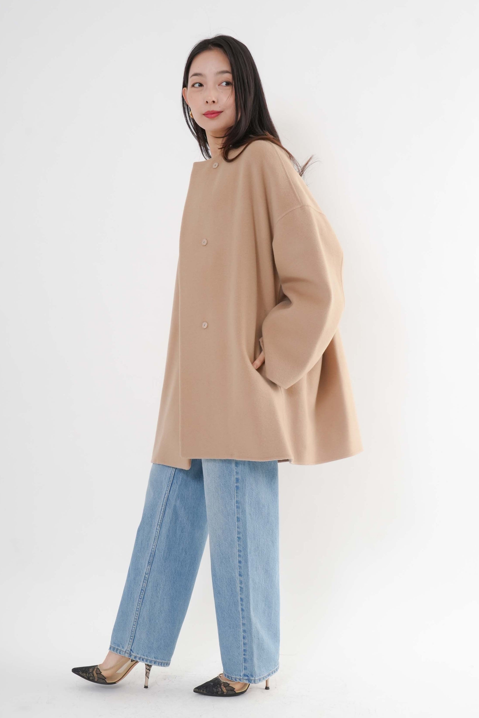 「羽織るだけで品格を纏う、大人のためのノーカラービッグシルエットコート」