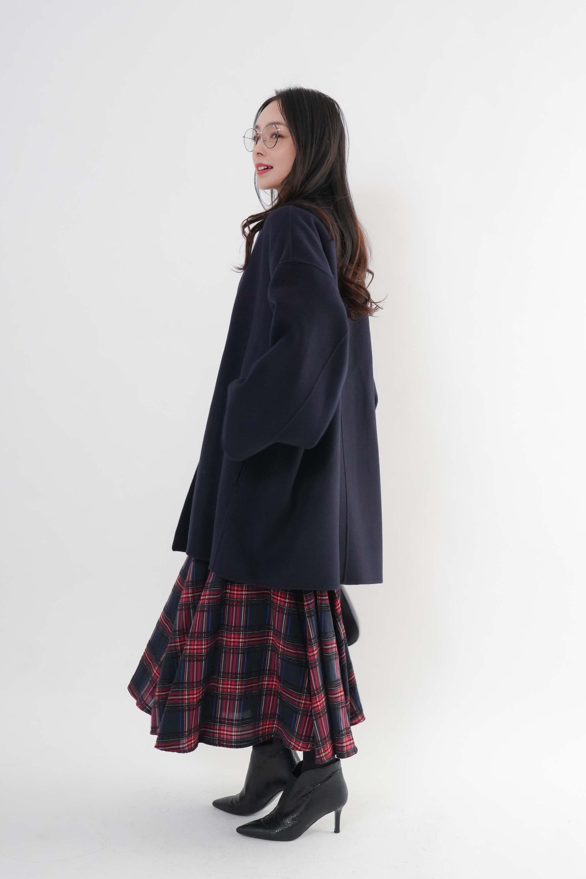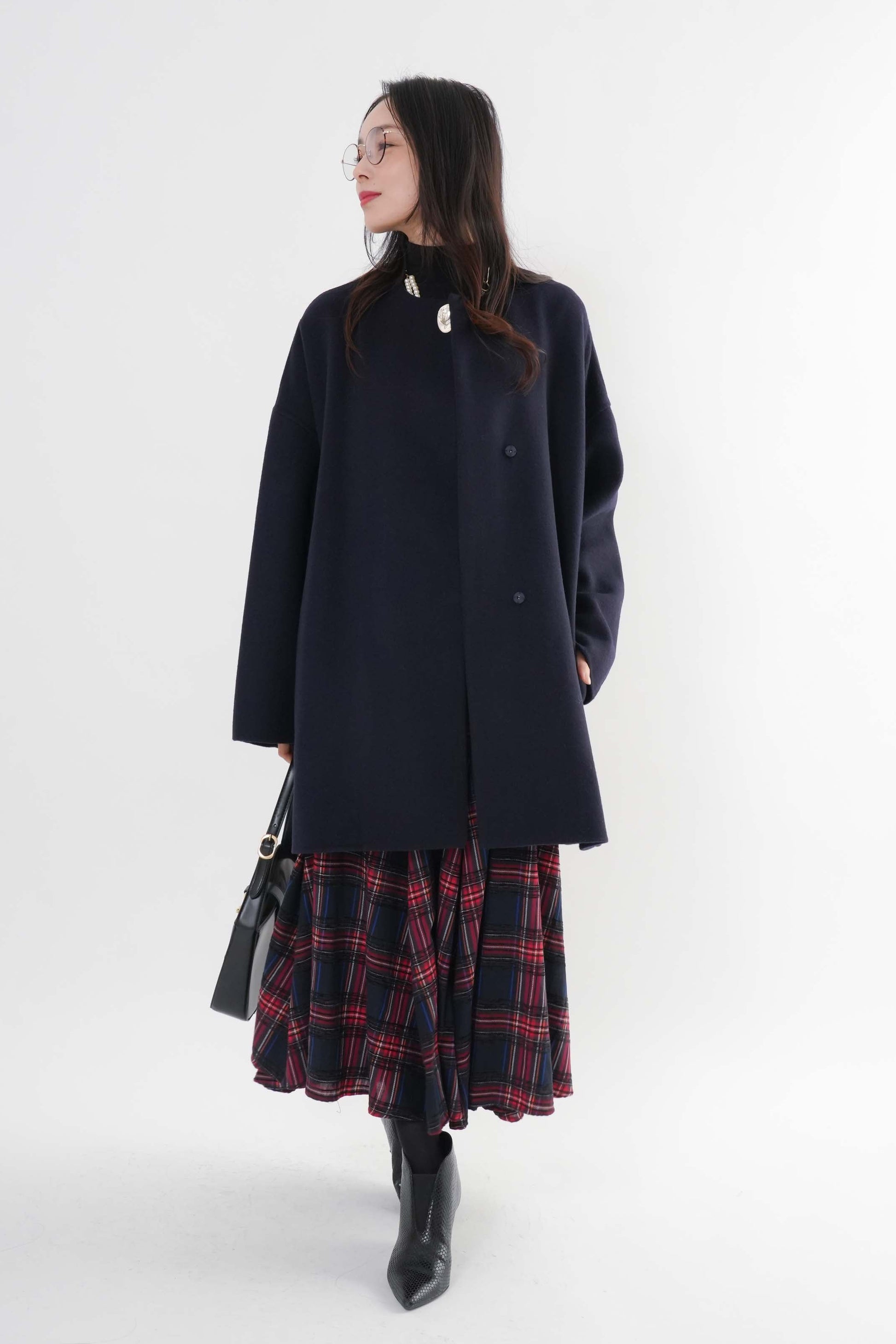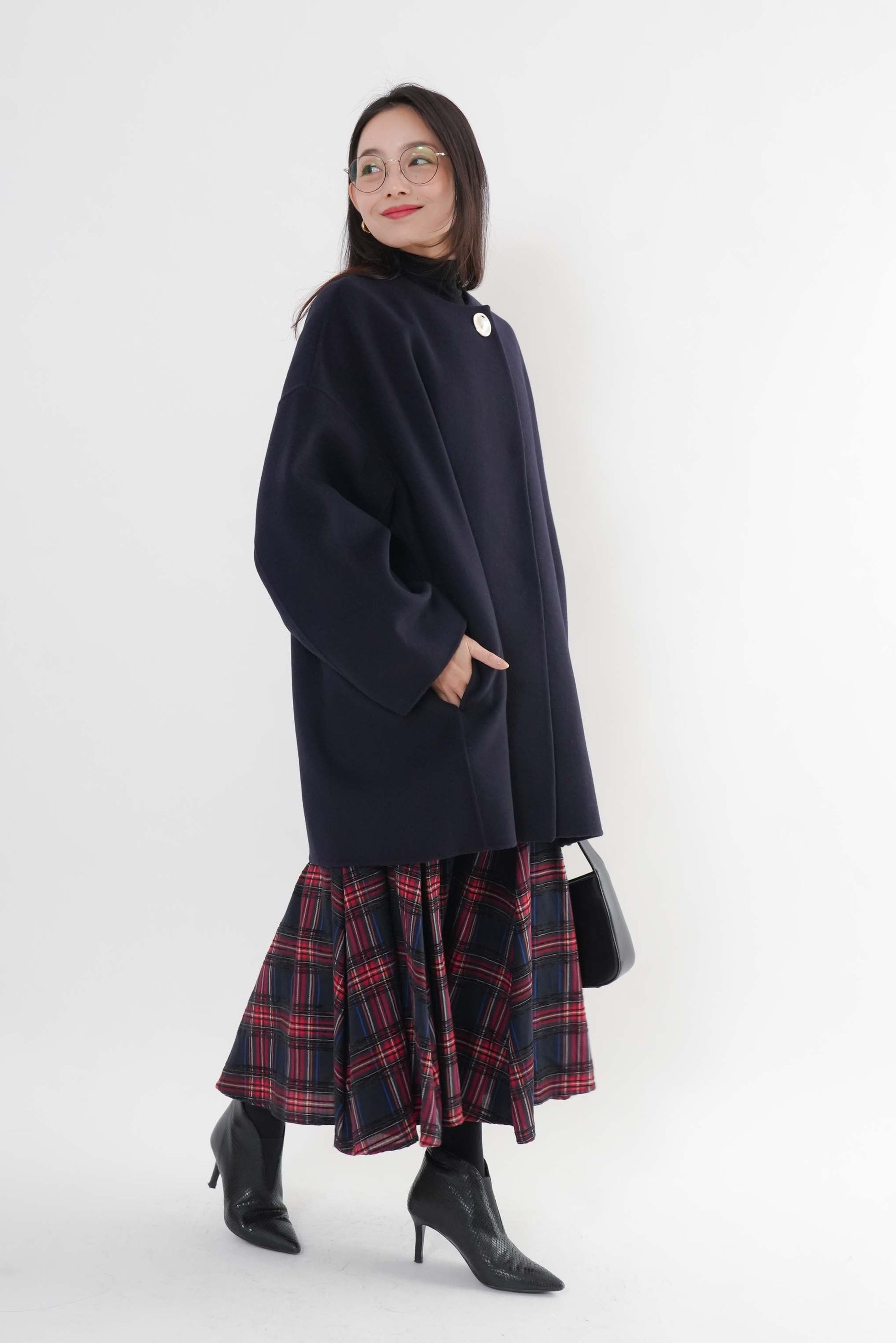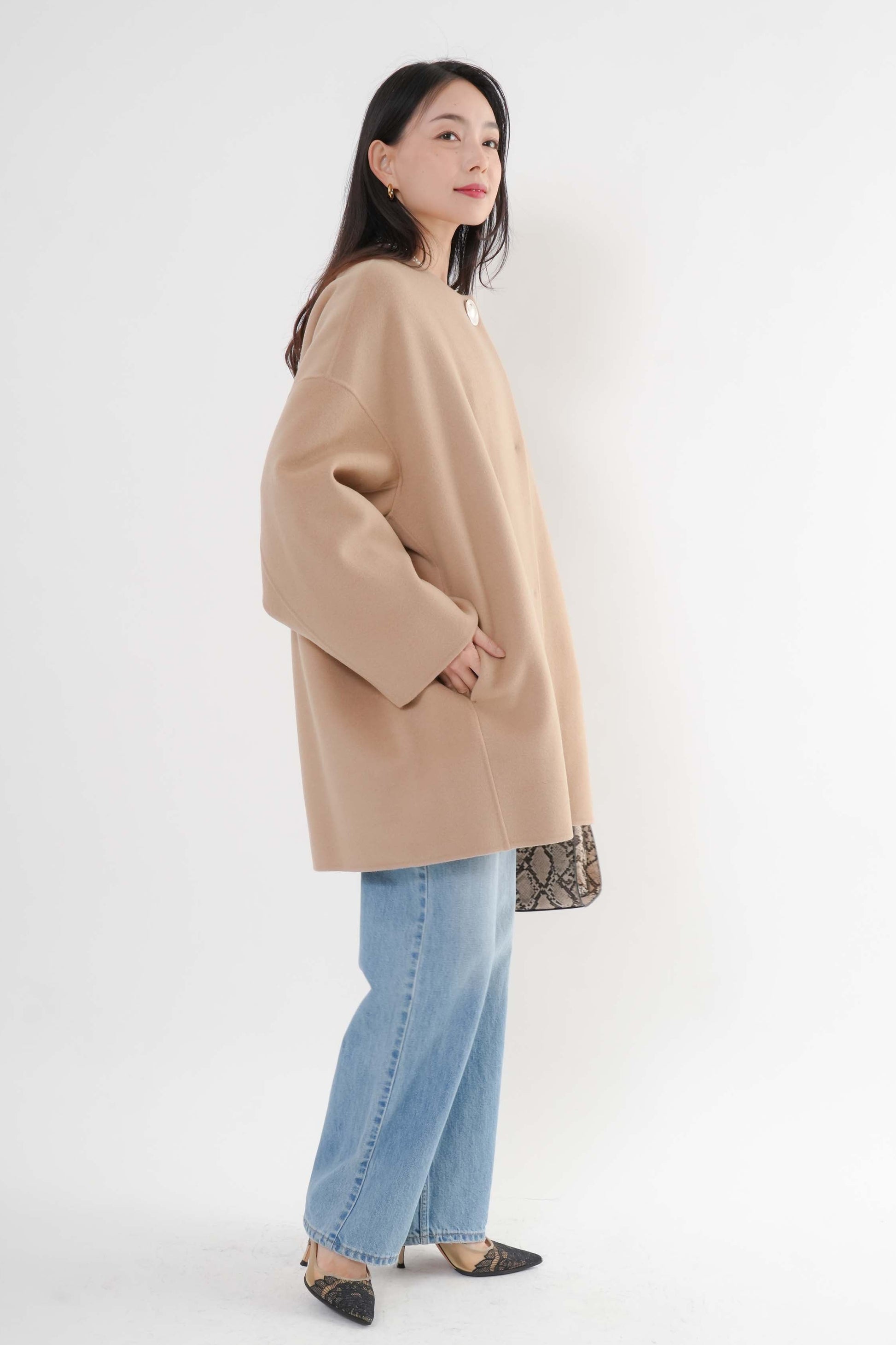「羽織るだけで品格を纏う、大人のためのノーカラービッグシルエットコート」