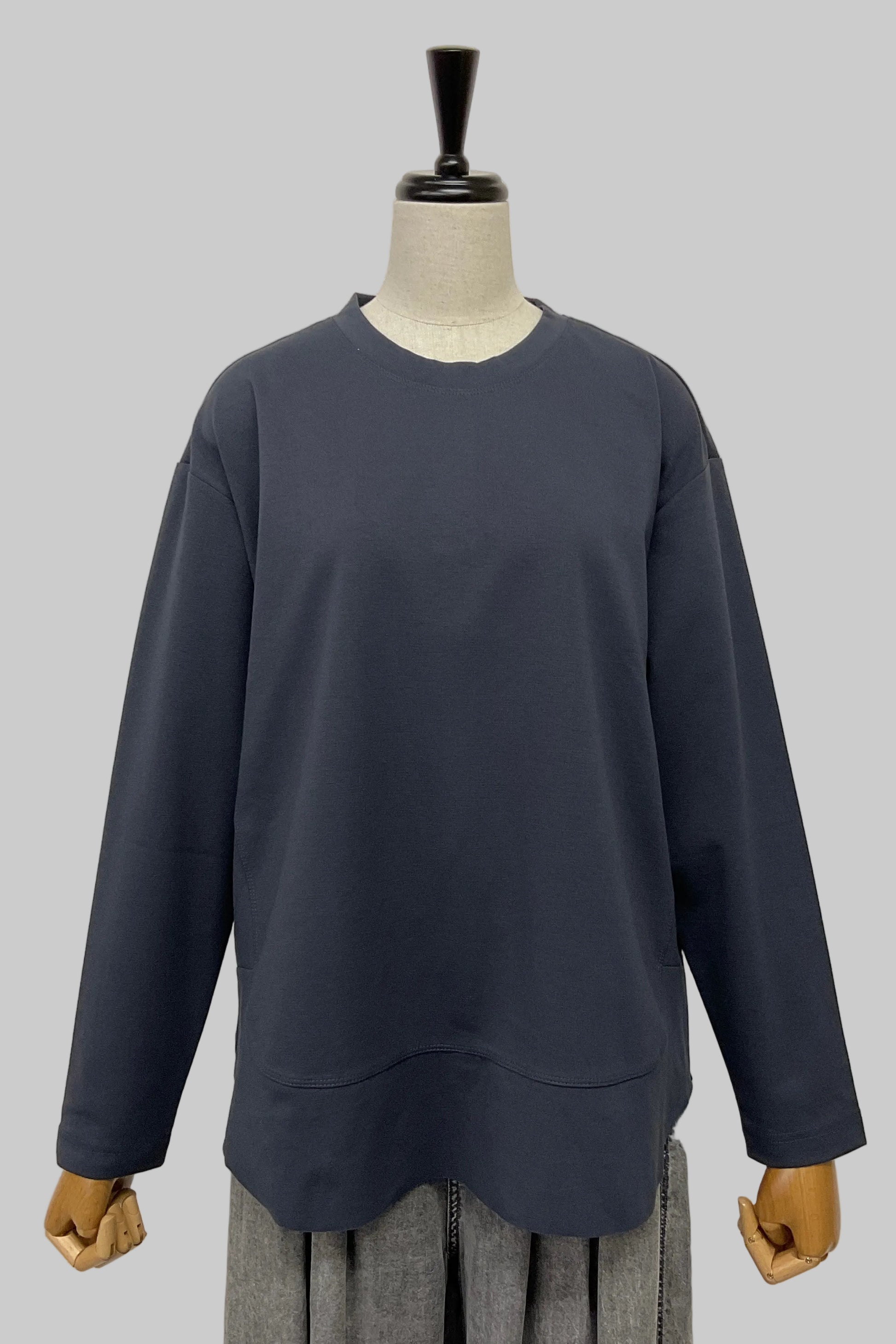 ドロップショルダーから続くお袖は、ほどよくゆとりを持たせつつ、袖先に向かって少しずつ細くなるラインですっきり見えを実現。