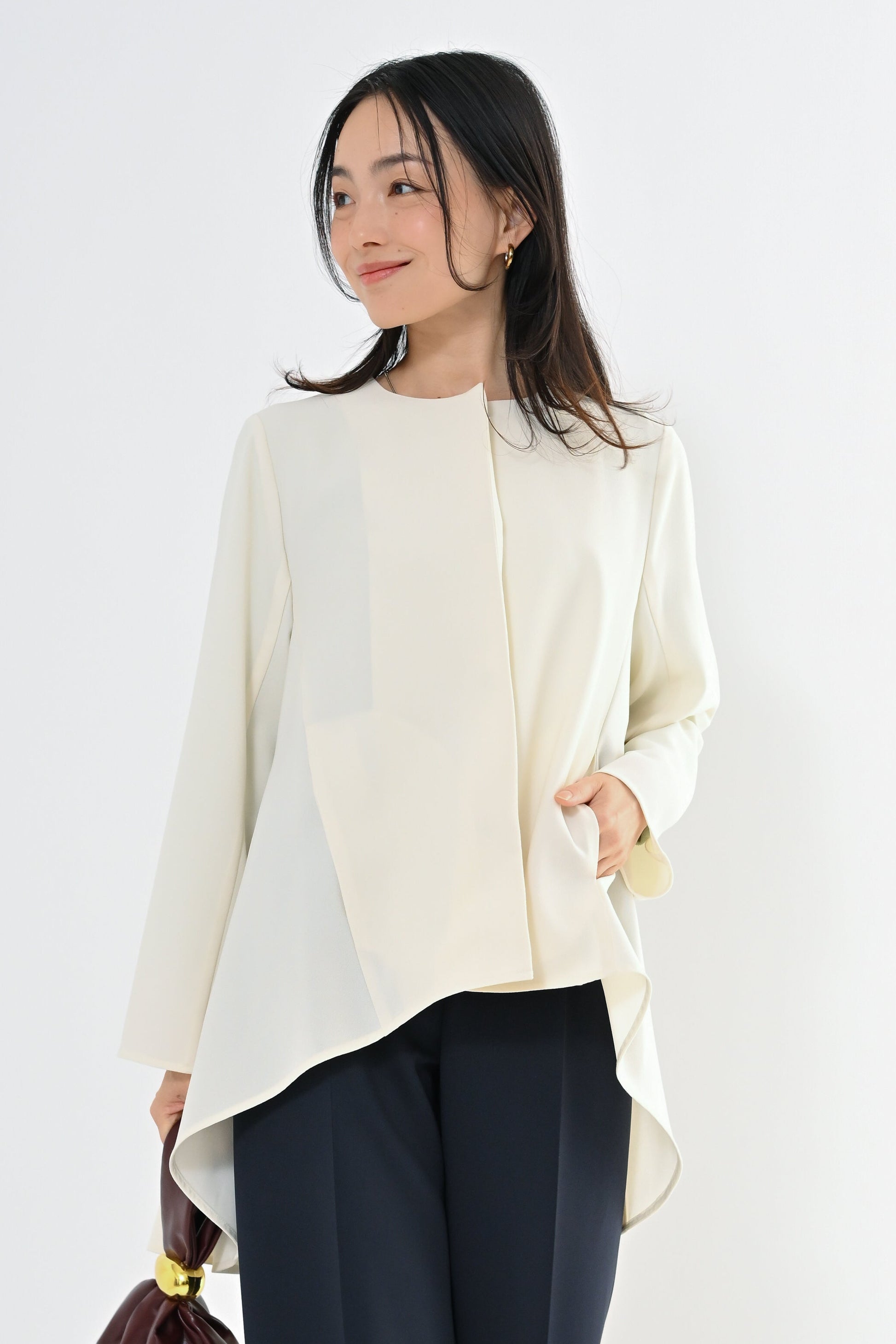 ・前を閉じればブラウス風、開ければ羽織として使える2WAY感覚・裾フレアデザインで体のラインをきれいに演出