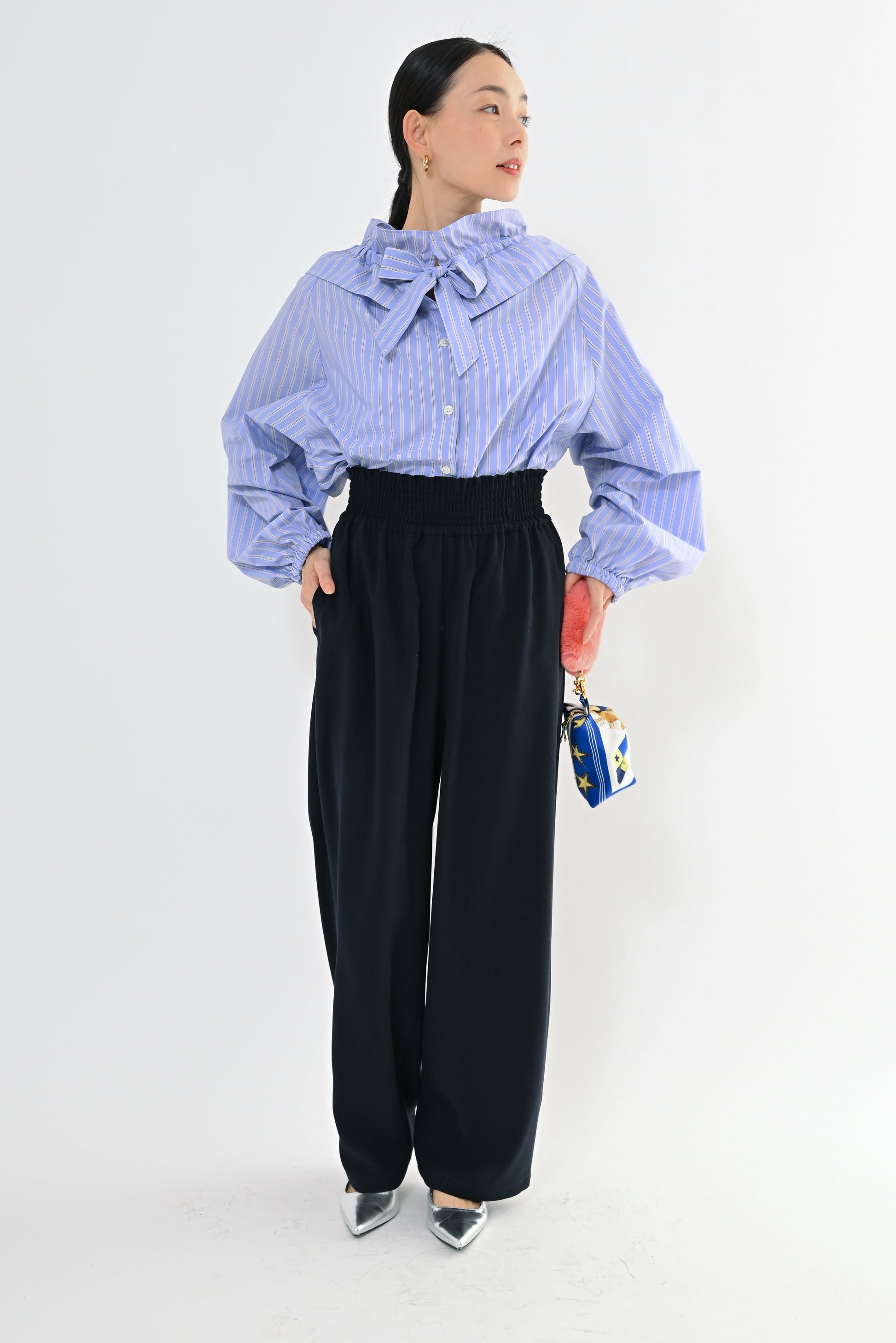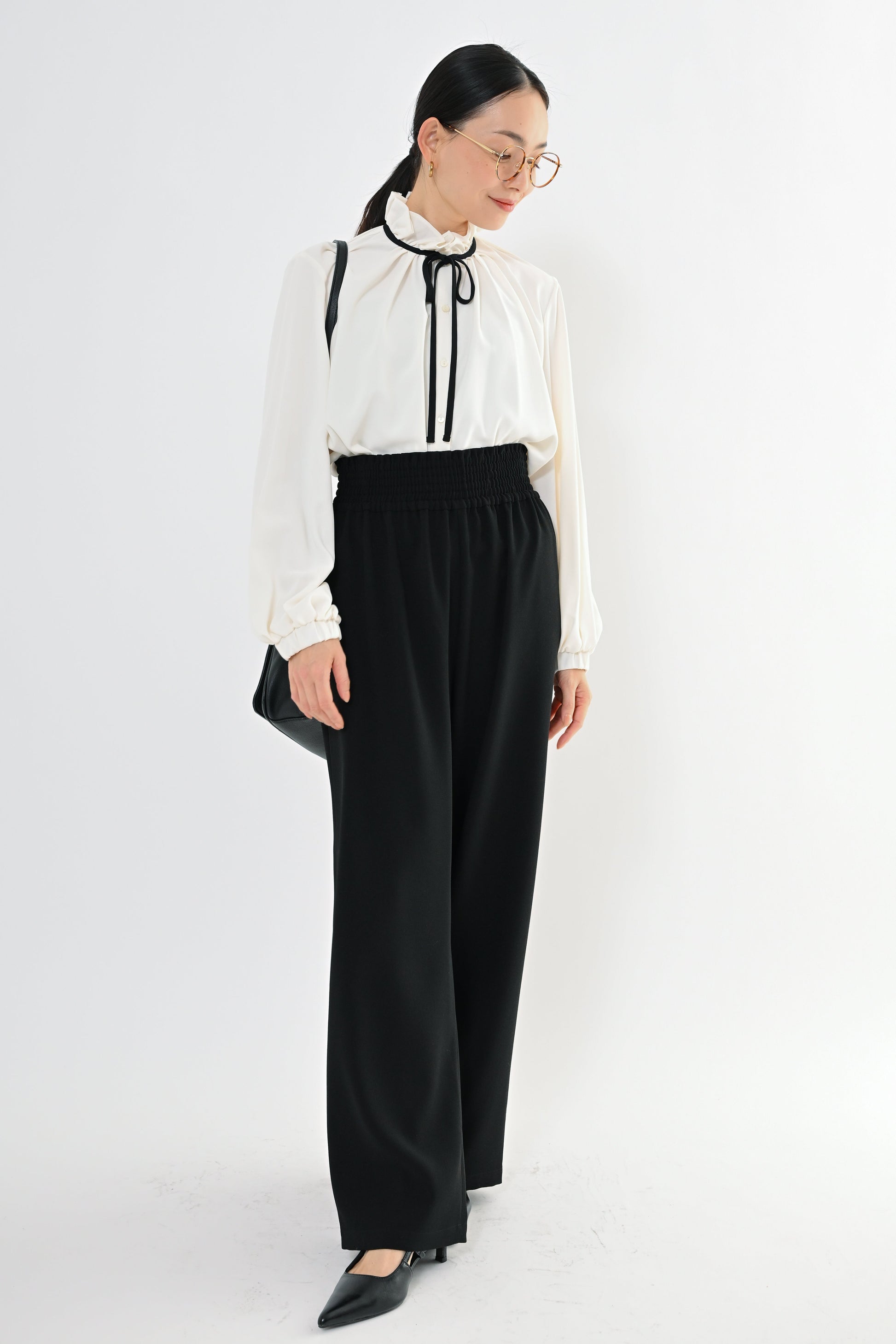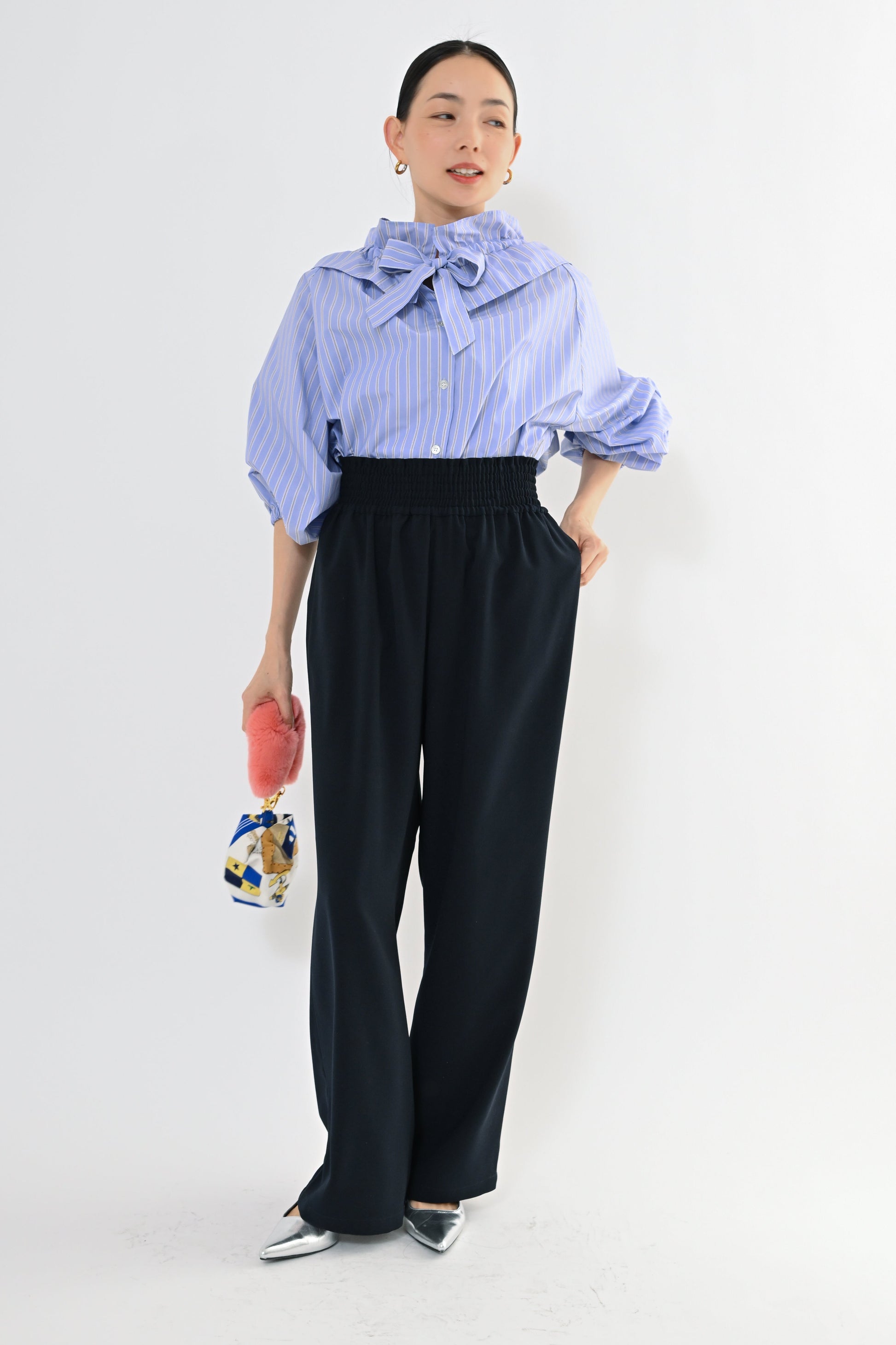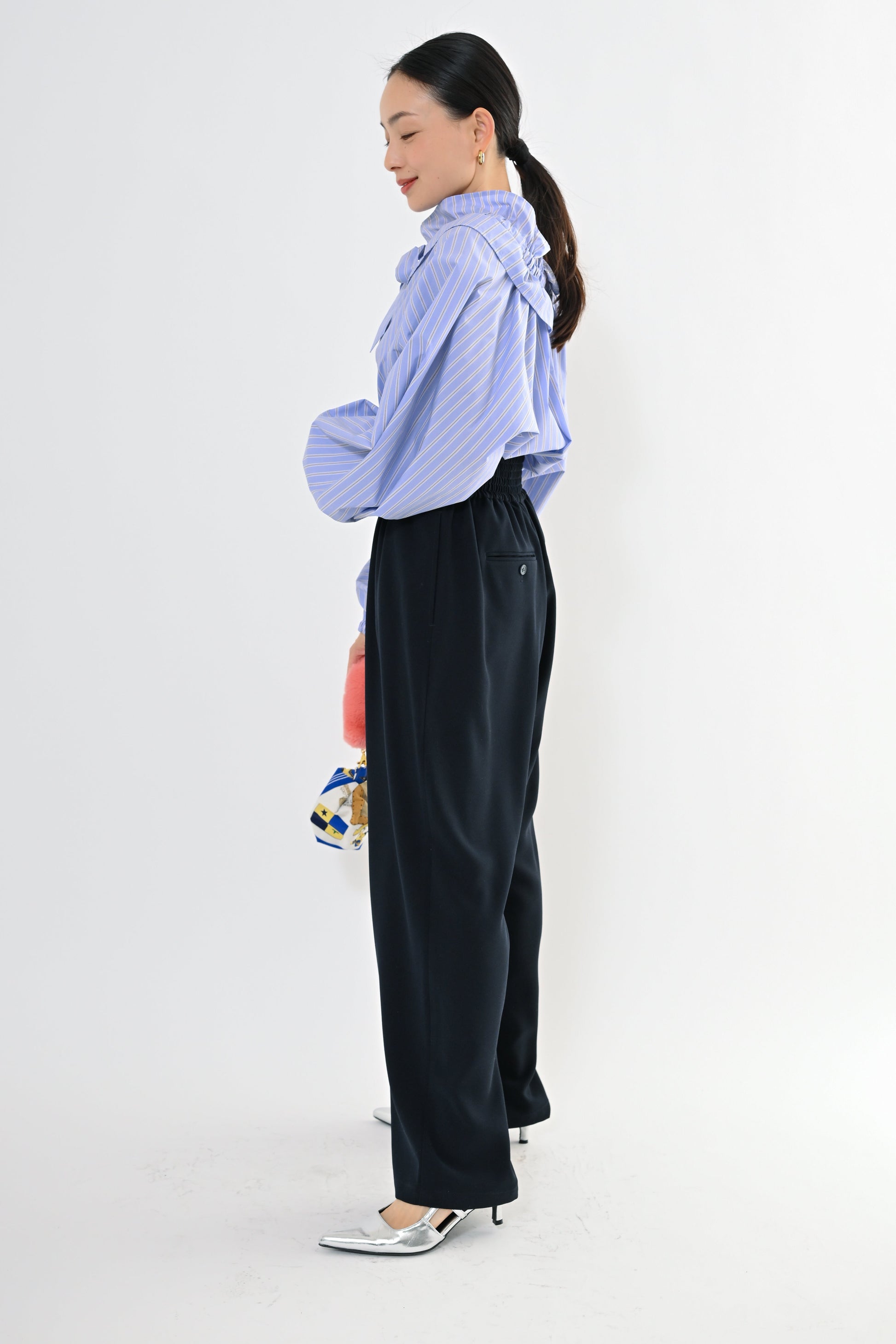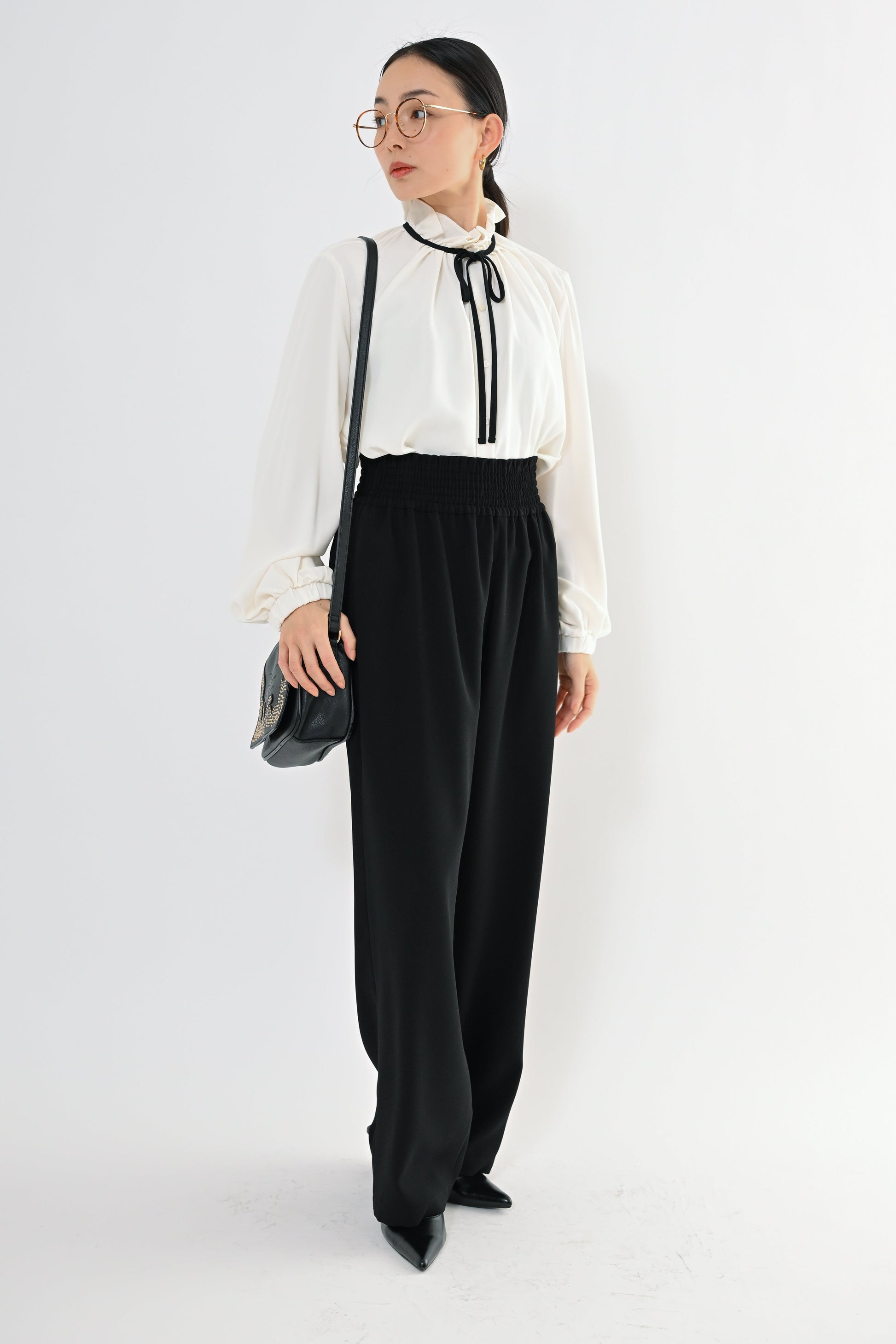 ウエストにシャーリングを施した、リラクシーな穿き心地が魅力のパンツ。