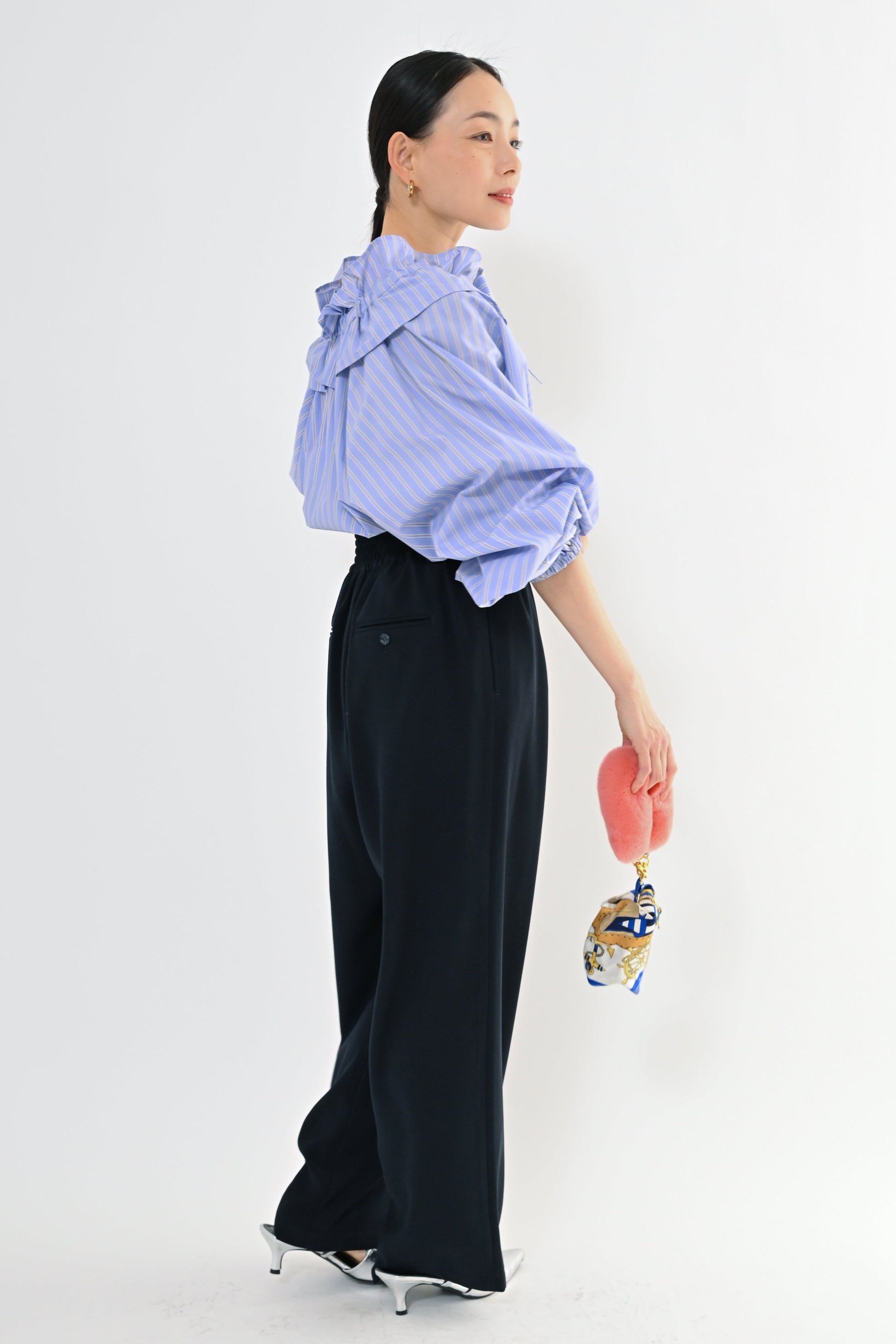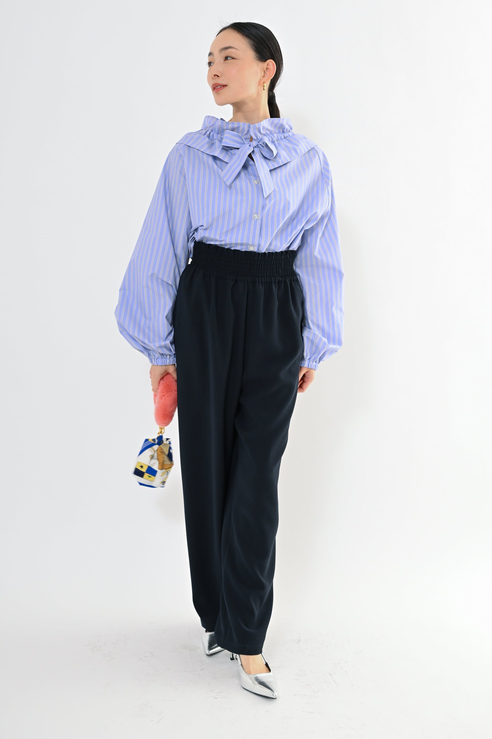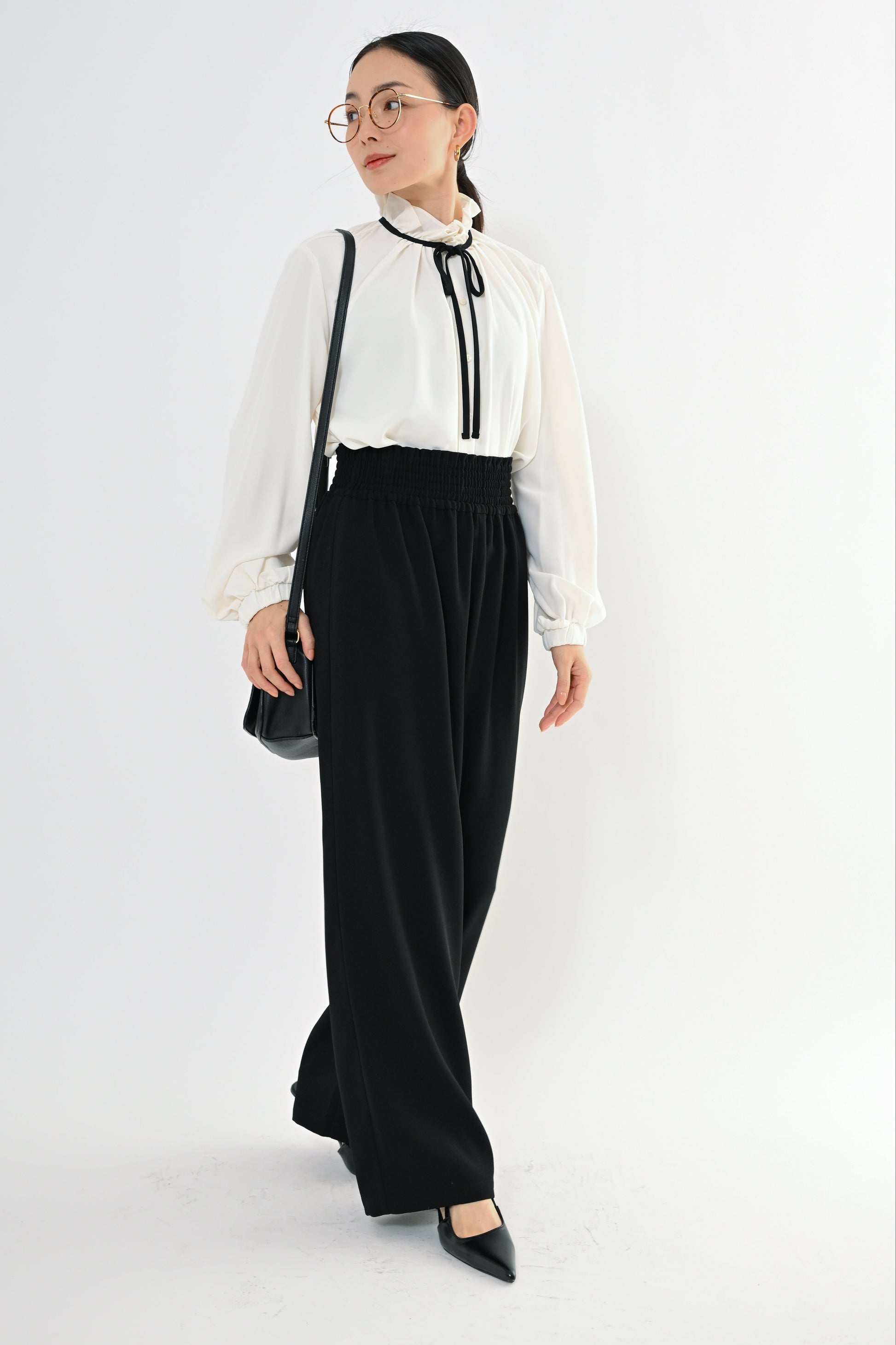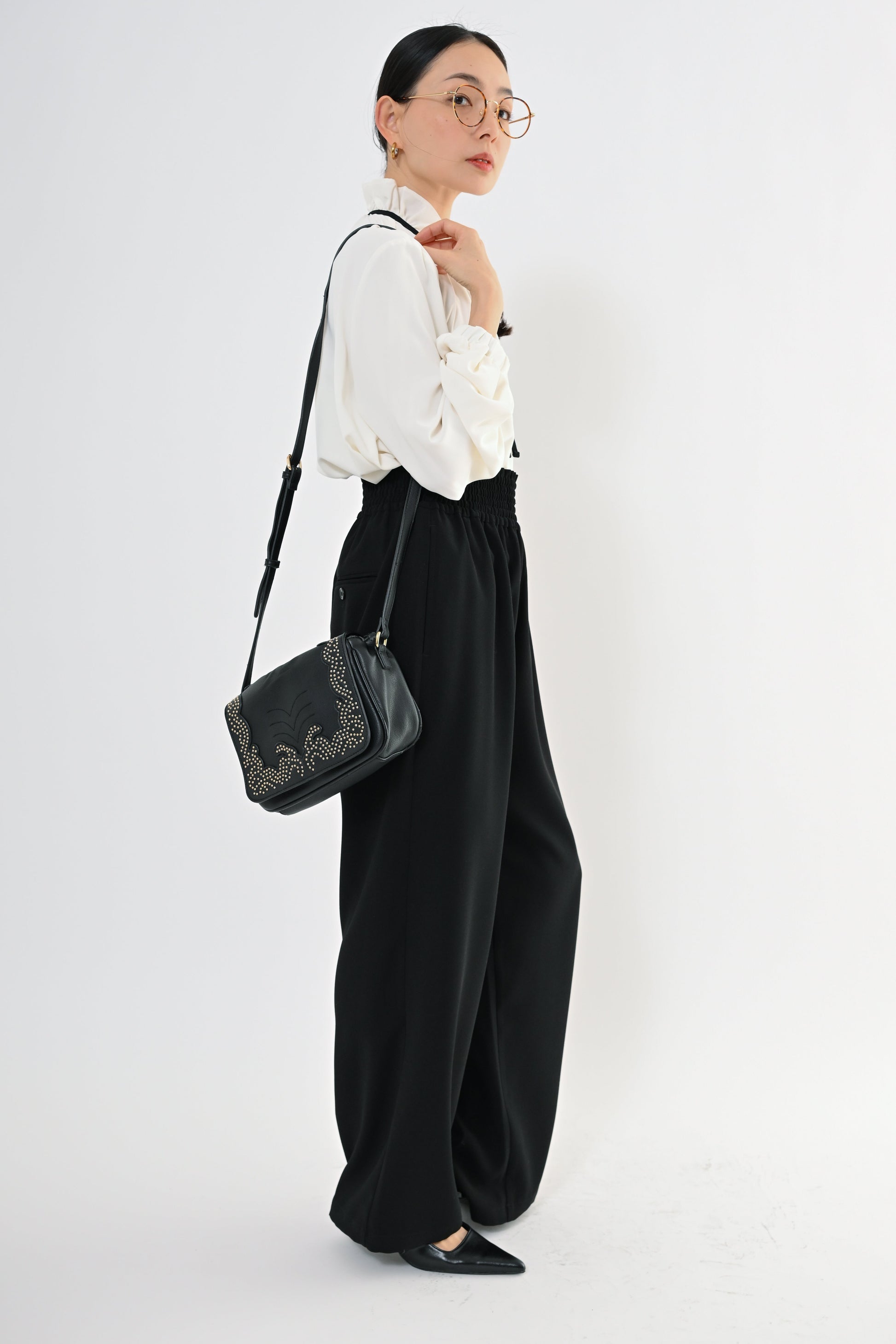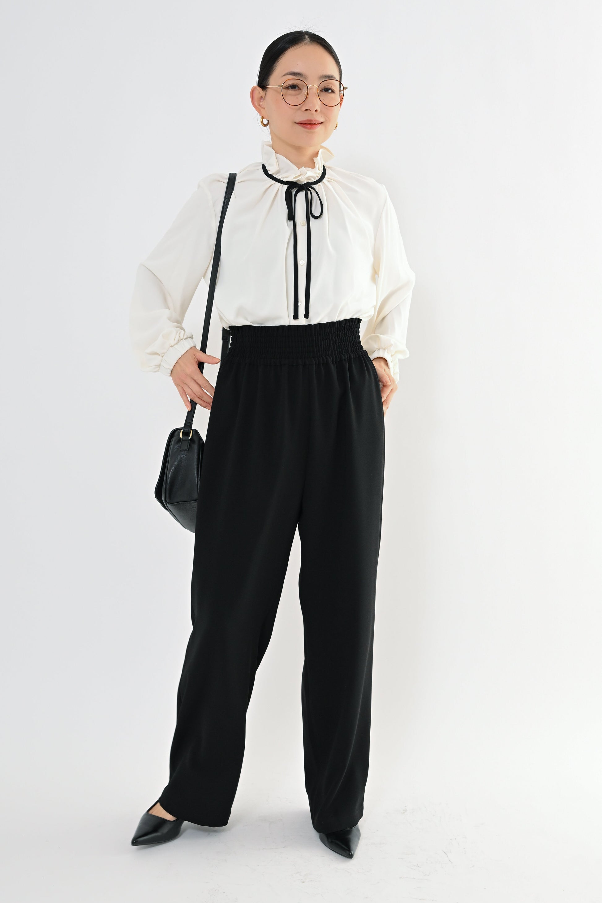 ウエストにシャーリングを施した、リラクシーな穿き心地が魅力のパンツ。