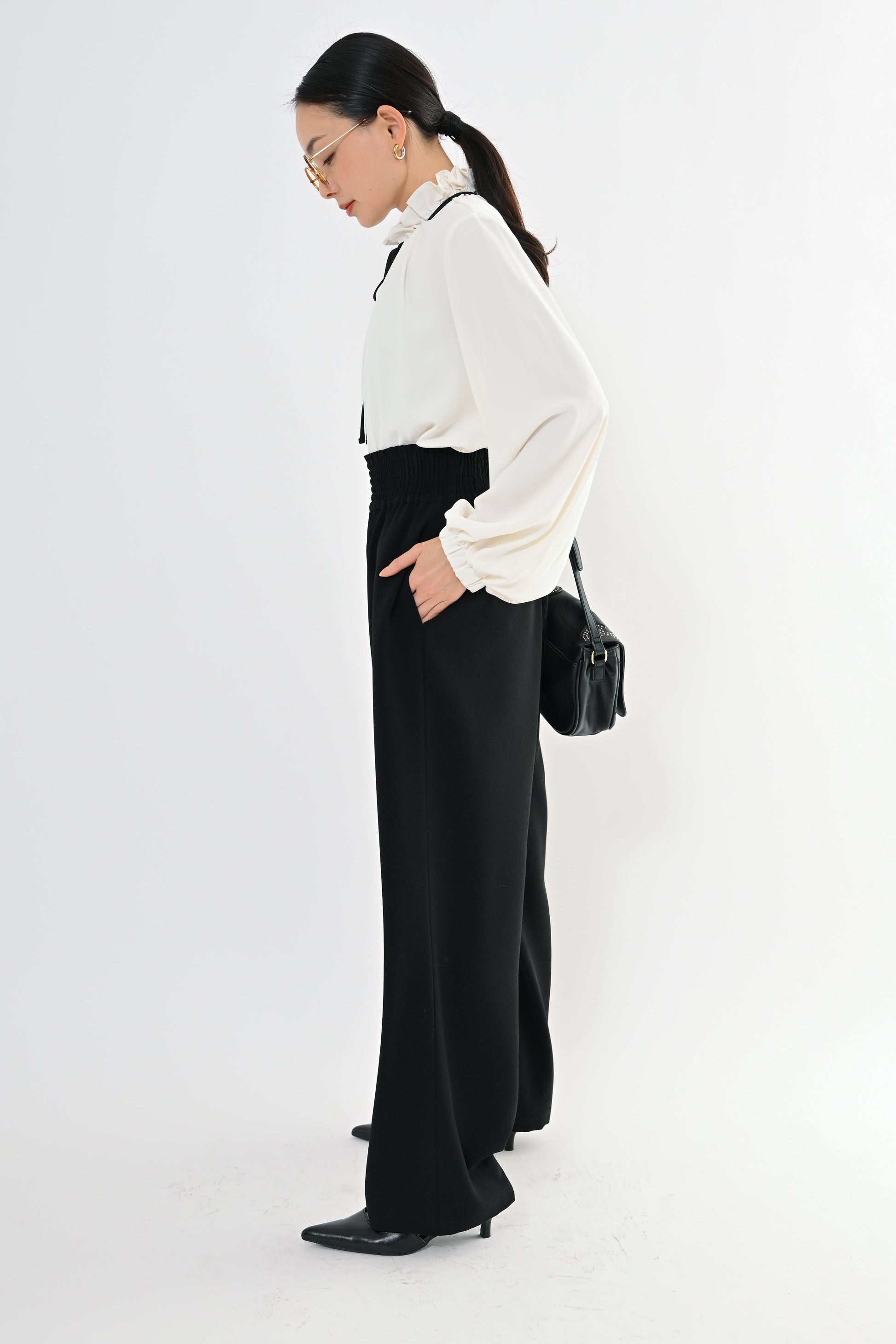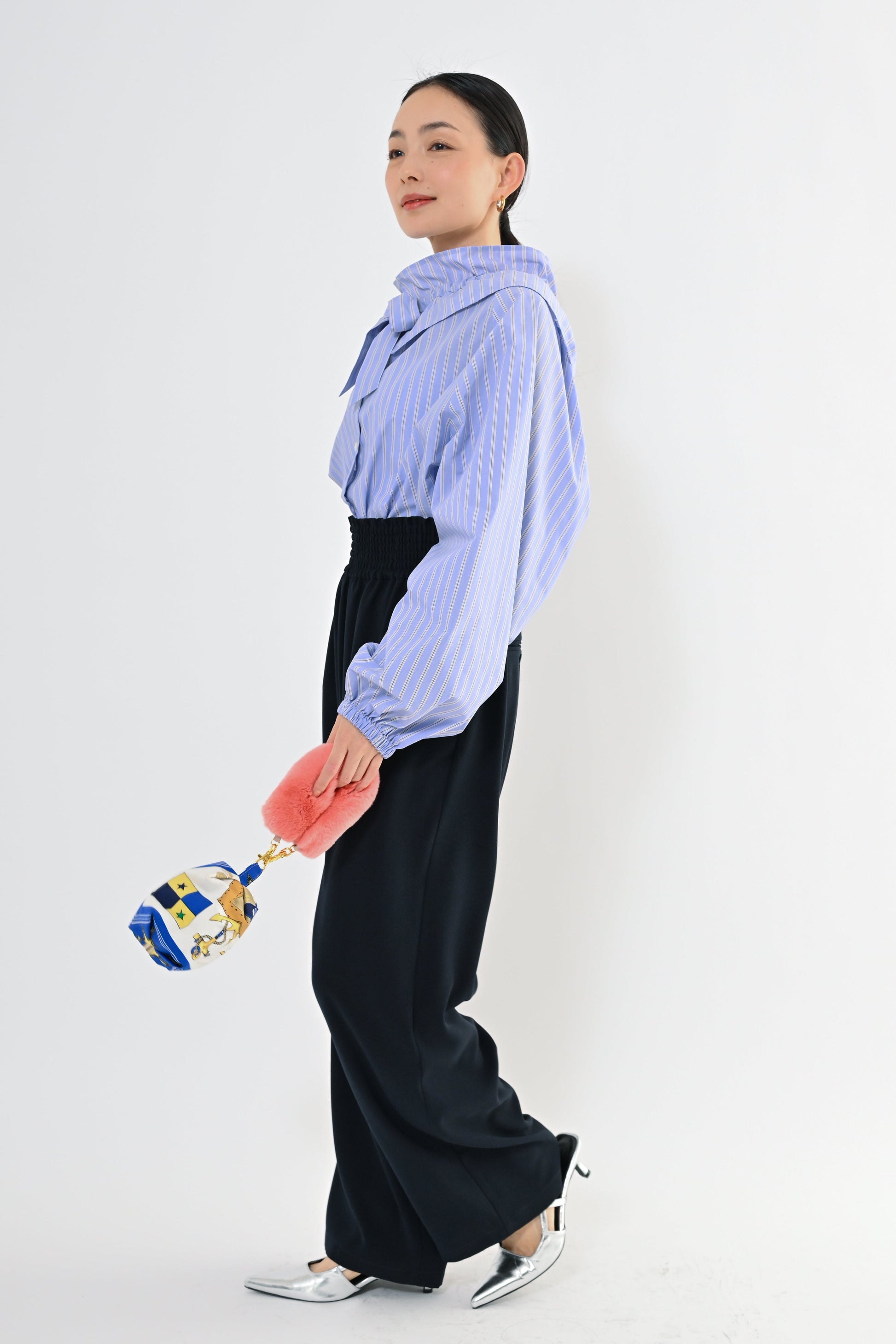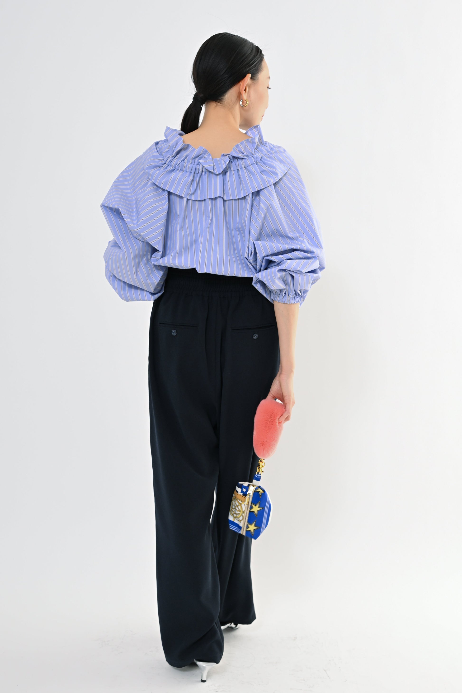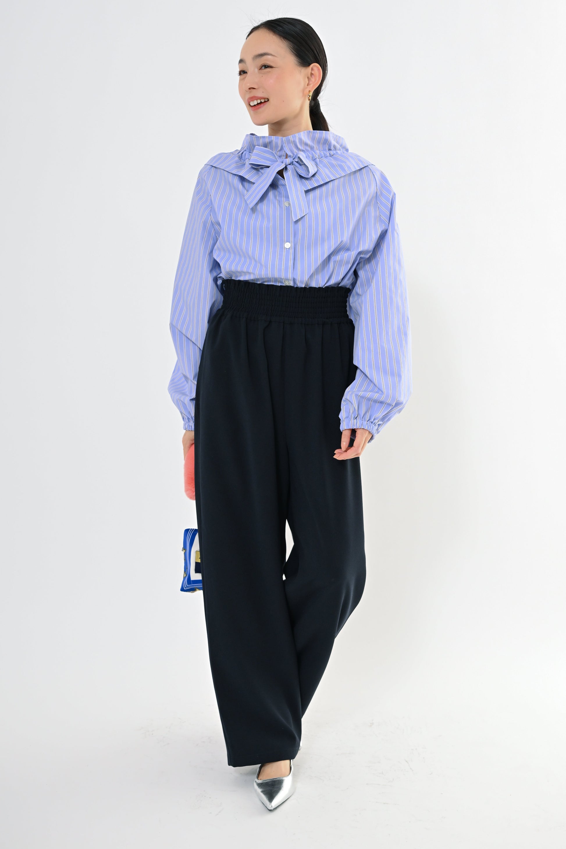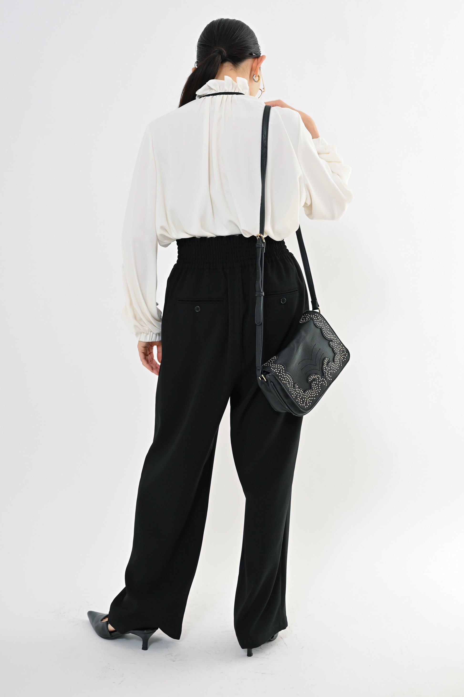 ウエストにシャーリングを施した、リラクシーな穿き心地が魅力のパンツ。