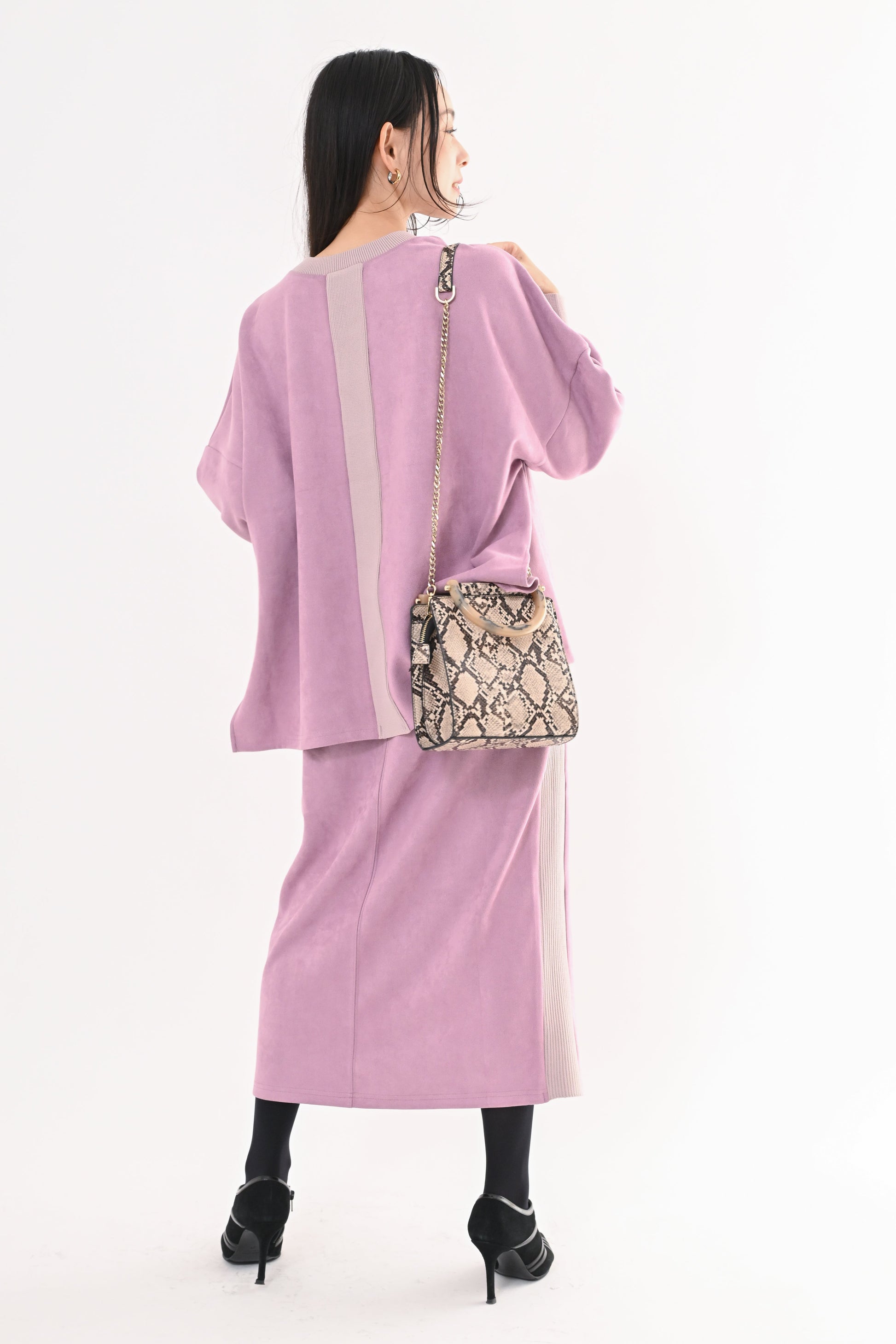 ほんのり起毛感のあるスエード調素材を使用したプルオーバー。シンプルながらも、背中に施されたリブの縦ラインがさりげないアクセントに。カジュアルにもきれいめにも馴染む万能な1枚です。同素材のタイトスカートとセットアップでの着こなしもおすすめ。
