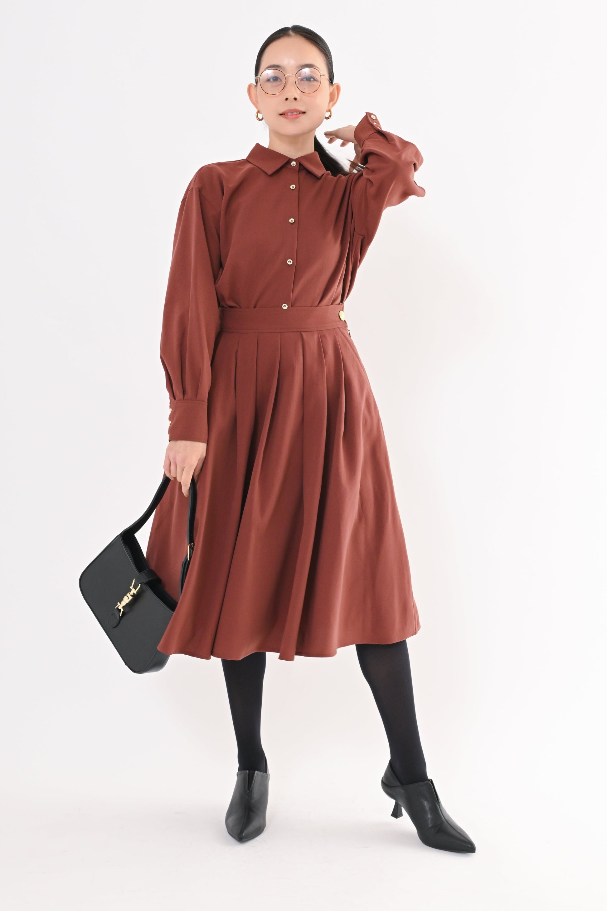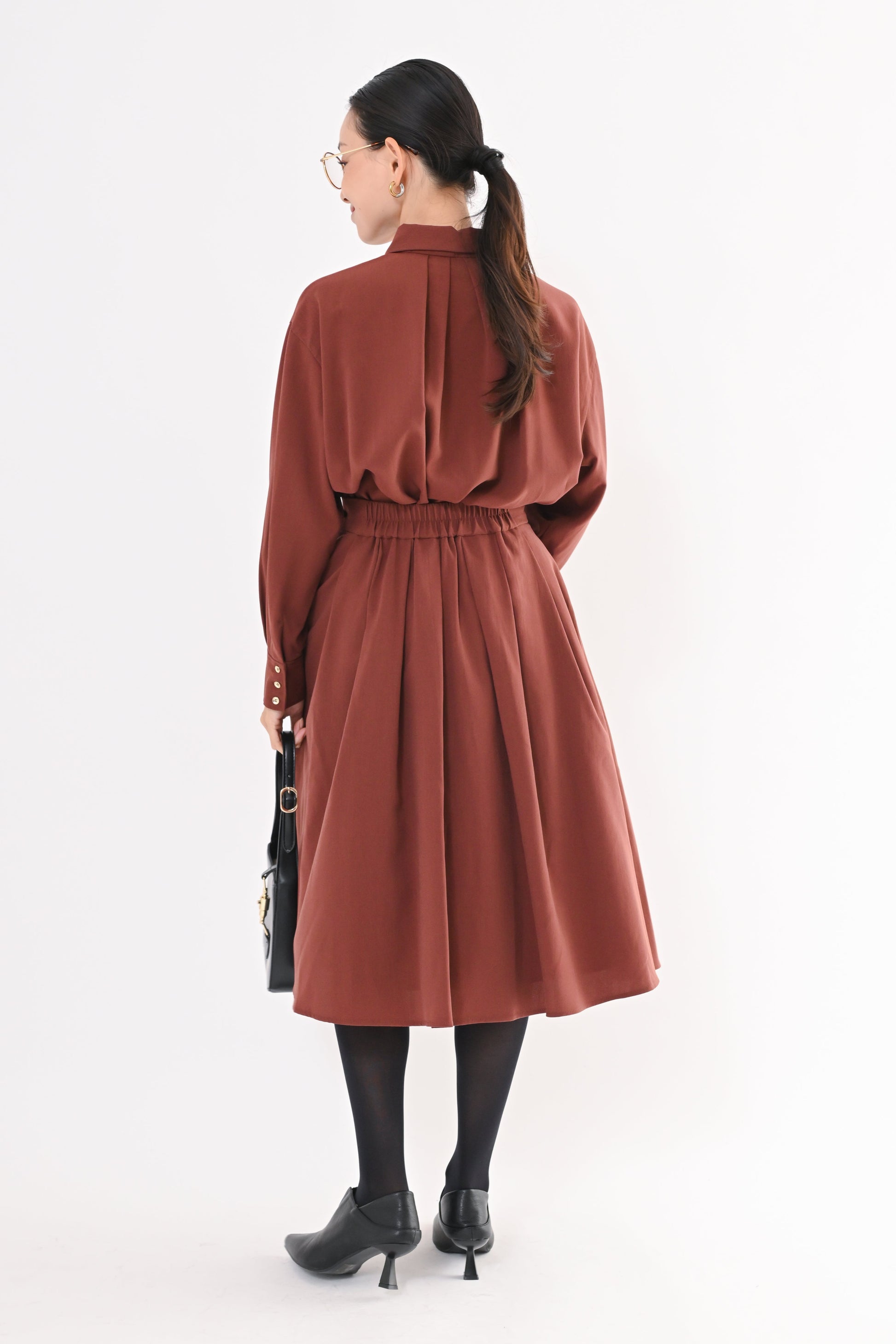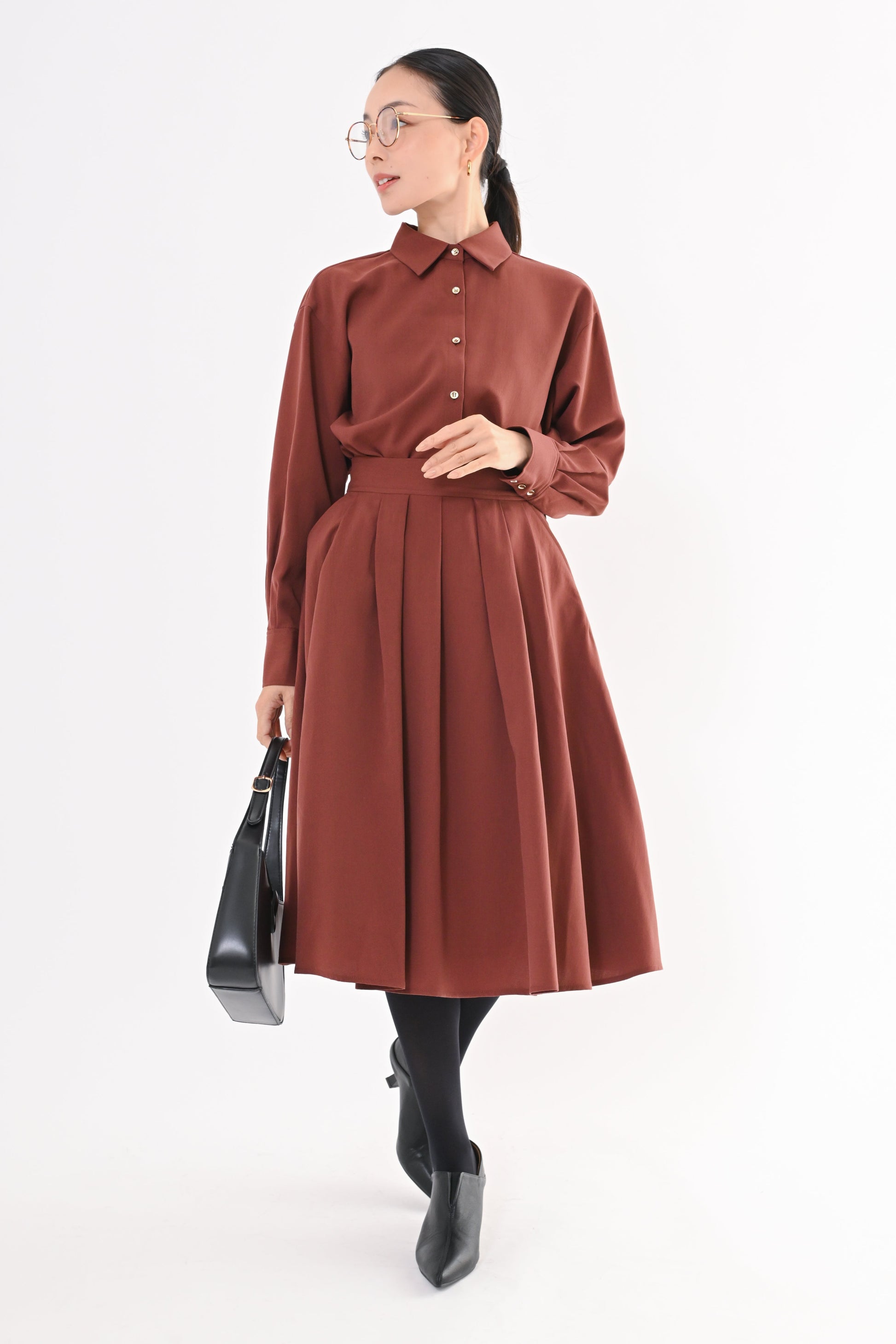 ウエストに施したタックが立体感を生み、シンプルながらも上品な表情を演出します。長すぎない程よい丈感でデイリーからオフィスまで幅広く活躍。トップスを選ばず合わせやすく、同素材のシャツとセットアップでの着こなしもおすすめです。