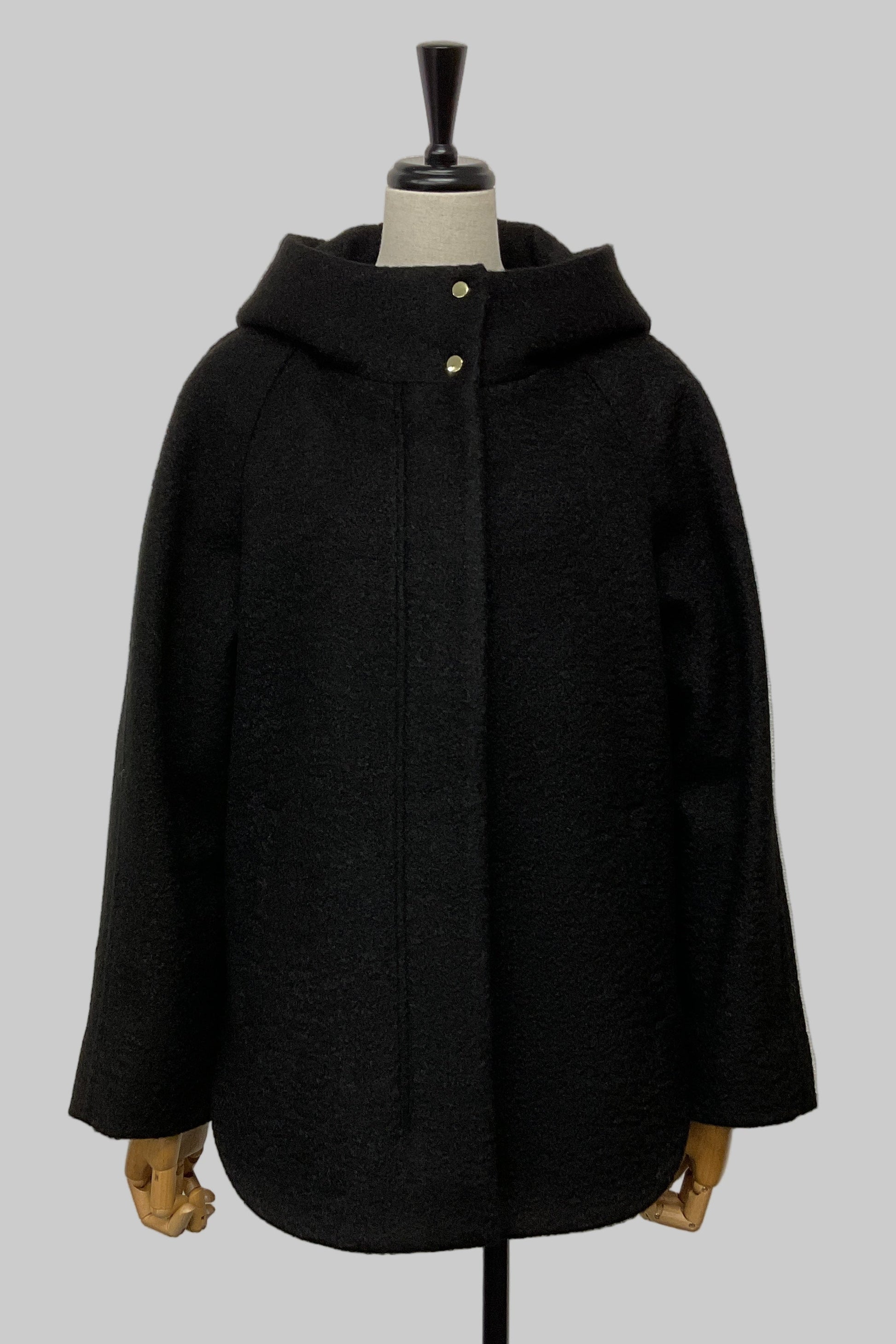 ふんわりとした表面感が上品な印象を与える、ショート丈のフードコート。