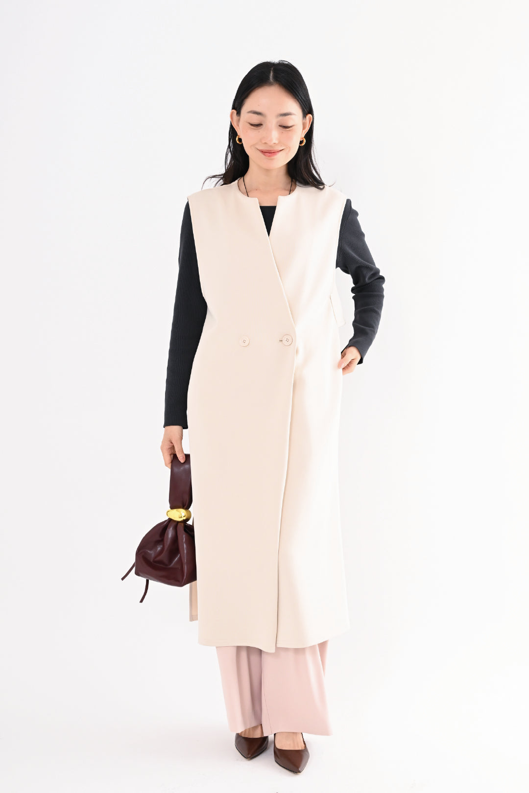 縦のラインを強調するロング丈と、すっきりとしたフロントデザインで甘さを抑えた大人バランスに。